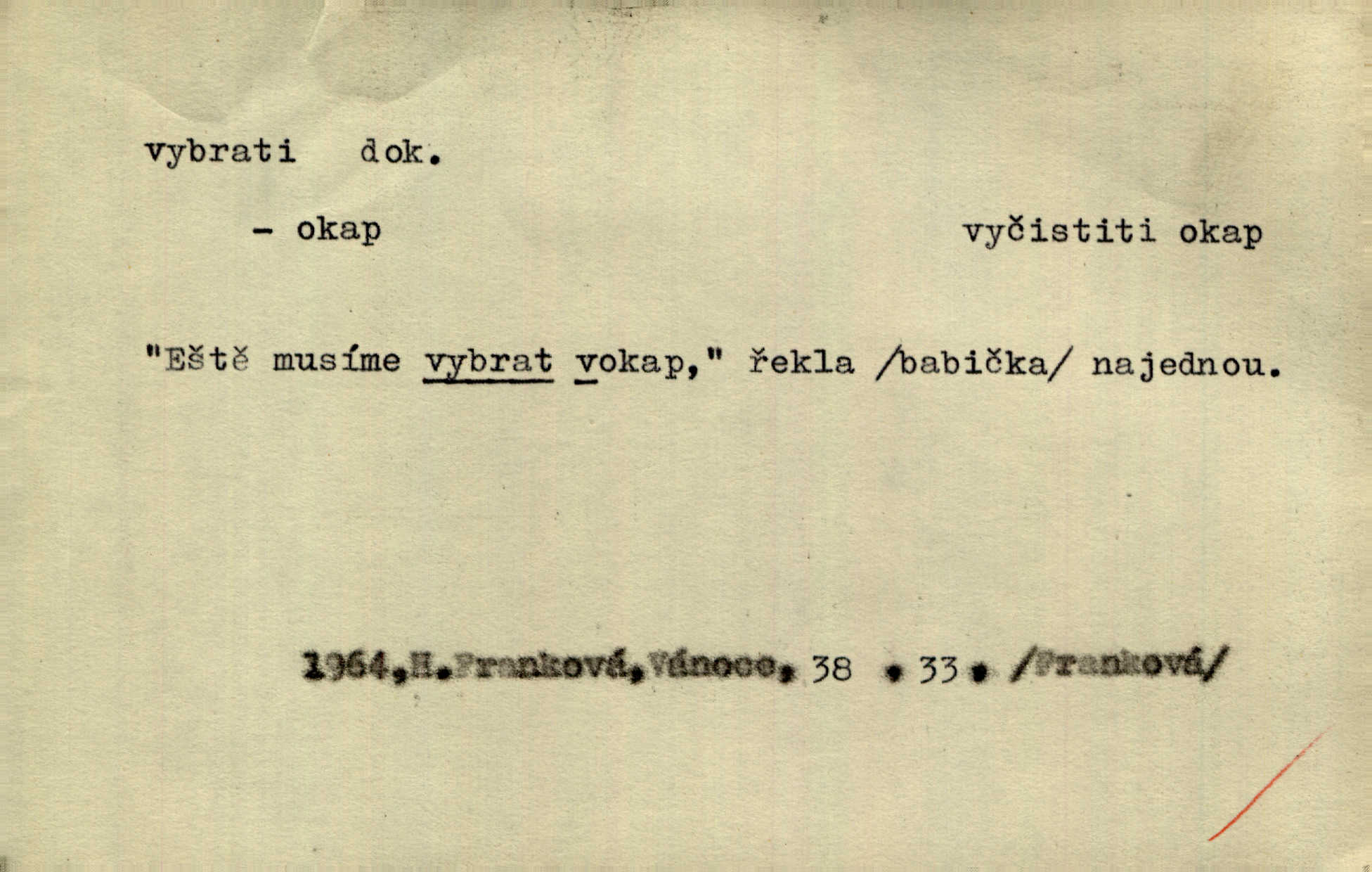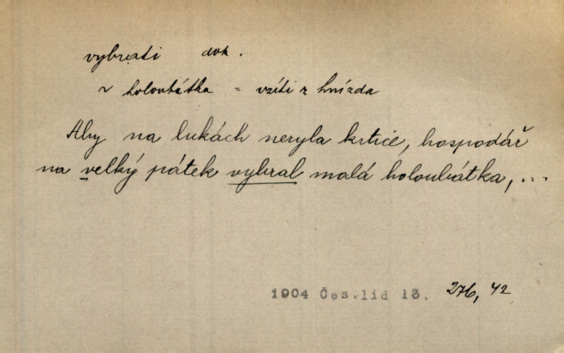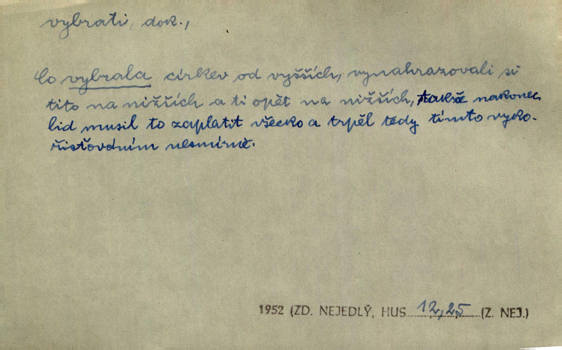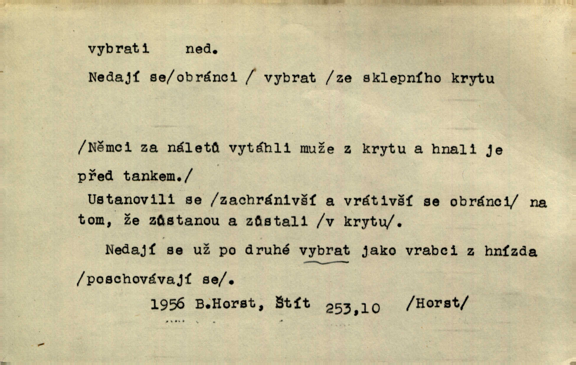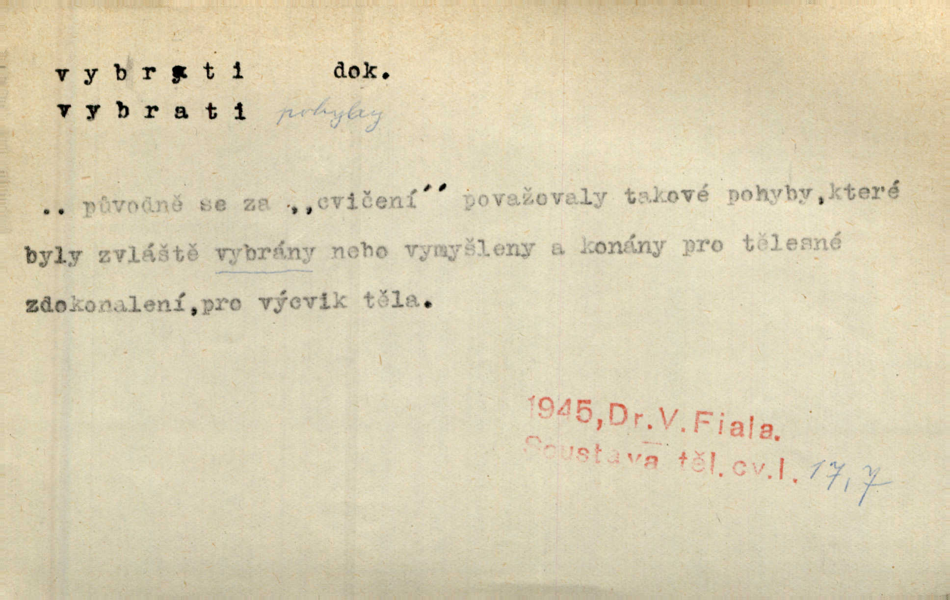 - vybrati dok. (1. sg. vyberu, imper. vyber) vyhledati něco rozptýleného, vzíti a od ostatního odděliti. Největší [jahody] vybrala a na zimu usušila co lék. Svět. Vybral všecken chléb z mléka. Rad. Vybral rozsypaný tabák z vody. Paleč. Rozvázal [pytlíček]‚ a vybrav tři dvacetníky, cinkal jimi na dlani. Rais. Brambory byly sice vybrány, ale pšenice teprve čekala sklizeny. Mor. D vybrati, vybrati si (co, koho) z většího množství vyhledati a vzíti to nejlepší n. co se hodí, rozhodnouti se pro něco, pro někoho, zvoliti, vyvoliti si něco, někoho. Z loděk dlouhé řady jsem vybral jednu. Vrch. Hostinská přinesla doutníky, a Voral si vybral. Rais. Naposled vybrala z několika zástěr jednu bílou vyšívanou. Něm. Tyto [buchty] jsou vaše z domu, ty zde naše, vyberte si, kterou chcete! Rais. Žádal ceduli, aby si mohl jídlo vybrat. Hajn. Nesla manželu talíř vybraných hlemýžďů. Herrm. Vybral jsem z veliké řady svých literárních článků pouze ty, o kterých myslím, že mají větší cenu. Vrch. Nebude zbytečno připojiti některé příklady vybrané ze starých spisovatelův. Čel. Měj se na pozoru, abys pravou pannu vybral. Erb. Cos to za ženicha vybrala sobě? Bezr. Okresní školní rada sama vybrala Kalinu [za učitele] rozhodla se pro něho. Herb. To místo si vybral za svůj poslední odpočinek. Jir. Tuto dobu jsi si vybral, abys mne opustil? Podl. Potom už si bude moci vybrati, čím bude chtít být. Šrám. Každý si může z toho prohlášení vybrati, co chce. Mach. Nevěděl, co si má z toho všeho vybrat. Svět. [Z posunku] jsem si vybral, že mám zazvonit u vrat paláce. Čap. Ch. D (co) vzíti a dáti ven, vyndati, vyjmouti, zprav. po částech, postupně, jedno po druhém; (koho) expr. zajistiti, zatknouti. Přistoupil ke skřínkám, vybral pánev, misky a sklenice. Tyl. Dal mu dvě knížky, kteréž z regálu vybral. Jir. Chvilkou hrábl také do nádoby, do peněz, plnou hrst jich vybral. Jir. Všechno z ní [truhličky] vybráno, všechno pryč, truhla jako vymetena. Jir. Mohli by vodu [ze studně] vybrat. Něm. Za slunného dne zrána se plásty včelám opatrně vyberou. Daněk. [Zahradník] s tváří žlutou a vousy světlými jako z klasu vybraná kukuřice. R. Svob. Jeden nebo druhý [chlapec] vybere pod slepicí vejce. Herb. „Vybral ptáčky“ — žalovaly naň děti ve škole. Baar. Včera mu kočka vybrala [kosovi] celé hnízdo. Kytl. Ale to si dal ubohý pán, ta [paní] mu vybrala z kapsy drobečky vyčinila mu. Něm. Expr. Vybrali [detektivové] u ní nějaké slečny a nějakou korespondenci. Včel. D postupným braním odstraniti obsah něčeho, vyprázdniti něco. Dostali jsme z dlouhé chvíle hlad, vybrali celou špižírnu. Lier. Jak muž přijel, kapsy mu vybrala. Jah. I studna se vybere, tím spíše vak peněz. Hronov. Celé ložisko [uhlí se] vybere. Hronov. D (peníze, vklady, zboží a pod.) vzíti, vyzdvihnouti, přijmouti výplatu. To on Hornof ani neví, co nebožka u mne vybrala, ony ženské nerady o dluhu mužovi vypravují. Jah. Čas od času vybráno bylo vždy po pěti zlatých [ze spořitelny]. Svob. Pro jistotu vybral pražské vklady. Vrba. Vybral si mimochodem měsíční částku své hubené pense. Čech. Není-li pak jiné pomoci, vybere to [učitel sobotales] v másle nebo vejcích. Tyl. D přijmouti, sebrati, postupně shromážditi povinný n. dobrovolný poplatek za něco, vytěžiti. I nájemné z polí vybrala, aby pan notář nebyl vytrhován. Baar. Nelze věděti, mnoho-li do roka vybere mostného. Světozor. Společnost dělila se večer po představení o to, co se vybralo. Kam. V sobotu nebo v neděli — deset — patnáct zlatek vyberem. Baar. Za to u kasy vybrali méně. Jir. Ten [hudec]‚ vybrav do sešlého klobouku beze střechy něco drobných penízků, bral se odtud. Jir. Vybrali mezi sebou na známky. Svob. D něco z něčeho odstraniti a tím vytvořiti prostor, vyhloubiti, prohloubiti. Vybrali příkop. Vaň. Ostatek [Suezského průplavu] mimo [splavnou] dráhu tu není ještě úplně vybrán — a nevybírá se. Ner. Já tu už vybral díru přes čtvrt metru a pořád nejsem na dně. Kop. Studny karlovarské se daly čistiti a hloub vybrati. ČČM. Spadl do Jeleního příkopu, kterýž pod věží hluboce vybrán. Herb. Nejdelší stranu [prkénka] můžeme uprostřed vybrati. Rozhlas. Všechny strany rámu jsou zdola vybrány. Rozhlas. Při rozvodnění Dunaje reduty podvráceny a od vody vybrány byly vymlety. Schoenf. nov. D Lid. vykrásti, ukrásti. Téhož dne Pražany vybrali a vypálili [táboři] klášter sv. Markéty v Břevnově. Lum. Když tam někdo vložil cigaro, hned jsem je vybral. Herrm. Vybravše z radnice poklady a spisy, zapálili je. Pal. D vybrati zatáčku a p. sport. slang projeti jí, bezpečně ji zdolat. Aby zatáčku vybral, na to nebylo v té rychlosti pomyšlení. Lid. nov. Jezdci [na bobu] se naklonili jako jeden muž a vybrali mistrovsky zatáčku. Svob. nov. D vybrati se (odkud) řidč. vyjíti odněkud, vystoupiti z něčeho. Vybral jsem se z hotelu. Kam. Bylo dvanáct, když se vybral z domu. Herrm. Ještě spěšněji než prve vybral se znova ze stavení. Preis. Vybrala se na dobro z Domanína. Šmil. D Řidč. vydati se na cestu, vypraviti se, odejíti, odebrati se někam. Vybral jsem se k němu, abych se s ním pojednal. Hol. Za čas jednou se vybrala [mlynářka] na Staré bělidlo. Něm. Bylo po desáté, když se vybrali z Vambeřic. Jir. Vybral se s čeládkou do polí. Šmil. Petr vybral se navštívit starého Hájka. Staš. Do vojny se vybrati musel král. Něm. D (z čeho) řidč. z něčeho se zvolna dostati, něčeho se zbaviti, probrati se, vzpamatovati se z něčeho, vytrhnouti se. Šťastně jsme se vybrali z roje prodavačů pohlednic. Mach. Vzpíral se do výše, aby se vybral ze závěje. Vrba. Než se někdo probudil a z postele vybral, byli už [zloději] přes hory a do