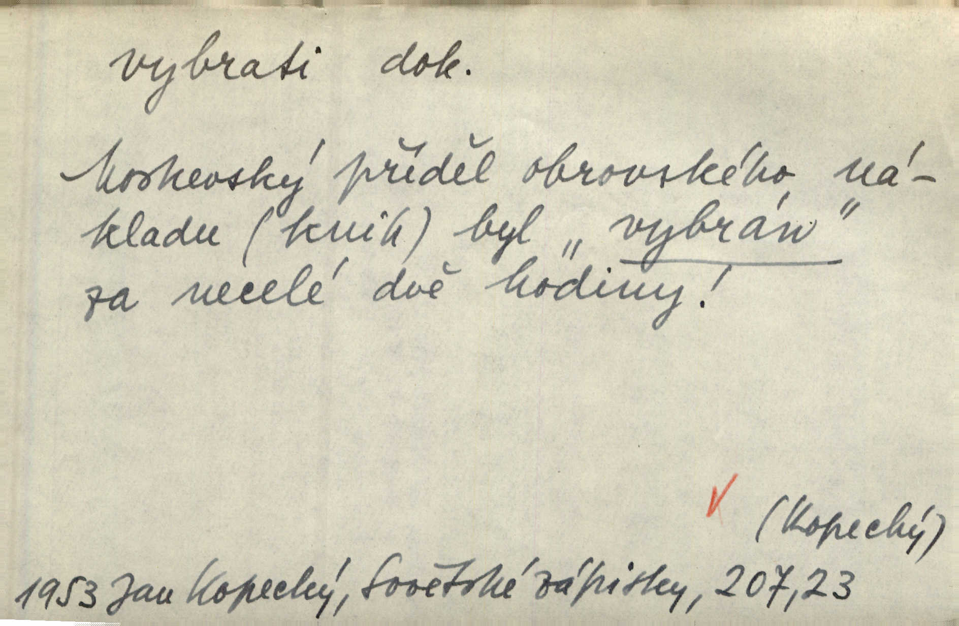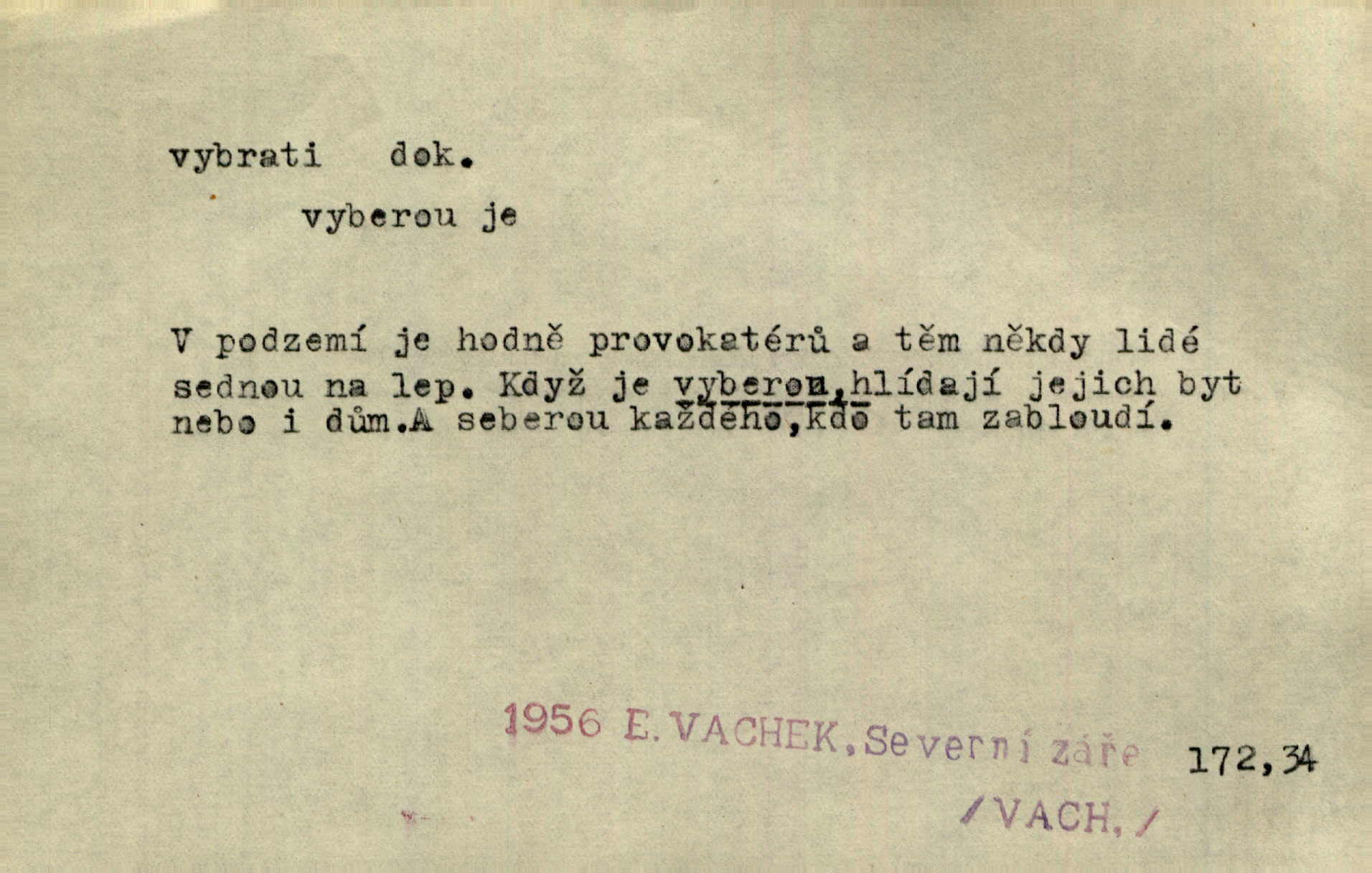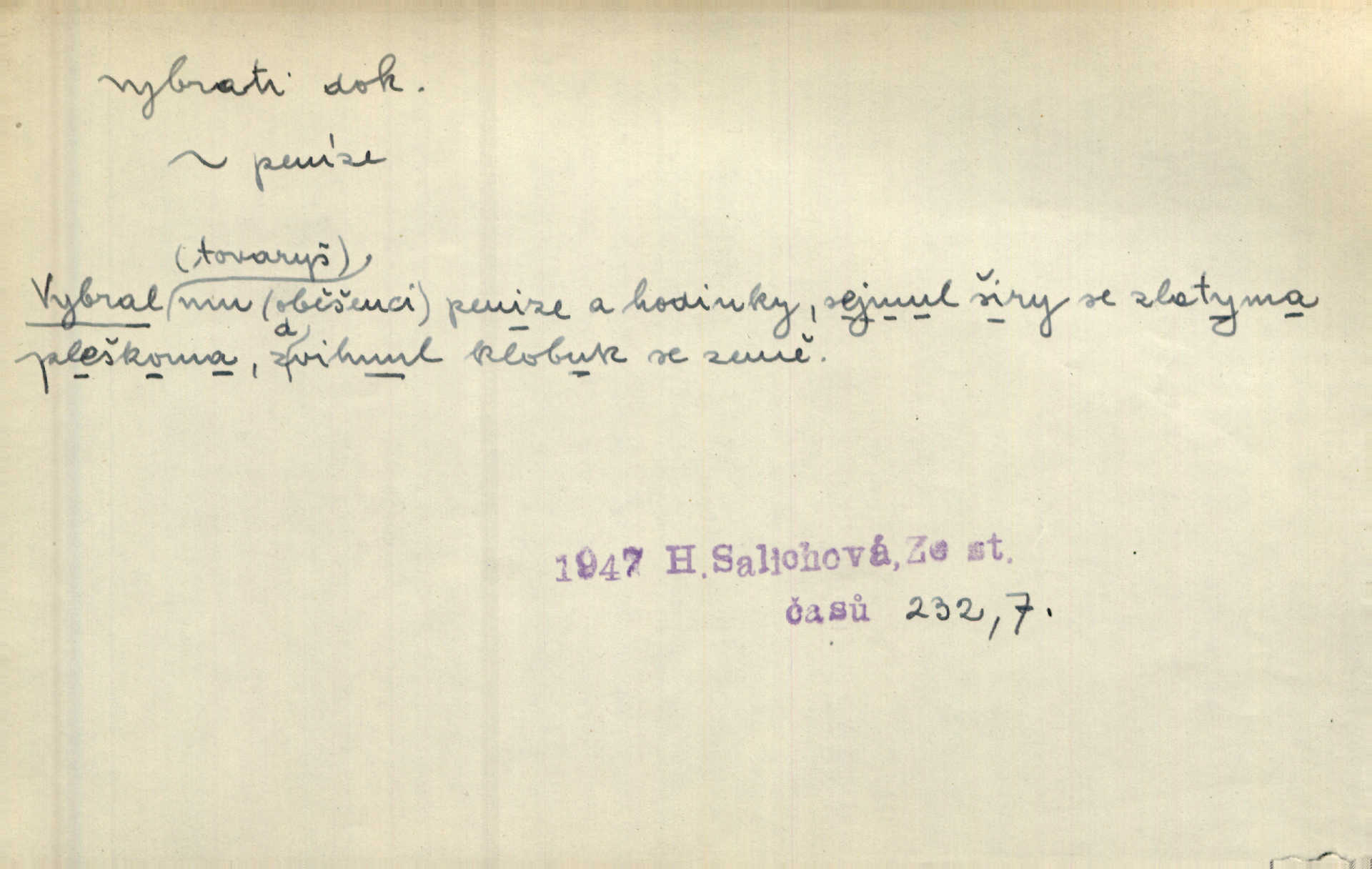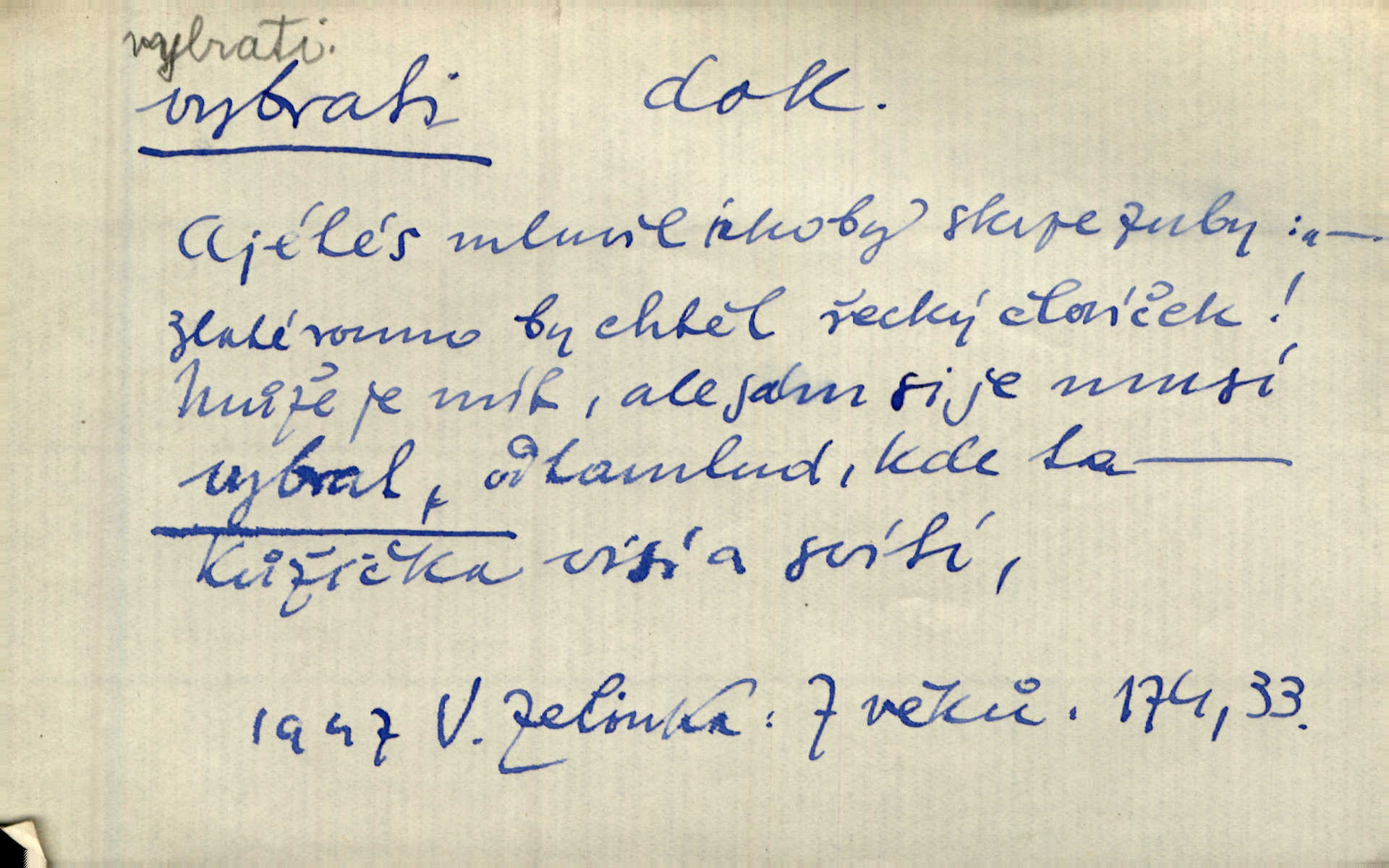 - vybrati dok. (1. sg. vyberu, imper. vyber) vyhledati něco rozptýleného, vzíti a od ostatního odděliti. Největší [jahody] vybrala a na zimu usušila co lék. Svět. Vybral všecken chléb z mléka. Rad. Vybral rozsypaný tabák z vody. Paleč. Rozvázal [pytlíček]‚ a vybrav tři dvacetníky, cinkal jimi na dlani. Rais. Brambory byly sice vybrány, ale pšenice teprve čekala sklizeny. Mor. D vybrati, vybrati si (co, koho) z většího množství vyhledati a vzíti to nejlepší n. co se hodí, rozhodnouti se pro něco, pro někoho, zvoliti, vyvoliti si něco, někoho. Z loděk dlouhé řady jsem vybral jednu. Vrch. Hostinská přinesla doutníky, a Voral si vybral. Rais. Naposled vybrala z několika zástěr jednu bílou vyšívanou. Něm. Tyto [buchty] jsou vaše z domu, ty zde naše, vyberte si, kterou chcete! Rais. Žádal ceduli, aby si mohl jídlo vybrat. Hajn. Nesla manželu talíř vybraných hlemýžďů. Herrm. Vybral jsem z veliké řady svých literárních článků pouze ty, o kterých myslím, že mají větší cenu. Vrch. Nebude zbytečno připojiti některé příklady vybrané ze starých spisovatelův. Čel. Měj se na pozoru, abys pravou pannu vybral. Erb. Cos to za ženicha vybrala sobě? Bezr. Okresní školní rada sama vybrala Kalinu [za učitele] rozhodla se pro něho. Herb. To místo si vybral za svůj poslední odpočinek. Jir. Tuto dobu jsi si vybral, abys mne opustil? Podl. Potom už si bude moci vybrati, čím bude chtít být. Šrám. Každý si může z toho prohlášení vybrati, co chce. Mach. Nevěděl, co si má z toho všeho vybrat. Svět. [Z posunku] jsem si vybral, že mám zazvonit u vrat paláce. Čap. Ch. D (co) vzíti a dáti ven, vyndati, vyjmouti, zprav. po částech, postupně, jedno po druhém; (koho) expr. zajistiti, zatknouti. Přistoupil ke skřínkám, vybral pánev, misky a sklenice. Tyl. Dal mu dvě knížky, kteréž z regálu vybral. Jir. Chvilkou hrábl také do nádoby, do peněz, plnou hrst jich vybral. Jir. Všechno z ní [truhličky] vybráno, všechno pryč, truhla jako vymetena. Jir. Mohli by vodu [ze studně] vybrat. Něm. Za slunného dne zrána se plásty včelám opatrně vyberou. Daněk. [Zahradník] s tváří žlutou a vousy světlými jako z klasu vybraná kukuřice. R. Svob. Jeden nebo druhý [chlapec] vybere pod slepicí vejce. Herb. „Vybral ptáčky“ — žalovaly naň děti ve škole. Baar. Včera mu kočka vybrala [kosovi] celé hnízdo. Kytl. Ale to si dal ubohý pán, ta [paní] mu vybrala z kapsy drobečky vyčinila mu. Něm. Expr. Vybrali [detektivové] u ní nějaké slečny a nějakou korespondenci. Včel. D postupným braním odstraniti obsah něčeho, vyprázdniti něco. Dostali jsme z dlouhé chvíle hlad, vybrali celou špižírnu. Lier. Jak muž přijel, kapsy mu vybrala. Jah. I studna se vybere, tím spíše vak peněz. Hronov. Celé ložisko [uhlí se] vybere. Hronov. D (peníze, vklady, zboží a pod.) vzíti, vyzdvihnouti, přijmouti výplatu. To on Hornof ani neví, co nebožka u mne vybrala, ony ženské nerady o dluhu mužovi vypravují. Jah. Čas od času vybráno bylo vždy po pěti zlatých [ze spořitelny]. Svob. Pro jistotu vybral pražské vklady. Vrba. Vybral si mimochodem měsíční částku své hubené pense. Čech. Není-li pak jiné pomoci, vybere to [učitel sobotales] v másle nebo vejcích. Tyl. D přijmouti, sebrati, postupně shromážditi povinný n. dobrovolný poplatek za něco, vytěžiti. I nájemné z polí vybrala, aby pan notář nebyl vytrhován. Baar. Nelze věděti, mnoho-li do roka vybere mostného. Světozor. Společnost dělila se večer po představení o to, co se vybralo. Kam. V sobotu nebo v neděli — deset — patnáct zlatek vyberem. Baar. Za to u kasy vybrali méně. Jir. Ten [hudec]‚ vybrav do sešlého klobouku beze střechy něco drobných penízků, bral se odtud. Jir. Vybrali mezi sebou na známky. Svob. D něco z něčeho odstraniti a tím vytvořiti prostor, vyhloubiti, prohloubiti. Vybrali příkop. Vaň. Ostatek [Suezského průplavu] mimo [splavnou] dráhu tu není ještě úplně vybrán — a nevybírá se. Ner. Já tu už vybral díru přes čtvrt metru a pořád nejsem na dně. Kop. Studny karlovarské se daly čistiti a hloub vybrati. ČČM. Spadl do Jeleního příkopu, kterýž pod věží hluboce vybrán. Herb. Nejdelší stranu [prkénka] můžeme uprostřed vybrati. Rozhlas. Všechny strany rámu jsou zdola vybrány. Rozhlas. Při rozvodnění Dunaje reduty podvráceny a od vody vybrány byly vymlety. Schoenf. nov. D Lid. vykrásti, ukrásti. Téhož dne Pražany vybrali a vypálili [táboři] klášter sv. Markéty v Břevnově. Lum. Když tam někdo vložil cigaro, hned jsem je vybral. Herrm. Vybravše z radnice poklady a spisy, zapálili je. Pal. D vybrati zatáčku a p. sport. slang projeti jí, bezpečně ji zdolat. Aby zatáčku vybral, na to nebylo v té rychlosti pomyšlení. Lid. nov. Jezdci [na bobu] se naklonili jako jeden muž a vybrali mistrovsky zatáčku. Svob. nov. D vybrati se (odkud) řidč. vyjíti odněkud, vystoupiti z něčeho. Vybral jsem se z hotelu. Kam. Bylo dvanáct, když se vybral z domu. Herrm. Ještě spěšněji než prve vybral se znova ze stavení. Preis. Vybrala se na dobro z Domanína. Šmil. D Řidč. vydati se na cestu, vypraviti se, odejíti, odebrati se někam. Vybral jsem se k němu, abych se s ním pojednal. Hol. Za čas jednou se vybrala [mlynářka] na Staré bělidlo. Něm. Bylo po desáté, když se vybrali z Vambeřic. Jir. Vybral se s čeládkou do polí. Šmil. Petr vybral se navštívit starého Hájka. Staš. Do vojny se vybrati musel král. Něm. D (z čeho) řidč. z něčeho se zvolna dostati, něčeho se zbaviti, probrati se, vzpamatovati se z něčeho, vytrhnouti se. Šťastně jsme se vybrali z roje prodavačů pohlednic. Mach. Vzpíral se do výše, aby se vybral ze závěje. Vrba. Než se někdo probudil a z postele vybral, byli už [zloději] přes hory a do