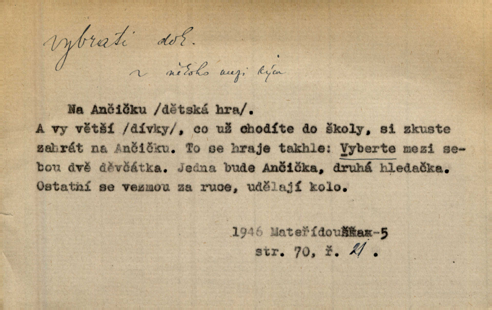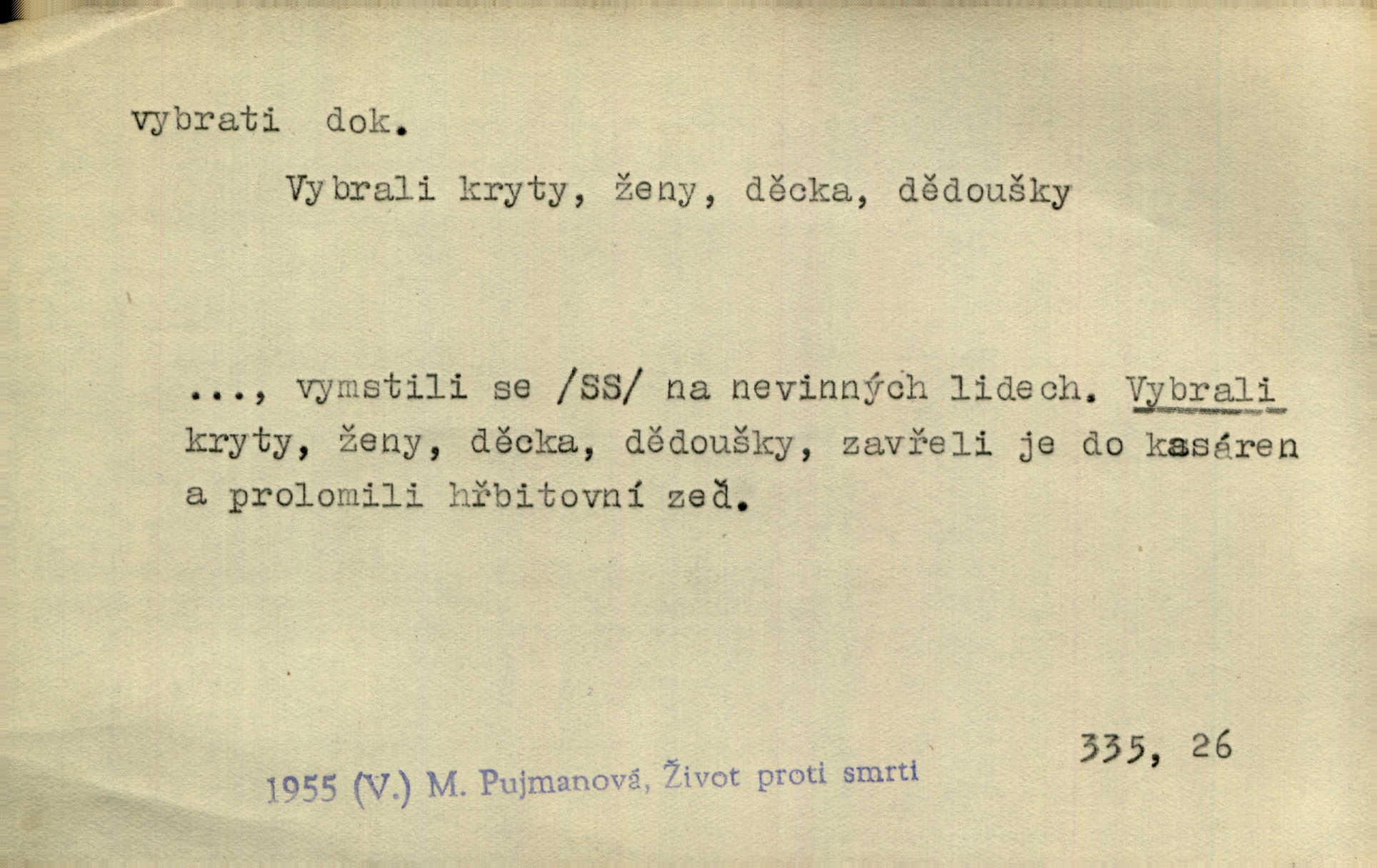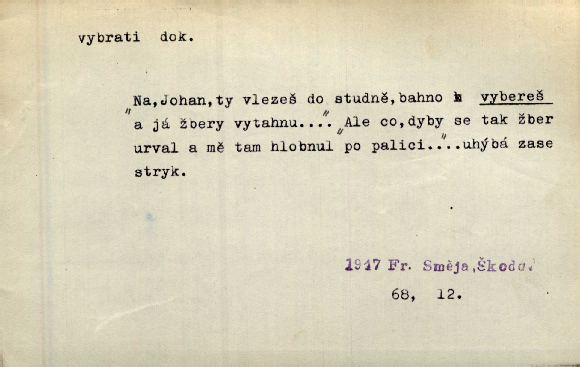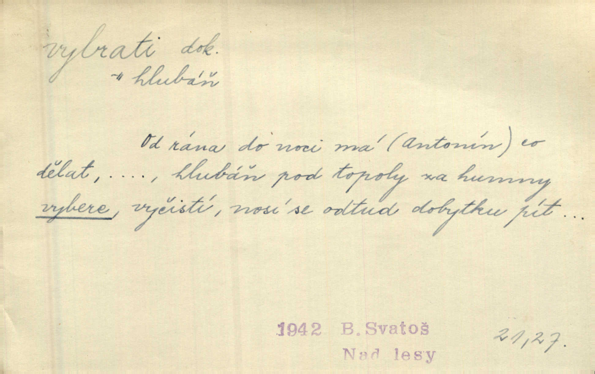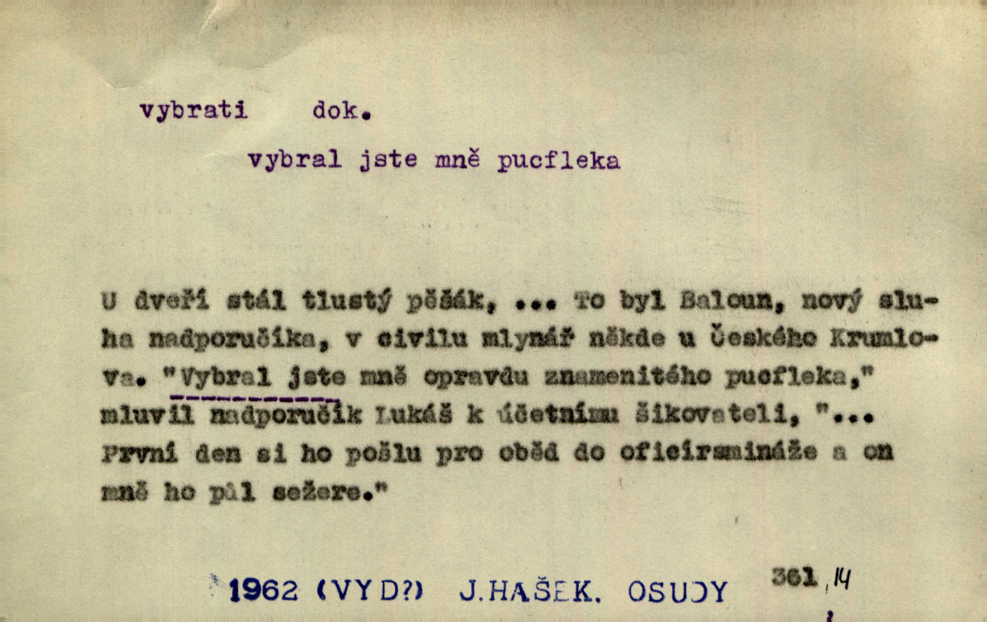 - vybrati dok. (1. sg. vyberu, imper. vyber) vyhledati něco rozptýleného, vzíti a od ostatního odděliti. Největší [jahody] vybrala a na zimu usušila co lék. Svět. Vybral všecken chléb z mléka. Rad. Vybral rozsypaný tabák z vody. Paleč. Rozvázal [pytlíček]‚ a vybrav tři dvacetníky, cinkal jimi na dlani. Rais. Brambory byly sice vybrány, ale pšenice teprve čekala sklizeny. Mor. D vybrati, vybrati si (co, koho) z většího množství vyhledati a vzíti to nejlepší n. co se hodí, rozhodnouti se pro něco, pro někoho, zvoliti, vyvoliti si něco, někoho. Z loděk dlouhé řady jsem vybral jednu. Vrch. Hostinská přinesla doutníky, a Voral si vybral. Rais. Naposled vybrala z několika zástěr jednu bílou vyšívanou. Něm. Tyto [buchty] jsou vaše z domu, ty zde naše, vyberte si, kterou chcete! Rais. Žádal ceduli, aby si mohl jídlo vybrat. Hajn. Nesla manželu talíř vybraných hlemýžďů. Herrm. Vybral jsem z veliké řady svých literárních článků pouze ty, o kterých myslím, že mají větší cenu. Vrch. Nebude zbytečno připojiti některé příklady vybrané ze starých spisovatelův. Čel. Měj se na pozoru, abys pravou pannu vybral. Erb. Cos to za ženicha vybrala sobě? Bezr. Okresní školní rada sama vybrala Kalinu [za učitele] rozhodla se pro něho. Herb. To místo si vybral za svůj poslední odpočinek. Jir. Tuto dobu jsi si vybral, abys mne opustil? Podl. Potom už si bude moci vybrati, čím bude chtít být. Šrám. Každý si může z toho prohlášení vybrati, co chce. Mach. Nevěděl, co si má z toho všeho vybrat. Svět. [Z posunku] jsem si vybral, že mám zazvonit u vrat paláce. Čap. Ch. D (co) vzíti a dáti ven, vyndati, vyjmouti, zprav. po částech, postupně, jedno po druhém; (koho) expr. zajistiti, zatknouti. Přistoupil ke skřínkám, vybral pánev, misky a sklenice. Tyl. Dal mu dvě knížky, kteréž z regálu vybral. Jir. Chvilkou hrábl také do nádoby, do peněz, plnou hrst jich vybral. Jir. Všechno z ní [truhličky] vybráno, všechno pryč, truhla jako vymetena. Jir. Mohli by vodu [ze studně] vybrat. Něm. Za slunného dne zrána se plásty včelám opatrně vyberou. Daněk. [Zahradník] s tváří žlutou a vousy světlými jako z klasu vybraná kukuřice. R. Svob. Jeden nebo druhý [chlapec] vybere pod slepicí vejce. Herb. „Vybral ptáčky“ — žalovaly naň děti ve škole. Baar. Včera mu kočka vybrala [kosovi] celé hnízdo. Kytl. Ale to si dal ubohý pán, ta [paní] mu vybrala z kapsy drobečky vyčinila mu. Něm. Expr. Vybrali [detektivové] u ní nějaké slečny a nějakou korespondenci. Včel. D postupným braním odstraniti obsah něčeho, vyprázdniti něco. Dostali jsme z dlouhé chvíle hlad, vybrali celou špižírnu. Lier. Jak muž přijel, kapsy mu vybrala. Jah. I studna se vybere, tím spíše vak peněz. Hronov. Celé ložisko [uhlí se] vybere. Hronov. D (peníze, vklady, zboží a pod.) vzíti, vyzdvihnouti, přijmouti výplatu. To on Hornof ani neví, co nebožka u mne vybrala, ony ženské nerady o dluhu mužovi vypravují. Jah. Čas od času vybráno bylo vždy po pěti zlatých [ze spořitelny]. Svob. Pro jistotu vybral pražské vklady. Vrba. Vybral si mimochodem měsíční částku své hubené pense. Čech. Není-li pak jiné pomoci, vybere to [učitel sobotales] v másle nebo vejcích. Tyl. D přijmouti, sebrati, postupně shromážditi povinný n. dobrovolný poplatek za něco, vytěžiti. I nájemné z polí vybrala, aby pan notář nebyl vytrhován. Baar. Nelze věděti, mnoho-li do roka vybere mostného. Světozor. Společnost dělila se večer po představení o to, co se vybralo. Kam. V sobotu nebo v neděli — deset — patnáct zlatek vyberem. Baar. Za to u kasy vybrali méně. Jir. Ten [hudec]‚ vybrav do sešlého klobouku beze střechy něco drobných penízků, bral se odtud. Jir. Vybrali mezi sebou na známky. Svob. D něco z něčeho odstraniti a tím vytvořiti prostor, vyhloubiti, prohloubiti. Vybrali příkop. Vaň. Ostatek [Suezského průplavu] mimo [splavnou] dráhu tu není ještě úplně vybrán — a nevybírá se. Ner. Já tu už vybral díru přes čtvrt metru a pořád nejsem na dně. Kop. Studny karlovarské se daly čistiti a hloub vybrati. ČČM. Spadl do Jeleního příkopu, kterýž pod věží hluboce vybrán. Herb. Nejdelší stranu [prkénka] můžeme uprostřed vybrati. Rozhlas. Všechny strany rámu jsou zdola vybrány. Rozhlas. Při rozvodnění Dunaje reduty podvráceny a od vody vybrány byly vymlety. Schoenf. nov. D Lid. vykrásti, ukrásti. Téhož dne Pražany vybrali a vypálili [táboři] klášter sv. Markéty v Břevnově. Lum. Když tam někdo vložil cigaro, hned jsem je vybral. Herrm. Vybravše z radnice poklady a spisy, zapálili je. Pal. D vybrati zatáčku a p. sport. slang projeti jí, bezpečně ji zdolat. Aby zatáčku vybral, na to nebylo v té rychlosti pomyšlení. Lid. nov. Jezdci [na bobu] se naklonili jako jeden muž a vybrali mistrovsky zatáčku. Svob. nov. D vybrati se (odkud) řidč. vyjíti odněkud, vystoupiti z něčeho. Vybral jsem se z hotelu. Kam. Bylo dvanáct, když se vybral z domu. Herrm. Ještě spěšněji než prve vybral se znova ze stavení. Preis. Vybrala se na dobro z Domanína. Šmil. D Řidč. vydati se na cestu, vypraviti se, odejíti, odebrati se někam. Vybral jsem se k němu, abych se s ním pojednal. Hol. Za čas jednou se vybrala [mlynářka] na Staré bělidlo. Něm. Bylo po desáté, když se vybrali z Vambeřic. Jir. Vybral se s čeládkou do polí. Šmil. Petr vybral se navštívit starého Hájka. Staš. Do vojny se vybrati musel král. Něm. D (z čeho) řidč. z něčeho se zvolna dostati, něčeho se zbaviti, probrati se, vzpamatovati se z něčeho, vytrhnouti se. Šťastně jsme se vybrali z roje prodavačů pohlednic. Mach. Vzpíral se do výše, aby se vybral ze závěje. Vrba. Než se někdo probudil a z postele vybral, byli už [zloději] přes hory a do