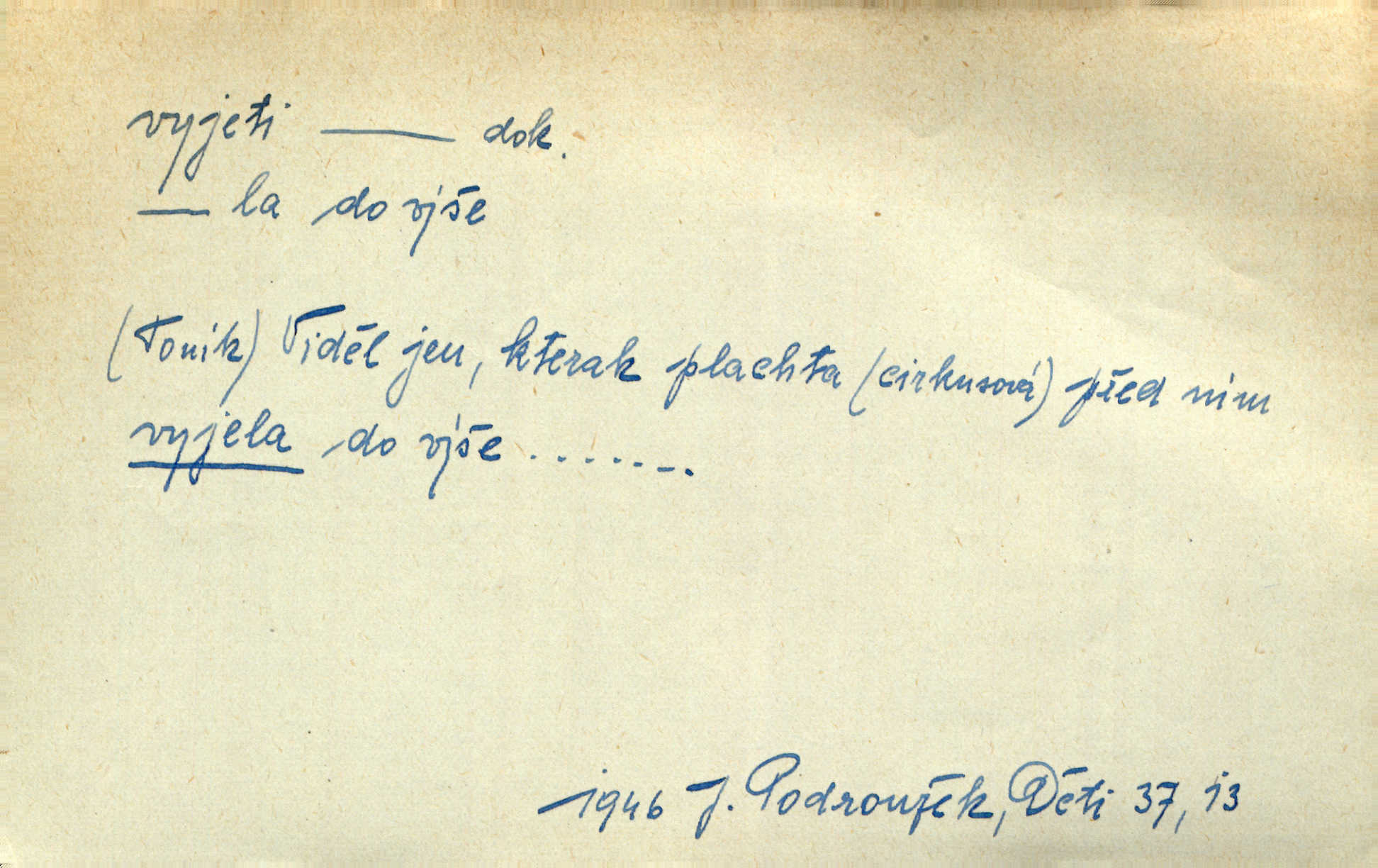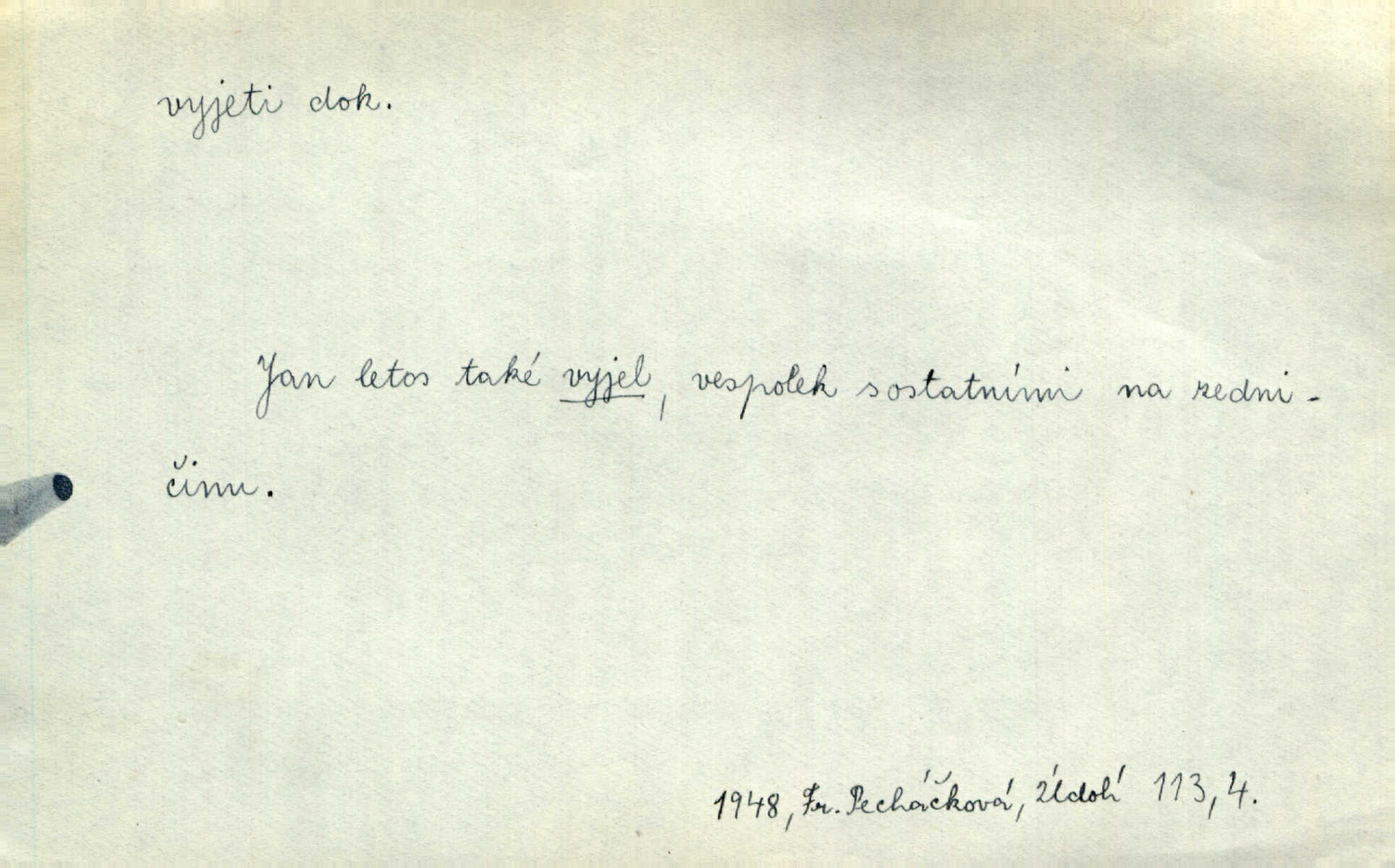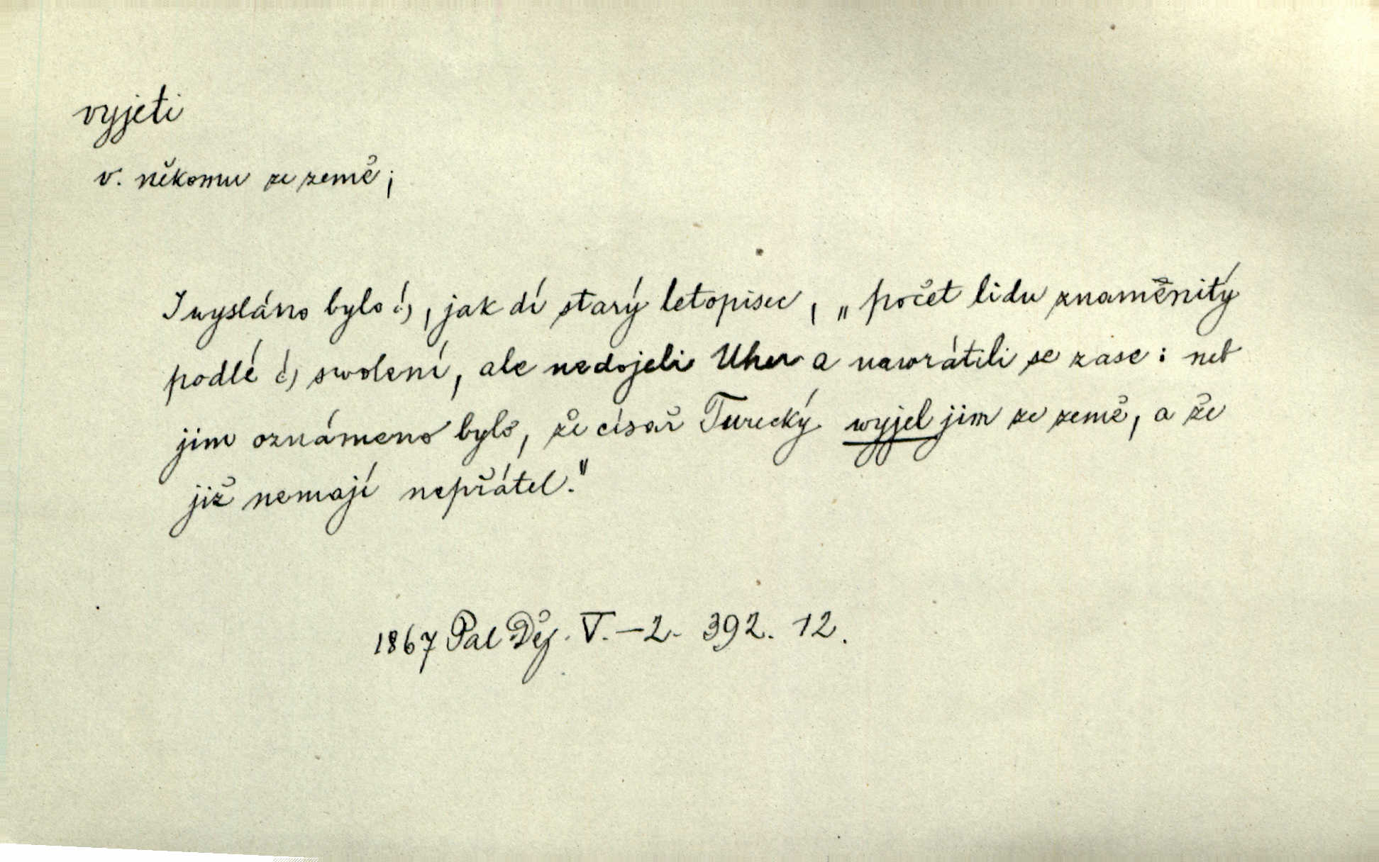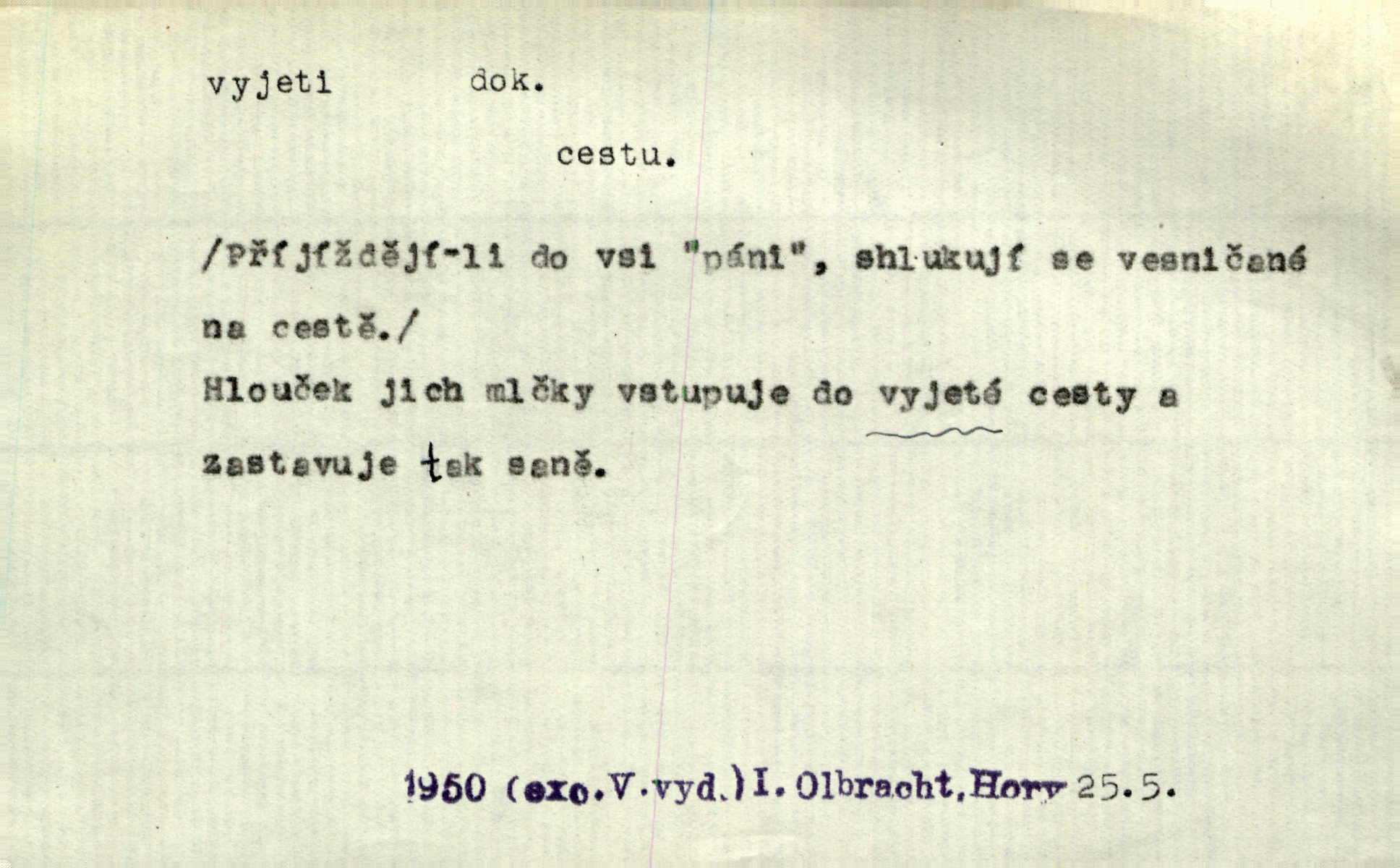 - vyjeti dok. (o člověku n. jiném tvoru) vozmo n. jízdmo vykonati jízdu odněkud. Vyjeli [jezdci] z lesa a již hnali se se stráně dolů. Jir. Ze zástupu janičářského vyjel nějaký vysoký důstojník turecký. Jir. Bída učí rozumu a Hoppovi se zdálo, že už vyjel z bahna na tvrdo že už překonal obtíže. Baar. D (o vozidle n. plavidle) vykonati jízdu odněkud. Za krásného podzimního jitra vyjel hlučně pohodlný cestovní vůz z Schönberského domu. Svět. Vyjede nám z lesíka naproti kočár. Rub. Musí prý se [pensista] zastavit zrovna jako tramway, která vyjela z kolejí. Mach. Na trati vyjel vlak z kolejí. Lang. Bydlí zde bratranec mého zetě a tím vyjelo všecko z kolejí dostalo se do mimořádných poměrů. Kun. Žel. vyjetí z kolejí samovolné sjetí železničních vozidel s kolejí. D (o člověku n. jiném tvoru) vykonati vozmo, jízdmo a pod. jízdu vzhůru. Pokynul Turečkovi, jenž u volném, pěkném klusu na pahrbek vyjel. Jir. Potom vyjeli [vozkové] do kopce ke dvoru „Rovinkám“. Herb. Tak vyjeli jsme na horu. Mach. Sport. slang Záleží jak na dobrém vyjetí neschůdných terénů, tak i na rychlosti. Ml. fronta. D (o vozidle) vykonati jízdu vzhůru. Ta šestisedadlová archa [auto] někdy jankovatí a nechce vyjet do kopce. Maj. D vozmo n. jízdmo opustiti obydlí, obyč. na krátký čas. Když byly [dámy] v hlavním městě, vyjely s ním [psíkem] v kočáře. Něm. Po obědě vyjela [kněžna] jízdecky. Havl. Sedí celý den na břehu moře, někdy vyjede na loďce daleko. Zey. Otčím vyjel na delší čas z domu. Jir. Na uvítanou Její Jasnosti vyjedete rejtharsky, a vinšem uvítáte. Jir. Ženich jí vyjel hezký kus cesty naproti. Jir. Komorník litoval, že není vrchnost doma, že musela vyjeti. Tyl. Hrabě s divokým dvojspřežím svým vyjel do krajiny. Herb. Prvním vlakem z rána vyjel si na venkov. V. Mrš. Vždy v neděli si vyjeli tak sami. Sova. Pecúch také si vyjel na pole. Herb. Řekla jsem, že si vyjedu, a jela jsem. R. Svob. D počíti jeti. Oba soupeři s jistého místa v polokruhu na sebe vyjeli a v setkání meči svými se utkli. Již při prvním vyjetí krvácel Racek v týlu. J. Pichl. Sport. (o koni, cyklistovi) startovati. D (co) jízdou, ježděním něco vyhloubiti n. opotřebovati. Její kosé pohledy neklidně se toulaly ve vyjetém štěrku. Jah. Venkovské silnice „tvoří“ se [v Uhrách] co nejprostěji: Jede vůz přes pole, za ním jede druhý, chce-li, pak v těchže kolejích vždy ostatní — jak tu cestu vyjedou, tak je. Ner. Leckde na povodí břednou až po nápravu, jinde projíždějí lesními úvozy, hluboce vyjetými. Pech. Také vojsko dosud bytující v ležení vytrhlo a táhlo vyšlapanou a vyjetou cestou hlavním vojskem. Jir. Rakousko je jediným státem v Evropě, v němž se za žádnou cenu neopouštějí staré vyjeté koleje ustálené zvyky. Mach. Že se snad také vyskytly případy, jež se vymykaly vyjetým kolejím, rozumí se při lidských povahách, i v tom konservatismu vytvořených, samo sebou. Rais. Přen. V dráze vyjeté sochařskou tradicí klasickou vzniklo ještě něco děl vyšlých z rukou mistrů. Matějček. D učiniti vůbec rychlý pohyb odněkud, vyklouznouti a pod. Zde nad pravým okem kule vjela a levou skrání zase vyjela. Bozd. Nedbal, že mu dýmka vyjela z úst. Jir. Tady ti to [šití] vyjelo, musíš to přešít! Včel. Krátká košile mu vyjela až k pasu. Podr. Pružné tělo její vyjelo náhle z jeho rukou. Svob. „Toho neučiníš,“ vyjelo prudce z Hanuše. Šmil. Nějaká drsnost vyjede z péra. Vrch. Ták — teď je po všem, vyjela z paní Sezimové dlouho zadržovaná nevrlost. Kronb. Mezi zčernalými jeho zuby vyjel sípavý vzdech. Čap. Ch. „A jej,“ vyjelo Pepkovi. K. Čap. Expr. Baghýra [kocour] několika skoky vyjel z trávy jako had. Herb. Domovník vyjel ze svého kumbálku podruhé. V. Mrš. Vyjel proti ní, a zaskřípav zuby, zařičel: „Ty jedna mrrrrrrcho-“. V. Mrš. Z lesa ostře vyjel stračí skřek. Rais. Již po třetí snad za dnešní noc vyjela mlynářka Holásková ze spaní. Nov. Vyřešil krásnou akci brankář vyjetím z branky. Ml. fronta. Tan. vyjetí druh tanečního pohybu, při němž se nohy vystřídají z přední do zadní 4. posice. D učiniti rychlý pohyb vzhůru. A z uzlíku na židli vyjedou do výše dvě slabé bezkrevné pěsti. K. J. Ben. Udeřil gong, světla zhasla, opona vyjela vzhůru. M. Han. Barometr vyjel do výše, a zdálo se, že již nikdy nesešplhá dolů. Šimůn. D (na koho) expr. prudce promluviti, obořiti se, osopiti se. Račte odpustit, že jsem tak hrubě na vás vyjel. Mik. „Ale tetičko,“ vyjela Milča najednou, „zapomněla sem se zeptat.“ Nov. „Nemůžeš dát pozor, kluku hloupá,“ vyjel naň otec. Šim. Ty na mne vyjedeš, a ještě naposled řekneš, že ti nepřeju toho, co máš. Svob. Tu povstaly častokráte třenice, že si ten neb onen z komptoru vyjel hrubě na ty české dělníky, na tu českou luzu. Pfleg. „A proč?“ vyjela konečně stará paní. Svět. Jajaja …, vyjel ze sebe mistr. V. Mrš. D (s čím) expr. rychle něco říci, prozraditi, oznámiti, vytasiti se s něčím. On vyjede hned se vším. Havl. Všelijak to zatáčel, obaloval, často se zamlčel, až konečně vyjel s pravdou. Jir. Julinka ale již vyjela se svou otázkou. Podl. Starý pan poštmistr vyjel nad to ještě s něčím jiným. Jir. D Hippol. vyjetí koně donucení koně k vrcholnému výkonu při závěrečně fázi závodu.
