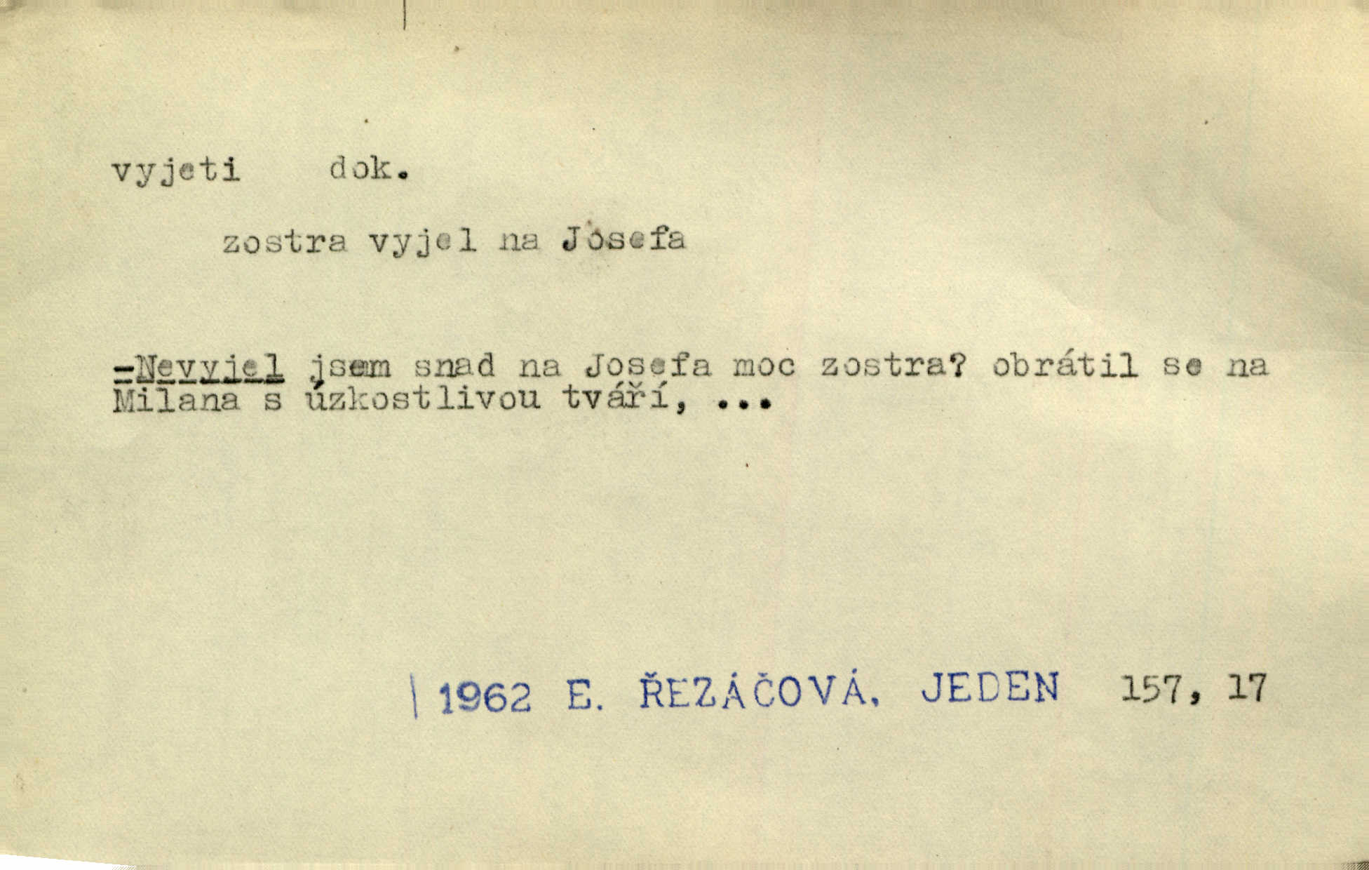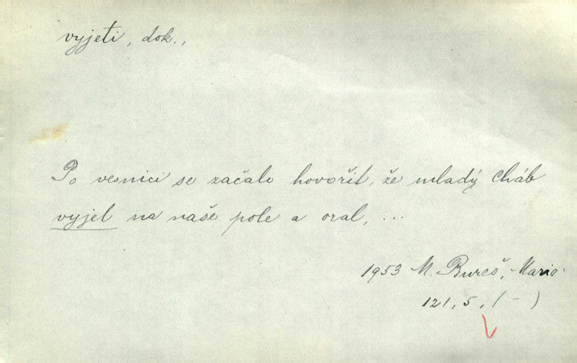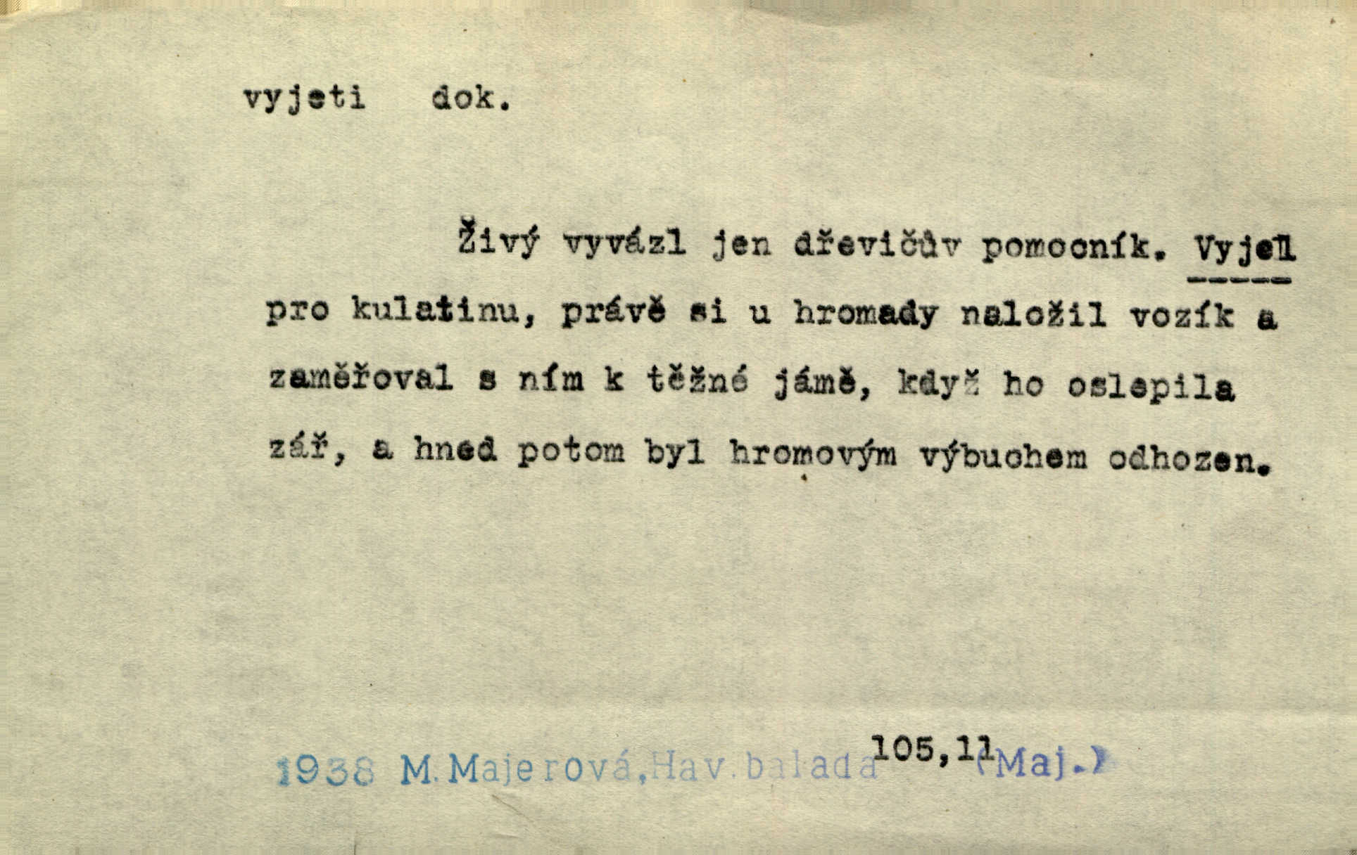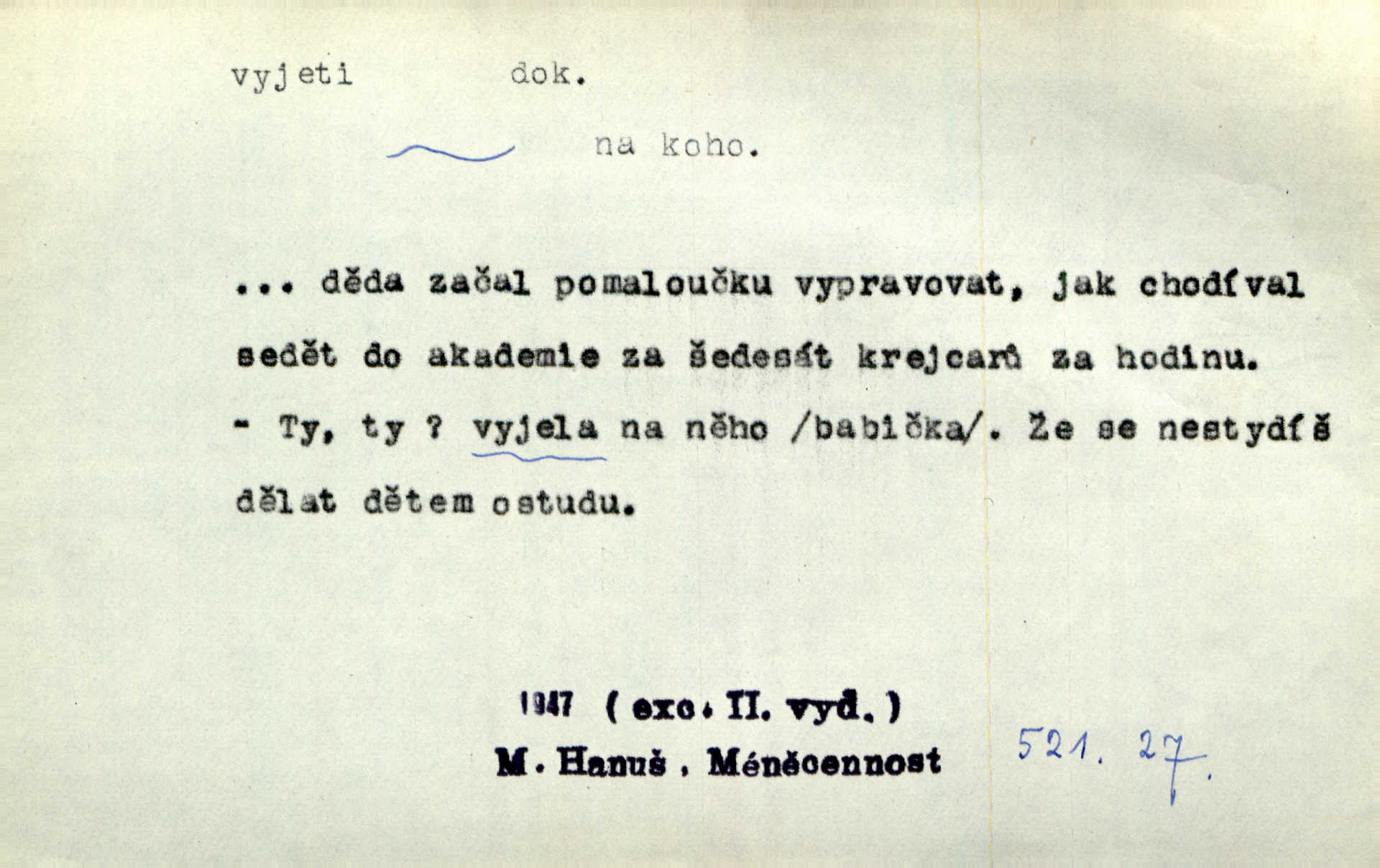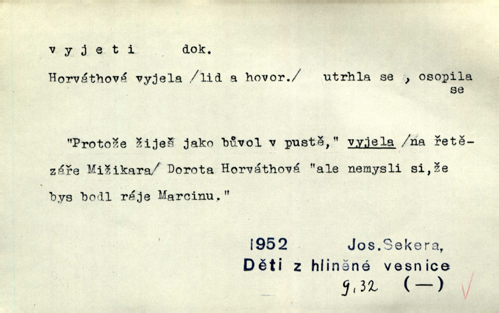- vyjeti dok. (o člověku n. jiném tvoru) vozmo n. jízdmo vykonati jízdu odněkud. Vyjeli [jezdci] z lesa a již hnali se se stráně dolů. Jir. Ze zástupu janičářského vyjel nějaký vysoký důstojník turecký. Jir. Bída učí rozumu a Hoppovi se zdálo, že už vyjel z bahna na tvrdo že už překonal obtíže. Baar. D (o vozidle n. plavidle) vykonati jízdu odněkud. Za krásného podzimního jitra vyjel hlučně pohodlný cestovní vůz z Schönberského domu. Svět. Vyjede nám z lesíka naproti kočár. Rub. Musí prý se [pensista] zastavit zrovna jako tramway, která vyjela z kolejí. Mach. Na trati vyjel vlak z kolejí. Lang. Bydlí zde bratranec mého zetě a tím vyjelo všecko z kolejí dostalo se do mimořádných poměrů. Kun. Žel. vyjetí z kolejí samovolné sjetí železničních vozidel s kolejí. D (o člověku n. jiném tvoru) vykonati vozmo, jízdmo a pod. jízdu vzhůru. Pokynul Turečkovi, jenž u volném, pěkném klusu na pahrbek vyjel. Jir. Potom vyjeli [vozkové] do kopce ke dvoru „Rovinkám“. Herb. Tak vyjeli jsme na horu. Mach. Sport. slang Záleží jak na dobrém vyjetí neschůdných terénů, tak i na rychlosti. Ml. fronta. D (o vozidle) vykonati jízdu vzhůru. Ta šestisedadlová archa [auto] někdy jankovatí a nechce vyjet do kopce. Maj. D vozmo n. jízdmo opustiti obydlí, obyč. na krátký čas. Když byly [dámy] v hlavním městě, vyjely s ním [psíkem] v kočáře. Něm. Po obědě vyjela [kněžna] jízdecky. Havl. Sedí celý den na břehu moře, někdy vyjede na loďce daleko. Zey. Otčím vyjel na delší čas z domu. Jir. Na uvítanou Její Jasnosti vyjedete rejtharsky, a vinšem uvítáte. Jir. Ženich jí vyjel hezký kus cesty naproti. Jir. Komorník litoval, že není vrchnost doma, že musela vyjeti. Tyl. Hrabě s divokým dvojspřežím svým vyjel do krajiny. Herb. Prvním vlakem z rána vyjel si na venkov. V. Mrš. Vždy v neděli si vyjeli tak sami. Sova. Pecúch také si vyjel na pole. Herb. Řekla jsem, že si vyjedu, a jela jsem. R. Svob. D počíti jeti. Oba soupeři s jistého místa v polokruhu na sebe vyjeli a v setkání meči svými se utkli. Již při prvním vyjetí krvácel Racek v týlu. J. Pichl. Sport. (o koni, cyklistovi) startovati. D (co) jízdou, ježděním něco vyhloubiti n. opotřebovati. Její kosé pohledy neklidně se toulaly ve vyjetém štěrku. Jah. Venkovské silnice „tvoří“ se [v Uhrách] co nejprostěji: Jede vůz přes pole, za ním jede druhý, chce-li, pak v těchže kolejích vždy ostatní — jak tu cestu vyjedou, tak je. Ner. Leckde na povodí břednou až po nápravu, jinde projíždějí lesními úvozy, hluboce vyjetými. Pech. Také vojsko dosud bytující v ležení vytrhlo a táhlo vyšlapanou a vyjetou cestou hlavním vojskem. Jir. Rakousko je jediným státem v Evropě, v němž se za žádnou cenu neopouštějí staré vyjeté koleje ustálené zvyky. Mach. Že se snad také vyskytly případy, jež se vymykaly vyjetým kolejím, rozumí se při lidských povahách, i v tom konservatismu vytvořených, samo sebou. Rais. Přen. V dráze vyjeté sochařskou tradicí klasickou vzniklo ještě něco děl vyšlých z rukou mistrů. Matějček. D učiniti vůbec rychlý pohyb odněkud, vyklouznouti a pod. Zde nad pravým okem kule vjela a levou skrání zase vyjela. Bozd. Nedbal, že mu dýmka vyjela z úst. Jir. Tady ti to [šití] vyjelo, musíš to přešít! Včel. Krátká košile mu vyjela až k pasu. Podr. Pružné tělo její vyjelo náhle z jeho rukou. Svob. „Toho neučiníš,“ vyjelo prudce z Hanuše. Šmil. Nějaká drsnost vyjede z péra. Vrch. Ták — teď je po všem, vyjela z paní Sezimové dlouho zadržovaná nevrlost. Kronb. Mezi zčernalými jeho zuby vyjel sípavý vzdech. Čap. Ch. „A jej,“ vyjelo Pepkovi. K. Čap. Expr. Baghýra [kocour] několika skoky vyjel z trávy jako had. Herb. Domovník vyjel ze svého kumbálku podruhé. V. Mrš. Vyjel proti ní, a zaskřípav zuby, zařičel: „Ty jedna mrrrrrrcho-“. V. Mrš. Z lesa ostře vyjel stračí skřek. Rais. Již po třetí snad za dnešní noc vyjela mlynářka Holásková ze spaní. Nov. Vyřešil krásnou akci brankář vyjetím z branky. Ml. fronta. Tan. vyjetí druh tanečního pohybu, při němž se nohy vystřídají z přední do zadní 4. posice. D učiniti rychlý pohyb vzhůru. A z uzlíku na židli vyjedou do výše dvě slabé bezkrevné pěsti. K. J. Ben. Udeřil gong, světla zhasla, opona vyjela vzhůru. M. Han. Barometr vyjel do výše, a zdálo se, že již nikdy nesešplhá dolů. Šimůn. D (na koho) expr. prudce promluviti, obořiti se, osopiti se. Račte odpustit, že jsem tak hrubě na vás vyjel. Mik. „Ale tetičko,“ vyjela Milča najednou, „zapomněla sem se zeptat.“ Nov. „Nemůžeš dát pozor, kluku hloupá,“ vyjel naň otec. Šim. Ty na mne vyjedeš, a ještě naposled řekneš, že ti nepřeju toho, co máš. Svob. Tu povstaly častokráte třenice, že si ten neb onen z komptoru vyjel hrubě na ty české dělníky, na tu českou luzu. Pfleg. „A proč?“ vyjela konečně stará paní. Svět. Jajaja …, vyjel ze sebe mistr. V. Mrš. D (s čím) expr. rychle něco říci, prozraditi, oznámiti, vytasiti se s něčím. On vyjede hned se vším. Havl. Všelijak to zatáčel, obaloval, často se zamlčel, až konečně vyjel s pravdou. Jir. Julinka ale již vyjela se svou otázkou. Podl. Starý pan poštmistr vyjel nad to ještě s něčím jiným. Jir. D Hippol. vyjetí koně donucení koně k vrcholnému výkonu při závěrečně fázi závodu.