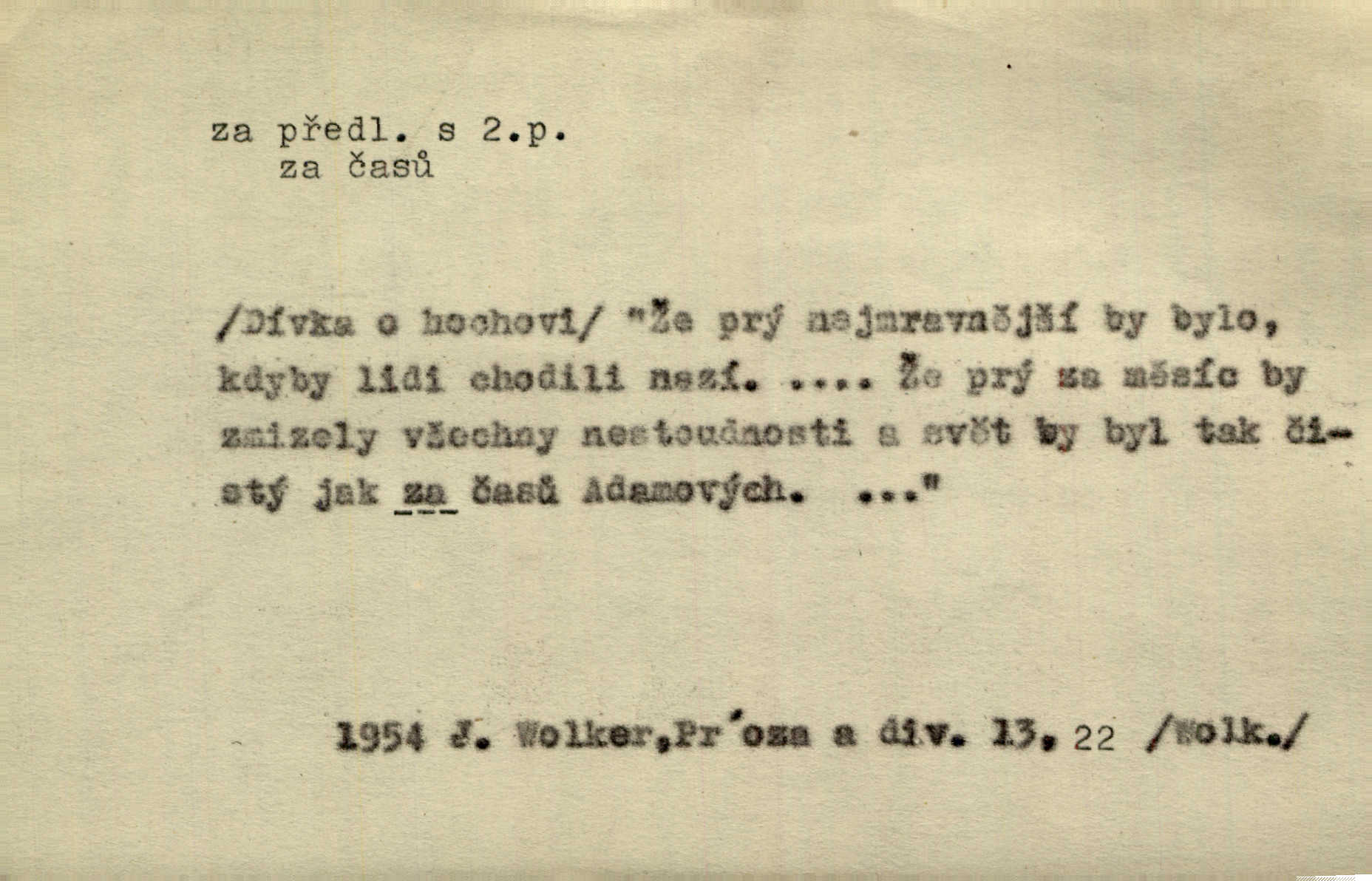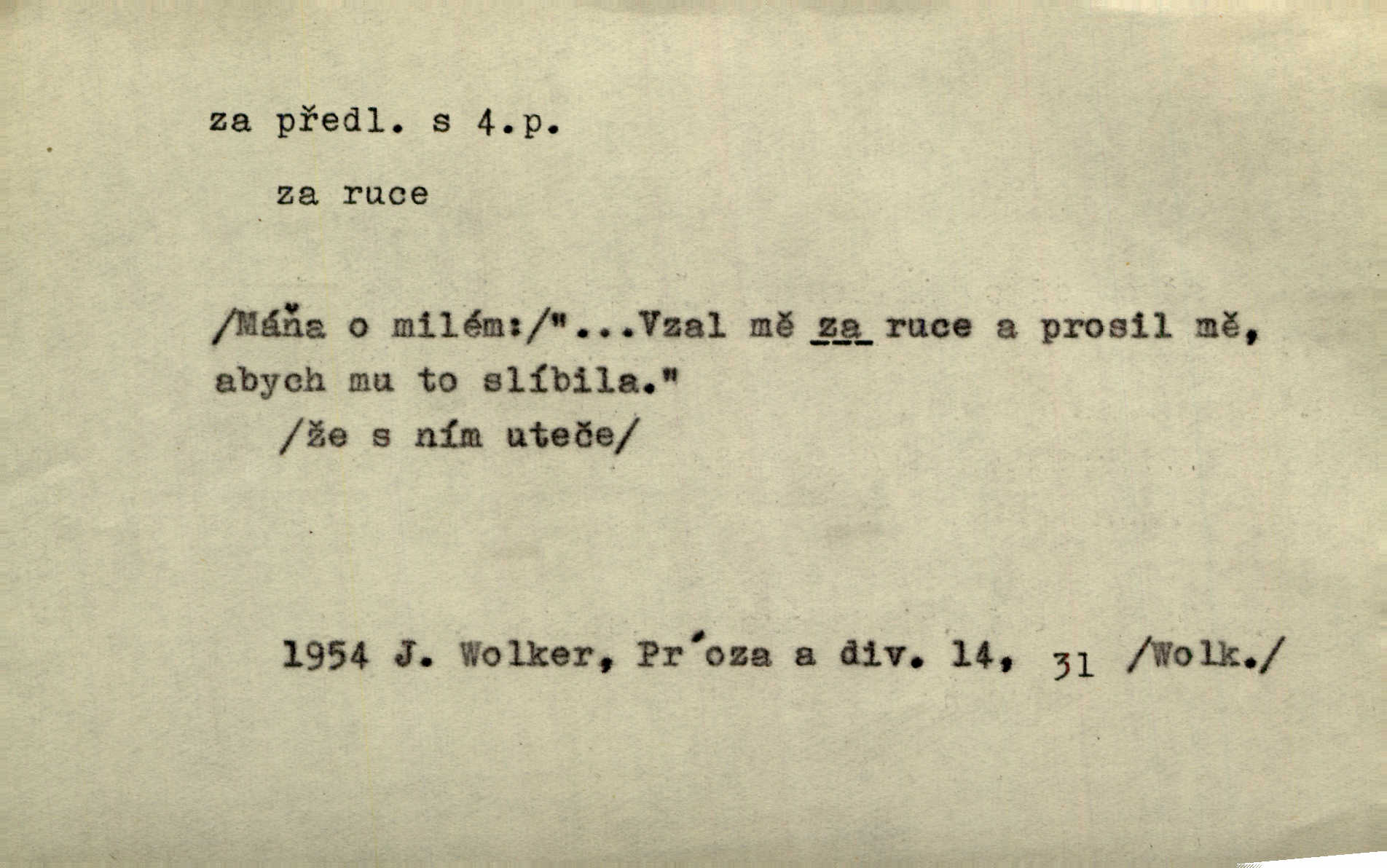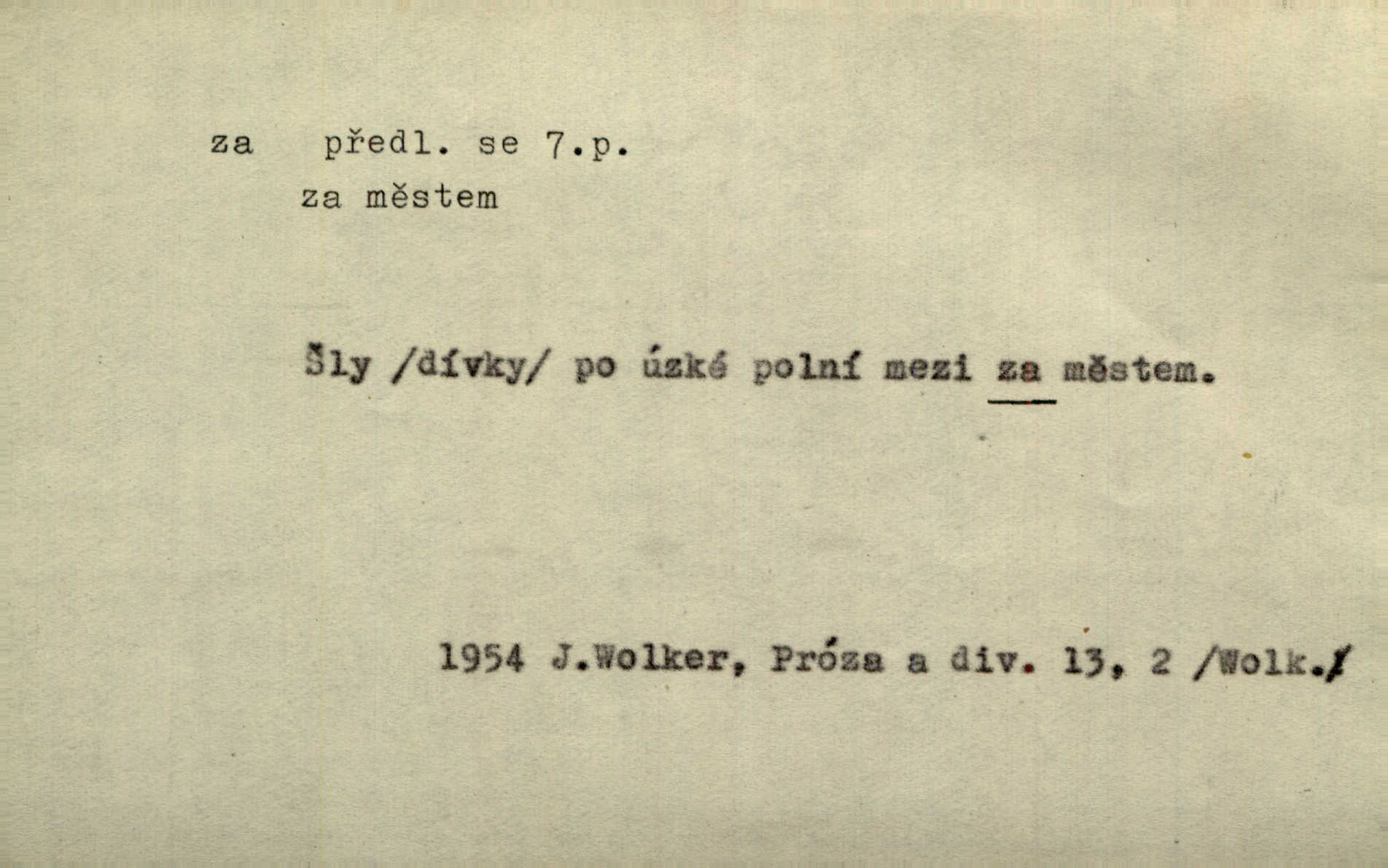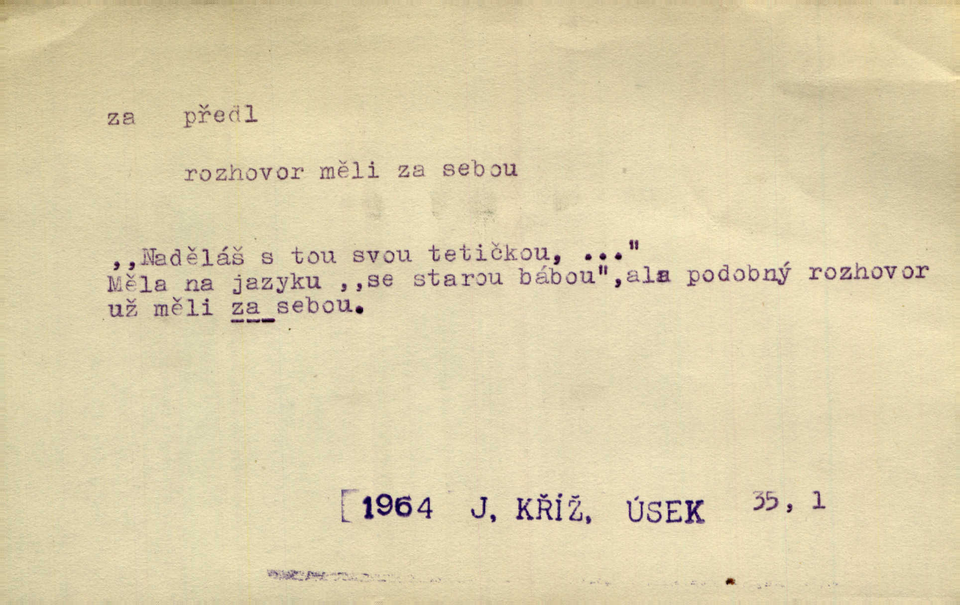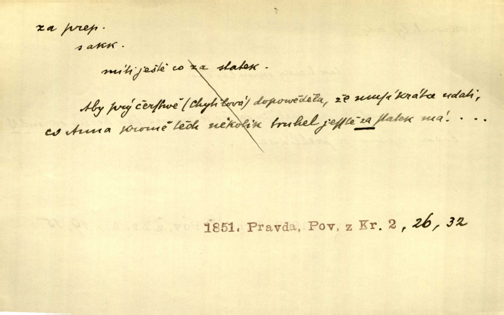 - za předl. s gen. vyjadřuje čas, dobu, v které se něco děje. Zvyk, takto zahalovati jména skutečná, za středního věku byl častý. J. Vlč. Také desátkové aby zase placeni byli, jako za starodávna. Pal. Vylíčili všeliký vplyv cizozemštiny za minulých i nynějších dob, jest úloha pro moje síly příliš veliká. Havl. Na poslední nocleh budu v Českém Brodě, abych pak odtud vyjel za bílého dne. Jir. Lidé říkali, že je v Habrech za dne tak smutno, jako v jiných vesnicích o půlnoci. Svět. Hoří za léta v obilí mák planý. Čech. To stalo se tři dni přede dnem, za kteréhož se měl Hanuš na Ostrý dostaviti. Šmil. Byl bych rád býval, kdybych se tak za času byl dozvěděl pravdu včas. Hál. D vyjadřuje okolnosti, podmínky, při nichž se děj koná, n. jiný děj, který jej doprovází. O tom vypravovala za různých příležitostí. Jir. Za jejich [císařů] panování barbarové nesměli překročiti hranice této říše rukou brannou. Pal. To bylo před sedmi lety, ještě za krále Fridricha. Jir. Tenkráte za vrchního Essentra byl v městečku Padolí na tom panství Náchodském rychtářem Josef Lelek. Jir. Za nás už býval [kantor] šedý děd. Slád. Za blesku a třesku i hukotu vln jede [námořník] klidně za svým zaměstnáním. Maj. [Hlásný] za zpěvu odtrubuje jedenáct hodin. Mrš. Takového cosi dokáže jenom vánice za účasti mrazu. Čap. Ch. Za nepřítomnosti syna byl pan Melichar v obchodu neobyčejně činný. Svět. „Už je na pravdě Boží,“ zašeptala Vrbčena za hlubokého ticha. Mrš. [Děti] prospívaly za matčiny péče i obou babiček. Jir. Já ukryl [dívku] v zadní části tábora za pomoci svých přátel. Vrch. Kdo se za živa tuze ke mně měl, v tu chvíli odpadl. Jir. Hleď, aby’s raději bez lucerny se dostal za sucha domů. Pfleg. Jeden večer za svobodna byste měli ještě ztrávit u mne. Elpl. Přece nejsem za zelena utržený, přece se od malička v roli hrabu nejsem nezkušený. Jah. Patří mně nevážnost a pohrdání u všech těch nepřítomných, v celé medicinské naší obci, u všech, jimž to členové společnosti za čerstva donesou ihned. John. Čte noviny a dává to za tepla dál. Branald. „Povídala Barchetka, že se ta její Tonča bude v Americe vdávat,“ hned za tepla jí donesli. Baar. D předl. s akus. vyjadřuje směřování k odvrácené straně něčeho, na zadní místo vzhledem k něčemu n. někomu. Opičky pak obličeje jakby studem nedovedně schovávají za vějíř. Čech. Proto byl by se málem dostal za mříže. Čap. Ch. Věděl, že to krev, která mu leje z úst a za šat zatéká. Zey. Ostatek šátku je z polovice zastrčen za vestu. Mrš. [Čáp] v podzim letí za moře. Čech. K čemu davu dělat kejklíře, za roh vřavu jeho slyšet není. Vrch. Bětka doprovodila Madlu za Jaroměř. Něm. Nespouštěli se [Čechové] starého mravu ani své jadrné, mateřské mluvy tu na kraji země, na samých hranicích království a zachovali ji až za ně. Jir. Ostatním [chatám] za tiché prahy jeho [dobyvatelovo] žoldáctvo se vtírá. Čech. Z myšlénky té prýštila se jí útěcha daleko za hrob! Šmil. Ale což, když nemůžeme platit, tak si nohu za krk nedáme nebudeme dělat nad své síly. Bojar. Rychle vstala, ještě však rychleji ukryla tajemný spisek za ňadra za šat na ňadrech. Jir. Utrhl si několik květin za klobouk za stuhu na klobouku. Herb. Sedli tedy za stoly ke stolům. Zey. Hosté chtěli sedati za stoly. Erb. Zachytil [sochař] význačné osobnosti druhého empiru, členů císařské rodiny, jež se postavila za umělce v boji o uznání poskytla pomoc, zastala se. Matějček. Já, to se rozumí, jsem se dala do pláče, a maminka se postavila za mého muže. K. Čap. Ani vy, velcí, nedočkáte se, aby se za vás postavila celá čtvrť, když vám někdo nespravedlivě ubližuje a je na vás vidět, že trpíte. Meis. D vyjadřuje umisťování mimo něco, vně něčeho. Chodil s nimi a jezdil na koni za město. Zey. Ach, vida, má žačka, která posledních několik dní chodí někam za školu. Staš. Šli tak jako děti, které se odhodlaly jíti za školu. R. Svob. Praha! tam by se to čubčilo! Pěkně s očí, do houfu, za vítr. Rón. D vyjadřuje časovou následnost n. současnost, t. j. okolnost, že se něco děje až po uplynutí nějaké doby n. průběhem nějaké doby. Představení mělo začíti teprve za dvě hodiny. Hál. Za několik dní kníže přijel. Něm. Za chvíli vešel hospodský napolo ustrojen k Prutovskému. Jir. Nelišil se za nějaký čas téměř ničím od ostatních svých spolužáků. Zey. Již za kousek cesty zahnul zase v pravo. Jir. Papá tedy za týden potom dal zapřáhnout Lucku a jel s Viky do Cirkusu Henry do Svitav. John. Revolucionáři se však vysmívali takovéto císařské dobrotě za pět minut dvanáct. Včel. Jak jsem zestárla za tu vojnu. Maj. Za celý život nestalo se mu pranic záhadného. Čech. Mého bratra můžete vídati nejednou za den. Pfleg. Za posledních třinácte let byli mezi 26 děkany naší, artistské, fakulty tři z národa českého. Jir. Za tu cestu zvěděla Mária, že Katuše hospodyně je tu v Uhrách na desátý rok. Jir. Zbývá k dodání za tento měsíc: patnáct! Čech. D Zast. vyjadřuje dobu, po niž se něco děje n. dělo. Tenkráte Přemysl ustanovil mnohé zákony, jimiž lid v kázeň uvedl a jimiž se pak spravovali jeho potomci za mnohé věky. Jir. Než se páni dali do examinování, radili se za dobrou chvíli. Win. Vázání pleny není snadné; děje se před zrcadlem a trvá za drahnou chvíli. Jir. A když stáli v poli za dvě neděle, Prokop točí oči k hradu zmrzele. Čel. Ještě se za některou chvíli děvčata bavila, pak vyprovodila Bára Elšku domů. Něm. Nic se nehýbalo v dědině za dlouhou dobu. Herb. Položila je [šperky] na stůl, kde don Clemente je za tři sekundy oke