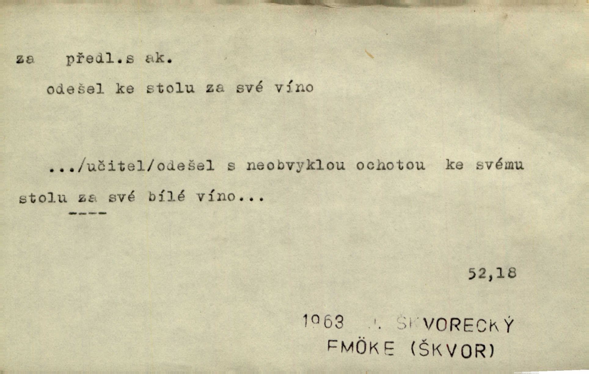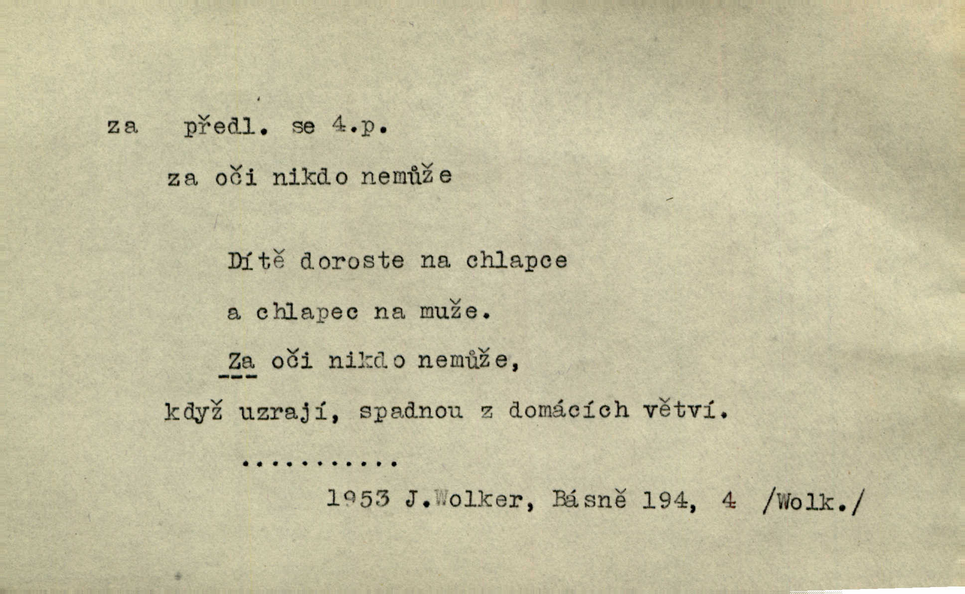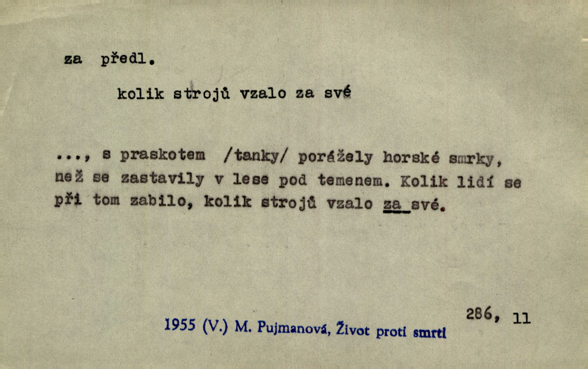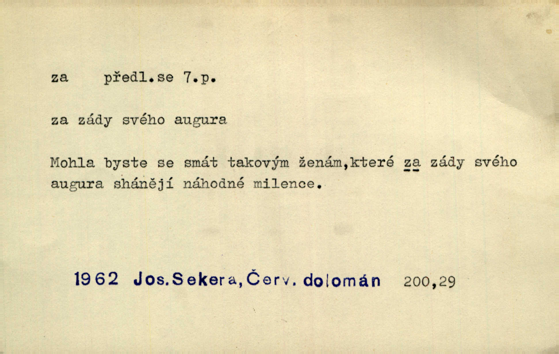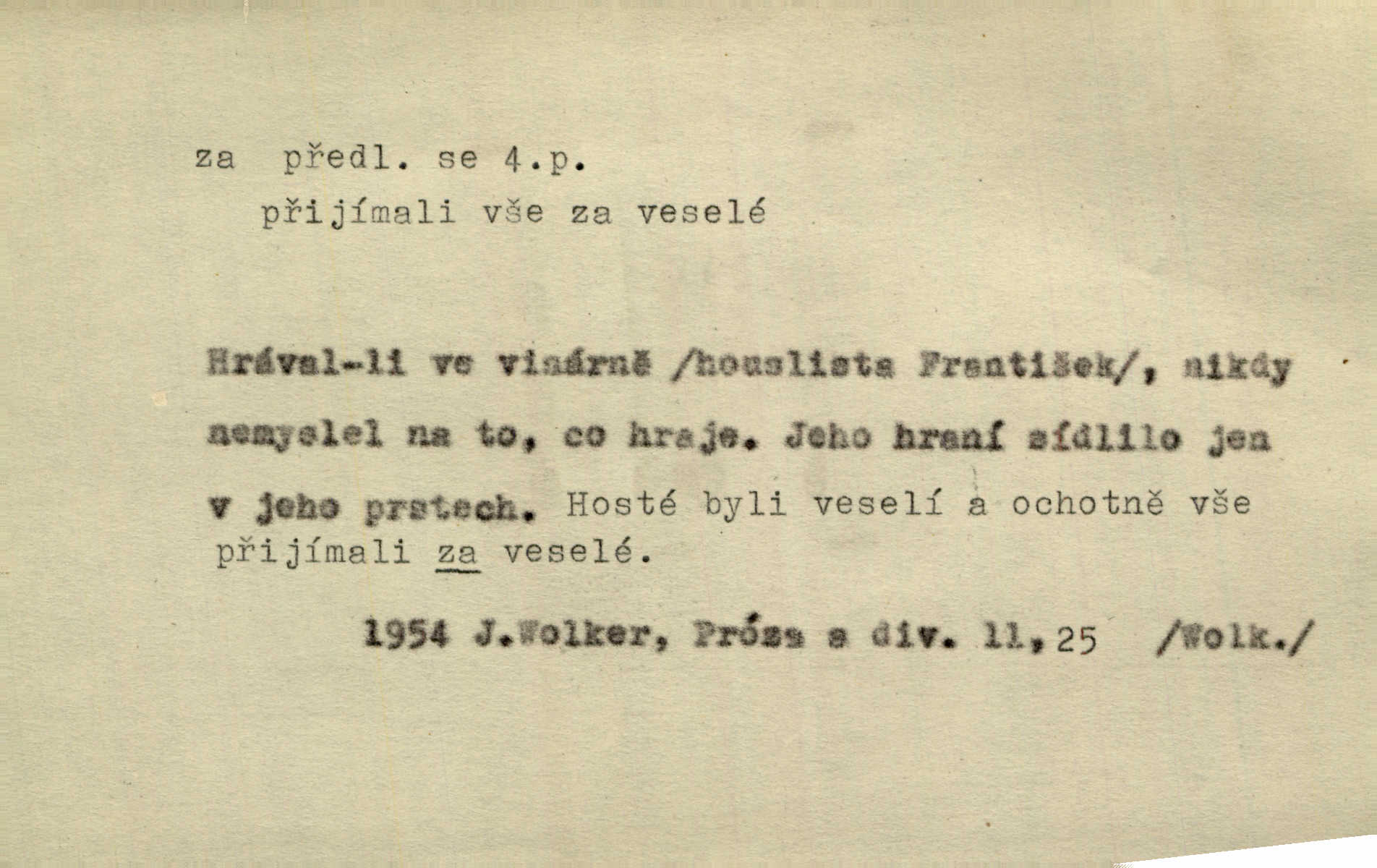 - za předl. s gen. vyjadřuje čas, dobu, v které se něco děje. Zvyk, takto zahalovati jména skutečná, za středního věku byl častý. J. Vlč. Také desátkové aby zase placeni byli, jako za starodávna. Pal. Vylíčili všeliký vplyv cizozemštiny za minulých i nynějších dob, jest úloha pro moje síly příliš veliká. Havl. Na poslední nocleh budu v Českém Brodě, abych pak odtud vyjel za bílého dne. Jir. Lidé říkali, že je v Habrech za dne tak smutno, jako v jiných vesnicích o půlnoci. Svět. Hoří za léta v obilí mák planý. Čech. To stalo se tři dni přede dnem, za kteréhož se měl Hanuš na Ostrý dostaviti. Šmil. Byl bych rád býval, kdybych se tak za času byl dozvěděl pravdu včas. Hál. D vyjadřuje okolnosti, podmínky, při nichž se děj koná, n. jiný děj, který jej doprovází. O tom vypravovala za různých příležitostí. Jir. Za jejich [císařů] panování barbarové nesměli překročiti hranice této říše rukou brannou. Pal. To bylo před sedmi lety, ještě za krále Fridricha. Jir. Tenkráte za vrchního Essentra byl v městečku Padolí na tom panství Náchodském rychtářem Josef Lelek. Jir. Za nás už býval [kantor] šedý děd. Slád. Za blesku a třesku i hukotu vln jede [námořník] klidně za svým zaměstnáním. Maj. [Hlásný] za zpěvu odtrubuje jedenáct hodin. Mrš. Takového cosi dokáže jenom vánice za účasti mrazu. Čap. Ch. Za nepřítomnosti syna byl pan Melichar v obchodu neobyčejně činný. Svět. „Už je na pravdě Boží,“ zašeptala Vrbčena za hlubokého ticha. Mrš. [Děti] prospívaly za matčiny péče i obou babiček. Jir. Já ukryl [dívku] v zadní části tábora za pomoci svých přátel. Vrch. Kdo se za živa tuze ke mně měl, v tu chvíli odpadl. Jir. Hleď, aby’s raději bez lucerny se dostal za sucha domů. Pfleg. Jeden večer za svobodna byste měli ještě ztrávit u mne. Elpl. Přece nejsem za zelena utržený, přece se od malička v roli hrabu nejsem nezkušený. Jah. Patří mně nevážnost a pohrdání u všech těch nepřítomných, v celé medicinské naší obci, u všech, jimž to členové společnosti za čerstva donesou ihned. John. Čte noviny a dává to za tepla dál. Branald. „Povídala Barchetka, že se ta její Tonča bude v Americe vdávat,“ hned za tepla jí donesli. Baar. D předl. s akus. vyjadřuje směřování k odvrácené straně něčeho, na zadní místo vzhledem k něčemu n. někomu. Opičky pak obličeje jakby studem nedovedně schovávají za vějíř. Čech. Proto byl by se málem dostal za mříže. Čap. Ch. Věděl, že to krev, která mu leje z úst a za šat zatéká. Zey. Ostatek šátku je z polovice zastrčen za vestu. Mrš. [Čáp] v podzim letí za moře. Čech. K čemu davu dělat kejklíře, za roh vřavu jeho slyšet není. Vrch. Bětka doprovodila Madlu za Jaroměř. Něm. Nespouštěli se [Čechové] starého mravu ani své jadrné, mateřské mluvy tu na kraji země, na samých hranicích království a zachovali ji až za ně. Jir. Ostatním [chatám] za tiché prahy jeho [dobyvatelovo] žoldáctvo se vtírá. Čech. Z myšlénky té prýštila se jí útěcha daleko za hrob! Šmil. Ale což, když nemůžeme platit, tak si nohu za krk nedáme nebudeme dělat nad své síly. Bojar. Rychle vstala, ještě však rychleji ukryla tajemný spisek za ňadra za šat na ňadrech. Jir. Utrhl si několik květin za klobouk za stuhu na klobouku. Herb. Sedli tedy za stoly ke stolům. Zey. Hosté chtěli sedati za stoly. Erb. Zachytil [sochař] význačné osobnosti druhého empiru, členů císařské rodiny, jež se postavila za umělce v boji o uznání poskytla pomoc, zastala se. Matějček. Já, to se rozumí, jsem se dala do pláče, a maminka se postavila za mého muže. K. Čap. Ani vy, velcí, nedočkáte se, aby se za vás postavila celá čtvrť, když vám někdo nespravedlivě ubližuje a je na vás vidět, že trpíte. Meis. D vyjadřuje umisťování mimo něco, vně něčeho. Chodil s nimi a jezdil na koni za město. Zey. Ach, vida, má žačka, která posledních několik dní chodí někam za školu. Staš. Šli tak jako děti, které se odhodlaly jíti za školu. R. Svob. Praha! tam by se to čubčilo! Pěkně s očí, do houfu, za vítr. Rón. D vyjadřuje časovou následnost n. současnost, t. j. okolnost, že se něco děje až po uplynutí nějaké doby n. průběhem nějaké doby. Představení mělo začíti teprve za dvě hodiny. Hál. Za několik dní kníže přijel. Něm. Za chvíli vešel hospodský napolo ustrojen k Prutovskému. Jir. Nelišil se za nějaký čas téměř ničím od ostatních svých spolužáků. Zey. Již za kousek cesty zahnul zase v pravo. Jir. Papá tedy za týden potom dal zapřáhnout Lucku a jel s Viky do Cirkusu Henry do Svitav. John. Revolucionáři se však vysmívali takovéto císařské dobrotě za pět minut dvanáct. Včel. Jak jsem zestárla za tu vojnu. Maj. Za celý život nestalo se mu pranic záhadného. Čech. Mého bratra můžete vídati nejednou za den. Pfleg. Za posledních třinácte let byli mezi 26 děkany naší, artistské, fakulty tři z národa českého. Jir. Za tu cestu zvěděla Mária, že Katuše hospodyně je tu v Uhrách na desátý rok. Jir. Zbývá k dodání za tento měsíc: patnáct! Čech. D Zast. vyjadřuje dobu, po niž se něco děje n. dělo. Tenkráte Přemysl ustanovil mnohé zákony, jimiž lid v kázeň uvedl a jimiž se pak spravovali jeho potomci za mnohé věky. Jir. Než se páni dali do examinování, radili se za dobrou chvíli. Win. Vázání pleny není snadné; děje se před zrcadlem a trvá za drahnou chvíli. Jir. A když stáli v poli za dvě neděle, Prokop točí oči k hradu zmrzele. Čel. Ještě se za některou chvíli děvčata bavila, pak vyprovodila Bára Elšku domů. Něm. Nic se nehýbalo v dědině za dlouhou dobu. Herb. Položila je [šperky] na stůl, kde don Clemente je za tři sekundy oke