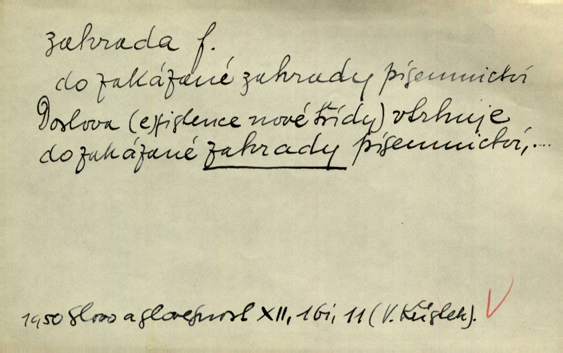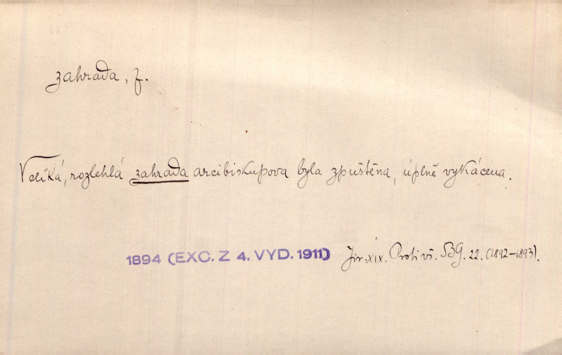 - zahrada, -y f. ohrazený pozemek při obydlích, na kterém se obyč. pěstují květiny, zelenina, stromy užitkové a okrasné. Když průvod stanul před schodištěm paláce, pokryl se dvůr a zahrada množstvím lidí. Vanč. Pak podíval se do zahrady; to požehnání jablek, sliv se stenčilo. Slád. Tam padla zahrada staletých buků, krása krásoucí! Spirh. Naslouchal hudbě kapely v některé hostinské zahradě za branou. Čech. Dítě bez otce je jako zahrada bez plotu nevychované. Dyk. Žena bez muže, zahrada bez plotu každý si na ni troufá. Hol. Přijdeme do Krumlovského stromořadí, kde je botanická zahrada. Máša. [Za ty peníze] byli bychom dostali živý exemplář [lva] ze zoologické zahrady. Kytl. Anglická zahrada naproti tomu je empirickým realismem v anglickém, t. zv. přírodním stylu. Lit. noviny. Vzal si do vlasti hrstku hlíny ze zahrady getsemanské. Třeb. Divem světa nazývali Řekové „visuté zahrady“. Byly to zahrady, které dal postavit král své manželce Semiramis. Dějepis. Eh! jdi třebas až do Krakonošovy zahrady. Podl. Jste vy to kvítkové z raráškovy zahrady darebáci. Něm. Tak často zní [písně] nad krajem „zahrady Moravy“ — moravského Slovácka. Týd. rozhl. Slunce nalévalo své paprsky také do této nesmrtelné zahrady, kde bolest konejšena vírou v shledání hřbitova. R. Svob. Zast. Kde jsem se to octnul! Veřejné ve zahradě parku. Ner. Přen. Uvidíte, jaký dar jest láska manželská a jakou jest zahradou v suchopáru lidského živobytí. Šmil. Spleen a nuda jako chladný vítr zavály do zahrady její duše. Hlad. Byla doba nejsladších květů v zahradě žití Panny přesvaté. Zey. Chytil [jsem] blesk, než k zemi spad, Hesperidských ze zahrad s nebe. Vrch. Tvá slavnost dnes v zahradách věčných! na věčnosti. Břez. Viděl tam [ve výkladní skříni] naskládaných svazečků, barevných obálek a celou zahradu nápisů a vět množství. Včel. Zool. zoologická zahrada ústav chovající k účelům vědeckým i populárně poučným živou zvěř; zoo. Zahr. zahrada užitková (zelinářská, ovocná); ozdobná, květinová.