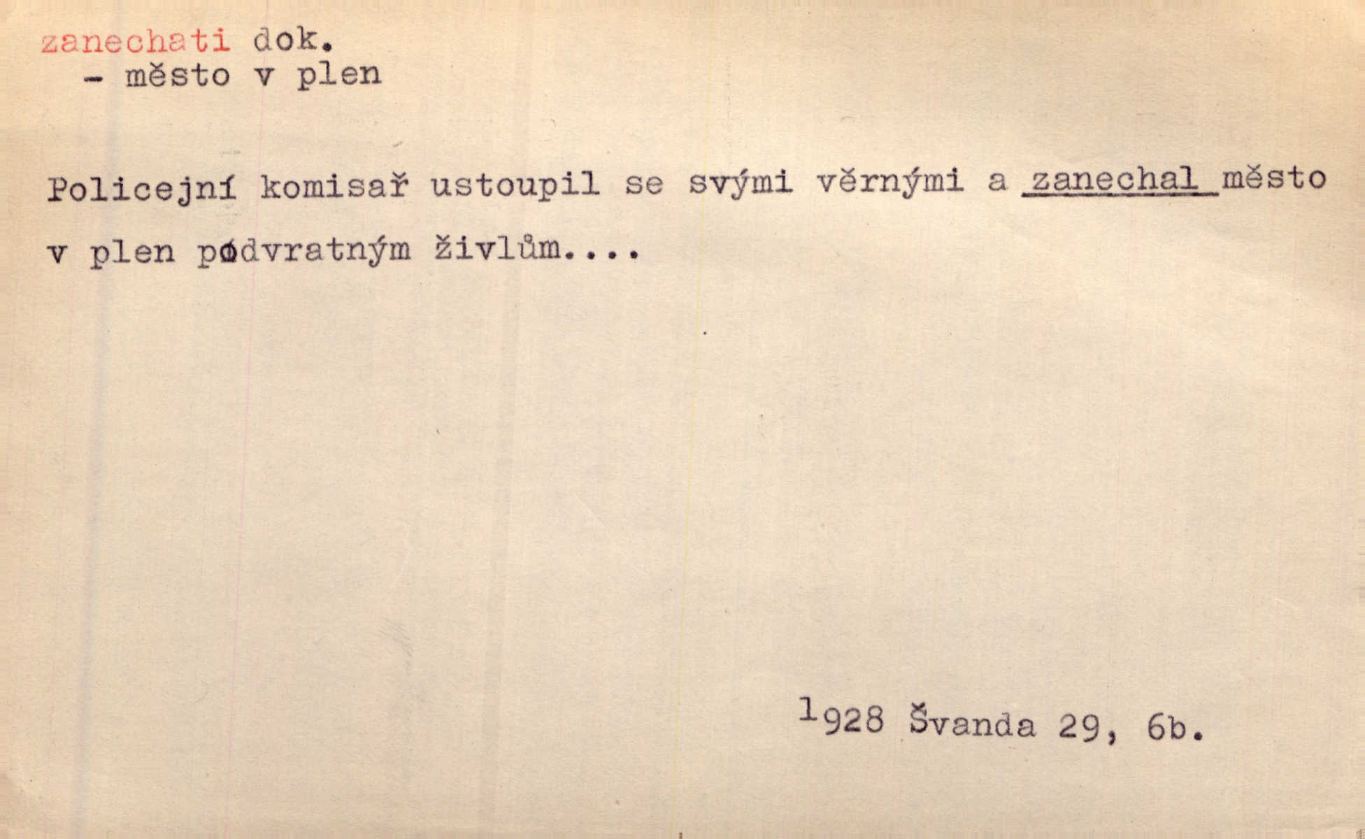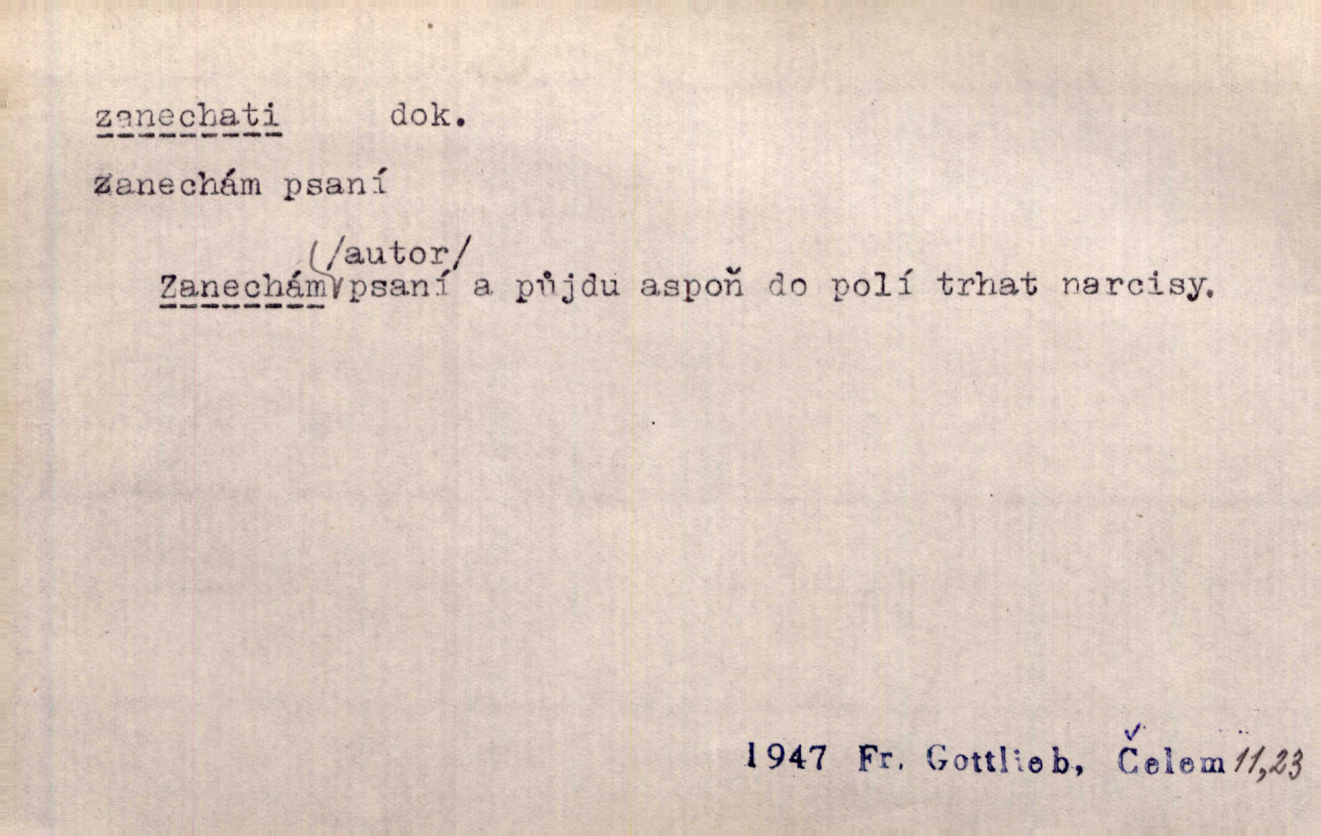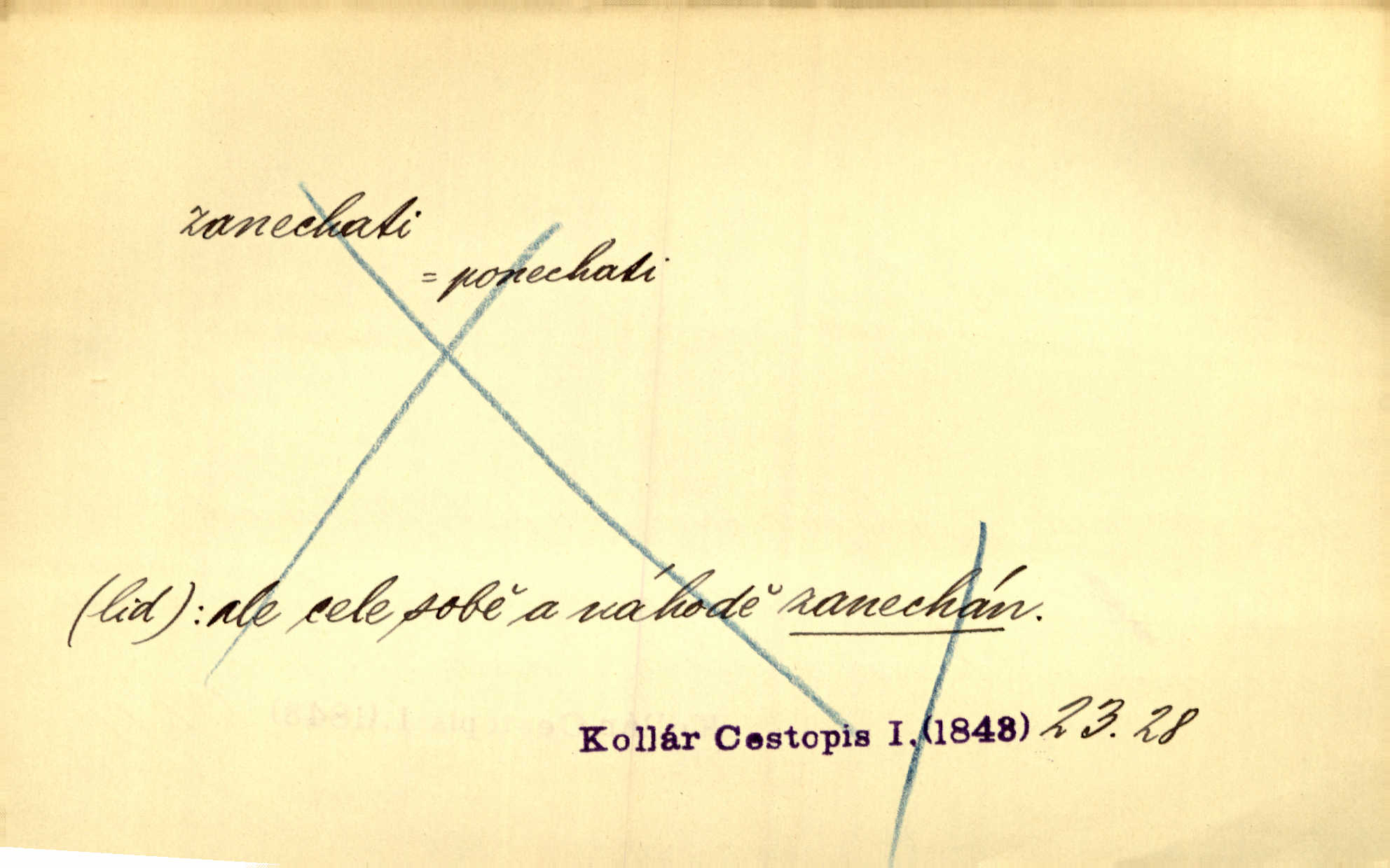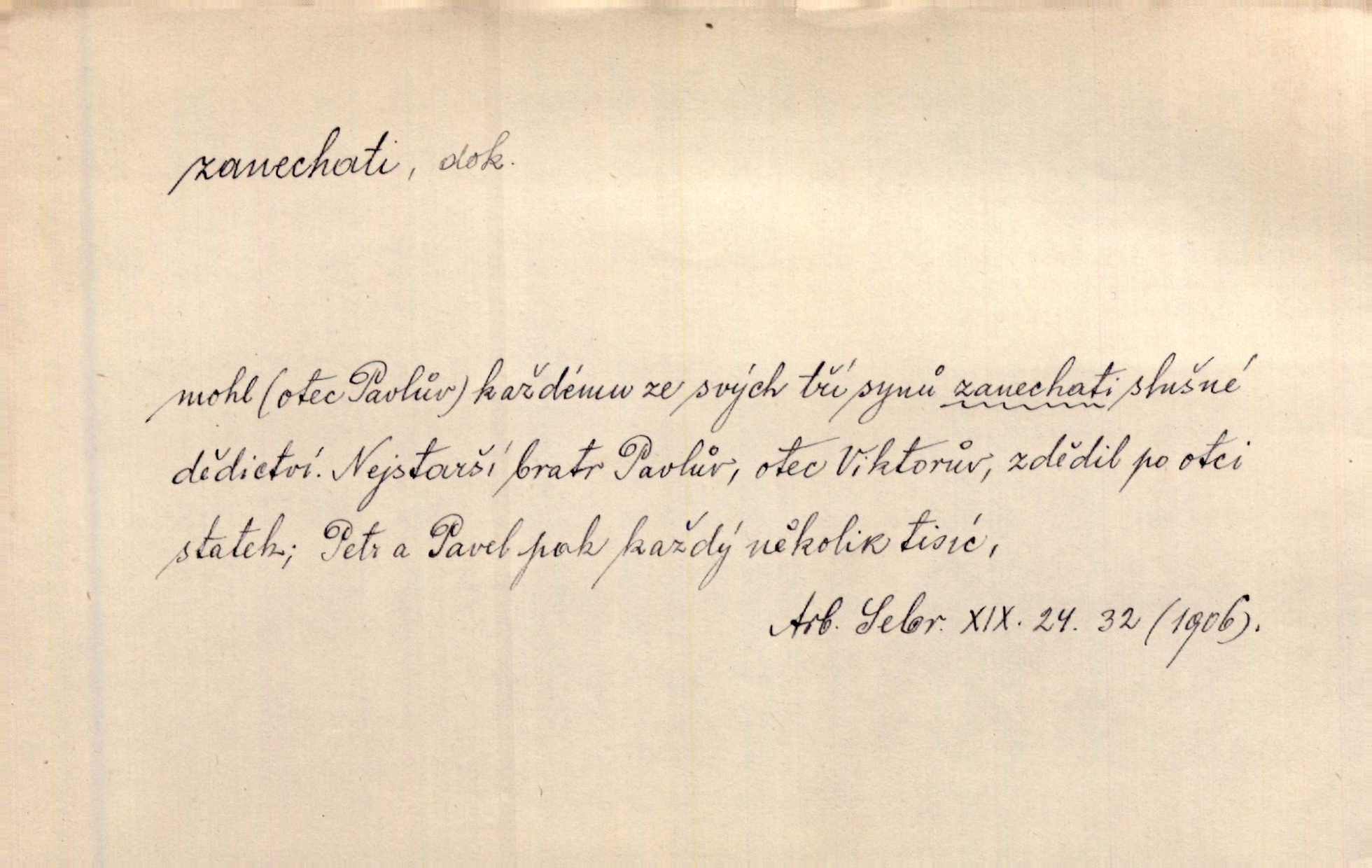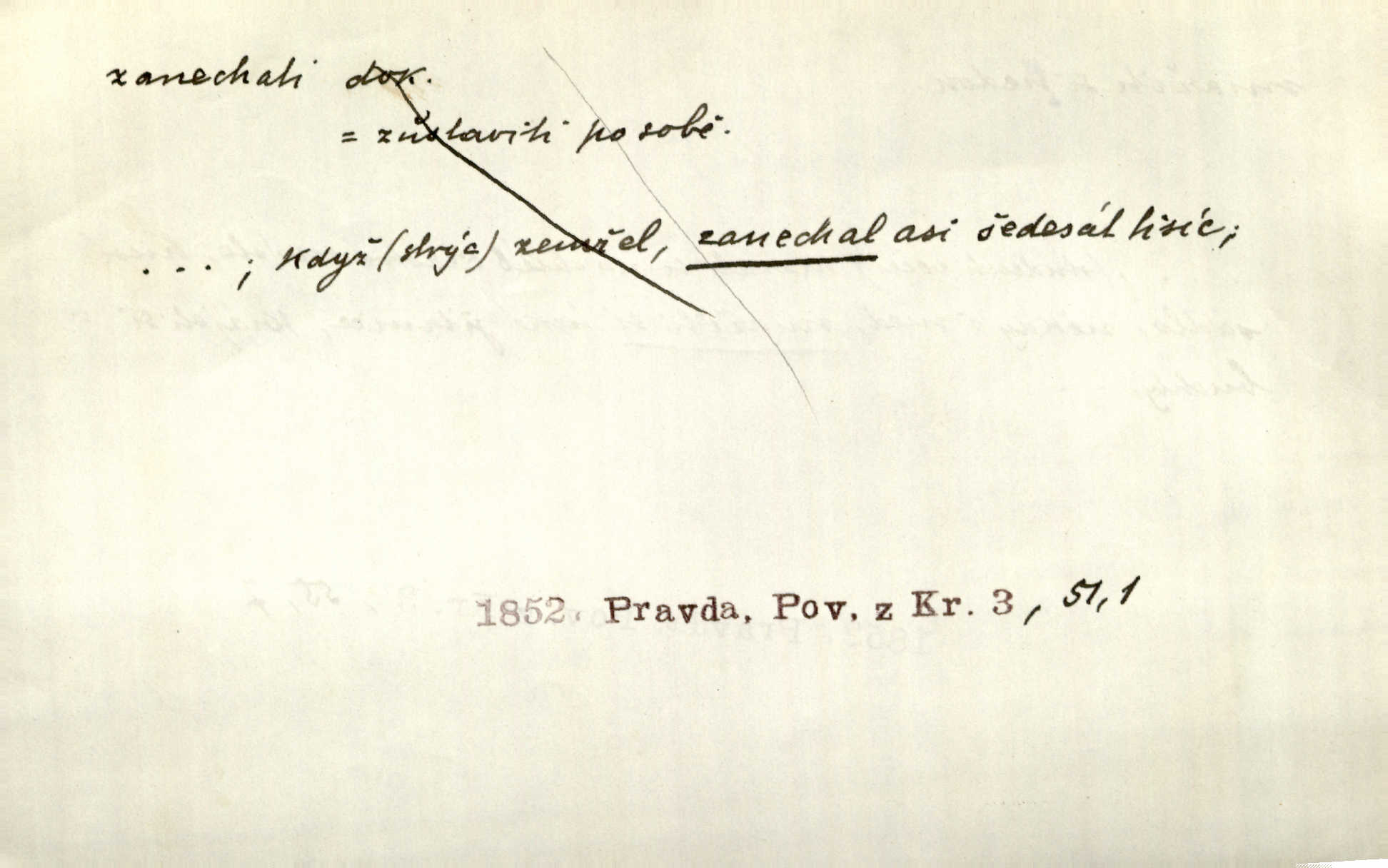 - zanechati dok. (imper. zanech) (co komu) nechati, ponechati, zůstaviti po sobě něco někomu. Dětem svým zanecháte dobré dědictví. Herb. Zanechá svým dětem slušné hospodářství. Vach. Choť zanechala mu k útěše tři krásné dcery. Čech. Vždyť jste zanechala nám své požehnání. Slád. [Hrabě] nezanechal žádné závěti. Jir. Teď své poklady zanechali nepřátelům. J. Heyd. Zanechal město v plen podvratným živlům. Švan. Pan rada zanechal Cimburovi vzkaz, že před polednem nevyjedou. Baar. Pohled Honzův dával tušiti lidem, jak veliké zásoby zloby zanechal v něm život. A. Mrš. Kdo prošel mým dětstvím, každý tam zanechal stopu. Mach. Vědomí, že zanechal člověk brázdu v cizí duši — to je nade všecko. Sez. Smrt mladšího syna zanechala v jejím srdci otevřenou ránu. Č. Jeř. [Těžký porod] zanechal následky. John. Dějiny křesťanství zanechaly těžký dojem v její duši. R. Svob. Hned na první pohled se přesvědčíme, že si ministerstvo nejdůležitější věci zanechalo za lubem utajilo. Havl. Zanechal sobě vrata zajistil se pro všechny případy. Čel. Kdykoliv něco před se vzal, zanechal si vždycky kozí vrátka. Šmil. D (koho, co) opustiti, ponechati, zůstaviti někoho samotného, bez ochrany, péče, pomoci, nepostarati se o něco. Do svaté země rytíř odejel, a věrnou ženu doma zanechal. Vrch. Ah, a zemřel beze mně, zanechal mě, můj Kyros! Zey. Sotvaže slyší, že muž měl jinou, s dítětem že ji zanechal, jde a skočí do vody. Rais. Jdu vás prosit, abyste ho zanechala, abyste za ním nechodila. R. Svob. Josef ještě nebyl na ouřadě a cikáni již byli mnoho hodin cesty od místa, kde ho zanechali. Prav. Ubíraje se do salonu, zanechal lichváře s Valentinem. Arb. Kněžna vás volá, kněžna rozkazuje zanechati stád a shromážditi se s kopími. Vanč. Zanechme řezníků a pojďme do trhu na rynk. Win. A tu mi tedy radíš, abych zanechav lidu věrného, o bezpečí hlavy své se postaral? Tyl. Lid náš vznícen dechem Páně zanechal svých příbytků. Čech. Víc nás tam na tiché lávce není, to už je dávno zanechaná půda. Svob. Jde ke své práci včera zanechané. Leg. Viďte, že jste slečny Betty zanechal? přerušil poměr. Šmil. Slovinec svého kroje buď zcela zanechal aneb jej cizím pokazil odložil. Něm. To byla vůle Boží, aby [duše] zanechaly tento svět zemřely. Havl. Nemyslete, že snad bych ji úplně zanechal bídě připustil, aby trpěla bídu. Svob. Sobě zanecháni v prostřed širých polí mrtví podřimují opuštěni. Leg. Nemysli, až budeš ve světě a sám sobě zanechán, že můžeš dělati, co chceš odkázán na sebe. Šmil. D (čeho, zř. co) upustiti, ustati od něčeho, přestati s něčím. Cítíš-li, že nejsi ve své kůži, zanech cvičení! O. Jand. Zanechal hry. Zey. Pavel chybil velice, že zanechal studií. Čech. Kondelík zanechá živnosti. Herrm. Doktor hodlal prakse zanechati. Šmil. Vzpomněl si na tuto příhodu ze svého houslaření, před lety již zanechaného. Čap. Ch. Myslili, že zapotřebí jest, aby zanechali předešlý život a přijali nové mravy. Prav. Zanech těch myšlenek! Mrš. Kdo lásky žádáš, zanech doufání. Quis. Kdys mně kamarádi domlouvali, abych zanechal mrzutosti a s nimi byl vesel. Něm. D (co komu) řidč. odevzdati, přenechati něco někomu. Nedělaly nic a zanechaly péči o živobytí docela svým rodičům. Něm. Ostatní zanechali osudu a vesele odtáhli se svou kořistí. Vanč. Ty hračky, Titiane, zanech mládí. Vrch. Duchovní zprávce zanechal rakev péči hrobníkově. Tyl. D zanechati si (co) poněk. zast. podržeti u sebe, pro sebe, ponechati si něco. Zanechal si jenom několik kousků polí. Herb. Ničeho si nezanechal, jen otcovu šavli při boku. Něm. Rodina prodala [panství], zanechavši sobě toliko jednu ves. Koll. Já k příhodnější zanechal si chvíli ti ukázat, že silnější jsem tebe. Vrch. Jsem vedle tebe žena ubohá, jež dadouc srdce, sama nemá nic, jen touhu zanechavši sobě bolestnou. Hál. O vyvinování celého děle zanecháme si úsudek, až novellu dokončí. Havl. Seschlá tváře zanechala na sobě lehký úsměv. Svob.