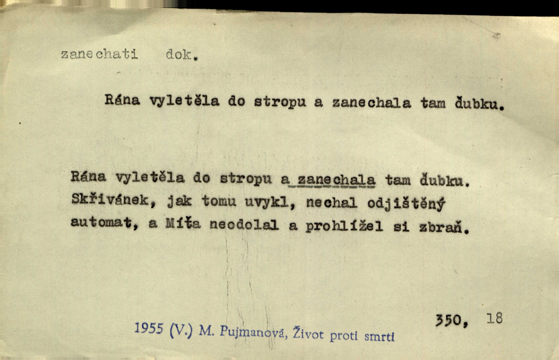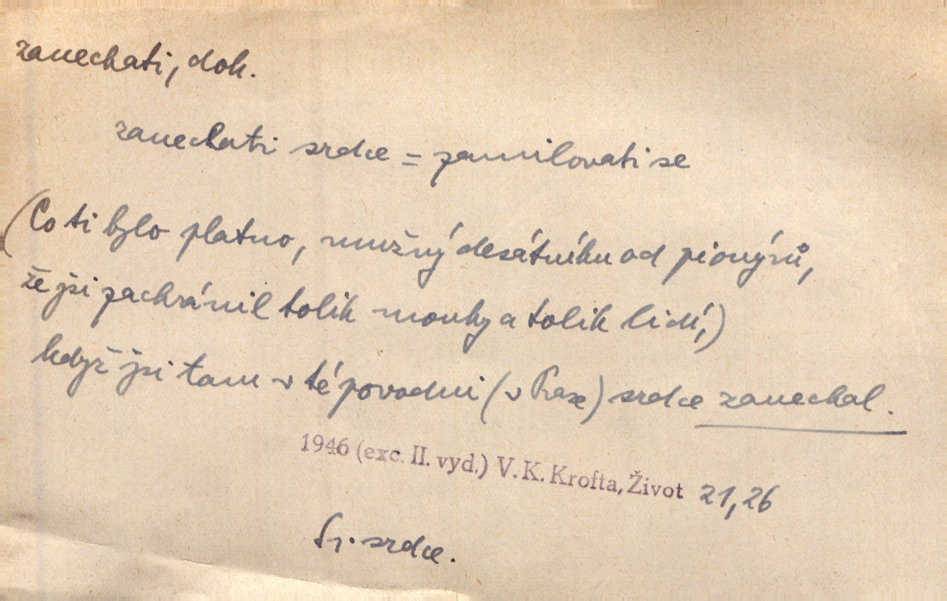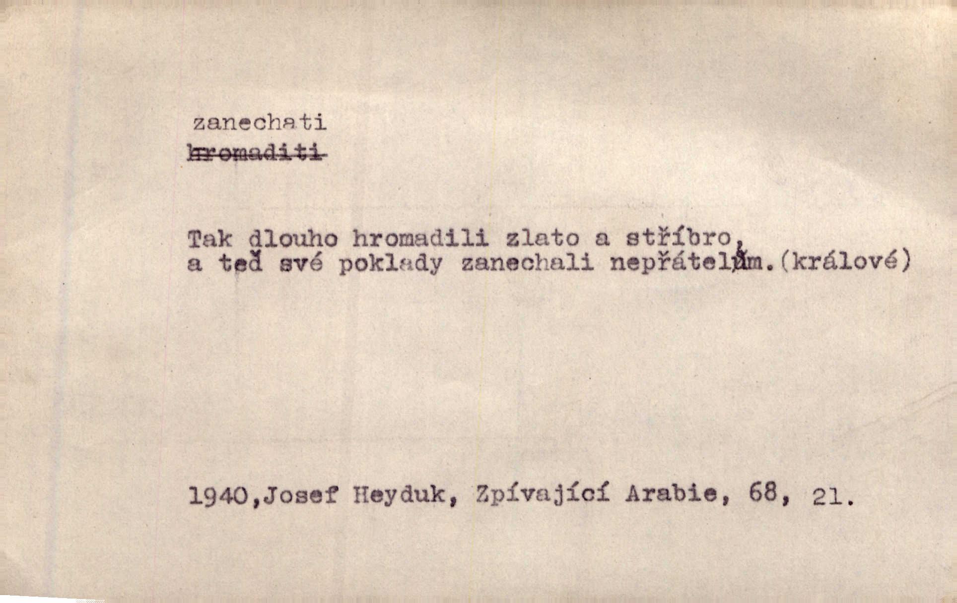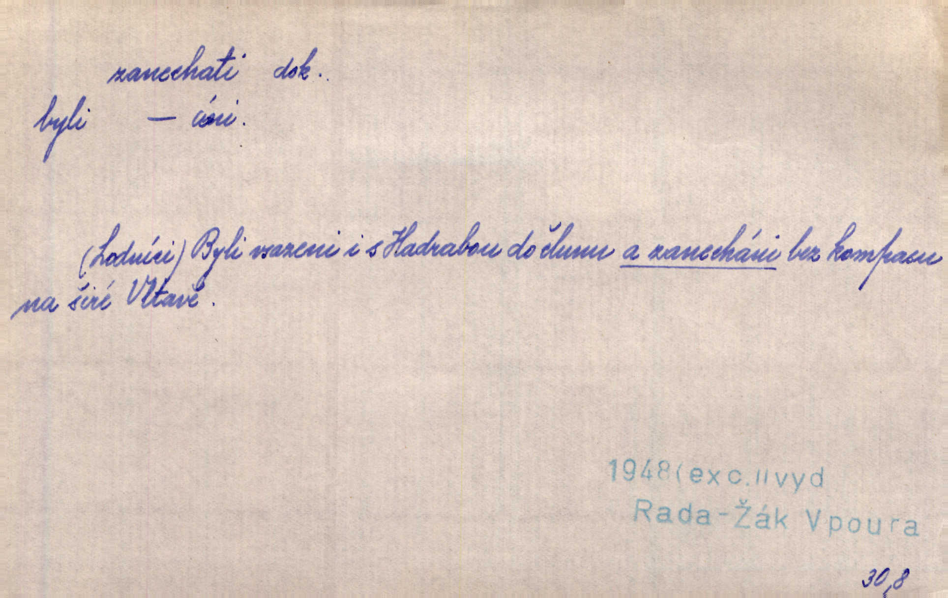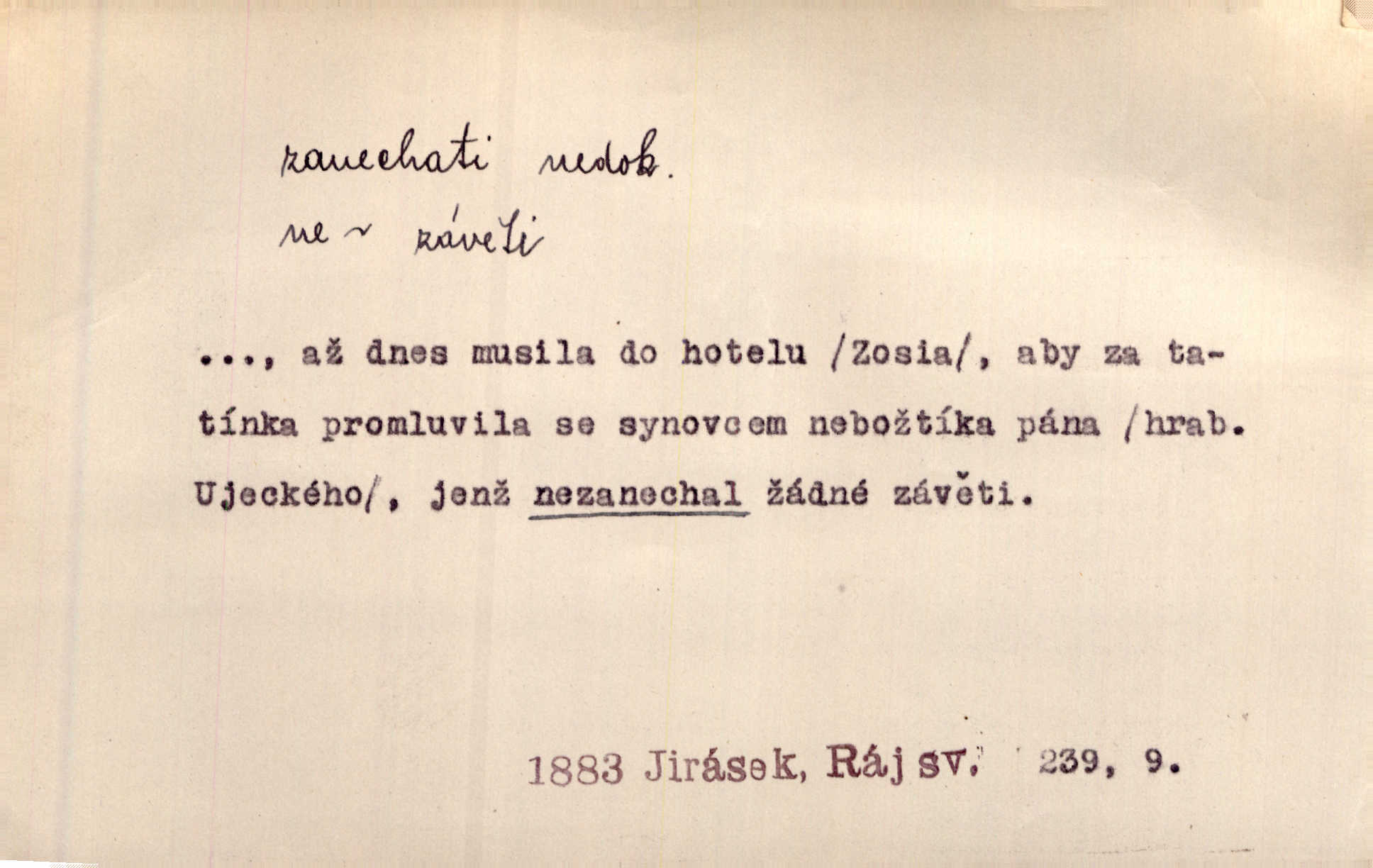 - zanechati dok. (imper. zanech) (co komu) nechati, ponechati, zůstaviti po sobě něco někomu. Dětem svým zanecháte dobré dědictví. Herb. Zanechá svým dětem slušné hospodářství. Vach. Choť zanechala mu k útěše tři krásné dcery. Čech. Vždyť jste zanechala nám své požehnání. Slád. [Hrabě] nezanechal žádné závěti. Jir. Teď své poklady zanechali nepřátelům. J. Heyd. Zanechal město v plen podvratným živlům. Švan. Pan rada zanechal Cimburovi vzkaz, že před polednem nevyjedou. Baar. Pohled Honzův dával tušiti lidem, jak veliké zásoby zloby zanechal v něm život. A. Mrš. Kdo prošel mým dětstvím, každý tam zanechal stopu. Mach. Vědomí, že zanechal člověk brázdu v cizí duši — to je nade všecko. Sez. Smrt mladšího syna zanechala v jejím srdci otevřenou ránu. Č. Jeř. [Těžký porod] zanechal následky. John. Dějiny křesťanství zanechaly těžký dojem v její duši. R. Svob. Hned na první pohled se přesvědčíme, že si ministerstvo nejdůležitější věci zanechalo za lubem utajilo. Havl. Zanechal sobě vrata zajistil se pro všechny případy. Čel. Kdykoliv něco před se vzal, zanechal si vždycky kozí vrátka. Šmil. D (koho, co) opustiti, ponechati, zůstaviti někoho samotného, bez ochrany, péče, pomoci, nepostarati se o něco. Do svaté země rytíř odejel, a věrnou ženu doma zanechal. Vrch. Ah, a zemřel beze mně, zanechal mě, můj Kyros! Zey. Sotvaže slyší, že muž měl jinou, s dítětem že ji zanechal, jde a skočí do vody. Rais. Jdu vás prosit, abyste ho zanechala, abyste za ním nechodila. R. Svob. Josef ještě nebyl na ouřadě a cikáni již byli mnoho hodin cesty od místa, kde ho zanechali. Prav. Ubíraje se do salonu, zanechal lichváře s Valentinem. Arb. Kněžna vás volá, kněžna rozkazuje zanechati stád a shromážditi se s kopími. Vanč. Zanechme řezníků a pojďme do trhu na rynk. Win. A tu mi tedy radíš, abych zanechav lidu věrného, o bezpečí hlavy své se postaral? Tyl. Lid náš vznícen dechem Páně zanechal svých příbytků. Čech. Víc nás tam na tiché lávce není, to už je dávno zanechaná půda. Svob. Jde ke své práci včera zanechané. Leg. Viďte, že jste slečny Betty zanechal? přerušil poměr. Šmil. Slovinec svého kroje buď zcela zanechal aneb jej cizím pokazil odložil. Něm. To byla vůle Boží, aby [duše] zanechaly tento svět zemřely. Havl. Nemyslete, že snad bych ji úplně zanechal bídě připustil, aby trpěla bídu. Svob. Sobě zanecháni v prostřed širých polí mrtví podřimují opuštěni. Leg. Nemysli, až budeš ve světě a sám sobě zanechán, že můžeš dělati, co chceš odkázán na sebe. Šmil. D (čeho, zř. co) upustiti, ustati od něčeho, přestati s něčím. Cítíš-li, že nejsi ve své kůži, zanech cvičení! O. Jand. Zanechal hry. Zey. Pavel chybil velice, že zanechal studií. Čech. Kondelík zanechá živnosti. Herrm. Doktor hodlal prakse zanechati. Šmil. Vzpomněl si na tuto příhodu ze svého houslaření, před lety již zanechaného. Čap. Ch. Myslili, že zapotřebí jest, aby zanechali předešlý život a přijali nové mravy. Prav. Zanech těch myšlenek! Mrš. Kdo lásky žádáš, zanech doufání. Quis. Kdys mně kamarádi domlouvali, abych zanechal mrzutosti a s nimi byl vesel. Něm. D (co komu) řidč. odevzdati, přenechati něco někomu. Nedělaly nic a zanechaly péči o živobytí docela svým rodičům. Něm. Ostatní zanechali osudu a vesele odtáhli se svou kořistí. Vanč. Ty hračky, Titiane, zanech mládí. Vrch. Duchovní zprávce zanechal rakev péči hrobníkově. Tyl. D zanechati si (co) poněk. zast. podržeti u sebe, pro sebe, ponechati si něco. Zanechal si jenom několik kousků polí. Herb. Ničeho si nezanechal, jen otcovu šavli při boku. Něm. Rodina prodala [panství], zanechavši sobě toliko jednu ves. Koll. Já k příhodnější zanechal si chvíli ti ukázat, že silnější jsem tebe. Vrch. Jsem vedle tebe žena ubohá, jež dadouc srdce, sama nemá nic, jen touhu zanechavši sobě bolestnou. Hál. O vyvinování celého děle zanecháme si úsudek, až novellu dokončí. Havl. Seschlá tváře zanechala na sobě lehký úsměv. Svob.
