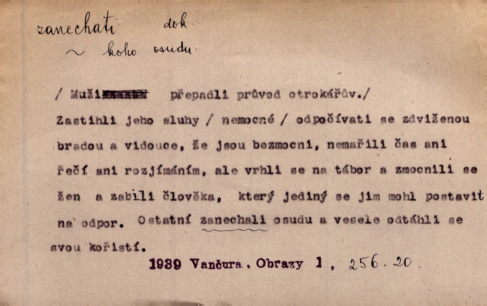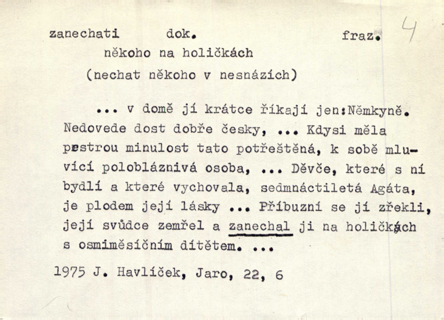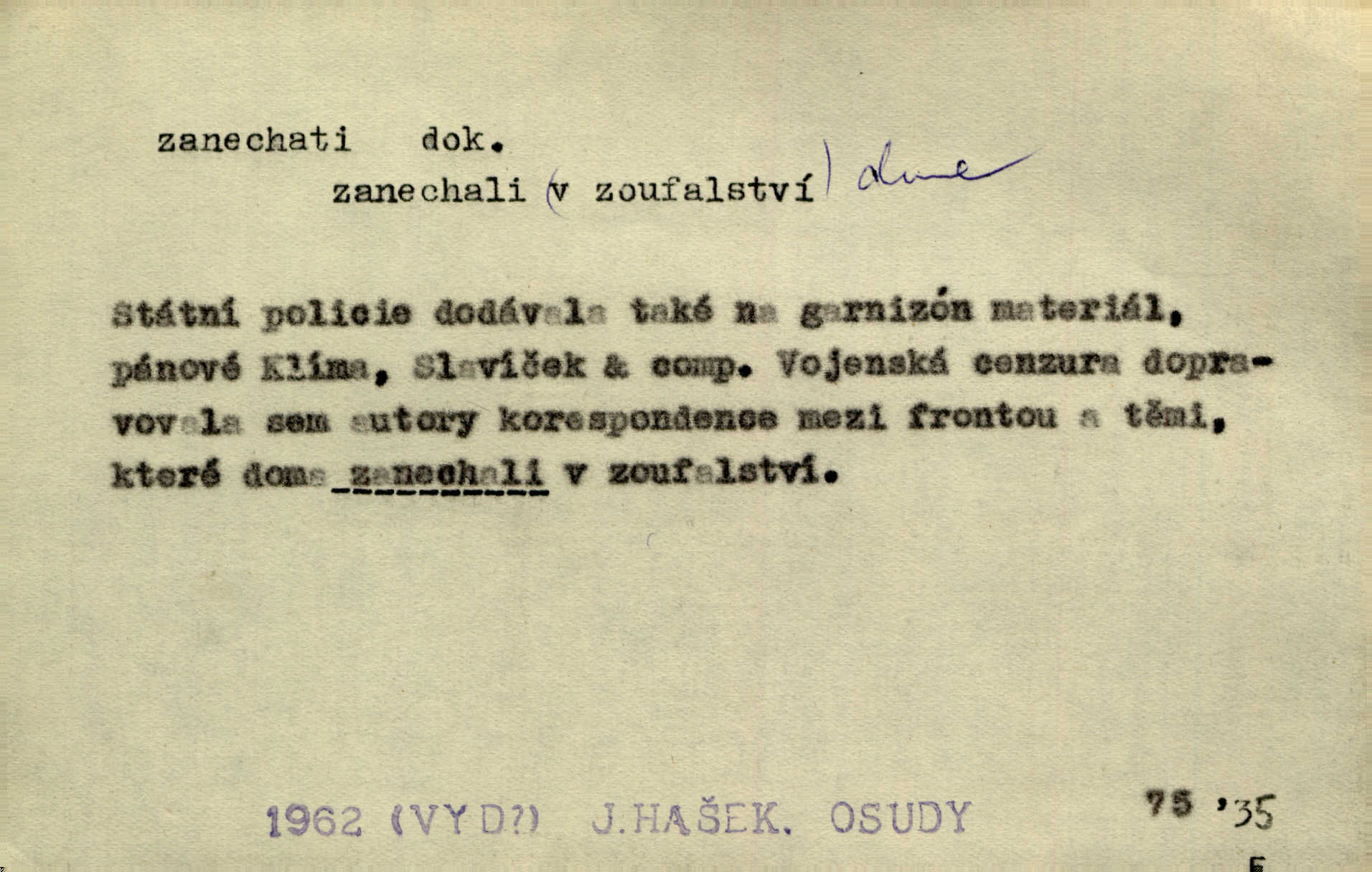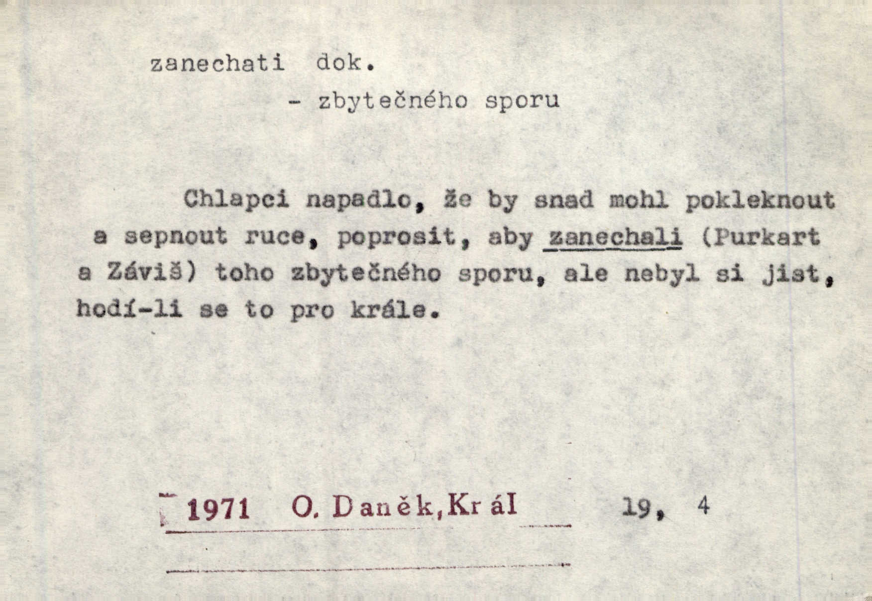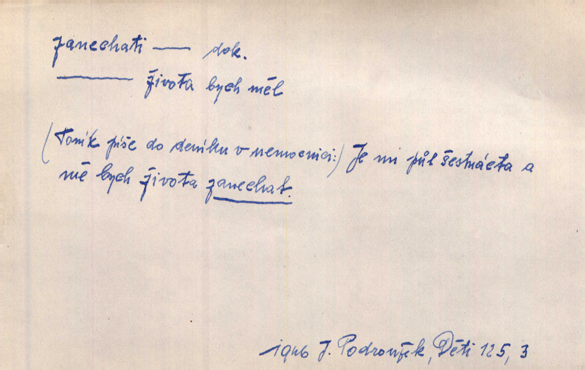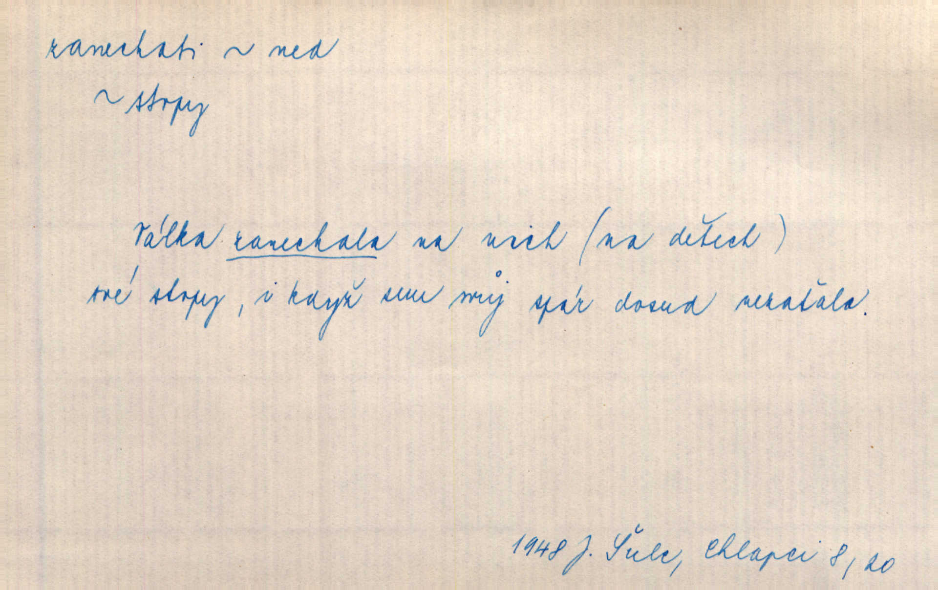 - zanechati dok. (imper. zanech) (co komu) nechati, ponechati, zůstaviti po sobě něco někomu. Dětem svým zanecháte dobré dědictví. Herb. Zanechá svým dětem slušné hospodářství. Vach. Choť zanechala mu k útěše tři krásné dcery. Čech. Vždyť jste zanechala nám své požehnání. Slád. [Hrabě] nezanechal žádné závěti. Jir. Teď své poklady zanechali nepřátelům. J. Heyd. Zanechal město v plen podvratným živlům. Švan. Pan rada zanechal Cimburovi vzkaz, že před polednem nevyjedou. Baar. Pohled Honzův dával tušiti lidem, jak veliké zásoby zloby zanechal v něm život. A. Mrš. Kdo prošel mým dětstvím, každý tam zanechal stopu. Mach. Vědomí, že zanechal člověk brázdu v cizí duši — to je nade všecko. Sez. Smrt mladšího syna zanechala v jejím srdci otevřenou ránu. Č. Jeř. [Těžký porod] zanechal následky. John. Dějiny křesťanství zanechaly těžký dojem v její duši. R. Svob. Hned na první pohled se přesvědčíme, že si ministerstvo nejdůležitější věci zanechalo za lubem utajilo. Havl. Zanechal sobě vrata zajistil se pro všechny případy. Čel. Kdykoliv něco před se vzal, zanechal si vždycky kozí vrátka. Šmil. D (koho, co) opustiti, ponechati, zůstaviti někoho samotného, bez ochrany, péče, pomoci, nepostarati se o něco. Do svaté země rytíř odejel, a věrnou ženu doma zanechal. Vrch. Ah, a zemřel beze mně, zanechal mě, můj Kyros! Zey. Sotvaže slyší, že muž měl jinou, s dítětem že ji zanechal, jde a skočí do vody. Rais. Jdu vás prosit, abyste ho zanechala, abyste za ním nechodila. R. Svob. Josef ještě nebyl na ouřadě a cikáni již byli mnoho hodin cesty od místa, kde ho zanechali. Prav. Ubíraje se do salonu, zanechal lichváře s Valentinem. Arb. Kněžna vás volá, kněžna rozkazuje zanechati stád a shromážditi se s kopími. Vanč. Zanechme řezníků a pojďme do trhu na rynk. Win. A tu mi tedy radíš, abych zanechav lidu věrného, o bezpečí hlavy své se postaral? Tyl. Lid náš vznícen dechem Páně zanechal svých příbytků. Čech. Víc nás tam na tiché lávce není, to už je dávno zanechaná půda. Svob. Jde ke své práci včera zanechané. Leg. Viďte, že jste slečny Betty zanechal? přerušil poměr. Šmil. Slovinec svého kroje buď zcela zanechal aneb jej cizím pokazil odložil. Něm. To byla vůle Boží, aby [duše] zanechaly tento svět zemřely. Havl. Nemyslete, že snad bych ji úplně zanechal bídě připustil, aby trpěla bídu. Svob. Sobě zanecháni v prostřed širých polí mrtví podřimují opuštěni. Leg. Nemysli, až budeš ve světě a sám sobě zanechán, že můžeš dělati, co chceš odkázán na sebe. Šmil. D (čeho, zř. co) upustiti, ustati od něčeho, přestati s něčím. Cítíš-li, že nejsi ve své kůži, zanech cvičení! O. Jand. Zanechal hry. Zey. Pavel chybil velice, že zanechal studií. Čech. Kondelík zanechá živnosti. Herrm. Doktor hodlal prakse zanechati. Šmil. Vzpomněl si na tuto příhodu ze svého houslaření, před lety již zanechaného. Čap. Ch. Myslili, že zapotřebí jest, aby zanechali předešlý život a přijali nové mravy. Prav. Zanech těch myšlenek! Mrš. Kdo lásky žádáš, zanech doufání. Quis. Kdys mně kamarádi domlouvali, abych zanechal mrzutosti a s nimi byl vesel. Něm. D (co komu) řidč. odevzdati, přenechati něco někomu. Nedělaly nic a zanechaly péči o živobytí docela svým rodičům. Něm. Ostatní zanechali osudu a vesele odtáhli se svou kořistí. Vanč. Ty hračky, Titiane, zanech mládí. Vrch. Duchovní zprávce zanechal rakev péči hrobníkově. Tyl. D zanechati si (co) poněk. zast. podržeti u sebe, pro sebe, ponechati si něco. Zanechal si jenom několik kousků polí. Herb. Ničeho si nezanechal, jen otcovu šavli při boku. Něm. Rodina prodala [panství], zanechavši sobě toliko jednu ves. Koll. Já k příhodnější zanechal si chvíli ti ukázat, že silnější jsem tebe. Vrch. Jsem vedle tebe žena ubohá, jež dadouc srdce, sama nemá nic, jen touhu zanechavši sobě bolestnou. Hál. O vyvinování celého děle zanecháme si úsudek, až novellu dokončí. Havl. Seschlá tváře zanechala na sobě lehký úsměv. Svob.