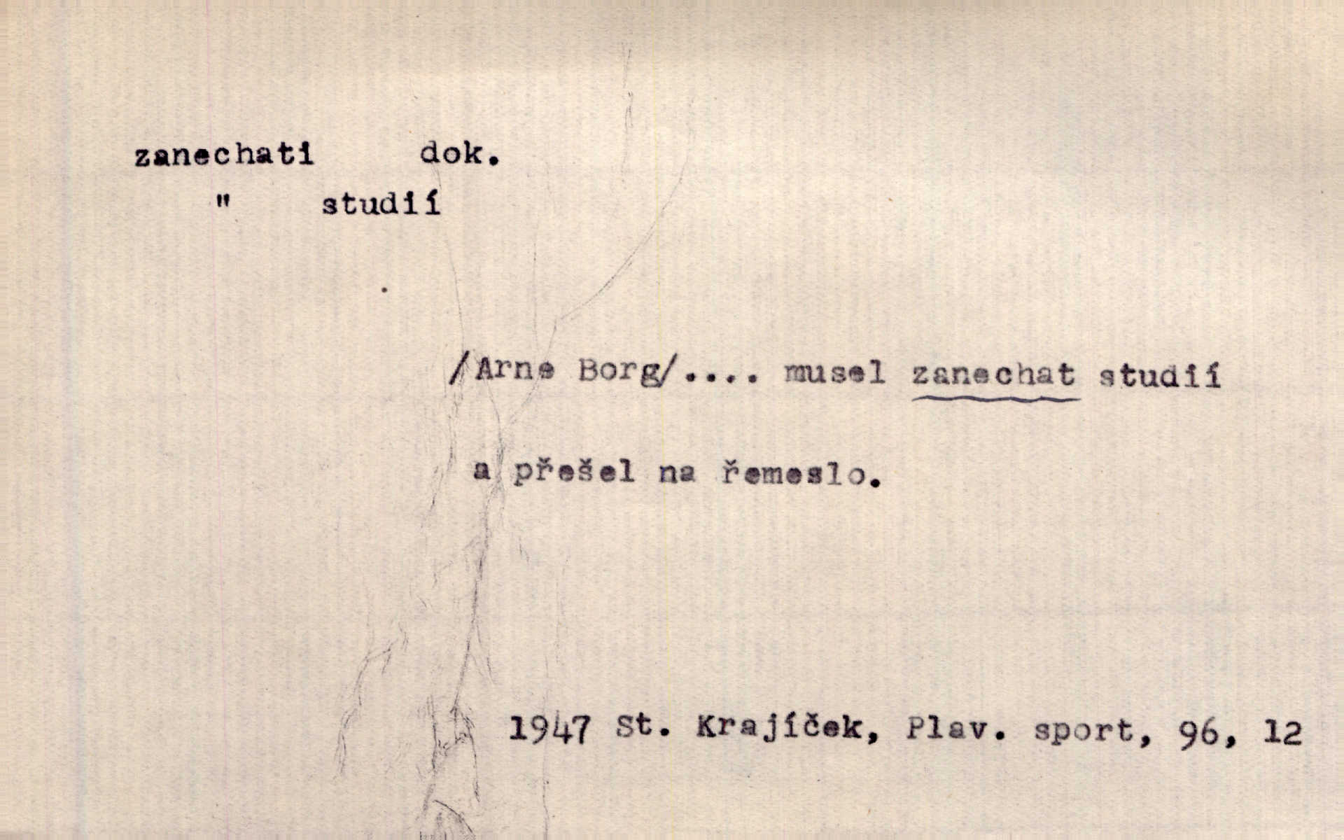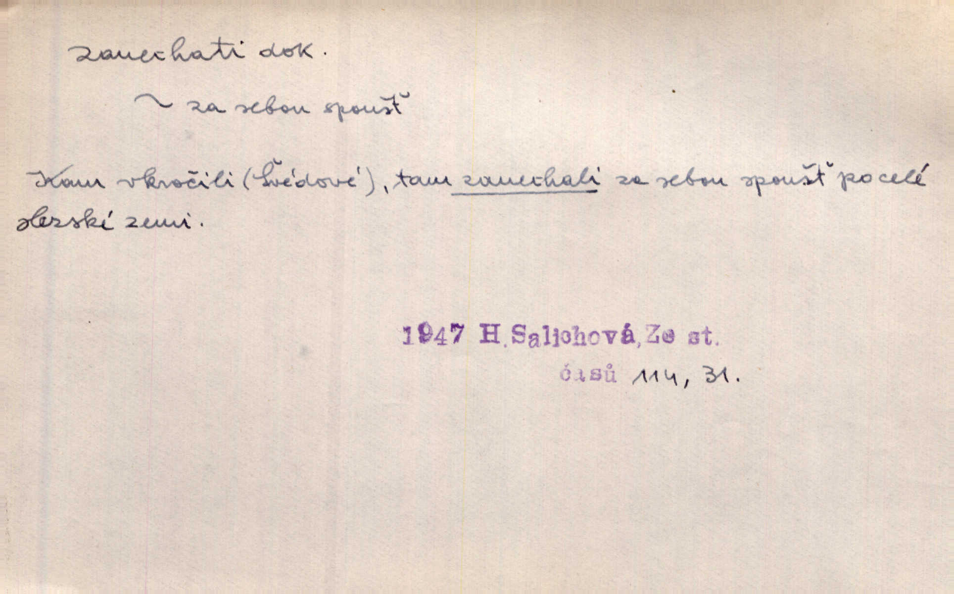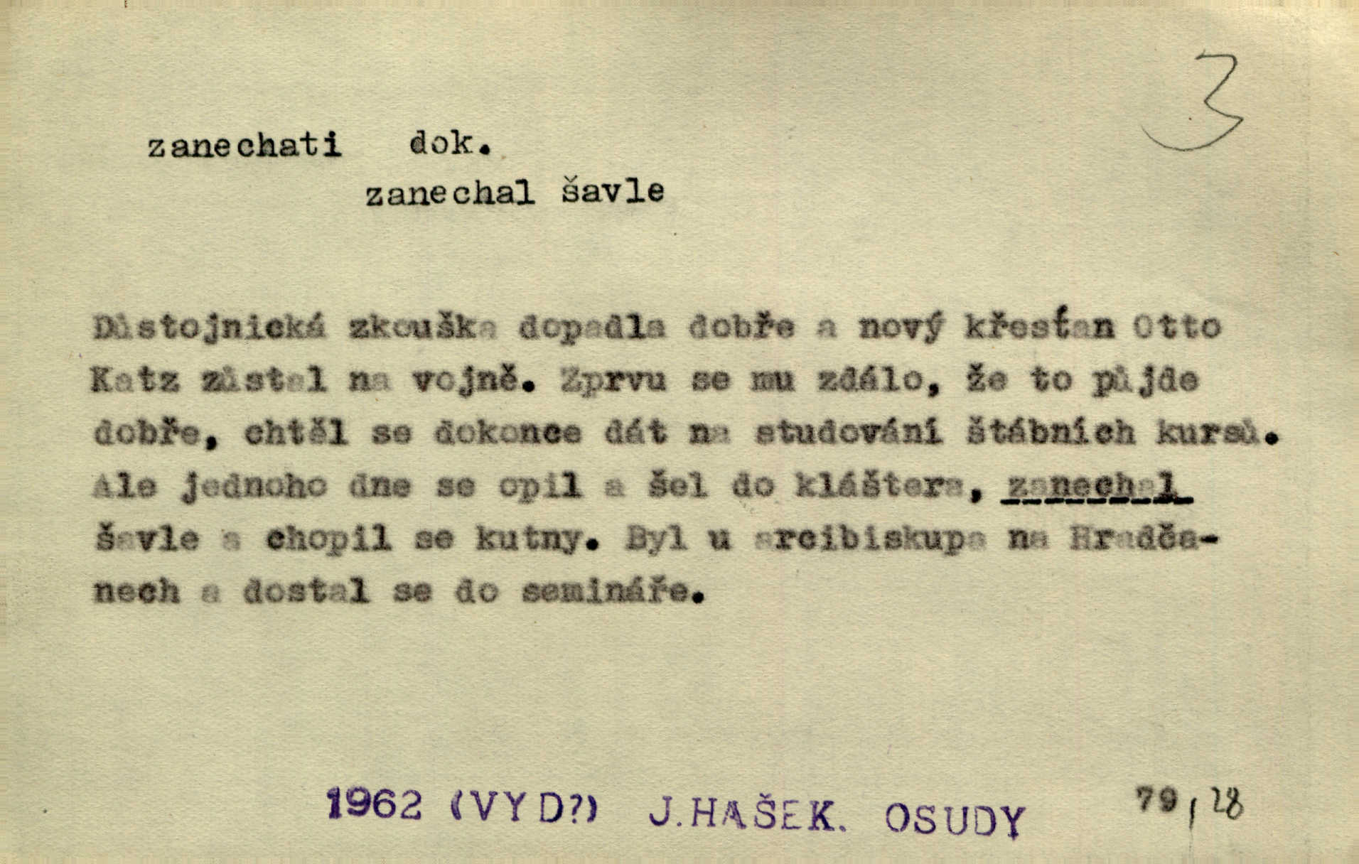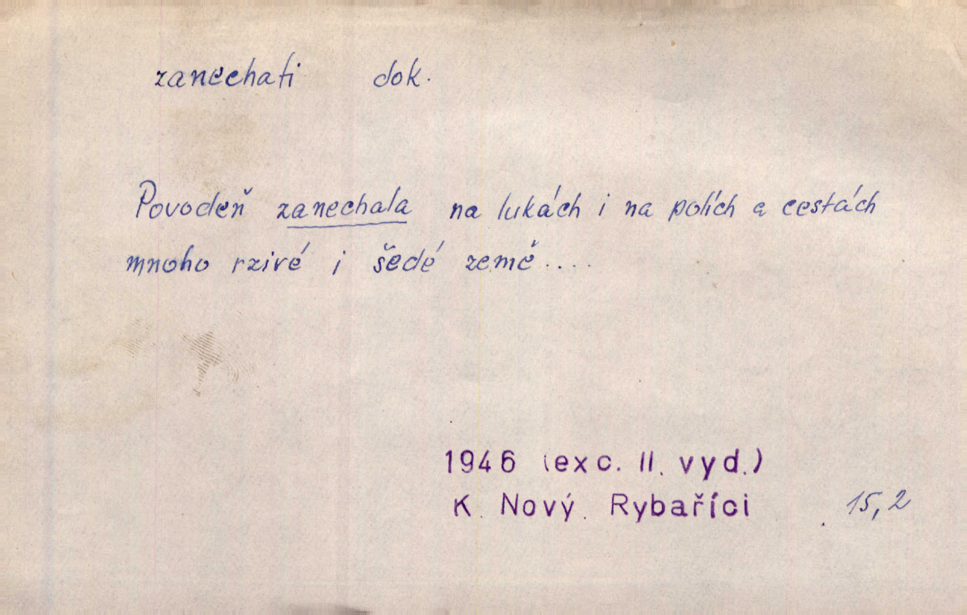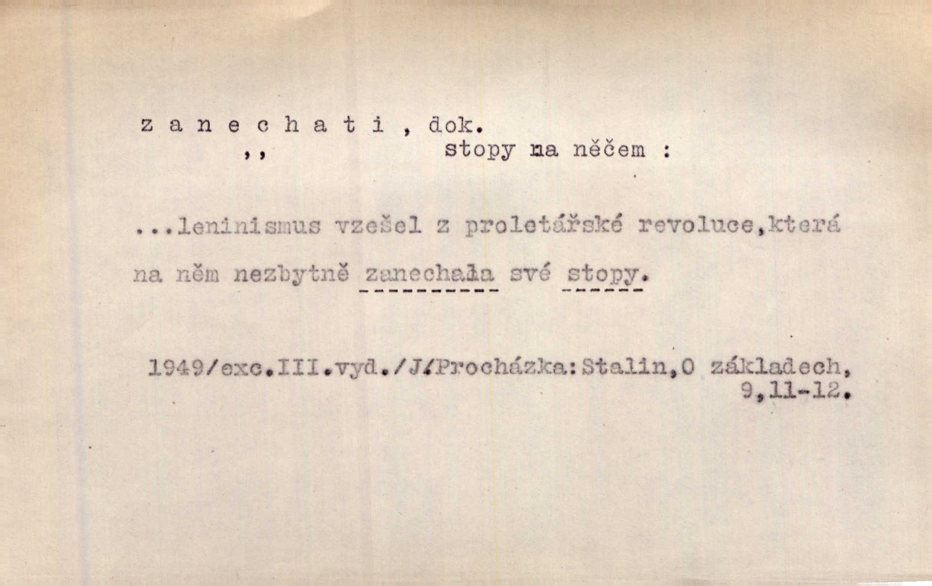 - zanechati dok. (imper. zanech) (co komu) nechati, ponechati, zůstaviti po sobě něco někomu. Dětem svým zanecháte dobré dědictví. Herb. Zanechá svým dětem slušné hospodářství. Vach. Choť zanechala mu k útěše tři krásné dcery. Čech. Vždyť jste zanechala nám své požehnání. Slád. [Hrabě] nezanechal žádné závěti. Jir. Teď své poklady zanechali nepřátelům. J. Heyd. Zanechal město v plen podvratným živlům. Švan. Pan rada zanechal Cimburovi vzkaz, že před polednem nevyjedou. Baar. Pohled Honzův dával tušiti lidem, jak veliké zásoby zloby zanechal v něm život. A. Mrš. Kdo prošel mým dětstvím, každý tam zanechal stopu. Mach. Vědomí, že zanechal člověk brázdu v cizí duši — to je nade všecko. Sez. Smrt mladšího syna zanechala v jejím srdci otevřenou ránu. Č. Jeř. [Těžký porod] zanechal následky. John. Dějiny křesťanství zanechaly těžký dojem v její duši. R. Svob. Hned na první pohled se přesvědčíme, že si ministerstvo nejdůležitější věci zanechalo za lubem utajilo. Havl. Zanechal sobě vrata zajistil se pro všechny případy. Čel. Kdykoliv něco před se vzal, zanechal si vždycky kozí vrátka. Šmil. D (koho, co) opustiti, ponechati, zůstaviti někoho samotného, bez ochrany, péče, pomoci, nepostarati se o něco. Do svaté země rytíř odejel, a věrnou ženu doma zanechal. Vrch. Ah, a zemřel beze mně, zanechal mě, můj Kyros! Zey. Sotvaže slyší, že muž měl jinou, s dítětem že ji zanechal, jde a skočí do vody. Rais. Jdu vás prosit, abyste ho zanechala, abyste za ním nechodila. R. Svob. Josef ještě nebyl na ouřadě a cikáni již byli mnoho hodin cesty od místa, kde ho zanechali. Prav. Ubíraje se do salonu, zanechal lichváře s Valentinem. Arb. Kněžna vás volá, kněžna rozkazuje zanechati stád a shromážditi se s kopími. Vanč. Zanechme řezníků a pojďme do trhu na rynk. Win. A tu mi tedy radíš, abych zanechav lidu věrného, o bezpečí hlavy své se postaral? Tyl. Lid náš vznícen dechem Páně zanechal svých příbytků. Čech. Víc nás tam na tiché lávce není, to už je dávno zanechaná půda. Svob. Jde ke své práci včera zanechané. Leg. Viďte, že jste slečny Betty zanechal? přerušil poměr. Šmil. Slovinec svého kroje buď zcela zanechal aneb jej cizím pokazil odložil. Něm. To byla vůle Boží, aby [duše] zanechaly tento svět zemřely. Havl. Nemyslete, že snad bych ji úplně zanechal bídě připustil, aby trpěla bídu. Svob. Sobě zanecháni v prostřed širých polí mrtví podřimují opuštěni. Leg. Nemysli, až budeš ve světě a sám sobě zanechán, že můžeš dělati, co chceš odkázán na sebe. Šmil. D (čeho, zř. co) upustiti, ustati od něčeho, přestati s něčím. Cítíš-li, že nejsi ve své kůži, zanech cvičení! O. Jand. Zanechal hry. Zey. Pavel chybil velice, že zanechal studií. Čech. Kondelík zanechá živnosti. Herrm. Doktor hodlal prakse zanechati. Šmil. Vzpomněl si na tuto příhodu ze svého houslaření, před lety již zanechaného. Čap. Ch. Myslili, že zapotřebí jest, aby zanechali předešlý život a přijali nové mravy. Prav. Zanech těch myšlenek! Mrš. Kdo lásky žádáš, zanech doufání. Quis. Kdys mně kamarádi domlouvali, abych zanechal mrzutosti a s nimi byl vesel. Něm. D (co komu) řidč. odevzdati, přenechati něco někomu. Nedělaly nic a zanechaly péči o živobytí docela svým rodičům. Něm. Ostatní zanechali osudu a vesele odtáhli se svou kořistí. Vanč. Ty hračky, Titiane, zanech mládí. Vrch. Duchovní zprávce zanechal rakev péči hrobníkově. Tyl. D zanechati si (co) poněk. zast. podržeti u sebe, pro sebe, ponechati si něco. Zanechal si jenom několik kousků polí. Herb. Ničeho si nezanechal, jen otcovu šavli při boku. Něm. Rodina prodala [panství], zanechavši sobě toliko jednu ves. Koll. Já k příhodnější zanechal si chvíli ti ukázat, že silnější jsem tebe. Vrch. Jsem vedle tebe žena ubohá, jež dadouc srdce, sama nemá nic, jen touhu zanechavši sobě bolestnou. Hál. O vyvinování celého děle zanecháme si úsudek, až novellu dokončí. Havl. Seschlá tváře zanechala na sobě lehký úsměv. Svob.