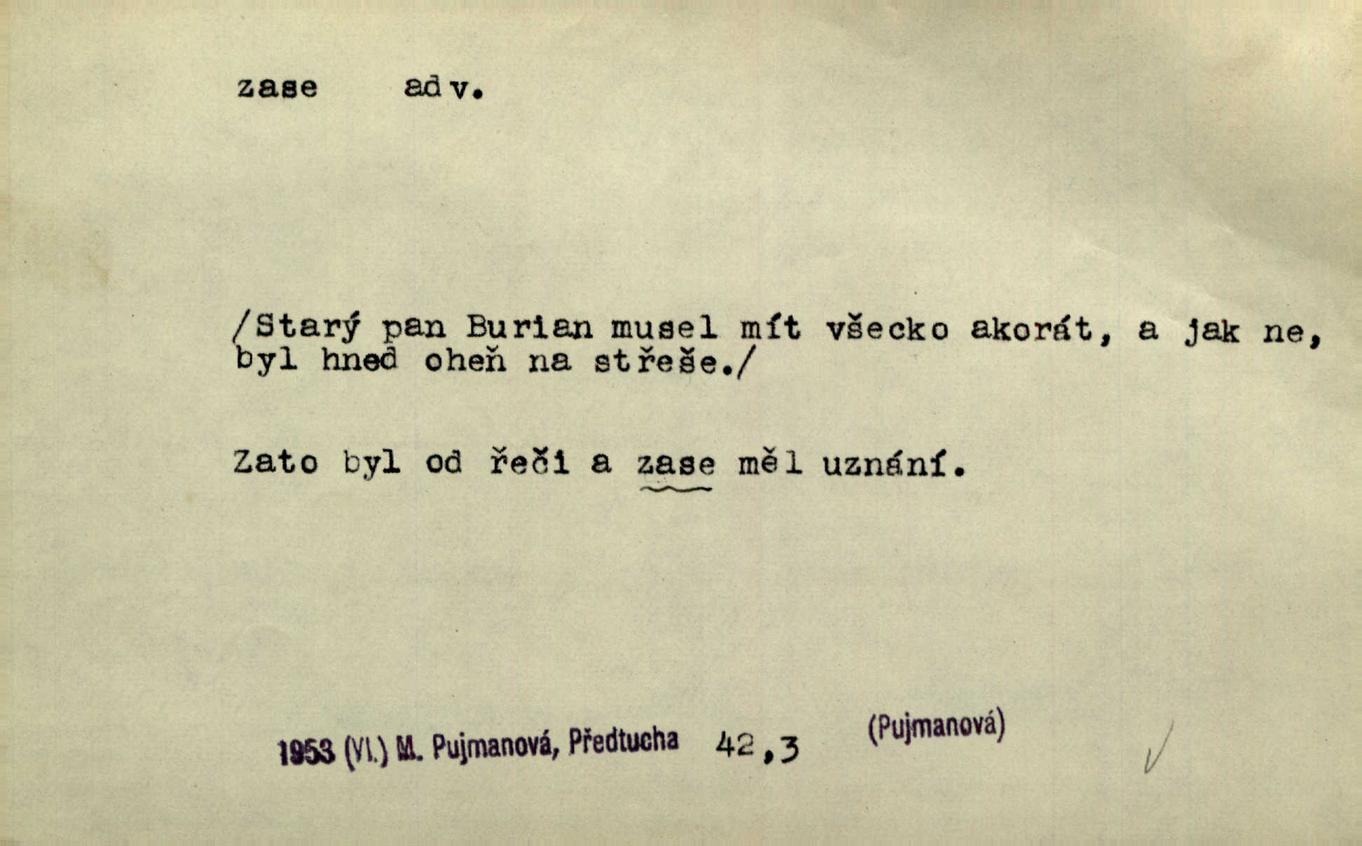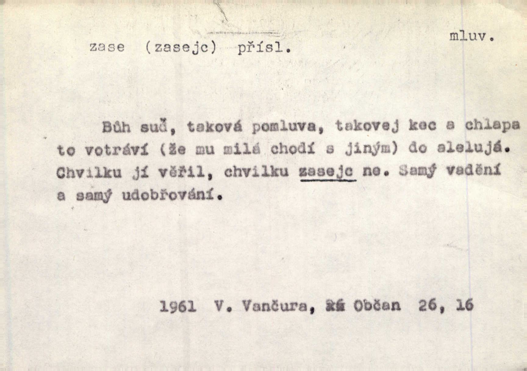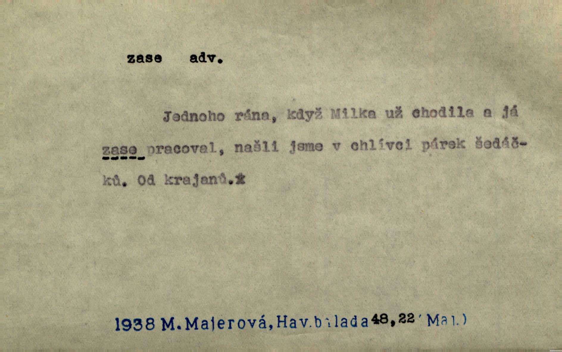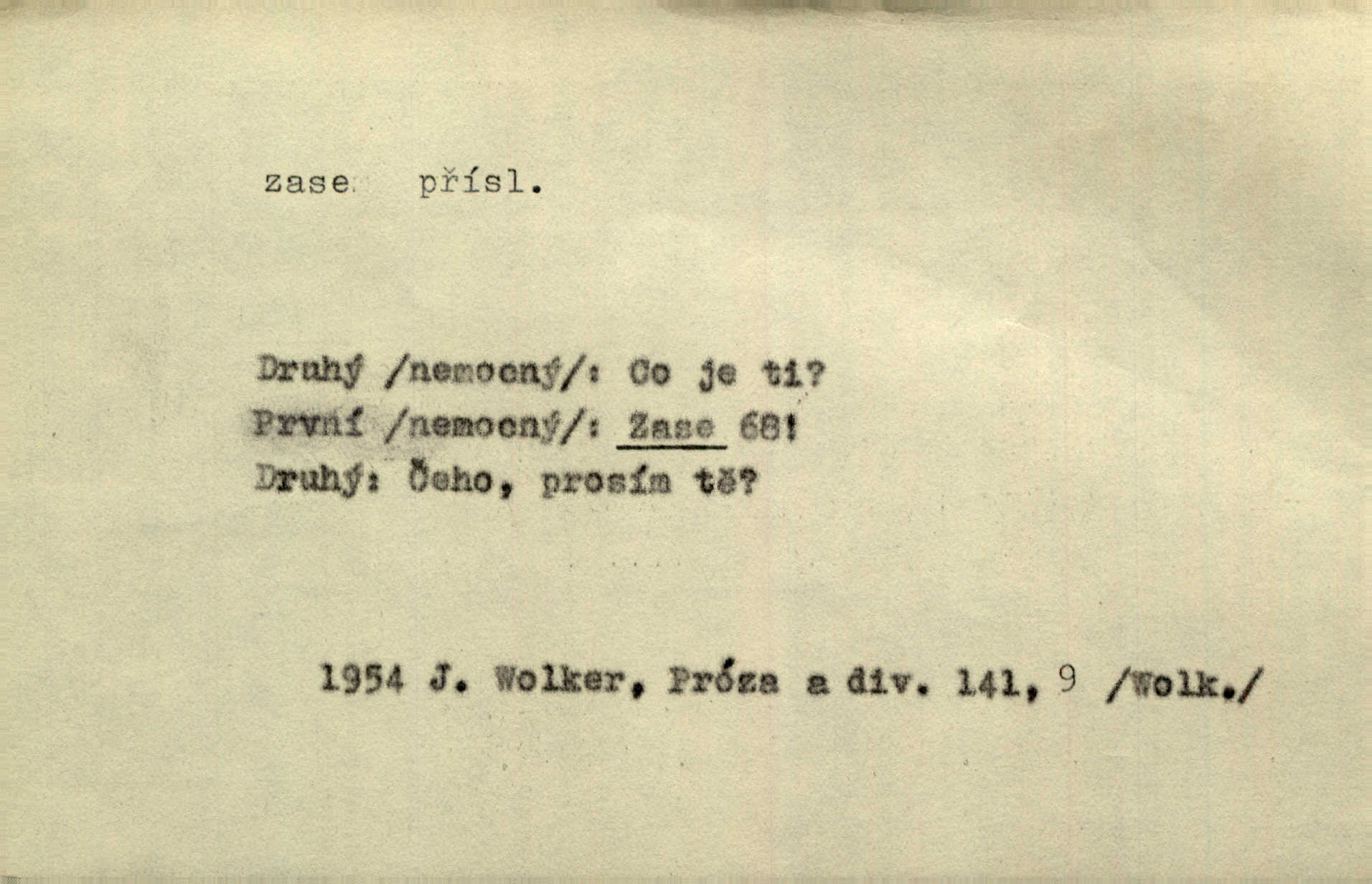 - zase, zas (dial. zasej, zasejc) adv. opět, znova, ještě jednou, po druhé. Až zase přijdete, uděláme to zase tak. Šmil. Když odešla, Liduška si zase k oknu sedla. Erb. Od Karlova Týna jsem po letech zase šel. Čech. Konečně péra se zase chopiv, začínám o lásce. Tyl. Má naděje zase stoupla. Vach. Po chvíli bylo ticho — zase zahučely varhany — opět utichly. Rais. Skřek zazněl, ještě hroznější a zase skřek a zase, zas a zas. Zey. Právě jsem se dověděl, že příčinou domácích nesvárů jsem já a zase jenom já opětovaně. V. Mrš. D vyjadřuje připojování s částečným odporováním; pak, dále, však. [Pes] štěkal hned prudce, divě, zas vesele ňafal. Rais. Hned bouří rozmarem, zas dá se v pění. Vrch. Zas se tiší, zase doufá dívka v šatě zeleném. Čel. Jsme snad tvoji psi, že brzy hladíš nás a kopeš zas? Zey. Říčka vinula se tu vrb, olší tlupou šerou, lučinou tam kyprou zase. Čech. Vinula [list] kolem rákosu, jejž v rákos větší zase vtěsnala. Zey. Vesele se Zemí Měsíc jde, Země zas v mocném kruhu se okolo Slunce otáčí. Ner. Všude vidět bylo smrčí, tam křížek malý, tam hvězda tmavá — tam zas celý věnec zelený kol obrazu Anděla Strážce. V. Mrš. D vyjadřuje změnu, vystřídávání n. vzájemnost. Celé hodiny se dívala z okna na hladinu, která se stále měnila, fialová, zelená, zase růžová hrála na slunci. Til. Již zněla zase píseň jeho jako ukolébavka, tak měkce a sladce. Herb. A žili v štěstí největšim, až jedna [z hvězd] zase zmřela. Hál. Pak přišel zas nějaký starý myslivec; ale tomu se lépe nevedlo. Erb. Tenkráte jste zajisté poprosila některou sousedku, aby se k Vám ob čas podívala, a udělala jste jí za tuto službu zas něco k vůli. Svět. Oko chce [krásu] pohltit, ona pohltí zas oko celé. Rub. Ucti čas a on tě uctí zas. Přísl. D vyjadřuje nesouhlas, odpor; naproti tomu, naopak. Do Kobylího svolán byl lid ze všech blízkých dědin. Jiní zase svoláni byli do Pavlovic. Herb. Když Heine pyšnil se tím výronem německého středověkého ducha, tu měl si vzpomenouti, že ty kathedrály jsou zase výkvětem francouzského ducha. Zey. Hrabě, přimlouvaje se za spolek s Francií, své důvody nám vyloží; vy zase, jsa přítelem Pruska, odpovíte svými. Bozd. Stísněn obavami do budoucna, ale zase naplněn rozpínavou mladickou silou, zaklepal jsem na dvéře. Šim. Juro tvrdil, že jednobarevní koně se hodí více k dílu, a Rakolubský to zas o bělostrakatých jistil. Jir. Tu závist vzbudil nesměrnou, tam soucitu zas něhu. Vrch. Kdybych byl měl pochyby [o jeho učitelství]‚ tento hovor by je byl potlačil. Jen ta reálka zase mě mýlila. Šim. Malý kout na zadní straně chrámu má svůj svět, svět stejně malý jako velký zas. Svob. A mně se zdá, že k nim [rakvím] jen jeden skok a zase k nim přec celý život jest s jiného hlediska. Svob. D vyjadřuje děj protikladný. Až se zase domů vrátím, půjdu z Frydku do Těšína. Bezr. Snad ti dá Hospodin z tej dýdy zasej vyváznout. Nov. Voda zasejc klesne a náš mlejn to vydrží. Hampl. D zdůrazňuje vyjádření; vždyť, přece, věru. Kdyby nám nechali čas rozmyslet si to, tak by se byli přihlásili všichni, to já je zase znám. K. Čap. A to jste zas pěkná hospodyně, když se po ničem neptáte. Rais. Kde je abbé? Chtěli k zdaru připít mu, kde vězí zase? Vrch. A zasejc na mramor patří taky vercajk. Klost. Milostpaní to zas ušetří na šatech. Šim. Ob. Jestli myslíš, že mám nějaký peníze, tak to zas ne. Lang. Já jsem chudá, ale na čest držím, to zas jo. K. Čap. Já si platím koncesi a on by chtěl poslouchat zadarmo? A to zas prr! Týd. rozhl. D Zast. a lid. zpět, nazpět. Z těch, kteří zase přišli, byl nejeden zmrzačen. Jir. S lože vyskočila v mladé kráse — stará bručíc vylezla tam zase. Čech. Co někdy z úst vrabcem vyletí, zase toho nevtáhneš čtyřmi koňmi. Čel. Privilegia nejsou z Hrádku hned vydána zase. Win. Počkej jenom ještě trochu, hned se vrátí zas maminka. Erb. Ale Bože, co my vám zase dáme na oplátku. Něm.