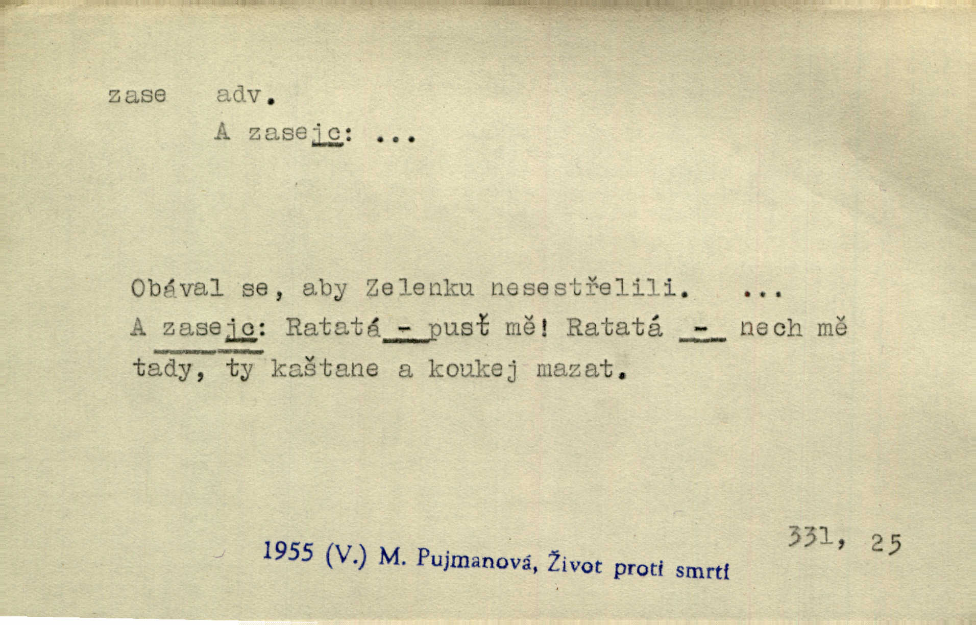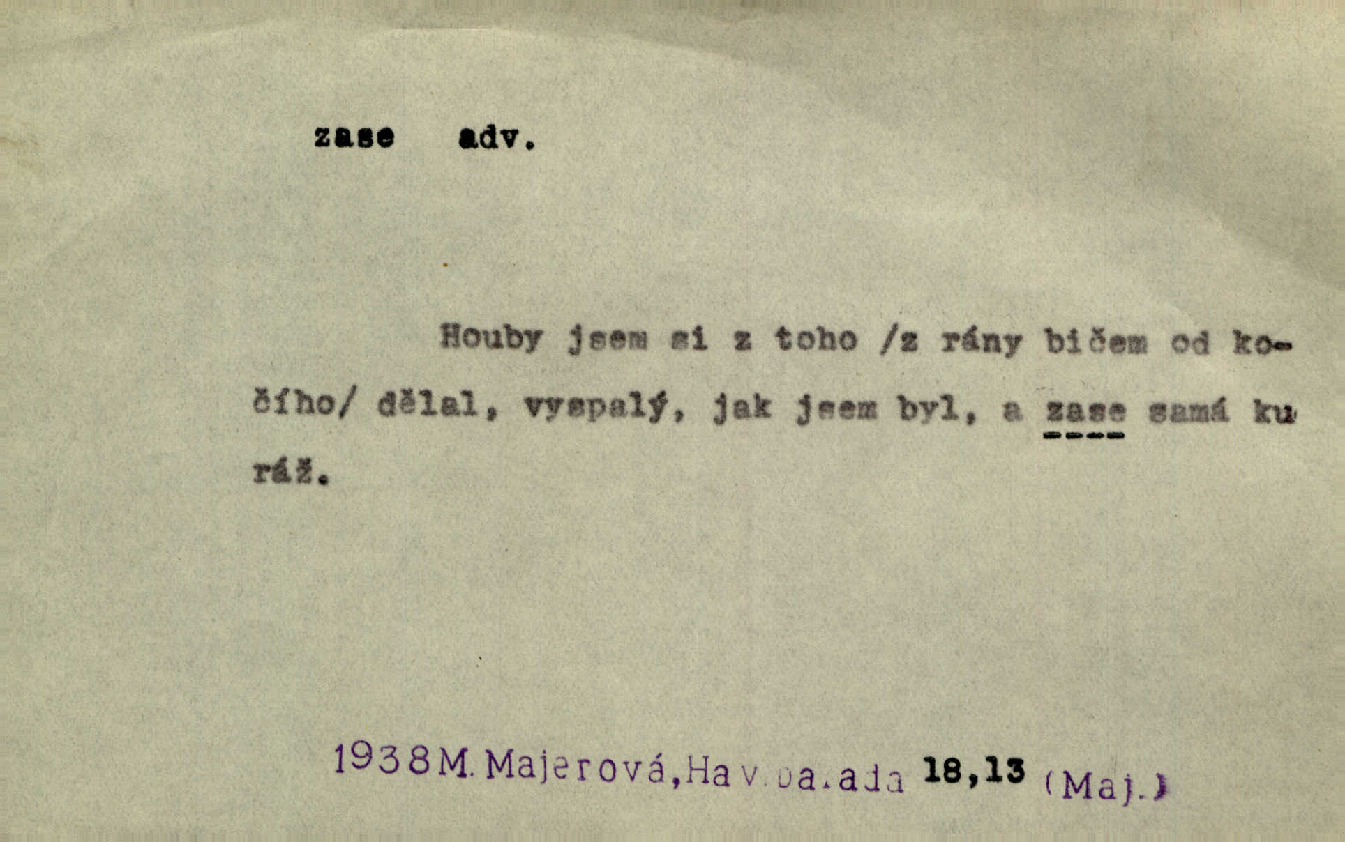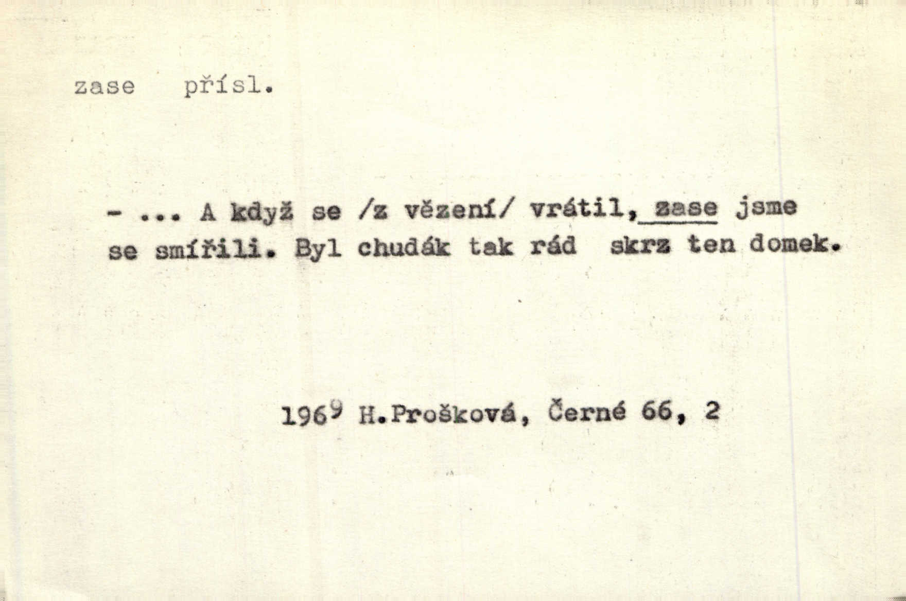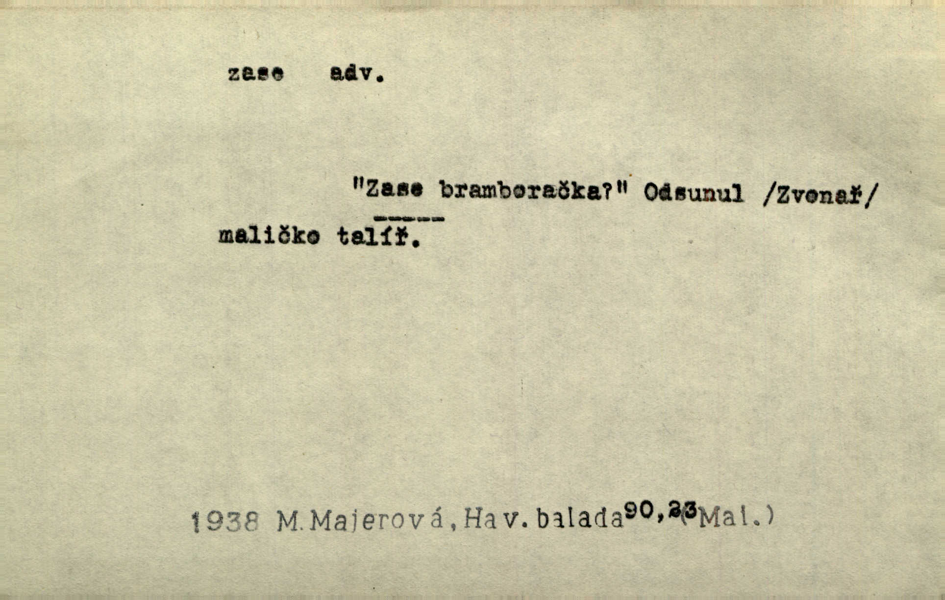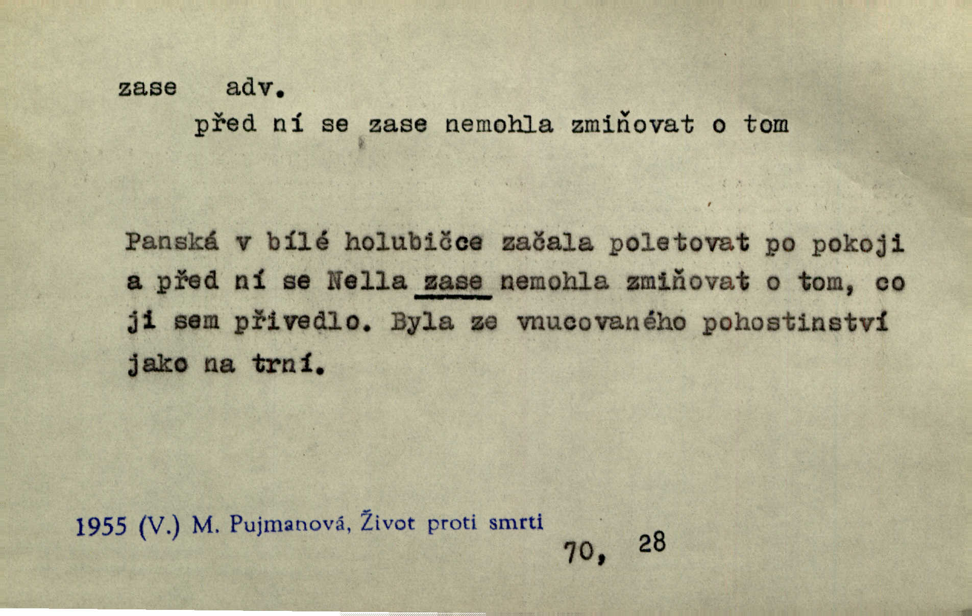- zase, zas (dial. zasej, zasejc) adv. opět, znova, ještě jednou, po druhé. Až zase přijdete, uděláme to zase tak. Šmil. Když odešla, Liduška si zase k oknu sedla. Erb. Od Karlova Týna jsem po letech zase šel. Čech. Konečně péra se zase chopiv, začínám o lásce. Tyl. Má naděje zase stoupla. Vach. Po chvíli bylo ticho — zase zahučely varhany — opět utichly. Rais. Skřek zazněl, ještě hroznější a zase skřek a zase, zas a zas. Zey. Právě jsem se dověděl, že příčinou domácích nesvárů jsem já a zase jenom já opětovaně. V. Mrš. D vyjadřuje připojování s částečným odporováním; pak, dále, však. [Pes] štěkal hned prudce, divě, zas vesele ňafal. Rais. Hned bouří rozmarem, zas dá se v pění. Vrch. Zas se tiší, zase doufá dívka v šatě zeleném. Čel. Jsme snad tvoji psi, že brzy hladíš nás a kopeš zas? Zey. Říčka vinula se tu vrb, olší tlupou šerou, lučinou tam kyprou zase. Čech. Vinula [list] kolem rákosu, jejž v rákos větší zase vtěsnala. Zey. Vesele se Zemí Měsíc jde, Země zas v mocném kruhu se okolo Slunce otáčí. Ner. Všude vidět bylo smrčí, tam křížek malý, tam hvězda tmavá — tam zas celý věnec zelený kol obrazu Anděla Strážce. V. Mrš. D vyjadřuje změnu, vystřídávání n. vzájemnost. Celé hodiny se dívala z okna na hladinu, která se stále měnila, fialová, zelená, zase růžová hrála na slunci. Til. Již zněla zase píseň jeho jako ukolébavka, tak měkce a sladce. Herb. A žili v štěstí největšim, až jedna [z hvězd] zase zmřela. Hál. Pak přišel zas nějaký starý myslivec; ale tomu se lépe nevedlo. Erb. Tenkráte jste zajisté poprosila některou sousedku, aby se k Vám ob čas podívala, a udělala jste jí za tuto službu zas něco k vůli. Svět. Oko chce [krásu] pohltit, ona pohltí zas oko celé. Rub. Ucti čas a on tě uctí zas. Přísl. D vyjadřuje nesouhlas, odpor; naproti tomu, naopak. Do Kobylího svolán byl lid ze všech blízkých dědin. Jiní zase svoláni byli do Pavlovic. Herb. Když Heine pyšnil se tím výronem německého středověkého ducha, tu měl si vzpomenouti, že ty kathedrály jsou zase výkvětem francouzského ducha. Zey. Hrabě, přimlouvaje se za spolek s Francií, své důvody nám vyloží; vy zase, jsa přítelem Pruska, odpovíte svými. Bozd. Stísněn obavami do budoucna, ale zase naplněn rozpínavou mladickou silou, zaklepal jsem na dvéře. Šim. Juro tvrdil, že jednobarevní koně se hodí více k dílu, a Rakolubský to zas o bělostrakatých jistil. Jir. Tu závist vzbudil nesměrnou, tam soucitu zas něhu. Vrch. Kdybych byl měl pochyby [o jeho učitelství]‚ tento hovor by je byl potlačil. Jen ta reálka zase mě mýlila. Šim. Malý kout na zadní straně chrámu má svůj svět, svět stejně malý jako velký zas. Svob. A mně se zdá, že k nim [rakvím] jen jeden skok a zase k nim přec celý život jest s jiného hlediska. Svob. D vyjadřuje děj protikladný. Až se zase domů vrátím, půjdu z Frydku do Těšína. Bezr. Snad ti dá Hospodin z tej dýdy zasej vyváznout. Nov. Voda zasejc klesne a náš mlejn to vydrží. Hampl. D zdůrazňuje vyjádření; vždyť, přece, věru. Kdyby nám nechali čas rozmyslet si to, tak by se byli přihlásili všichni, to já je zase znám. K. Čap. A to jste zas pěkná hospodyně, když se po ničem neptáte. Rais. Kde je abbé? Chtěli k zdaru připít mu, kde vězí zase? Vrch. A zasejc na mramor patří taky vercajk. Klost. Milostpaní to zas ušetří na šatech. Šim. Ob. Jestli myslíš, že mám nějaký peníze, tak to zas ne. Lang. Já jsem chudá, ale na čest držím, to zas jo. K. Čap. Já si platím koncesi a on by chtěl poslouchat zadarmo? A to zas prr! Týd. rozhl. D Zast. a lid. zpět, nazpět. Z těch, kteří zase přišli, byl nejeden zmrzačen. Jir. S lože vyskočila v mladé kráse — stará bručíc vylezla tam zase. Čech. Co někdy z úst vrabcem vyletí, zase toho nevtáhneš čtyřmi koňmi. Čel. Privilegia nejsou z Hrádku hned vydána zase. Win. Počkej jenom ještě trochu, hned se vrátí zas maminka. Erb. Ale Bože, co my vám zase dáme na oplátku. Něm.