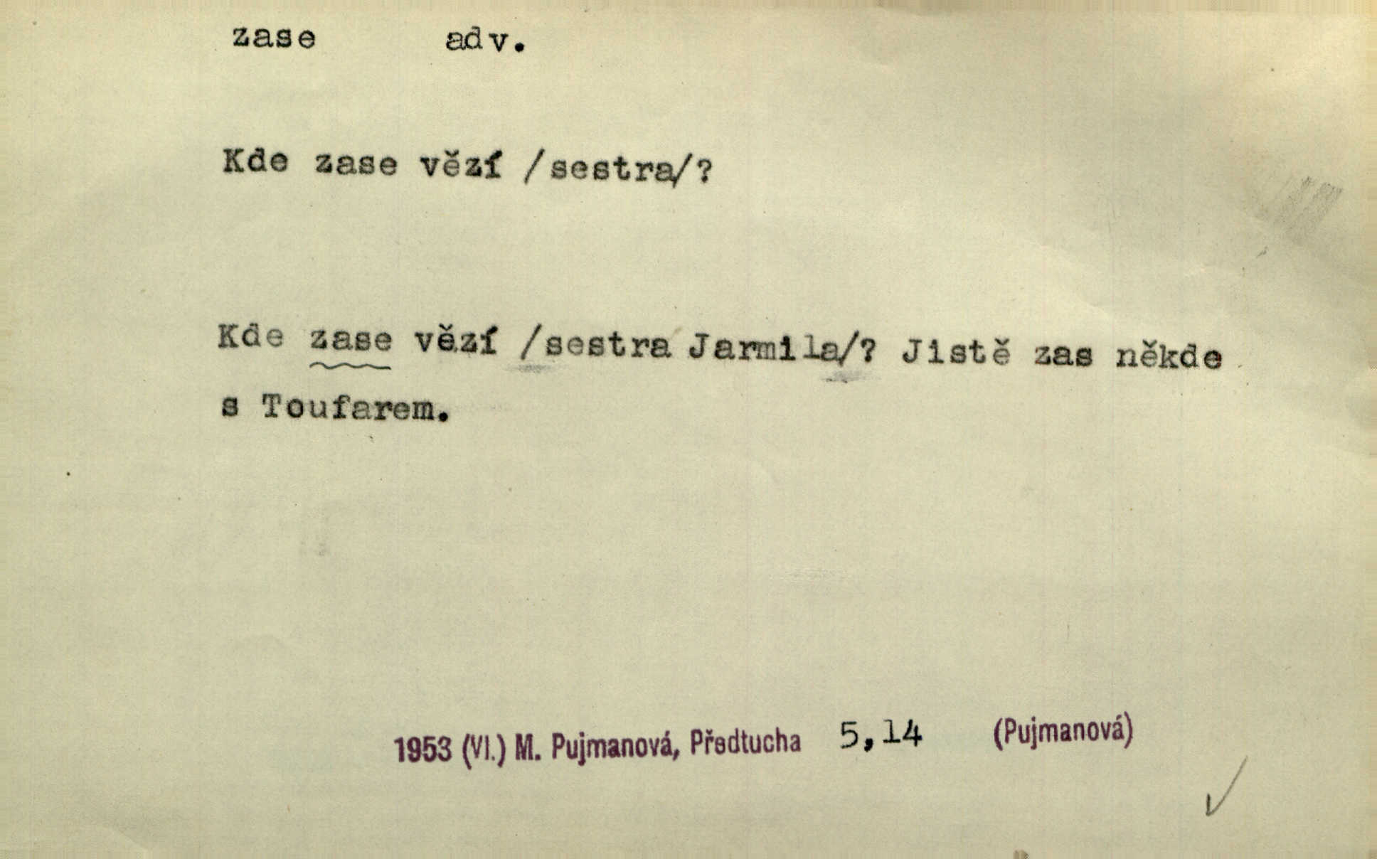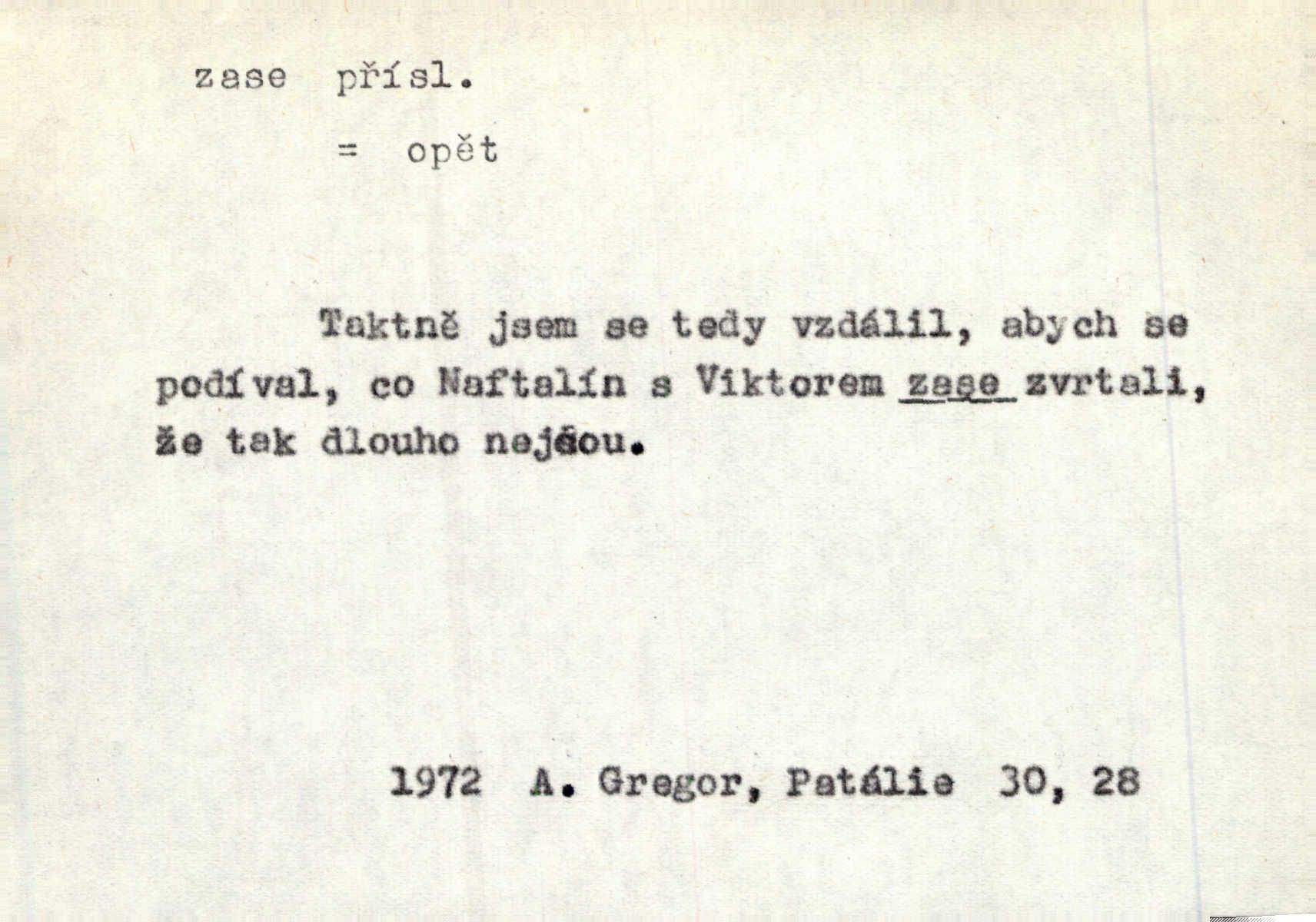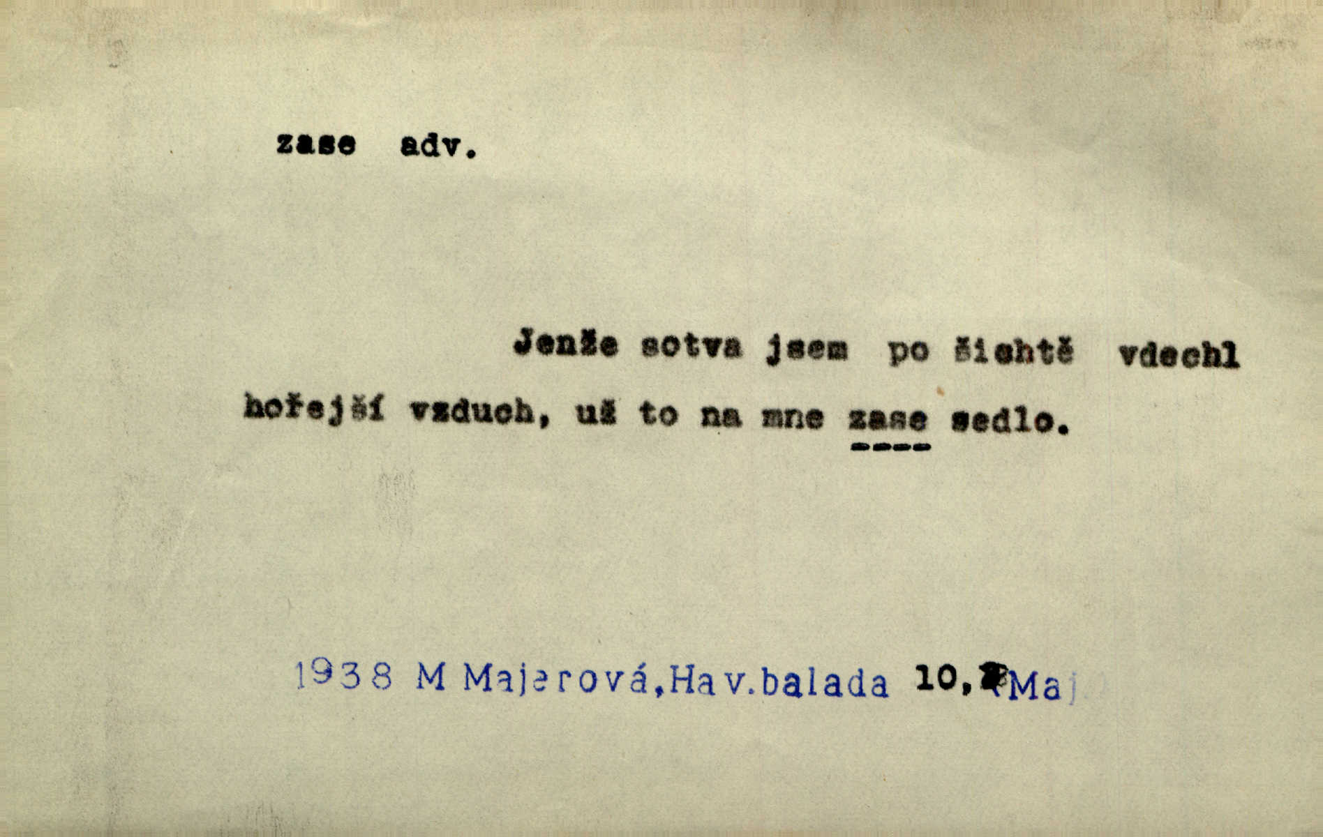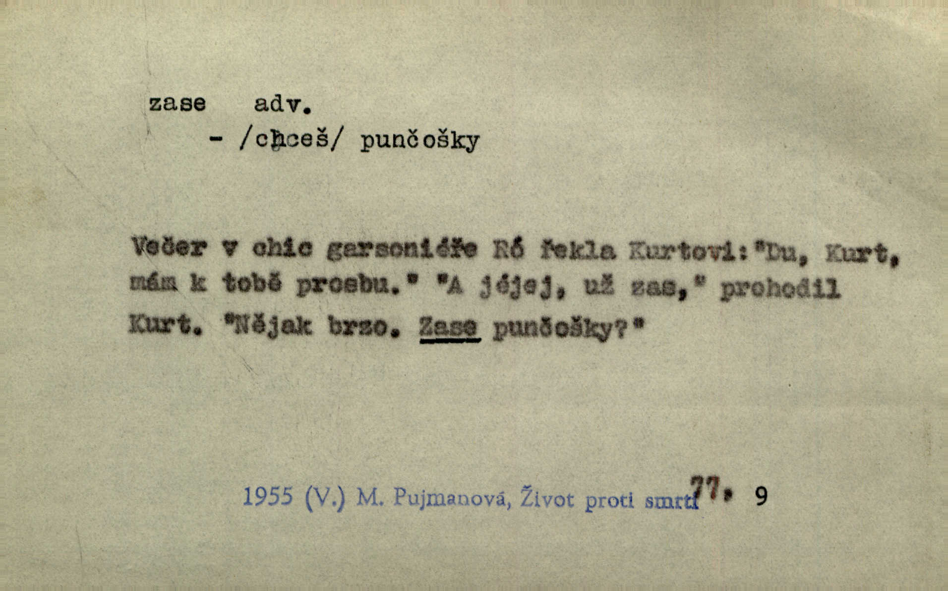 - zase, zas (dial. zasej, zasejc) adv. opět, znova, ještě jednou, po druhé. Až zase přijdete, uděláme to zase tak. Šmil. Když odešla, Liduška si zase k oknu sedla. Erb. Od Karlova Týna jsem po letech zase šel. Čech. Konečně péra se zase chopiv, začínám o lásce. Tyl. Má naděje zase stoupla. Vach. Po chvíli bylo ticho — zase zahučely varhany — opět utichly. Rais. Skřek zazněl, ještě hroznější a zase skřek a zase, zas a zas. Zey. Právě jsem se dověděl, že příčinou domácích nesvárů jsem já a zase jenom já opětovaně. V. Mrš. D vyjadřuje připojování s částečným odporováním; pak, dále, však. [Pes] štěkal hned prudce, divě, zas vesele ňafal. Rais. Hned bouří rozmarem, zas dá se v pění. Vrch. Zas se tiší, zase doufá dívka v šatě zeleném. Čel. Jsme snad tvoji psi, že brzy hladíš nás a kopeš zas? Zey. Říčka vinula se tu vrb, olší tlupou šerou, lučinou tam kyprou zase. Čech. Vinula [list] kolem rákosu, jejž v rákos větší zase vtěsnala. Zey. Vesele se Zemí Měsíc jde, Země zas v mocném kruhu se okolo Slunce otáčí. Ner. Všude vidět bylo smrčí, tam křížek malý, tam hvězda tmavá — tam zas celý věnec zelený kol obrazu Anděla Strážce. V. Mrš. D vyjadřuje změnu, vystřídávání n. vzájemnost. Celé hodiny se dívala z okna na hladinu, která se stále měnila, fialová, zelená, zase růžová hrála na slunci. Til. Již zněla zase píseň jeho jako ukolébavka, tak měkce a sladce. Herb. A žili v štěstí největšim, až jedna [z hvězd] zase zmřela. Hál. Pak přišel zas nějaký starý myslivec; ale tomu se lépe nevedlo. Erb. Tenkráte jste zajisté poprosila některou sousedku, aby se k Vám ob čas podívala, a udělala jste jí za tuto službu zas něco k vůli. Svět. Oko chce [krásu] pohltit, ona pohltí zas oko celé. Rub. Ucti čas a on tě uctí zas. Přísl. D vyjadřuje nesouhlas, odpor; naproti tomu, naopak. Do Kobylího svolán byl lid ze všech blízkých dědin. Jiní zase svoláni byli do Pavlovic. Herb. Když Heine pyšnil se tím výronem německého středověkého ducha, tu měl si vzpomenouti, že ty kathedrály jsou zase výkvětem francouzského ducha. Zey. Hrabě, přimlouvaje se za spolek s Francií, své důvody nám vyloží; vy zase, jsa přítelem Pruska, odpovíte svými. Bozd. Stísněn obavami do budoucna, ale zase naplněn rozpínavou mladickou silou, zaklepal jsem na dvéře. Šim. Juro tvrdil, že jednobarevní koně se hodí více k dílu, a Rakolubský to zas o bělostrakatých jistil. Jir. Tu závist vzbudil nesměrnou, tam soucitu zas něhu. Vrch. Kdybych byl měl pochyby [o jeho učitelství]‚ tento hovor by je byl potlačil. Jen ta reálka zase mě mýlila. Šim. Malý kout na zadní straně chrámu má svůj svět, svět stejně malý jako velký zas. Svob. A mně se zdá, že k nim [rakvím] jen jeden skok a zase k nim přec celý život jest s jiného hlediska. Svob. D vyjadřuje děj protikladný. Až se zase domů vrátím, půjdu z Frydku do Těšína. Bezr. Snad ti dá Hospodin z tej dýdy zasej vyváznout. Nov. Voda zasejc klesne a náš mlejn to vydrží. Hampl. D zdůrazňuje vyjádření; vždyť, přece, věru. Kdyby nám nechali čas rozmyslet si to, tak by se byli přihlásili všichni, to já je zase znám. K. Čap. A to jste zas pěkná hospodyně, když se po ničem neptáte. Rais. Kde je abbé? Chtěli k zdaru připít mu, kde vězí zase? Vrch. A zasejc na mramor patří taky vercajk. Klost. Milostpaní to zas ušetří na šatech. Šim. Ob. Jestli myslíš, že mám nějaký peníze, tak to zas ne. Lang. Já jsem chudá, ale na čest držím, to zas jo. K. Čap. Já si platím koncesi a on by chtěl poslouchat zadarmo? A to zas prr! Týd. rozhl. D Zast. a lid. zpět, nazpět. Z těch, kteří zase přišli, byl nejeden zmrzačen. Jir. S lože vyskočila v mladé kráse — stará bručíc vylezla tam zase. Čech. Co někdy z úst vrabcem vyletí, zase toho nevtáhneš čtyřmi koňmi. Čel. Privilegia nejsou z Hrádku hned vydána zase. Win. Počkej jenom ještě trochu, hned se vrátí zas maminka. Erb. Ale Bože, co my vám zase dáme na oplátku. Něm.
