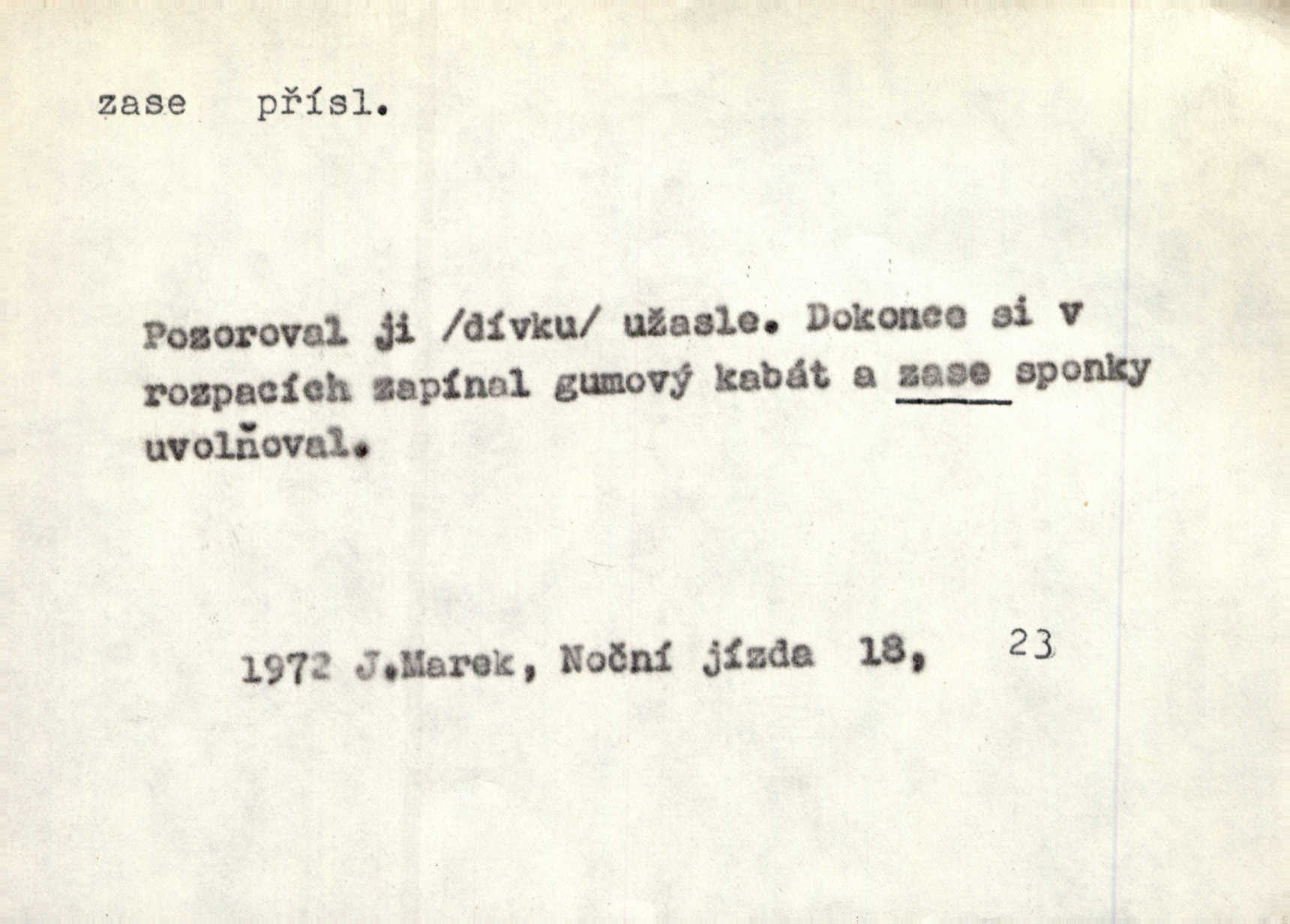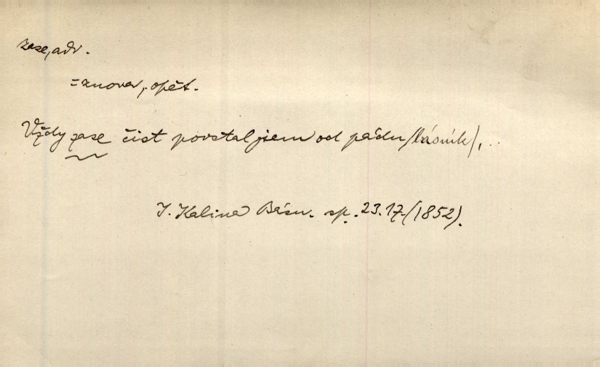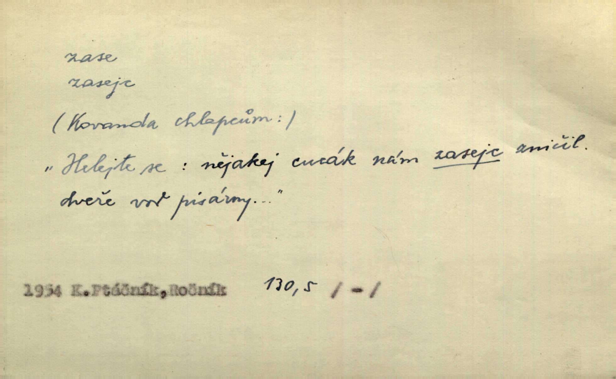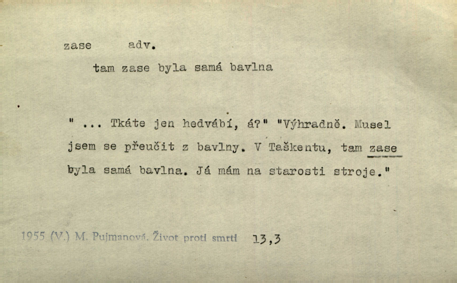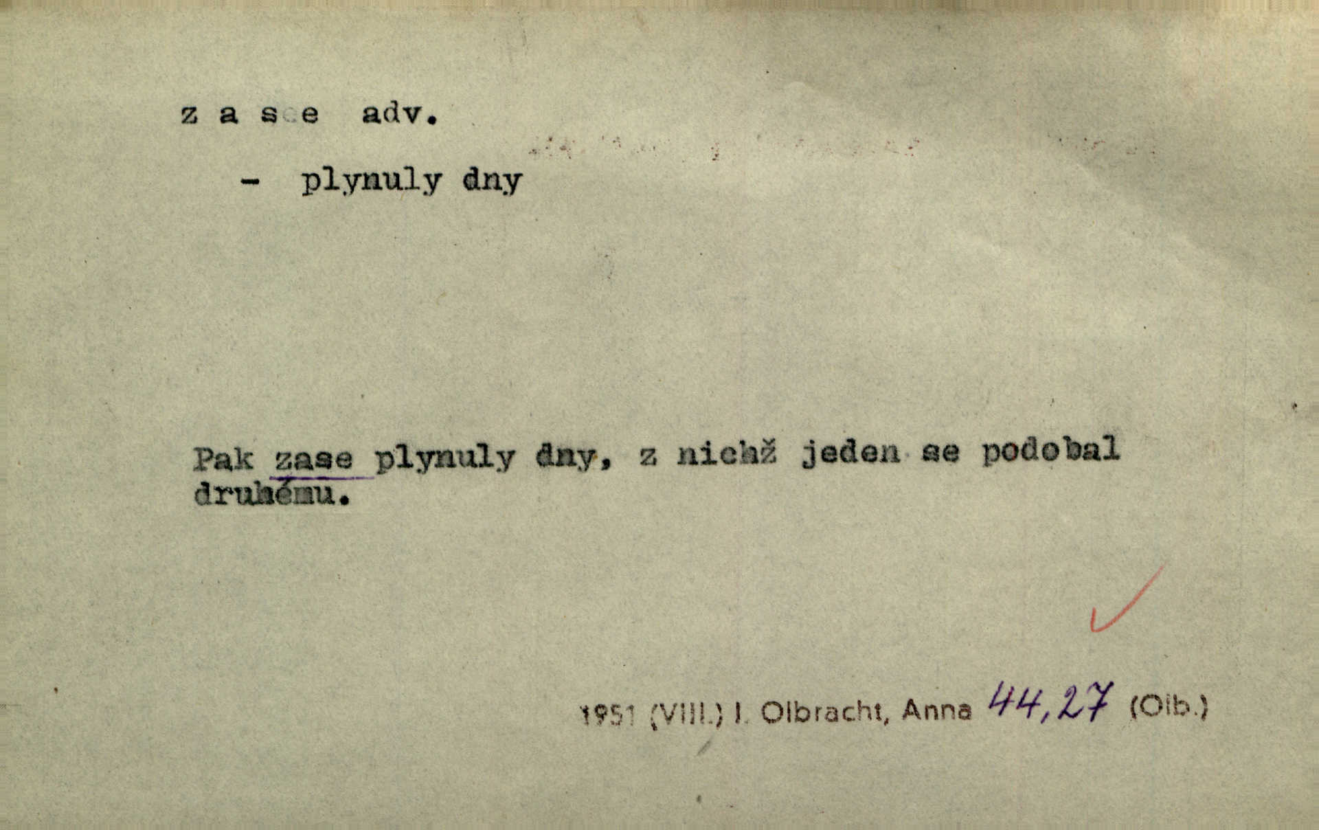 - zase, zas (dial. zasej, zasejc) adv. opět, znova, ještě jednou, po druhé. Až zase přijdete, uděláme to zase tak. Šmil. Když odešla, Liduška si zase k oknu sedla. Erb. Od Karlova Týna jsem po letech zase šel. Čech. Konečně péra se zase chopiv, začínám o lásce. Tyl. Má naděje zase stoupla. Vach. Po chvíli bylo ticho — zase zahučely varhany — opět utichly. Rais. Skřek zazněl, ještě hroznější a zase skřek a zase, zas a zas. Zey. Právě jsem se dověděl, že příčinou domácích nesvárů jsem já a zase jenom já opětovaně. V. Mrš. D vyjadřuje připojování s částečným odporováním; pak, dále, však. [Pes] štěkal hned prudce, divě, zas vesele ňafal. Rais. Hned bouří rozmarem, zas dá se v pění. Vrch. Zas se tiší, zase doufá dívka v šatě zeleném. Čel. Jsme snad tvoji psi, že brzy hladíš nás a kopeš zas? Zey. Říčka vinula se tu vrb, olší tlupou šerou, lučinou tam kyprou zase. Čech. Vinula [list] kolem rákosu, jejž v rákos větší zase vtěsnala. Zey. Vesele se Zemí Měsíc jde, Země zas v mocném kruhu se okolo Slunce otáčí. Ner. Všude vidět bylo smrčí, tam křížek malý, tam hvězda tmavá — tam zas celý věnec zelený kol obrazu Anděla Strážce. V. Mrš. D vyjadřuje změnu, vystřídávání n. vzájemnost. Celé hodiny se dívala z okna na hladinu, která se stále měnila, fialová, zelená, zase růžová hrála na slunci. Til. Již zněla zase píseň jeho jako ukolébavka, tak měkce a sladce. Herb. A žili v štěstí největšim, až jedna [z hvězd] zase zmřela. Hál. Pak přišel zas nějaký starý myslivec; ale tomu se lépe nevedlo. Erb. Tenkráte jste zajisté poprosila některou sousedku, aby se k Vám ob čas podívala, a udělala jste jí za tuto službu zas něco k vůli. Svět. Oko chce [krásu] pohltit, ona pohltí zas oko celé. Rub. Ucti čas a on tě uctí zas. Přísl. D vyjadřuje nesouhlas, odpor; naproti tomu, naopak. Do Kobylího svolán byl lid ze všech blízkých dědin. Jiní zase svoláni byli do Pavlovic. Herb. Když Heine pyšnil se tím výronem německého středověkého ducha, tu měl si vzpomenouti, že ty kathedrály jsou zase výkvětem francouzského ducha. Zey. Hrabě, přimlouvaje se za spolek s Francií, své důvody nám vyloží; vy zase, jsa přítelem Pruska, odpovíte svými. Bozd. Stísněn obavami do budoucna, ale zase naplněn rozpínavou mladickou silou, zaklepal jsem na dvéře. Šim. Juro tvrdil, že jednobarevní koně se hodí více k dílu, a Rakolubský to zas o bělostrakatých jistil. Jir. Tu závist vzbudil nesměrnou, tam soucitu zas něhu. Vrch. Kdybych byl měl pochyby [o jeho učitelství]‚ tento hovor by je byl potlačil. Jen ta reálka zase mě mýlila. Šim. Malý kout na zadní straně chrámu má svůj svět, svět stejně malý jako velký zas. Svob. A mně se zdá, že k nim [rakvím] jen jeden skok a zase k nim přec celý život jest s jiného hlediska. Svob. D vyjadřuje děj protikladný. Až se zase domů vrátím, půjdu z Frydku do Těšína. Bezr. Snad ti dá Hospodin z tej dýdy zasej vyváznout. Nov. Voda zasejc klesne a náš mlejn to vydrží. Hampl. D zdůrazňuje vyjádření; vždyť, přece, věru. Kdyby nám nechali čas rozmyslet si to, tak by se byli přihlásili všichni, to já je zase znám. K. Čap. A to jste zas pěkná hospodyně, když se po ničem neptáte. Rais. Kde je abbé? Chtěli k zdaru připít mu, kde vězí zase? Vrch. A zasejc na mramor patří taky vercajk. Klost. Milostpaní to zas ušetří na šatech. Šim. Ob. Jestli myslíš, že mám nějaký peníze, tak to zas ne. Lang. Já jsem chudá, ale na čest držím, to zas jo. K. Čap. Já si platím koncesi a on by chtěl poslouchat zadarmo? A to zas prr! Týd. rozhl. D Zast. a lid. zpět, nazpět. Z těch, kteří zase přišli, byl nejeden zmrzačen. Jir. S lože vyskočila v mladé kráse — stará bručíc vylezla tam zase. Čech. Co někdy z úst vrabcem vyletí, zase toho nevtáhneš čtyřmi koňmi. Čel. Privilegia nejsou z Hrádku hned vydána zase. Win. Počkej jenom ještě trochu, hned se vrátí zas maminka. Erb. Ale Bože, co my vám zase dáme na oplátku. Něm.