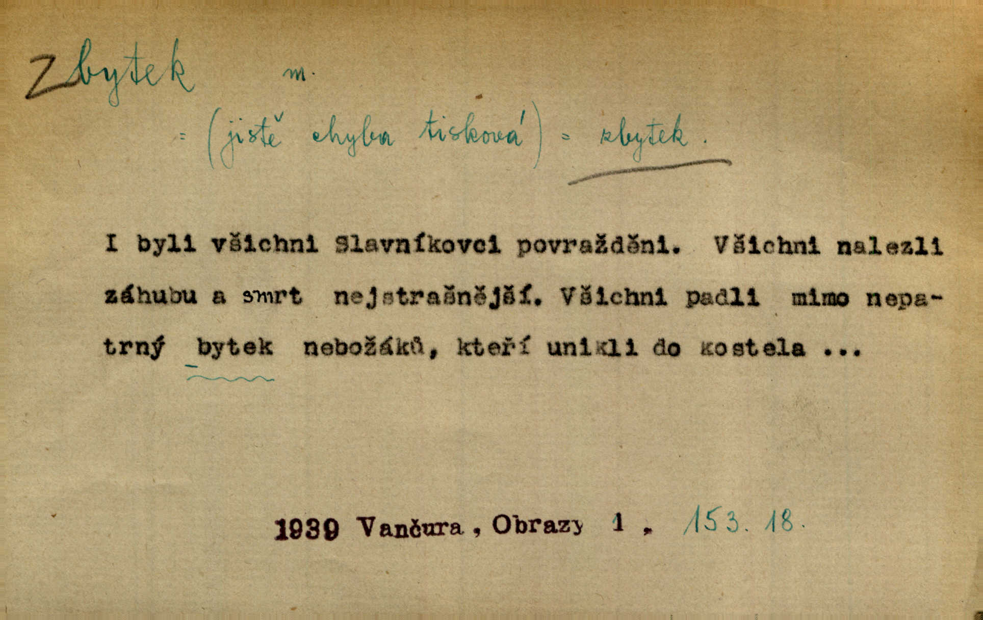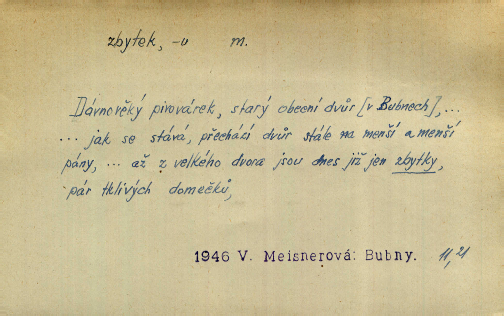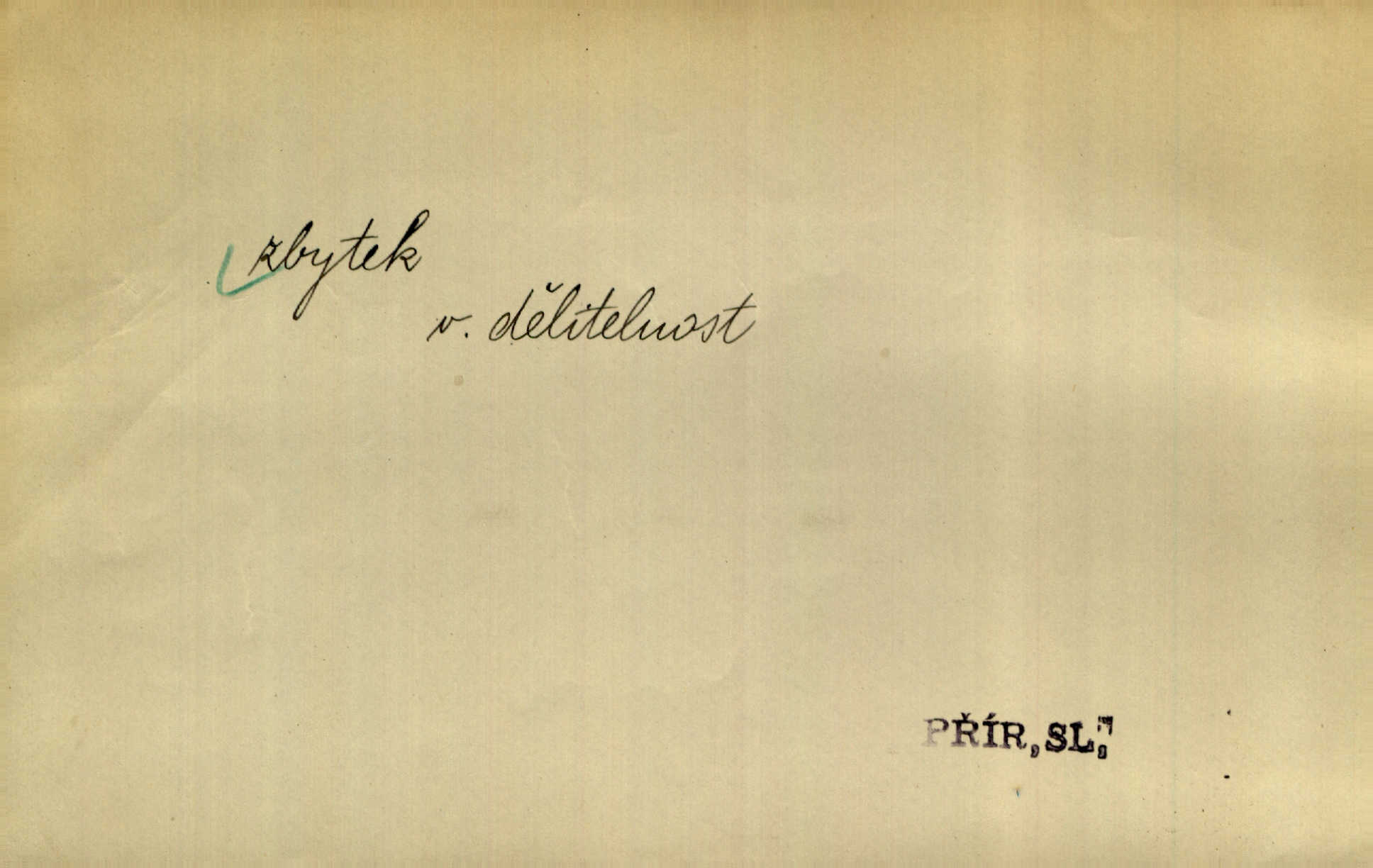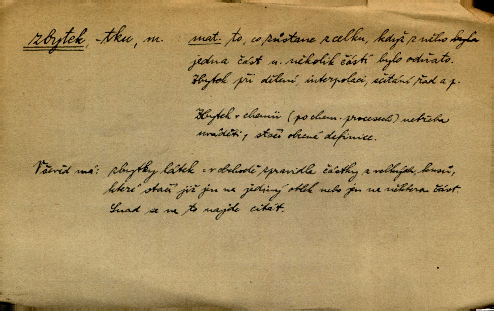 - zbytek, -tku m. to, co zbývá n. zbylo; ostatek, pozůstatek. Láhvičku rumu bys mohl vzít, abychom nedávali na stůl zbytek. Herrm. Panímáma nosila jim [koledníčkům] zbytky od večeře a přidala jablko neb ořech. Rais. Byla [bábovka] jako dort, snědl jsem celý zbytek. Šim. Rozvaliny hradu byly truchlivým zbytkem něčeho, čeho nebylo možno ani dobře dohadnouti se. Dyk. Viděl špinavou podlahu, zbytky od cigárek nedopalky, špačky. Preis. Dědinou trousí se ženské. Jdou na poslední zbytky řepy. A. Mrš. Po janičárech nezbylo ani památky, leda to zvláštní museum ve zbytku kasáren. Ner. Před chatrčí krčilo se vychrtlé stromoví, zbytek to po nějaké zahradě. Herb. Rusové se zbytkem rakouského vojska ustupovali neustále. Jir. Ode mnoha let se zvláštní šetrností shledává zbytky šerého dávnověku. Třeb. Před hrobkou [Napoleonovou] procházejí se scvrklí stařečkové, prsa pokrytá řády — dojemné to zbytky „velké armády“. Ner. [Voda] už neobsahuje pevných rozpuštěných látek. Ty zůstaly v baňce jako destilační zbytek. Chemie. Vždyť ten zbytek jeho jmění nebyl tak značný! Zey. Za zbytek [peněz] koupila si Terezka ještě krásnou broži pod krk. Baar. On [Napoleon] šel a zbytek života na úzkém strávil břehu. Vrch. Uprázdní-li se místo člena dříve, než skončí funkční období předsednictva, koná se na zbytek období volba doplňovací. Ústava. Krolmus upravuje povídkové látky pro svoji theorii o přímých zbytcích pohanské víry v českém lidu. Tille. Červánků zbytek nad vesnicí visí. Vrch. Však matka dětem něco pošeptala a zbytku dovtípí se mudrlanti. Slád. Saháš mně na zbytek mé cti. Staš. Po vztyčení vlajky je rozcvička, která zbaví každého posledních zbytků ospalosti. Ml. fronta. D beze zbytku, beze zbytků úplně, do důsledků. Jaký závěr může míti tento nekonečný řetěz úzce spojených příčin a následků, to nechť domyslí beze zbytku ti, kdo přispívají k tomuto stavu. O. J. Novot. Ale když se rozhovoří, umí všecko vycítit beze zbytku. John. Jeho [Vančurův] výraz prostupuje beze zbytků celou jeho látkou a přetváří ji od kořene. Šal. Tato jednou přijatá usnesení musí být bezpodmínečně a neúchylně prováděna, plněna a splněna beze zbytku. Tvorba. D zbytky zast. tělesné pozůstatky; ostatky, relikvie. Pod mramorovým pomníkem odpočívaly práchnivějící zbytky jejího otce. J. J. Kol. Už narovnána trčí hranice a hladoví už oheň lakotný po zbytcích toho, jenž králem někdy nazýval se. Zey. Chrám Klémentův jeho [Cyrilovy] zbytky hostí. Suš. D Zast. nadbytek. Neb na co jen pomyslíš, a za čím jen v srdci zatoužíš, vším ona [země] v největší hojnosti a zbytku oplývá. Vin. D zbytkem poněk. zast. zbytečně, marně. Zda slova tato pomohou — či psána jsou zbytkem? Lit. l. Nebude tuším zbytkem obšírněji o ní [Gebauerově mluvnici] promluviti. Ath.