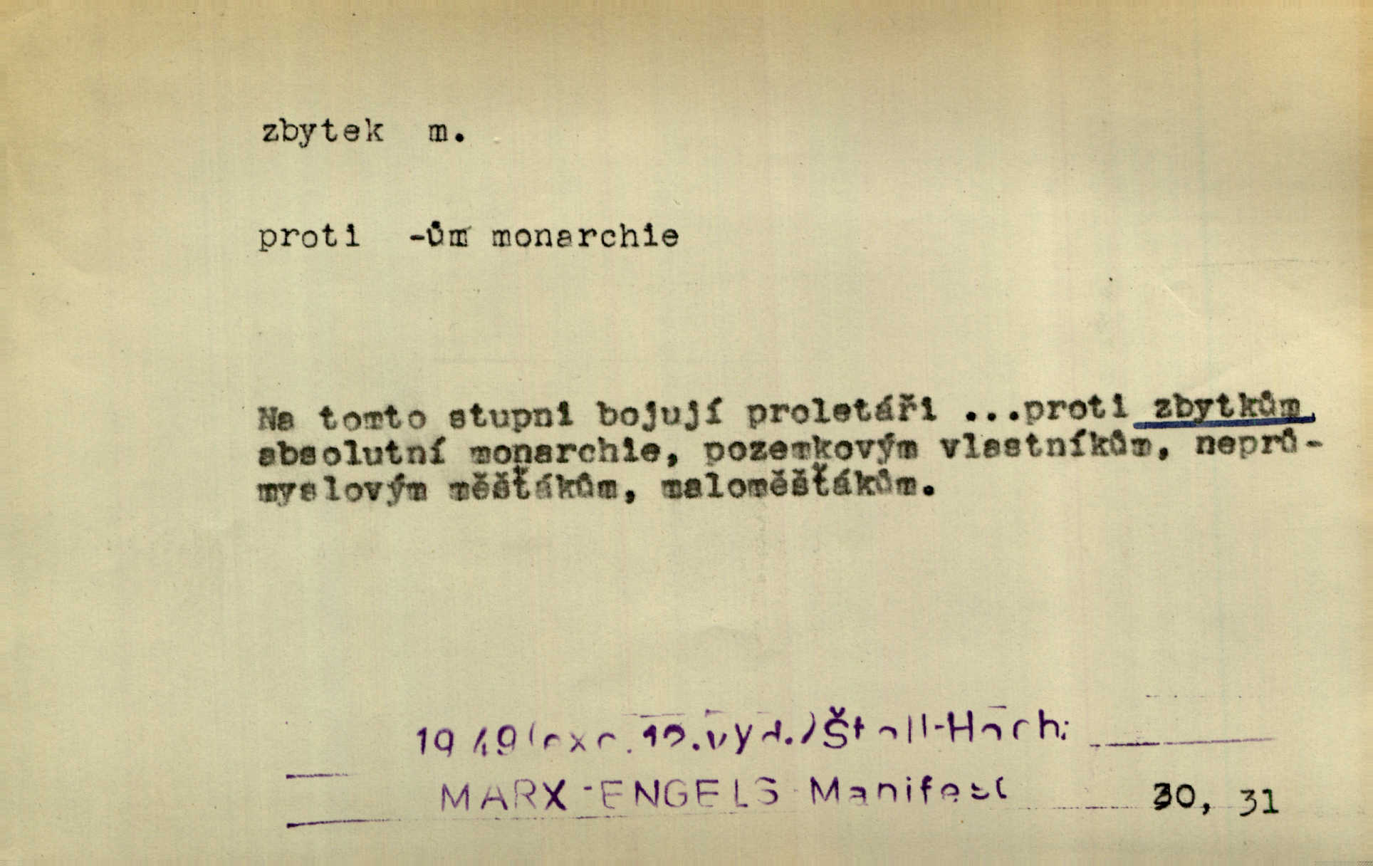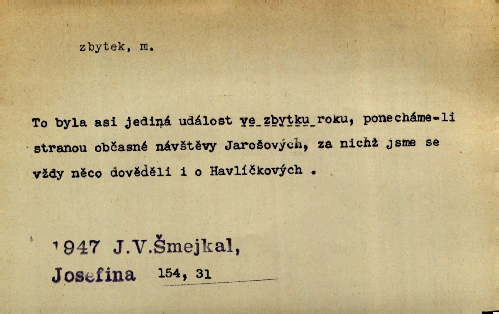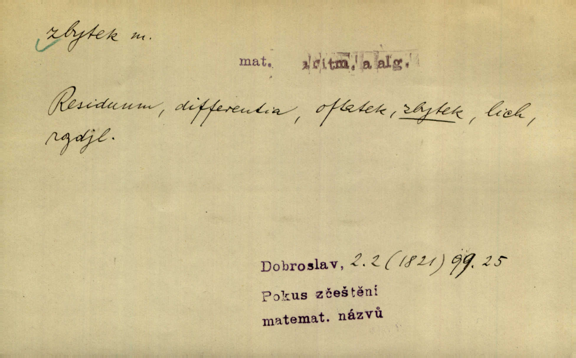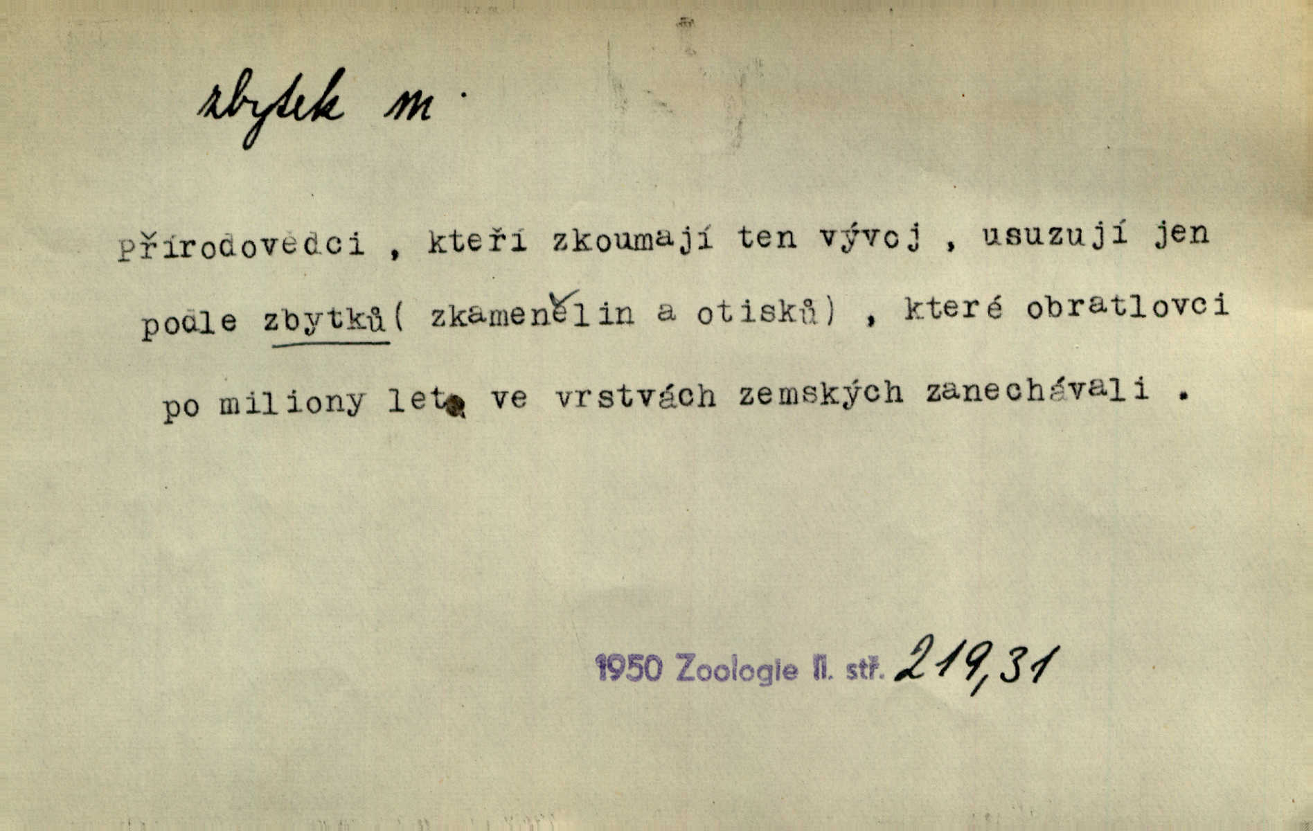- zbytek, -tku m. to, co zbývá n. zbylo; ostatek, pozůstatek. Láhvičku rumu bys mohl vzít, abychom nedávali na stůl zbytek. Herrm. Panímáma nosila jim [koledníčkům] zbytky od večeře a přidala jablko neb ořech. Rais. Byla [bábovka] jako dort, snědl jsem celý zbytek. Šim. Rozvaliny hradu byly truchlivým zbytkem něčeho, čeho nebylo možno ani dobře dohadnouti se. Dyk. Viděl špinavou podlahu, zbytky od cigárek nedopalky, špačky. Preis. Dědinou trousí se ženské. Jdou na poslední zbytky řepy. A. Mrš. Po janičárech nezbylo ani památky, leda to zvláštní museum ve zbytku kasáren. Ner. Před chatrčí krčilo se vychrtlé stromoví, zbytek to po nějaké zahradě. Herb. Rusové se zbytkem rakouského vojska ustupovali neustále. Jir. Ode mnoha let se zvláštní šetrností shledává zbytky šerého dávnověku. Třeb. Před hrobkou [Napoleonovou] procházejí se scvrklí stařečkové, prsa pokrytá řády — dojemné to zbytky „velké armády“. Ner. [Voda] už neobsahuje pevných rozpuštěných látek. Ty zůstaly v baňce jako destilační zbytek. Chemie. Vždyť ten zbytek jeho jmění nebyl tak značný! Zey. Za zbytek [peněz] koupila si Terezka ještě krásnou broži pod krk. Baar. On [Napoleon] šel a zbytek života na úzkém strávil břehu. Vrch. Uprázdní-li se místo člena dříve, než skončí funkční období předsednictva, koná se na zbytek období volba doplňovací. Ústava. Krolmus upravuje povídkové látky pro svoji theorii o přímých zbytcích pohanské víry v českém lidu. Tille. Červánků zbytek nad vesnicí visí. Vrch. Však matka dětem něco pošeptala a zbytku dovtípí se mudrlanti. Slád. Saháš mně na zbytek mé cti. Staš. Po vztyčení vlajky je rozcvička, která zbaví každého posledních zbytků ospalosti. Ml. fronta. D beze zbytku, beze zbytků úplně, do důsledků. Jaký závěr může míti tento nekonečný řetěz úzce spojených příčin a následků, to nechť domyslí beze zbytku ti, kdo přispívají k tomuto stavu. O. J. Novot. Ale když se rozhovoří, umí všecko vycítit beze zbytku. John. Jeho [Vančurův] výraz prostupuje beze zbytků celou jeho látkou a přetváří ji od kořene. Šal. Tato jednou přijatá usnesení musí být bezpodmínečně a neúchylně prováděna, plněna a splněna beze zbytku. Tvorba. D zbytky zast. tělesné pozůstatky; ostatky, relikvie. Pod mramorovým pomníkem odpočívaly práchnivějící zbytky jejího otce. J. J. Kol. Už narovnána trčí hranice a hladoví už oheň lakotný po zbytcích toho, jenž králem někdy nazýval se. Zey. Chrám Klémentův jeho [Cyrilovy] zbytky hostí. Suš. D Zast. nadbytek. Neb na co jen pomyslíš, a za čím jen v srdci zatoužíš, vším ona [země] v největší hojnosti a zbytku oplývá. Vin. D zbytkem poněk. zast. zbytečně, marně. Zda slova tato pomohou — či psána jsou zbytkem? Lit. l. Nebude tuším zbytkem obšírněji o ní [Gebauerově mluvnici] promluviti. Ath.