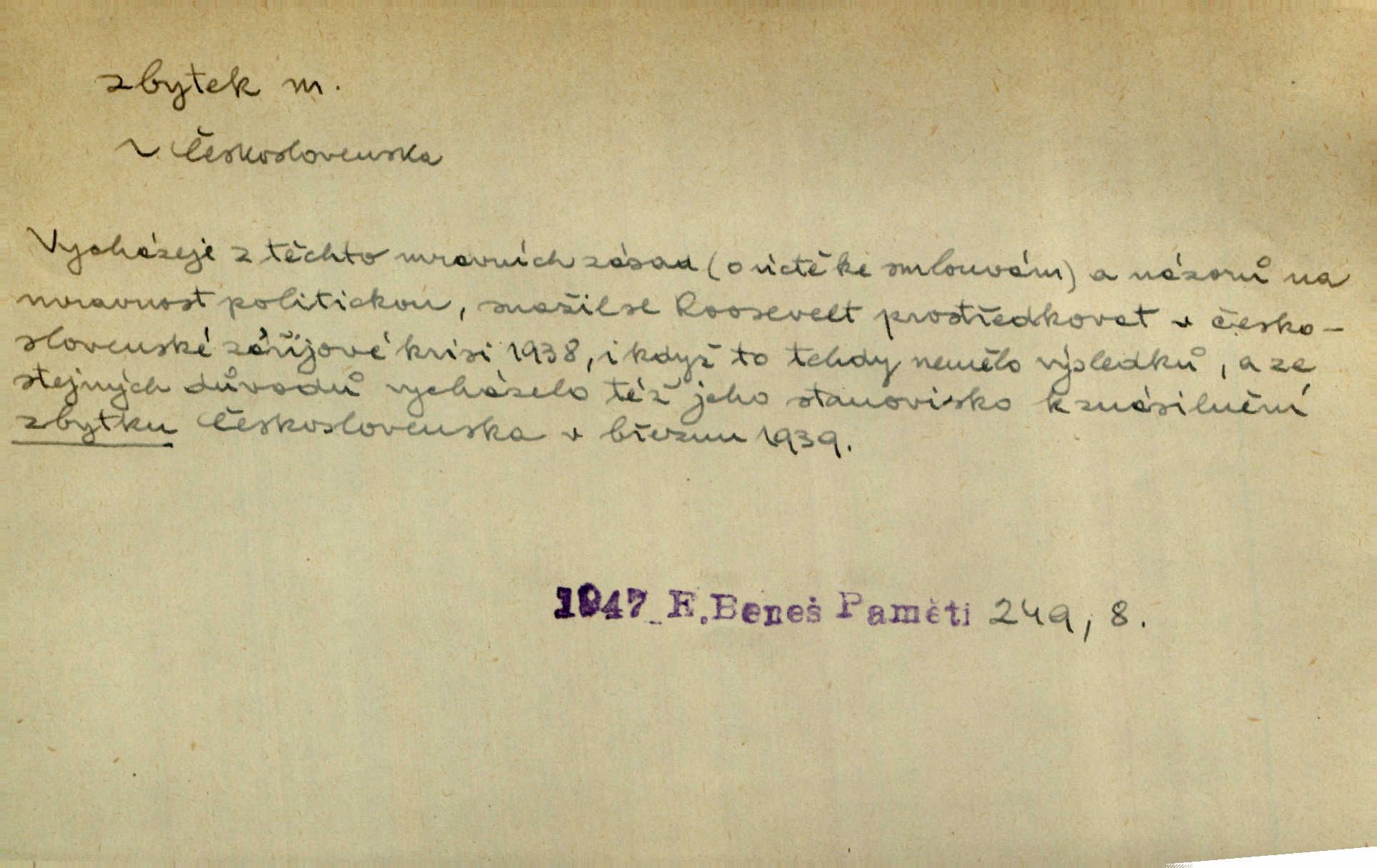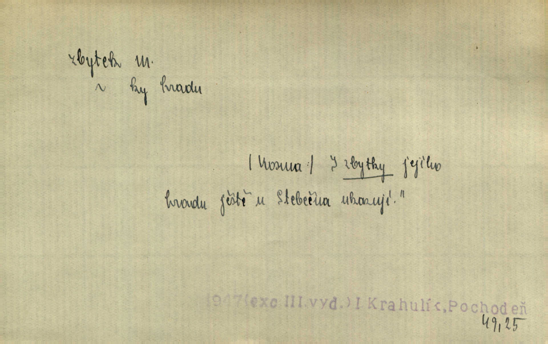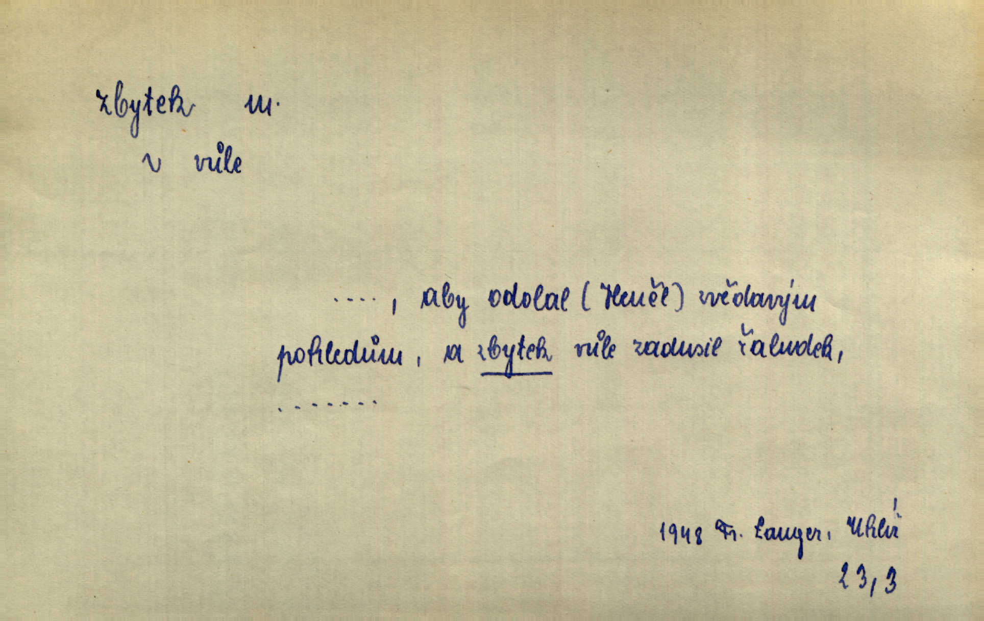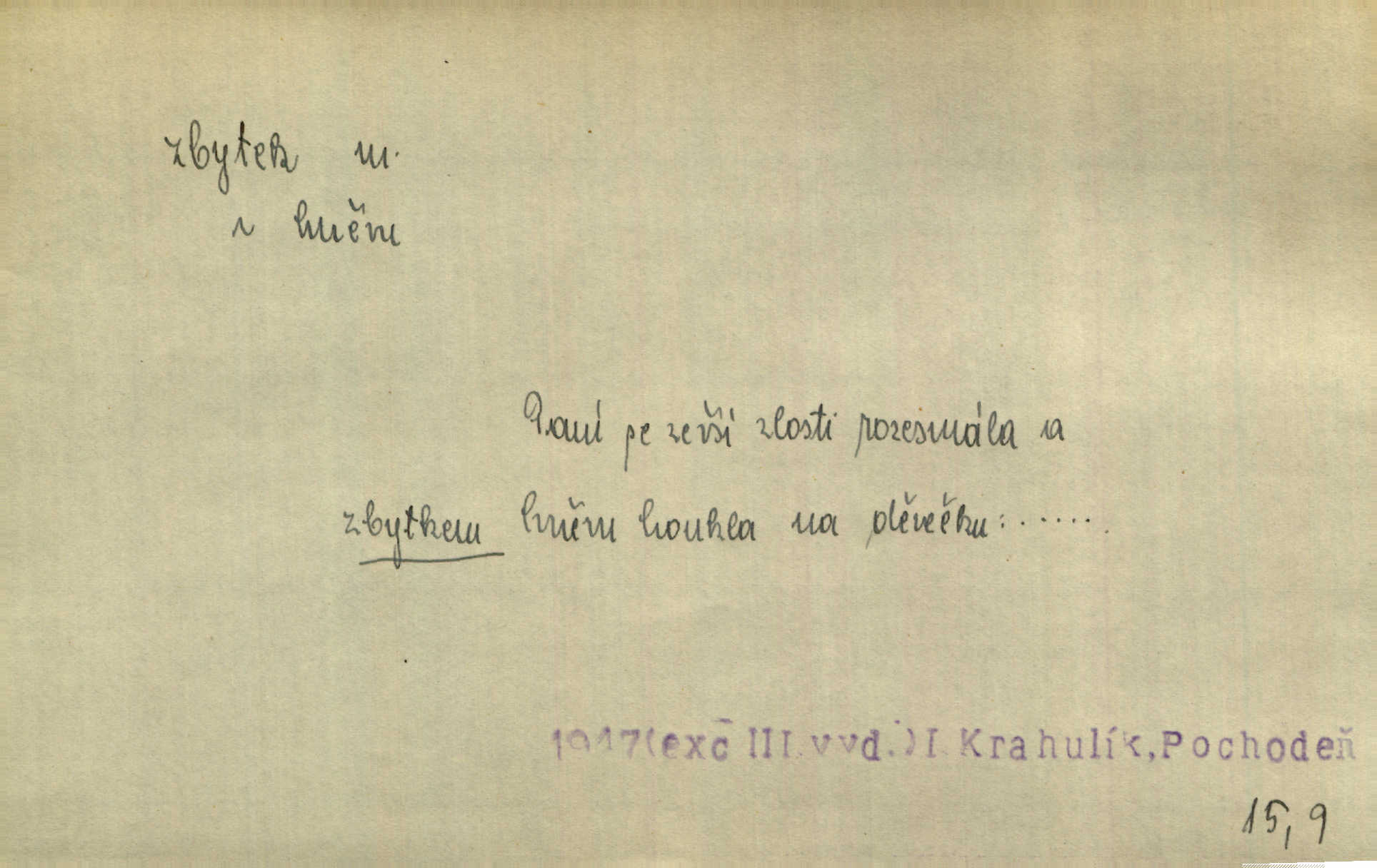 - zbytek, -tku m. to, co zbývá n. zbylo; ostatek, pozůstatek. Láhvičku rumu bys mohl vzít, abychom nedávali na stůl zbytek. Herrm. Panímáma nosila jim [koledníčkům] zbytky od večeře a přidala jablko neb ořech. Rais. Byla [bábovka] jako dort, snědl jsem celý zbytek. Šim. Rozvaliny hradu byly truchlivým zbytkem něčeho, čeho nebylo možno ani dobře dohadnouti se. Dyk. Viděl špinavou podlahu, zbytky od cigárek nedopalky, špačky. Preis. Dědinou trousí se ženské. Jdou na poslední zbytky řepy. A. Mrš. Po janičárech nezbylo ani památky, leda to zvláštní museum ve zbytku kasáren. Ner. Před chatrčí krčilo se vychrtlé stromoví, zbytek to po nějaké zahradě. Herb. Rusové se zbytkem rakouského vojska ustupovali neustále. Jir. Ode mnoha let se zvláštní šetrností shledává zbytky šerého dávnověku. Třeb. Před hrobkou [Napoleonovou] procházejí se scvrklí stařečkové, prsa pokrytá řády — dojemné to zbytky „velké armády“. Ner. [Voda] už neobsahuje pevných rozpuštěných látek. Ty zůstaly v baňce jako destilační zbytek. Chemie. Vždyť ten zbytek jeho jmění nebyl tak značný! Zey. Za zbytek [peněz] koupila si Terezka ještě krásnou broži pod krk. Baar. On [Napoleon] šel a zbytek života na úzkém strávil břehu. Vrch. Uprázdní-li se místo člena dříve, než skončí funkční období předsednictva, koná se na zbytek období volba doplňovací. Ústava. Krolmus upravuje povídkové látky pro svoji theorii o přímých zbytcích pohanské víry v českém lidu. Tille. Červánků zbytek nad vesnicí visí. Vrch. Však matka dětem něco pošeptala a zbytku dovtípí se mudrlanti. Slád. Saháš mně na zbytek mé cti. Staš. Po vztyčení vlajky je rozcvička, která zbaví každého posledních zbytků ospalosti. Ml. fronta. D beze zbytku, beze zbytků úplně, do důsledků. Jaký závěr může míti tento nekonečný řetěz úzce spojených příčin a následků, to nechť domyslí beze zbytku ti, kdo přispívají k tomuto stavu. O. J. Novot. Ale když se rozhovoří, umí všecko vycítit beze zbytku. John. Jeho [Vančurův] výraz prostupuje beze zbytků celou jeho látkou a přetváří ji od kořene. Šal. Tato jednou přijatá usnesení musí být bezpodmínečně a neúchylně prováděna, plněna a splněna beze zbytku. Tvorba. D zbytky zast. tělesné pozůstatky; ostatky, relikvie. Pod mramorovým pomníkem odpočívaly práchnivějící zbytky jejího otce. J. J. Kol. Už narovnána trčí hranice a hladoví už oheň lakotný po zbytcích toho, jenž králem někdy nazýval se. Zey. Chrám Klémentův jeho [Cyrilovy] zbytky hostí. Suš. D Zast. nadbytek. Neb na co jen pomyslíš, a za čím jen v srdci zatoužíš, vším ona [země] v největší hojnosti a zbytku oplývá. Vin. D zbytkem poněk. zast. zbytečně, marně. Zda slova tato pomohou — či psána jsou zbytkem? Lit. l. Nebude tuším zbytkem obšírněji o ní [Gebauerově mluvnici] promluviti. Ath.
