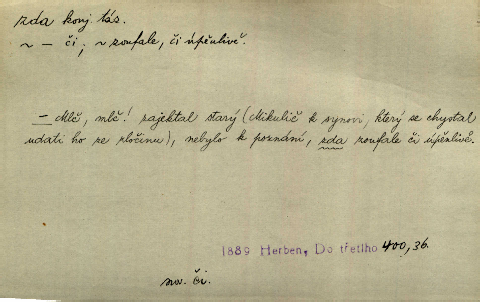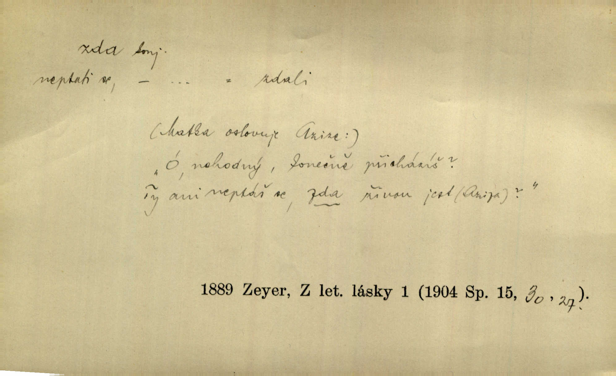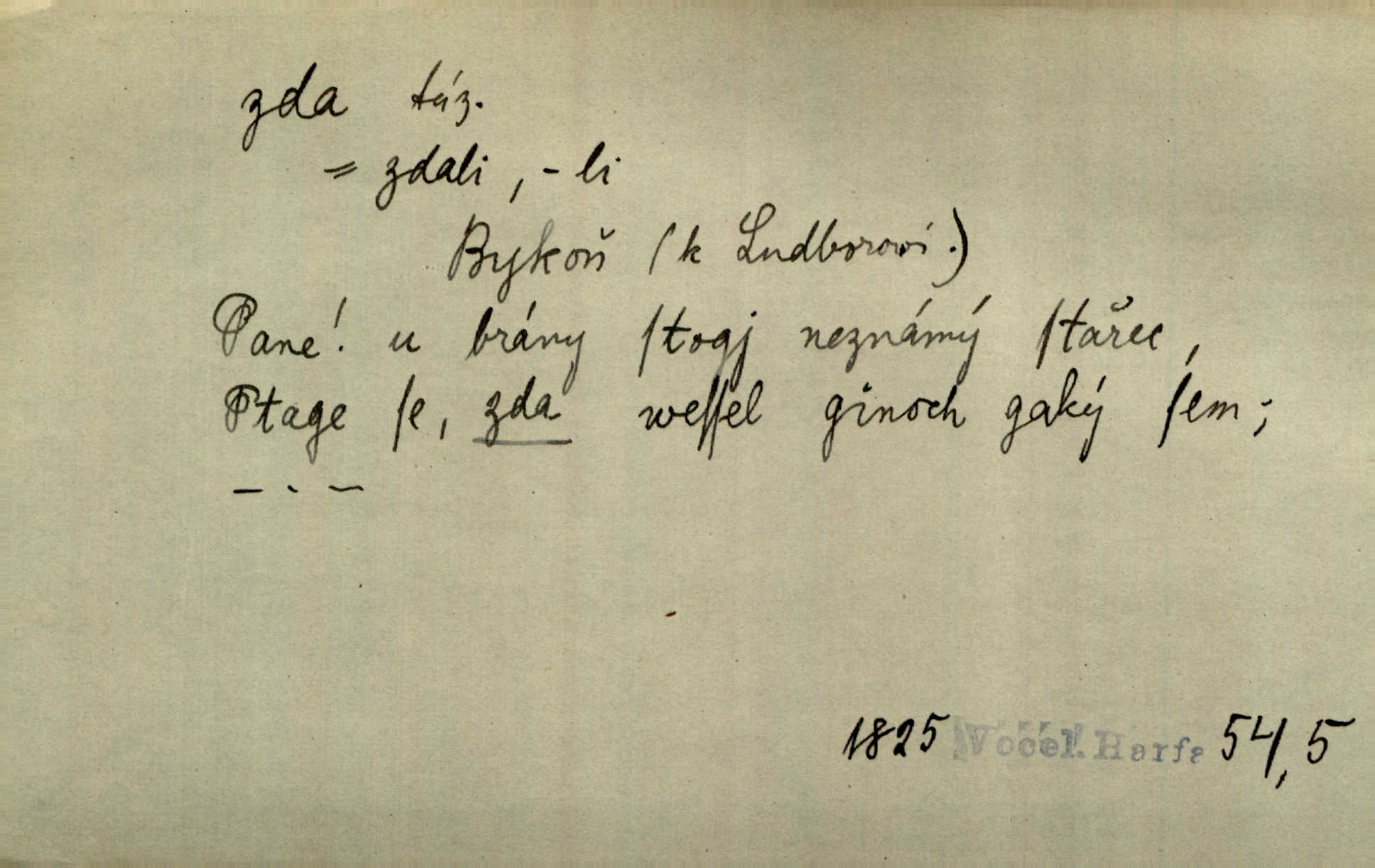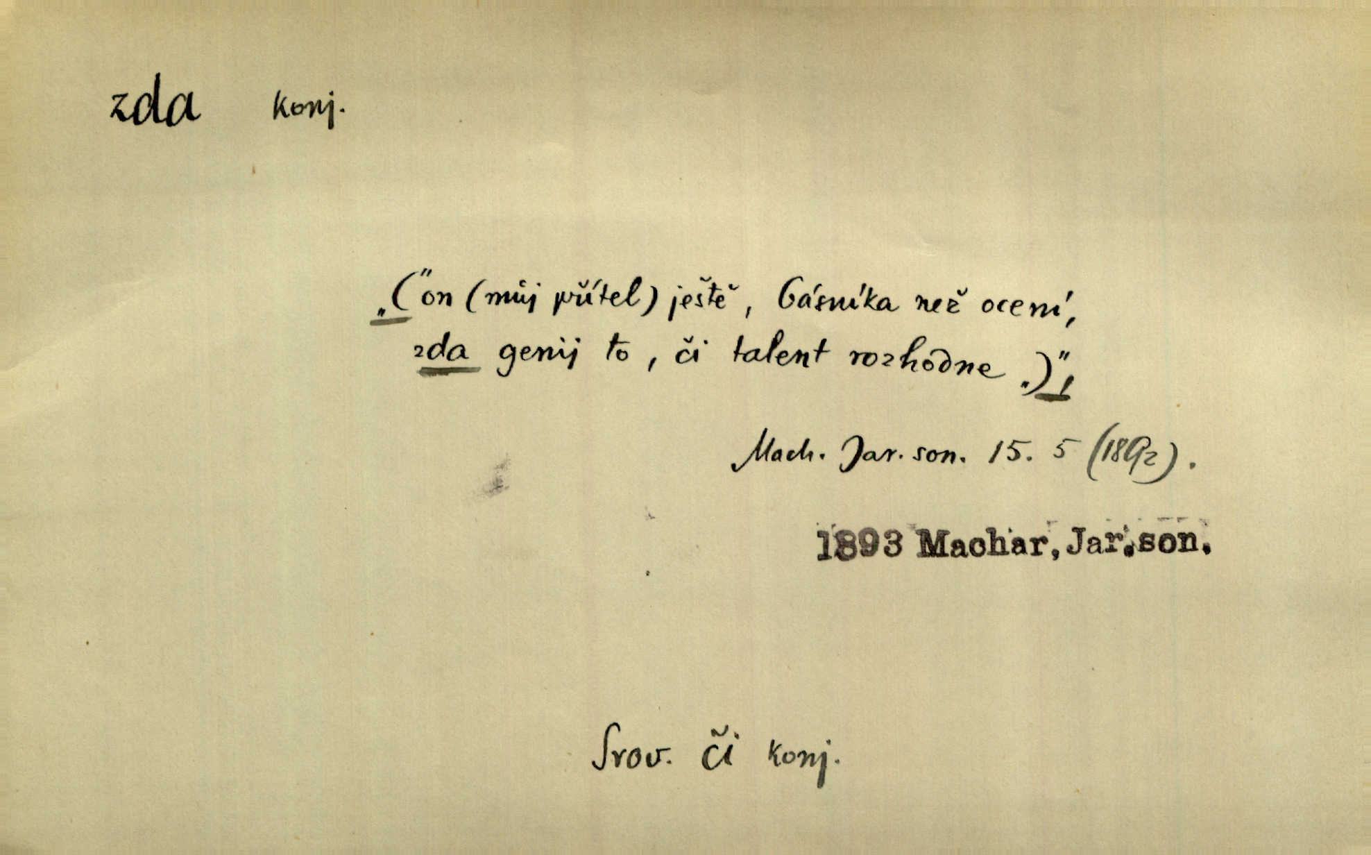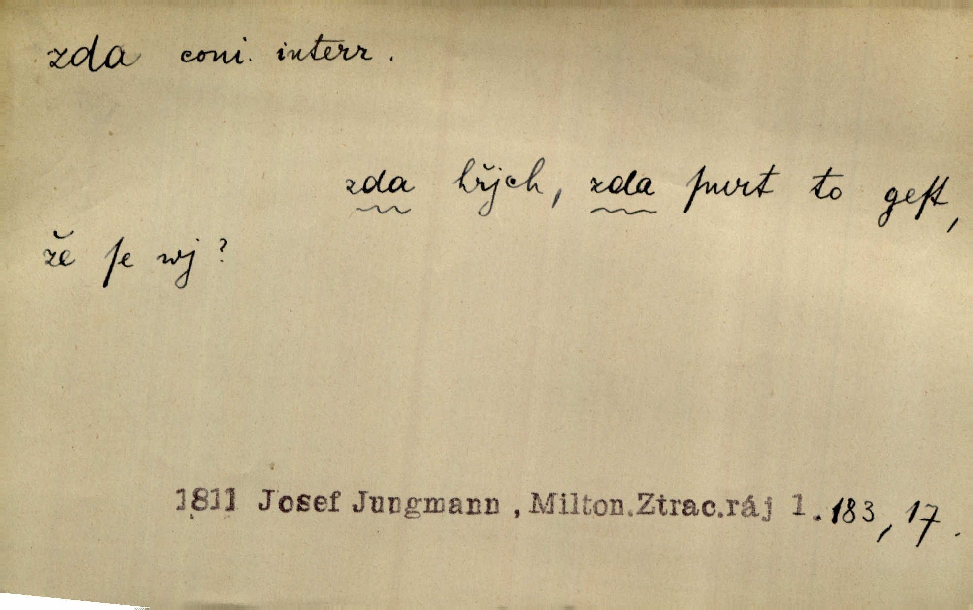 - zda, zdali (poněk. zast. zdaž, zdaliž) (v otázce přímé zprav. ve spoj. s pak) sp. uvozuje otázku zjišťující platnost n. neplatnost nějakého tvrzení. O zda vám věřit mám? Krás. Strýc odešel. Kdy přijde a zdali co přinese? Jir. Zdali pak ještě vás uvidím, Paskovské rybníky, jednou? Bezr. „Zdalipak se modlíš?“ ptala se babička Jindry. Nový. „A zdaž jsi poděkovala, Madlenko?“ ptal se otec. Pfleg. Bůh vás pozdrav, milé paní; zdaž byste popřály krátkého odpočinku a občerstvení mně a koni mému? Něm. „Ty ji miluješ,“ mluvil jsem sám k sobě; „zdaliž pak ale také ona tebe miluje?“ Rub. Přijde-li veliká bouře, zdaliž kmen vydrží! Jir. Zda vzpomínáš [slunce] na onen výkřik, nesený věky, když prvně pohnul se život, zmámen tvou září. Břez. Sandnerová, zdalipak si to budu pamatovat? Maj. D Poněk. zast. vyjadřuje otázku, na niž čekáme, zpr. po splnění jisté podmínky, vyjádřené vedlejší větou podmínečnou, odpověď zápornou. Zdali pak by nám nebylo lépe, kdy bychom byli šest střevíců pod zemí! Třeb. Kdybych se obával o svůj život, zdaliž bych byl tolikrát nastavoval prsa svá střelám i mečům nepřátel našich. J. z Hv. Zdaž tolik slz by kanulo, kam soucit blahý by zasvítal? Ner. Vás kdyby učit chtěli všichni svatí, zda všimnou si jich Češi paličatí. Ner. Zdali jsem ti neřekla, aby’s té zlaté uzdy nechal na stěně a vzal koženou? cožpak. Erb. D uvozuje nepřímou otázku a často vůbec větu vedlejší obsahující tvrzení, jehož platnost není jistá. Jeníka se kdosi ptal, zda o tom [svatbě] co slyšel. Hál. Žabák se ptá, zdaž o světech ještě cos zvědít ráčí [žáby]. Ner. I táže se jinoch mnicha, zdaliž i tito [mrtví] neobživnou? Mácha. Lidé praví, že jste syn uhlířův, povězte mi pak, zdali to pravda? Něm. O rci mně, zdaž pro píseň mou máš ozvěnu ty vděčnou. Ner. Kdož z nás ví, zda pout budoucí vesele tak uhlídá? Sab. Nevím, zdali dobře činím. Zey. Tím spisem jest rozluštěna kontroverse o otázce, zdaliž skutečně Tataři u nás pobiti byli. Zl. Praha. Neohlíželi se [lidé], zda je někdo poslouchá. John. Jitka ve své nevinnosti zkoušela, zdaliž i ty věci vlastností svých předešlých pro ni pozbyly. Svět. Na všechny strany rozbíhali se poslové a vyslancové, zdaž by někde nalézti nebylo děvčete. Kapp. A když to všechno ještě jednou přehlídla, zdali by nikde ničeho nechybělo, vzala do ruky román. Něm. Nevím, zdaliž mi to vyjde na dobro, že jen také sem Vás nyní uvádím. Macháč. D v rozlučovacím (vylučovacím) spojení, zvl. tázacím (zda - či, nebo, aneb) uvozuje v prvním členu, zř. i v druhém členu, otázku, po příp. vůbec tvrzení, jehož platnost není jistá. Co na ni [Madlenku] čekalo na nové životem pouti? Zda radosť, či žalosť, či oboje. Šmil. Přetrhl bůh ví zda náhodou či schvalně pásku, jíž byl balíček listů svázán. Podl. Jen počkejte, kdo to z nich [bratří] dále přivede, zda-li Matěj nebo Jakub. Praž. pos. Zdali peníze poslal nebo ne, nevím. Šmil. Hoj, má panenko, co děláš? A zdali pak mne ještě znáš, aneb jiného v srdci máš? Erb. Zdaž Jindřich na hradě knížecím, nebo do své tvrze se navrátil, nelze mi rozhodnouti. Klicp. Nevěděl v zmatku svém ani, zdali jí ji podal, zdali se jí uchopila sama. Svět. D Zř. vyjadřuje, že jí uváděná věta vedlejší obsahuje podmínku své věty řídící; jestliže. Zdali, panno, v mém pokoji do dvou hodin s půlnoci probdíte, je skříňka vaše. Něm. Zdali bylo s to ji cosi posilniti a zhojiti, tož, jak soudila stařena, byla to ovšem vůně z něho [hlohu]. Svět.