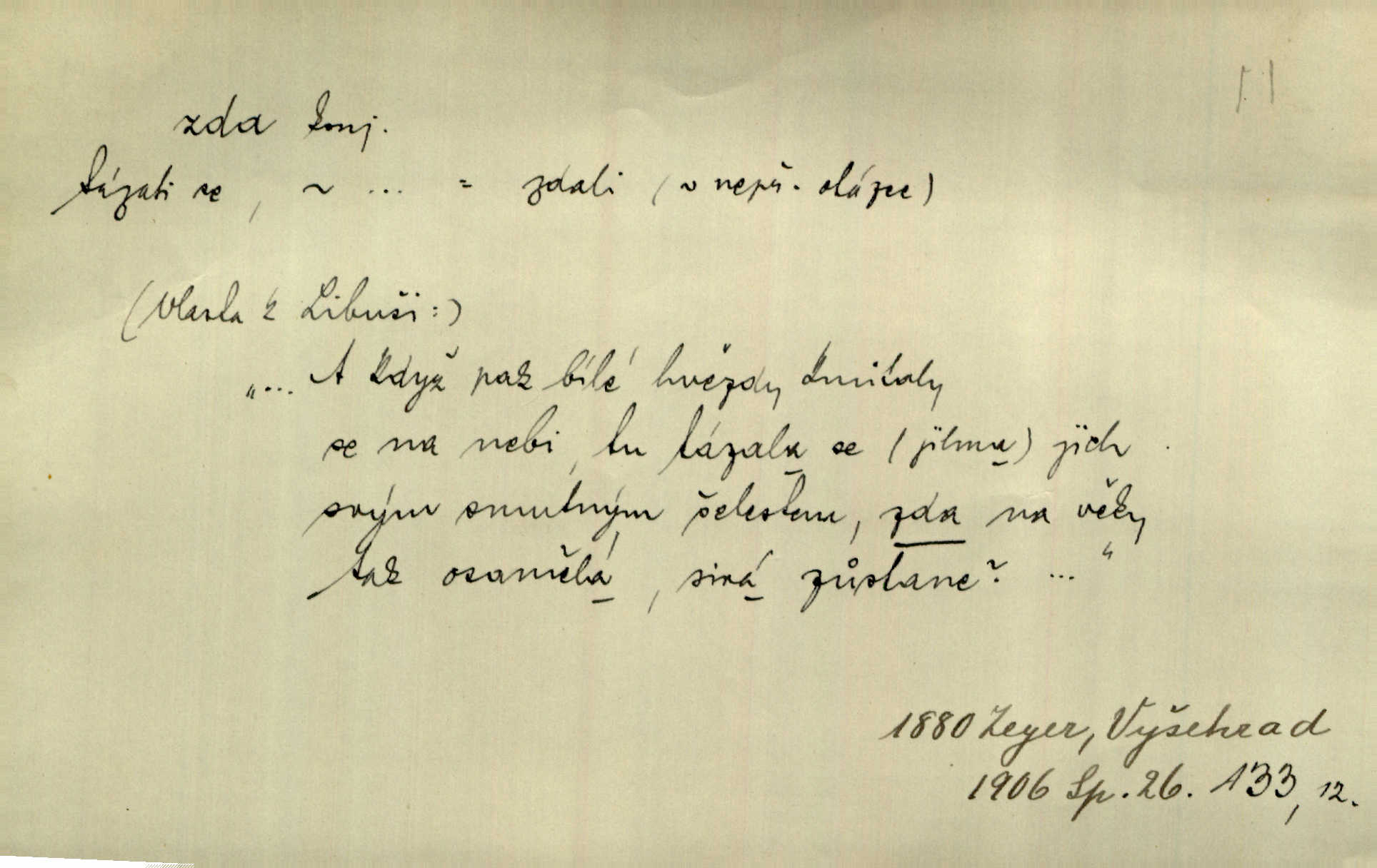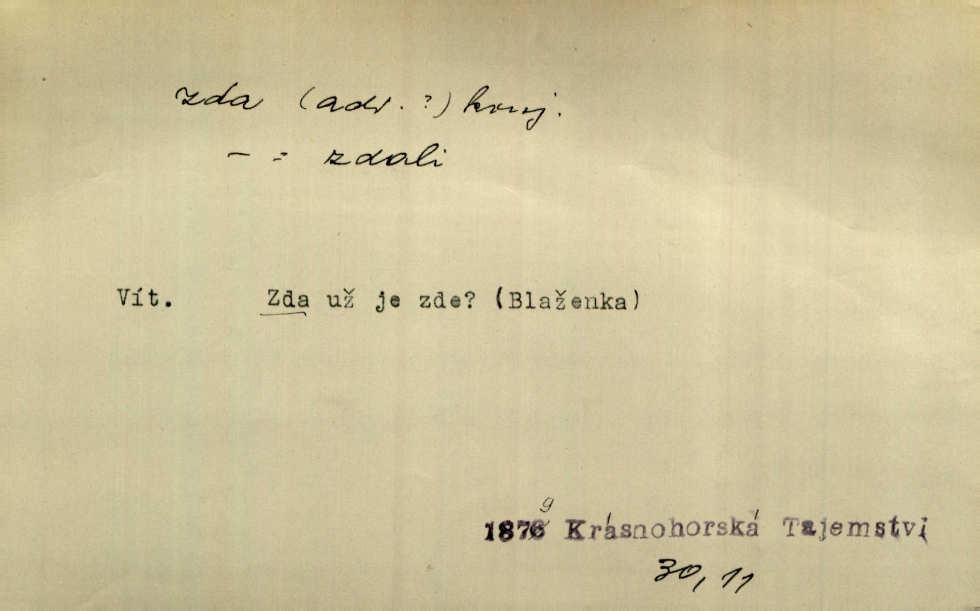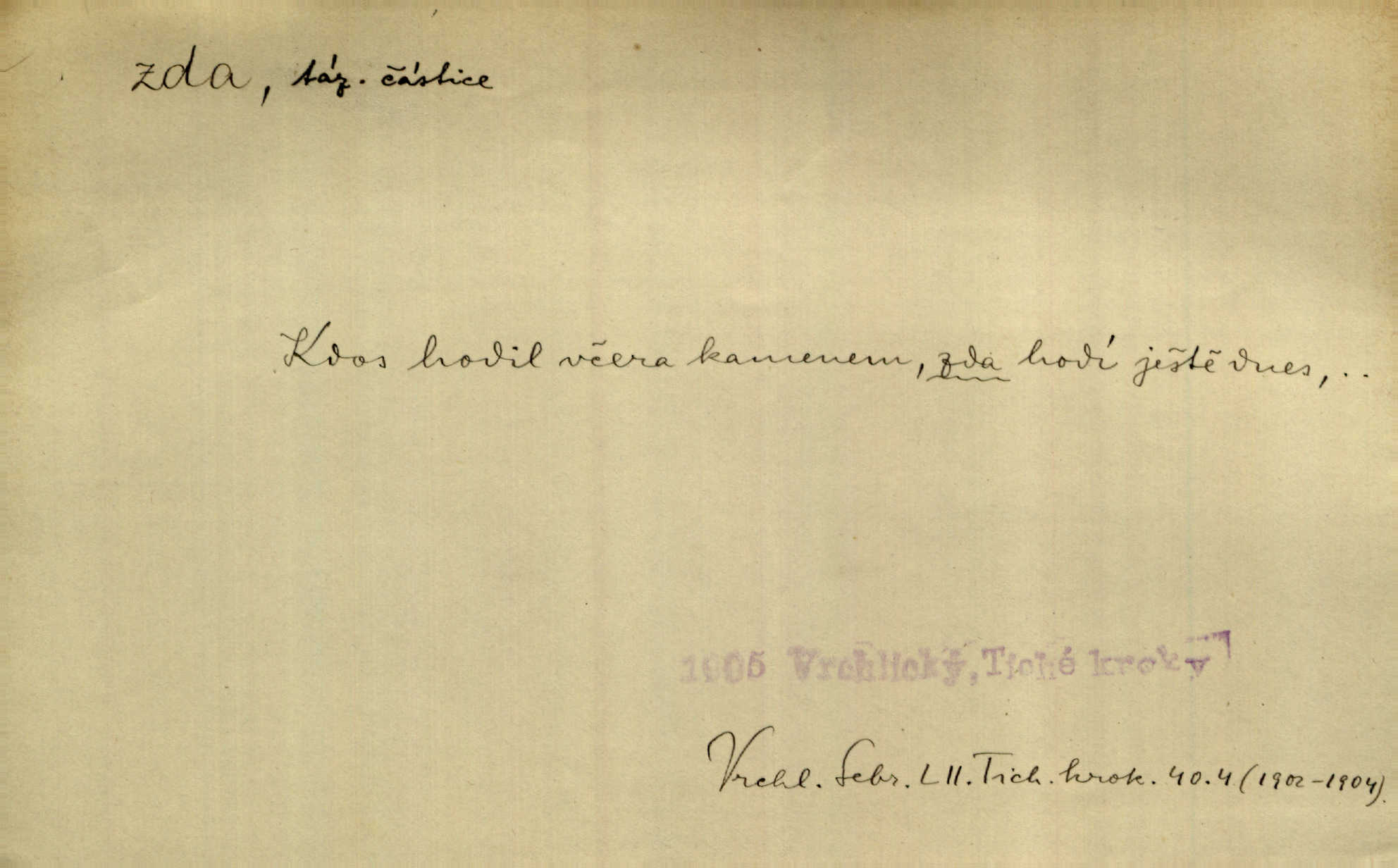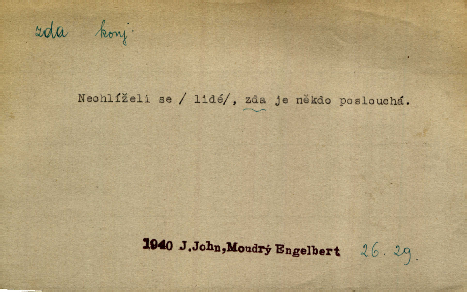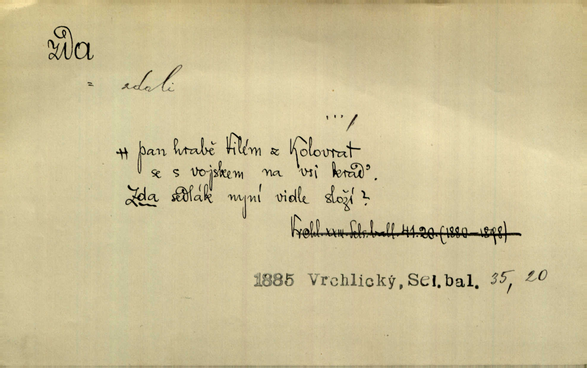 - zda, zdali (poněk. zast. zdaž, zdaliž) (v otázce přímé zprav. ve spoj. s pak) sp. uvozuje otázku zjišťující platnost n. neplatnost nějakého tvrzení. O zda vám věřit mám? Krás. Strýc odešel. Kdy přijde a zdali co přinese? Jir. Zdali pak ještě vás uvidím, Paskovské rybníky, jednou? Bezr. „Zdalipak se modlíš?“ ptala se babička Jindry. Nový. „A zdaž jsi poděkovala, Madlenko?“ ptal se otec. Pfleg. Bůh vás pozdrav, milé paní; zdaž byste popřály krátkého odpočinku a občerstvení mně a koni mému? Něm. „Ty ji miluješ,“ mluvil jsem sám k sobě; „zdaliž pak ale také ona tebe miluje?“ Rub. Přijde-li veliká bouře, zdaliž kmen vydrží! Jir. Zda vzpomínáš [slunce] na onen výkřik, nesený věky, když prvně pohnul se život, zmámen tvou září. Břez. Sandnerová, zdalipak si to budu pamatovat? Maj. D Poněk. zast. vyjadřuje otázku, na niž čekáme, zpr. po splnění jisté podmínky, vyjádřené vedlejší větou podmínečnou, odpověď zápornou. Zdali pak by nám nebylo lépe, kdy bychom byli šest střevíců pod zemí! Třeb. Kdybych se obával o svůj život, zdaliž bych byl tolikrát nastavoval prsa svá střelám i mečům nepřátel našich. J. z Hv. Zdaž tolik slz by kanulo, kam soucit blahý by zasvítal? Ner. Vás kdyby učit chtěli všichni svatí, zda všimnou si jich Češi paličatí. Ner. Zdali jsem ti neřekla, aby’s té zlaté uzdy nechal na stěně a vzal koženou? cožpak. Erb. D uvozuje nepřímou otázku a často vůbec větu vedlejší obsahující tvrzení, jehož platnost není jistá. Jeníka se kdosi ptal, zda o tom [svatbě] co slyšel. Hál. Žabák se ptá, zdaž o světech ještě cos zvědít ráčí [žáby]. Ner. I táže se jinoch mnicha, zdaliž i tito [mrtví] neobživnou? Mácha. Lidé praví, že jste syn uhlířův, povězte mi pak, zdali to pravda? Něm. O rci mně, zdaž pro píseň mou máš ozvěnu ty vděčnou. Ner. Kdož z nás ví, zda pout budoucí vesele tak uhlídá? Sab. Nevím, zdali dobře činím. Zey. Tím spisem jest rozluštěna kontroverse o otázce, zdaliž skutečně Tataři u nás pobiti byli. Zl. Praha. Neohlíželi se [lidé], zda je někdo poslouchá. John. Jitka ve své nevinnosti zkoušela, zdaliž i ty věci vlastností svých předešlých pro ni pozbyly. Svět. Na všechny strany rozbíhali se poslové a vyslancové, zdaž by někde nalézti nebylo děvčete. Kapp. A když to všechno ještě jednou přehlídla, zdali by nikde ničeho nechybělo, vzala do ruky román. Něm. Nevím, zdaliž mi to vyjde na dobro, že jen také sem Vás nyní uvádím. Macháč. D v rozlučovacím (vylučovacím) spojení, zvl. tázacím (zda - či, nebo, aneb) uvozuje v prvním členu, zř. i v druhém členu, otázku, po příp. vůbec tvrzení, jehož platnost není jistá. Co na ni [Madlenku] čekalo na nové životem pouti? Zda radosť, či žalosť, či oboje. Šmil. Přetrhl bůh ví zda náhodou či schvalně pásku, jíž byl balíček listů svázán. Podl. Jen počkejte, kdo to z nich [bratří] dále přivede, zda-li Matěj nebo Jakub. Praž. pos. Zdali peníze poslal nebo ne, nevím. Šmil. Hoj, má panenko, co děláš? A zdali pak mne ještě znáš, aneb jiného v srdci máš? Erb. Zdaž Jindřich na hradě knížecím, nebo do své tvrze se navrátil, nelze mi rozhodnouti. Klicp. Nevěděl v zmatku svém ani, zdali jí ji podal, zdali se jí uchopila sama. Svět. D Zř. vyjadřuje, že jí uváděná věta vedlejší obsahuje podmínku své věty řídící; jestliže. Zdali, panno, v mém pokoji do dvou hodin s půlnoci probdíte, je skříňka vaše. Něm. Zdali bylo s to ji cosi posilniti a zhojiti, tož, jak soudila stařena, byla to ovšem vůně z něho [hlohu]. Svět.