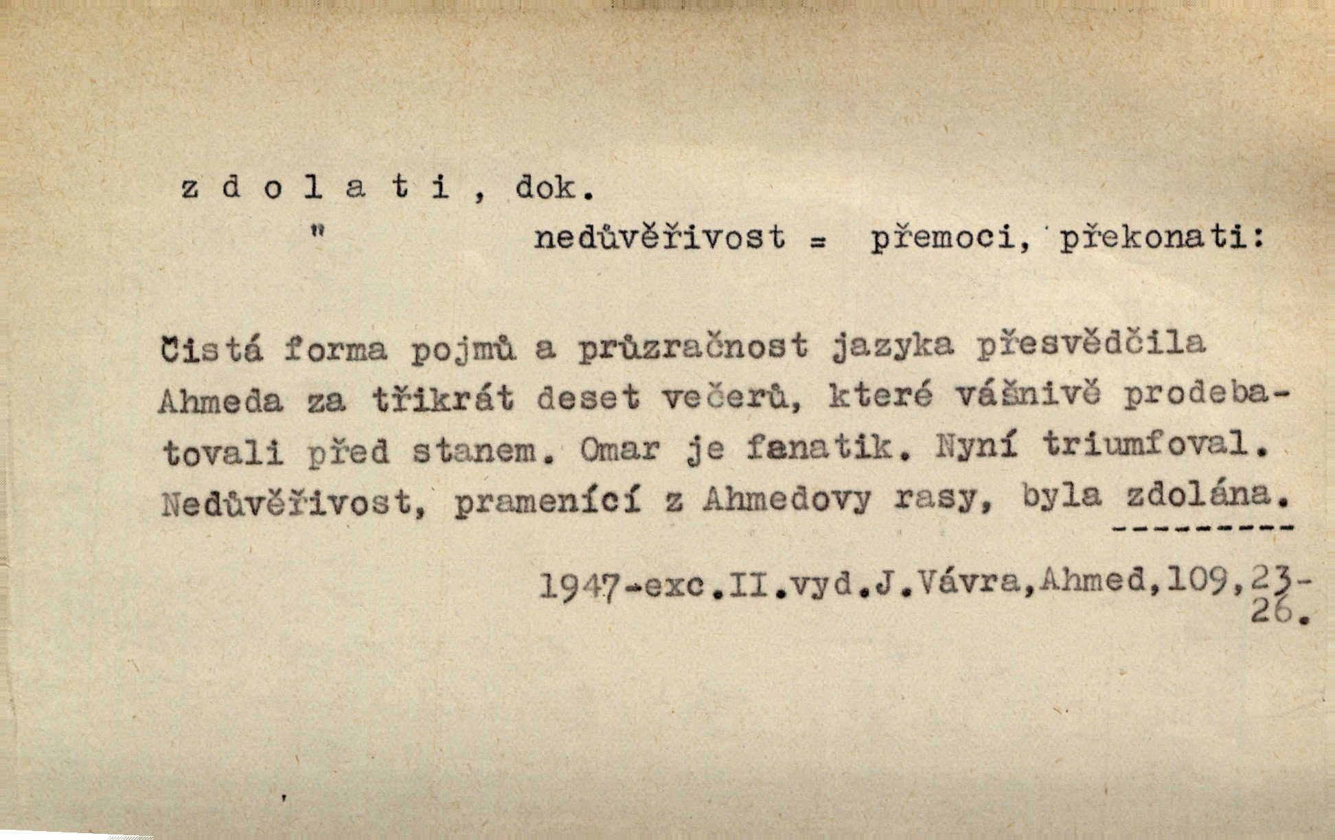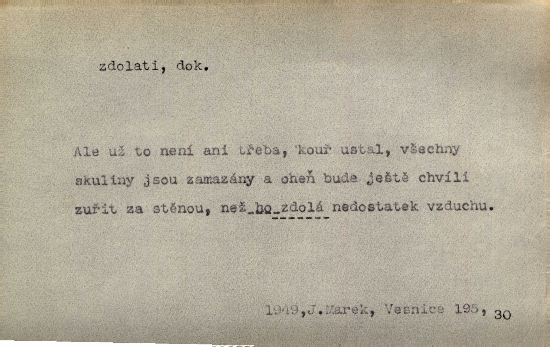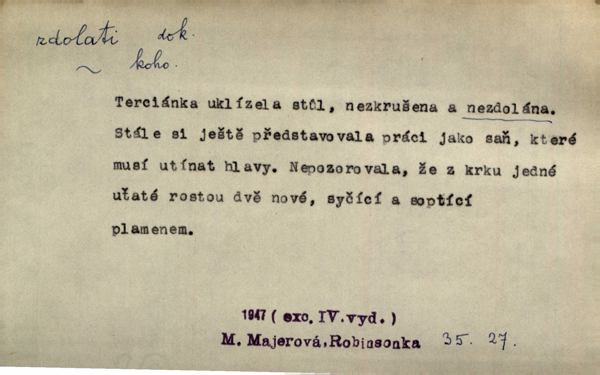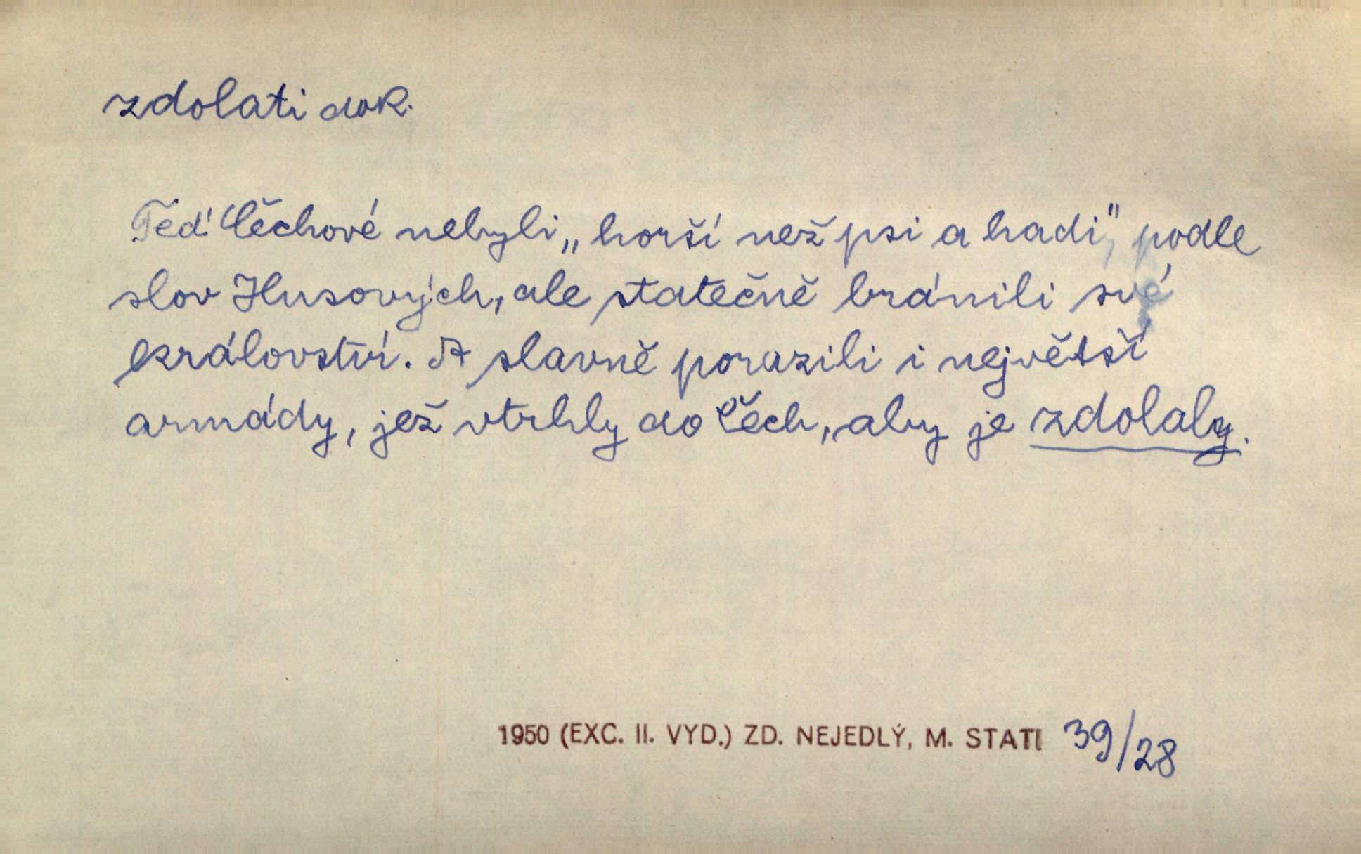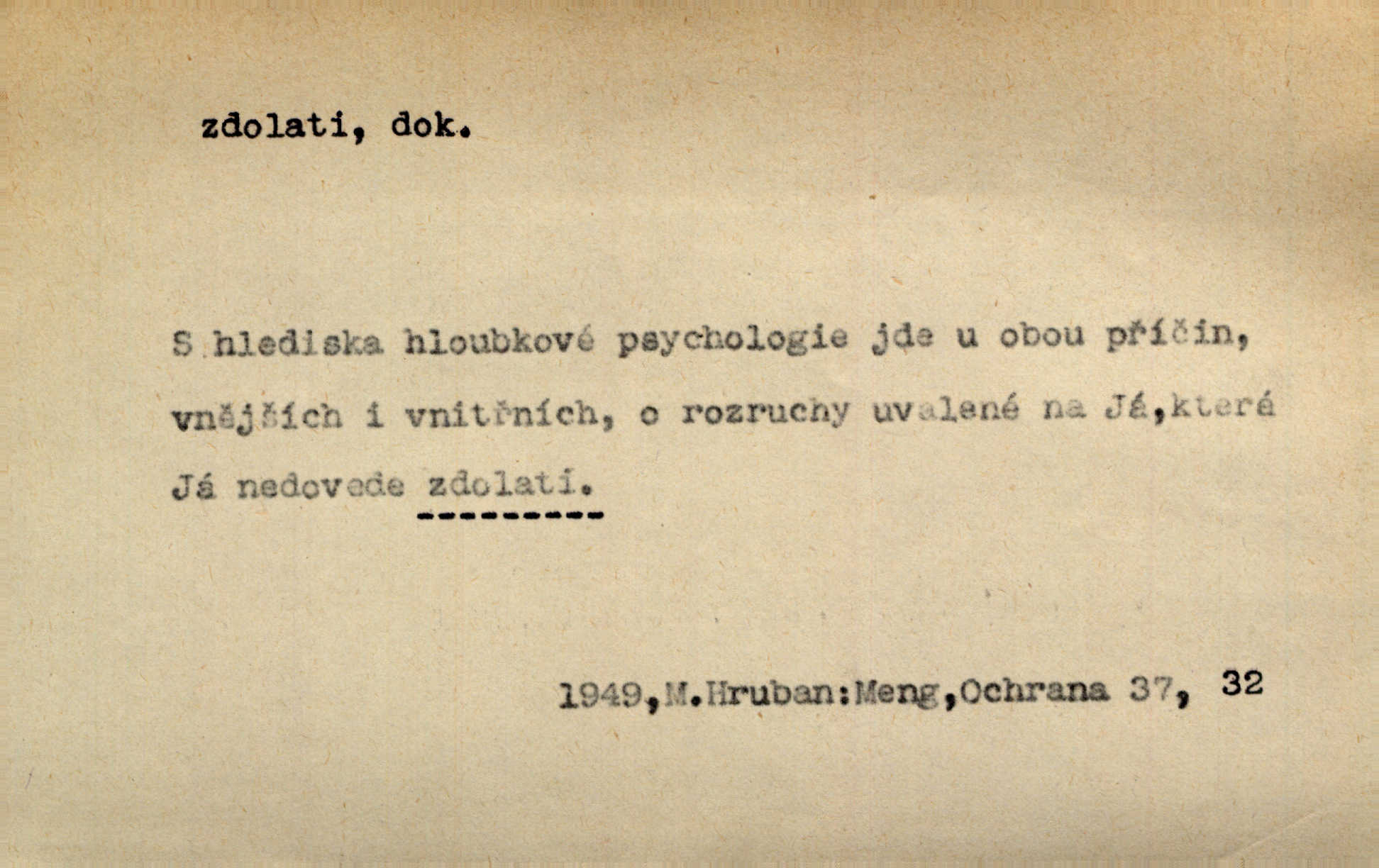 - zdolati dok. (koho, co) zmoci, přemoci někoho kladoucího odpor, silně se bránícího, překonati něco obtížného, přemoci. Nic nedovedlo ho zdolati; nezdar byl mu vzpruhou. Dyk. K jaru počal zvadat a konečně dva záchvaty chrlení krve ho zdolaly; při druhém vydechl. Rais. Žár, pochod, prach silnice nezdolaly jeho živost a dobrou náladu. Mach. Pouto, které pojí duši mou a duši tvoji, žádná síla nezdolá. Čech. Celá záležitost je pro něho [detektiva] jen osobní výkon a styděl by se, kdyby měl zdolati zločince hrubou organisovanou přesilou. K. Čap. Naše [sovětská] vojska, zdolavše silný nepřátelský odpor, prorazila japonskou linii. R. právo. Přímým útokem branné moci nebyly staroměstské hradby nikdy zdolány. Bass. Nelze počítat s tím, že by je [požáry] stačila zdolat normální mírová služba. Pouč. let. Schody tohoto druhého poschodí bylo třeba zdolati jako ostře stoupající vrch. Olb. Modrachová zdolala výšku 153 cm na druhý pokus. R. právo. D (čemu) zast. odolati něčemu. Kdo sladkému vyznání lásky zdolá? Hál. On lákavému slibu nezdolal. Krás. Když spatřil krví zalité lány, hetman, ach, slz se zdržet nezdolal. Vym. Horn. přímé zdolání ohňů a záparů druh zmáhání ohňů malého rozsahu, při němž se postižené zásoby uhlí obvykle ochladí vodou a rychle odtěží.