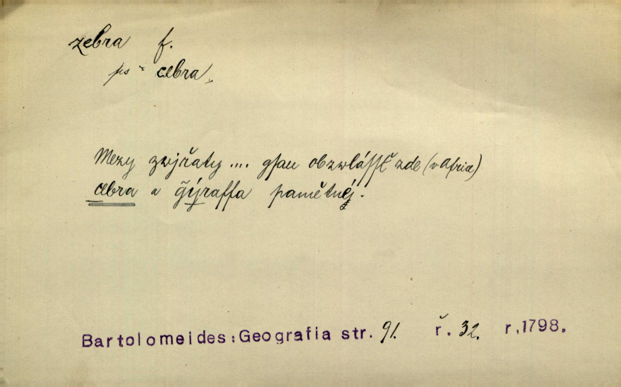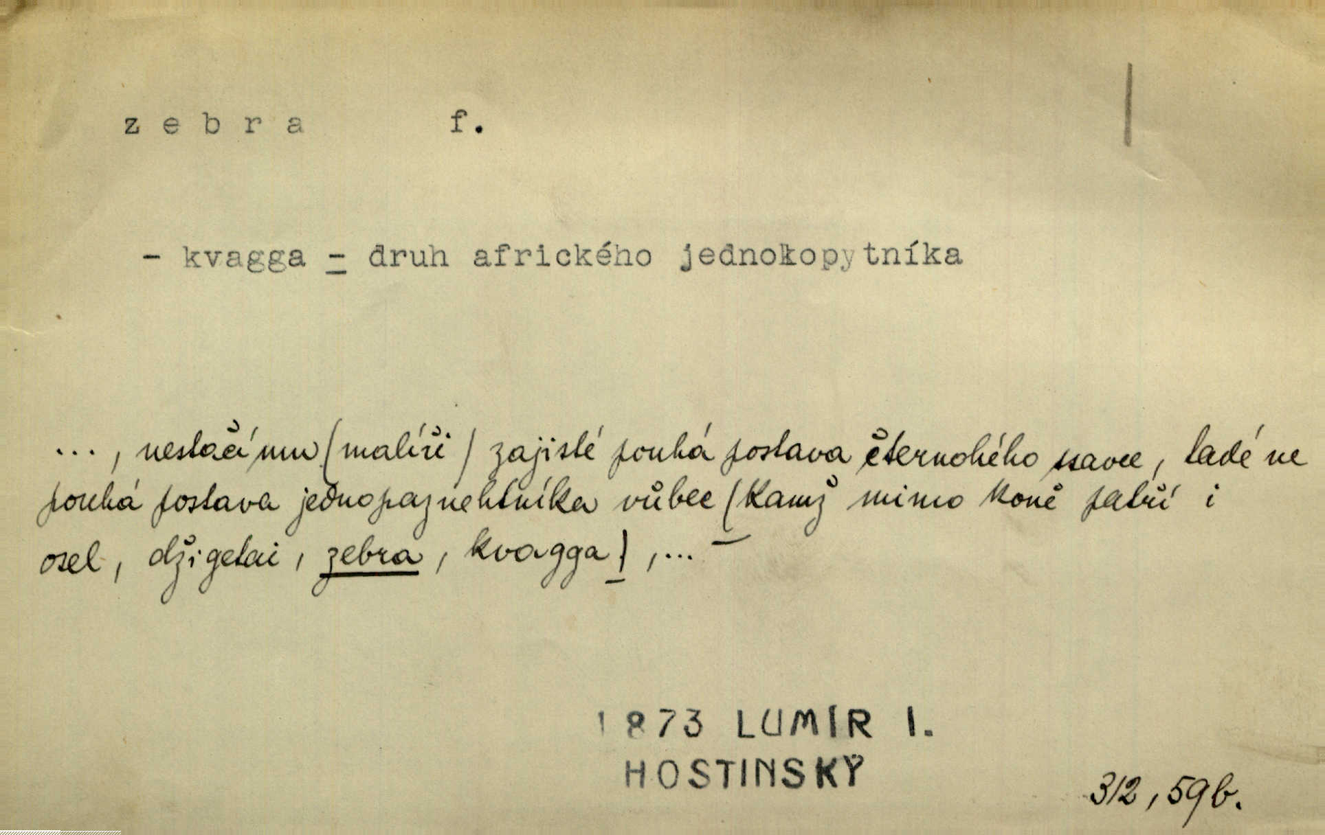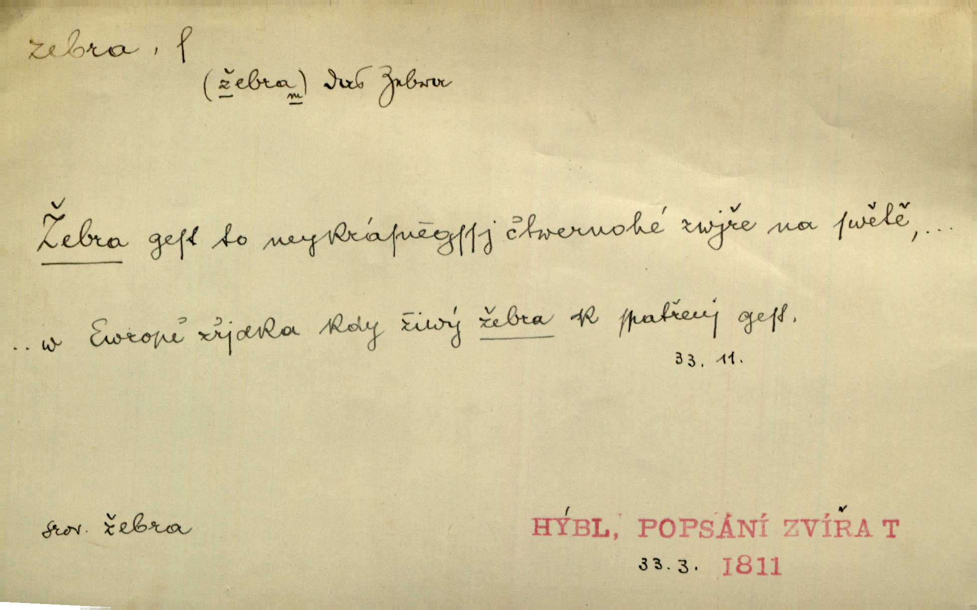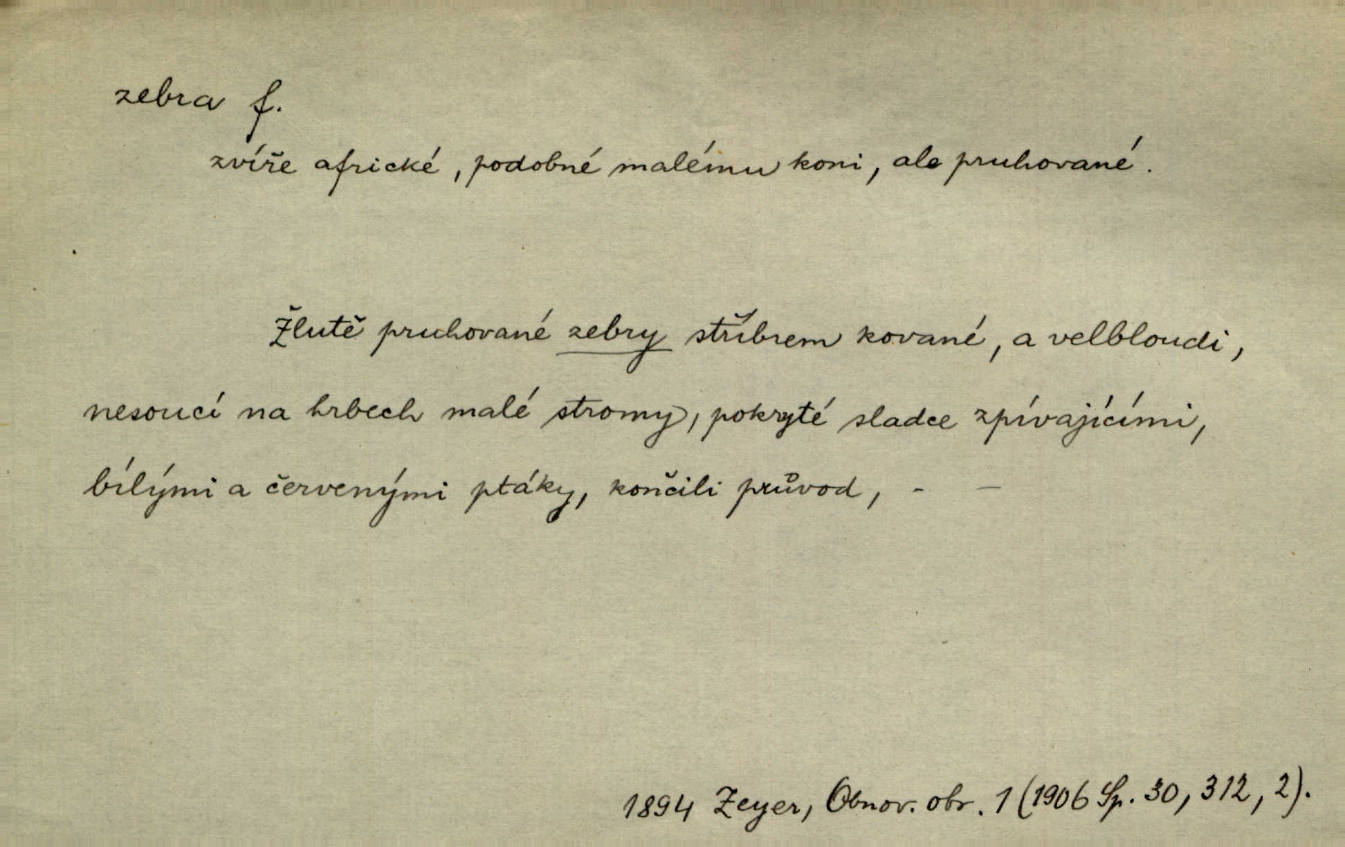 - zebra, -y f. africký kopytnatec černě a žlutě pruhovaný. Žlutě pruhované zebry a velbloudi končili průvod. Zey. Podíval jsem se na její šat, jenž vypadal jako pruhovaná kůže africké zebry. Ner. Zool. druh ssavců z čeledi Equidae, Equus zebra. D Obch. zebrové dřevo.