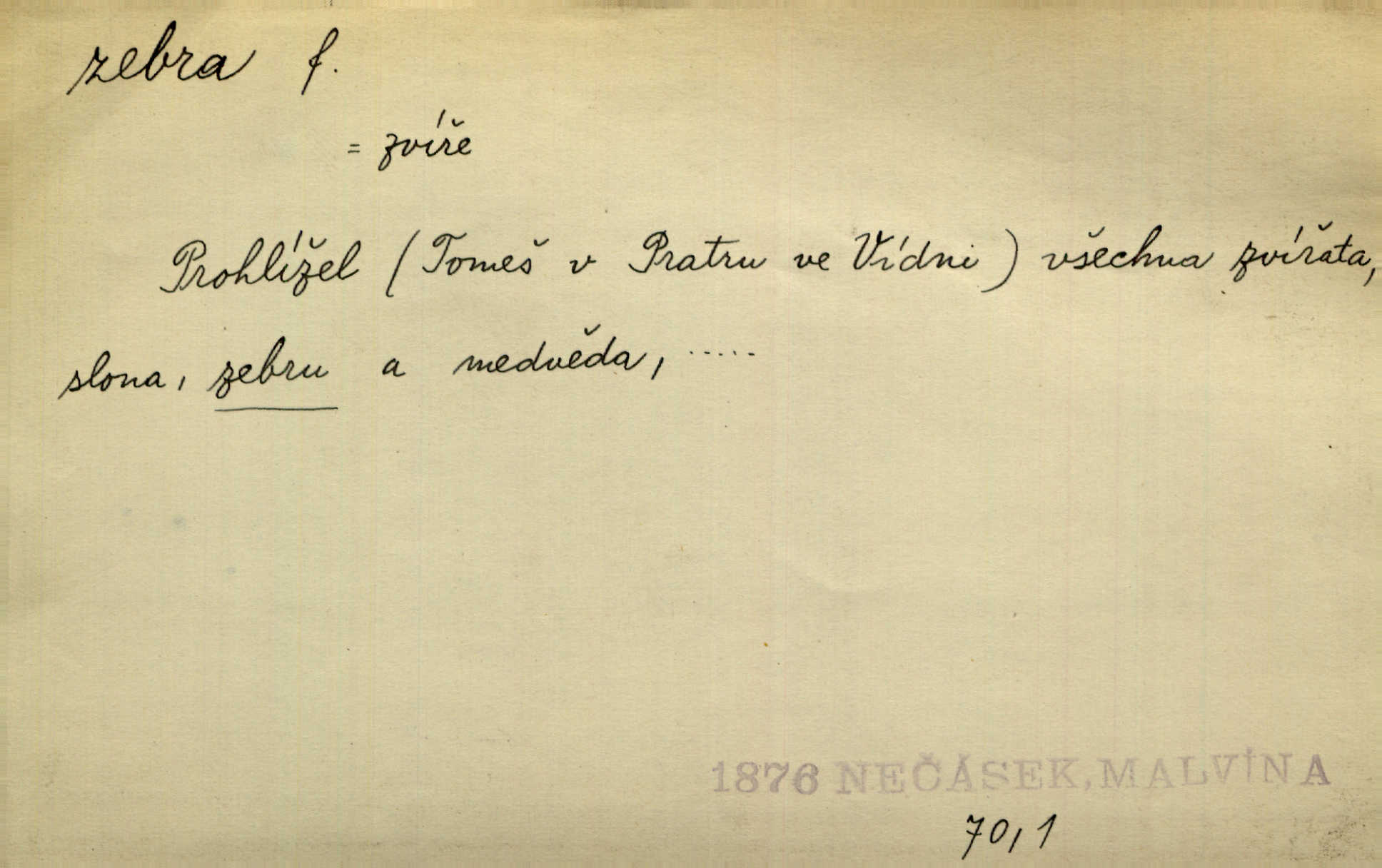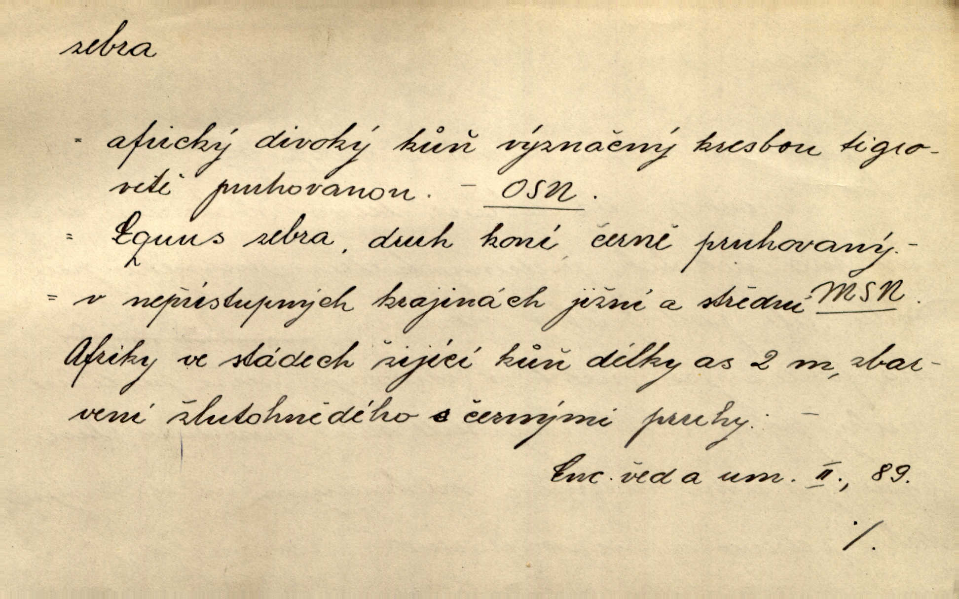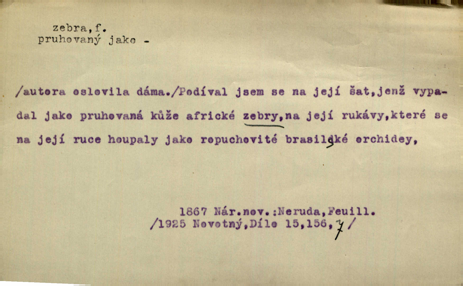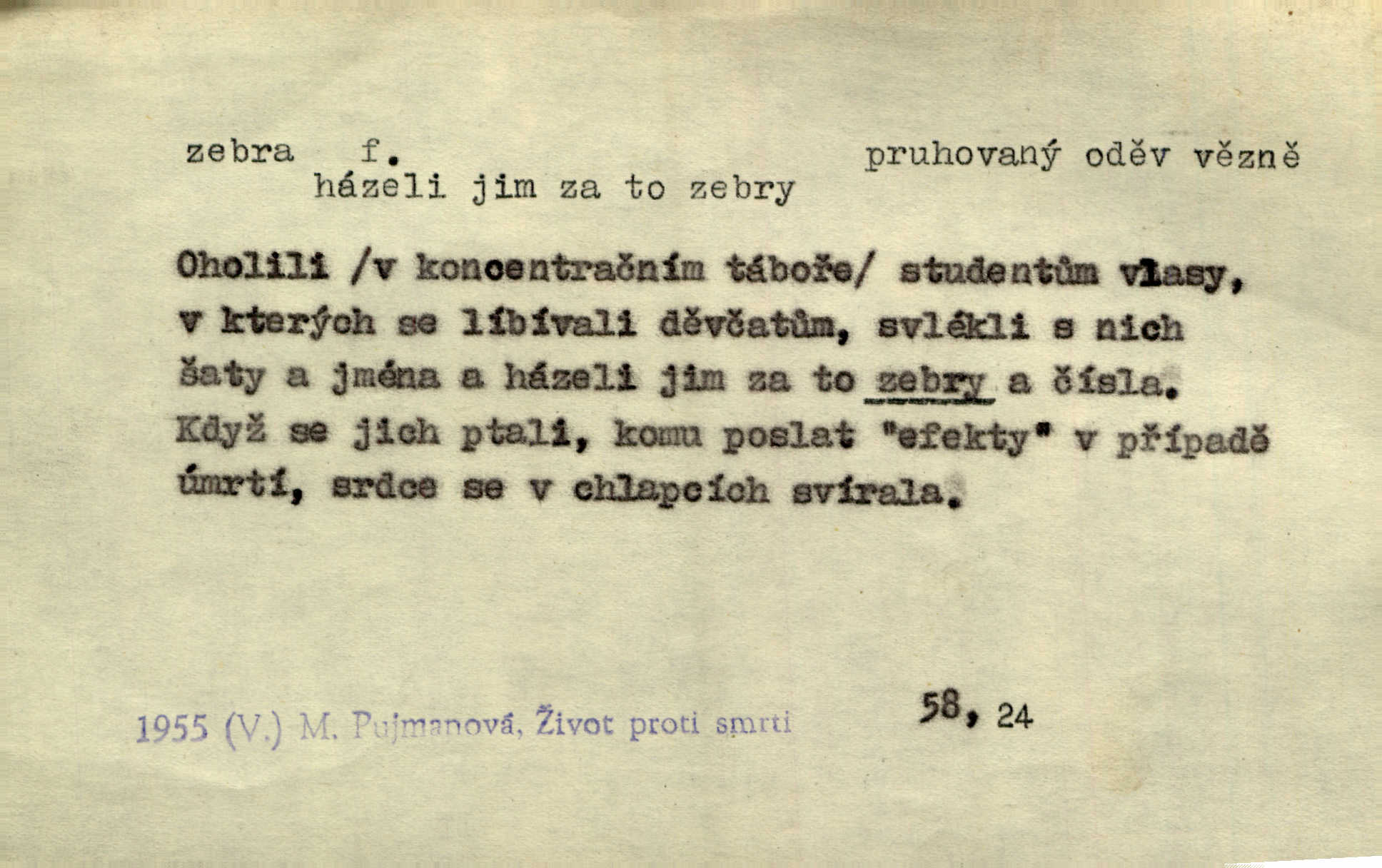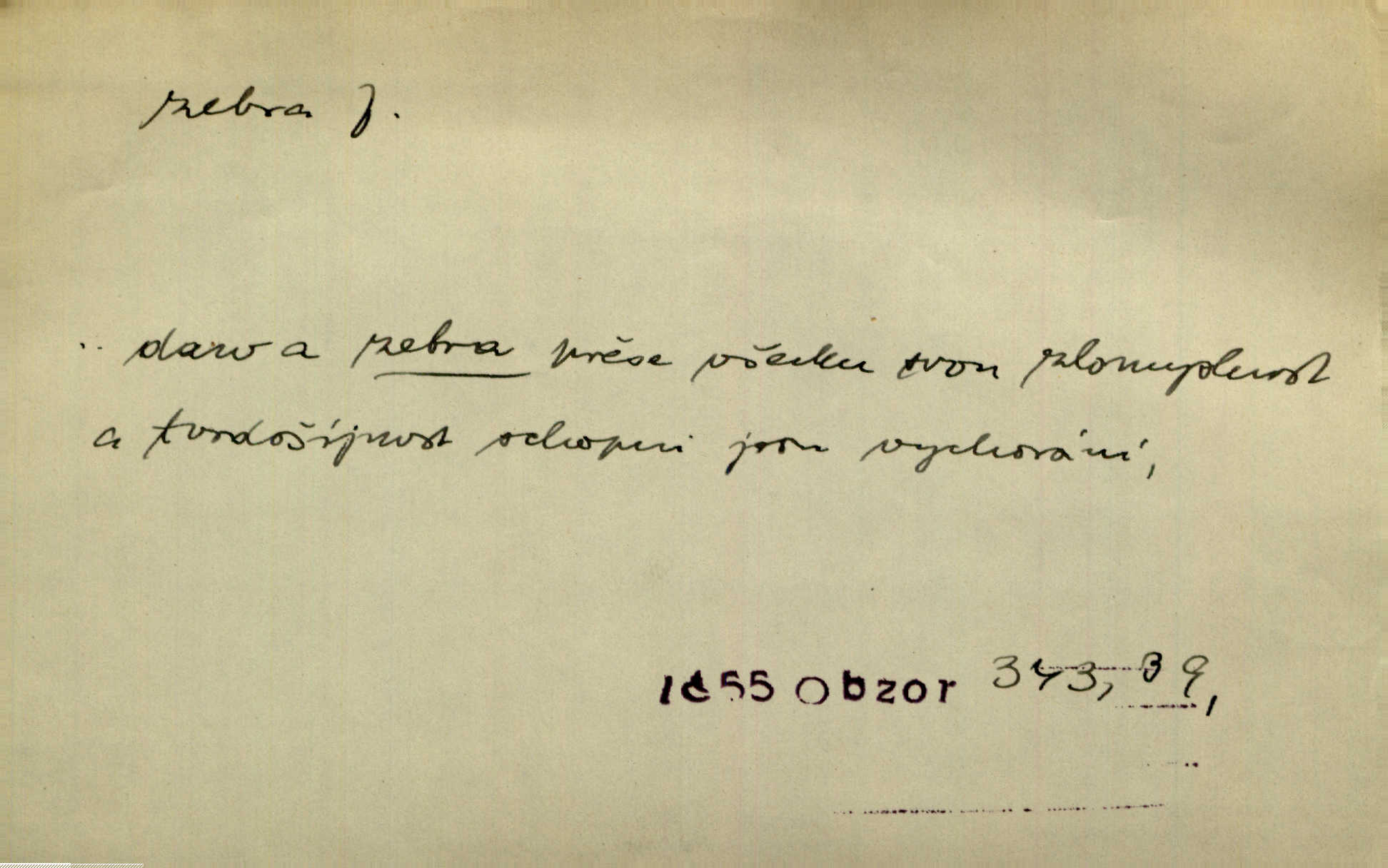 - zebra, -y f. africký kopytnatec černě a žlutě pruhovaný. Žlutě pruhované zebry a velbloudi končili průvod. Zey. Podíval jsem se na její šat, jenž vypadal jako pruhovaná kůže africké zebry. Ner. Zool. druh ssavců z čeledi Equidae, Equus zebra. D Obch. zebrové dřevo.