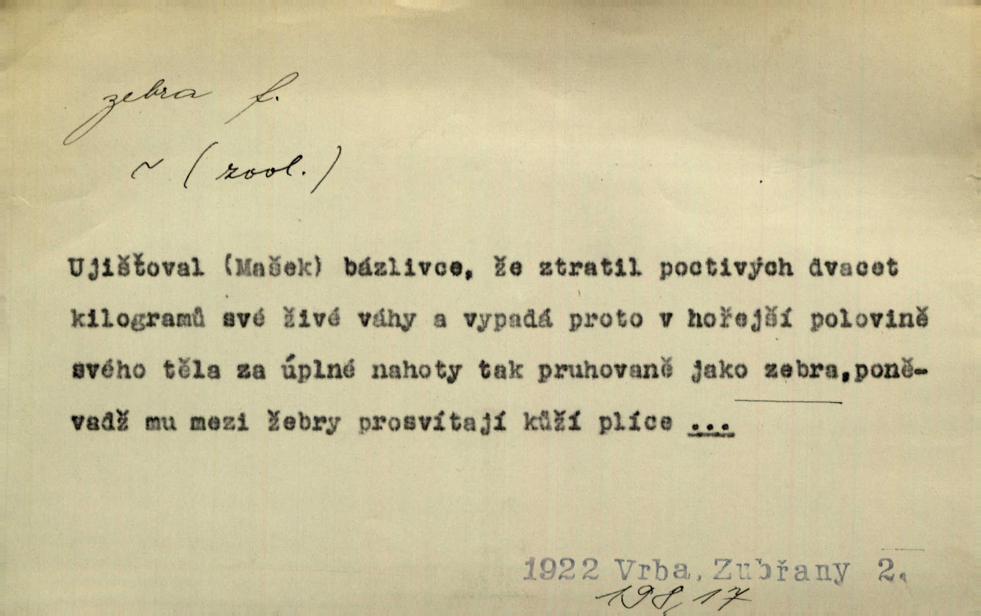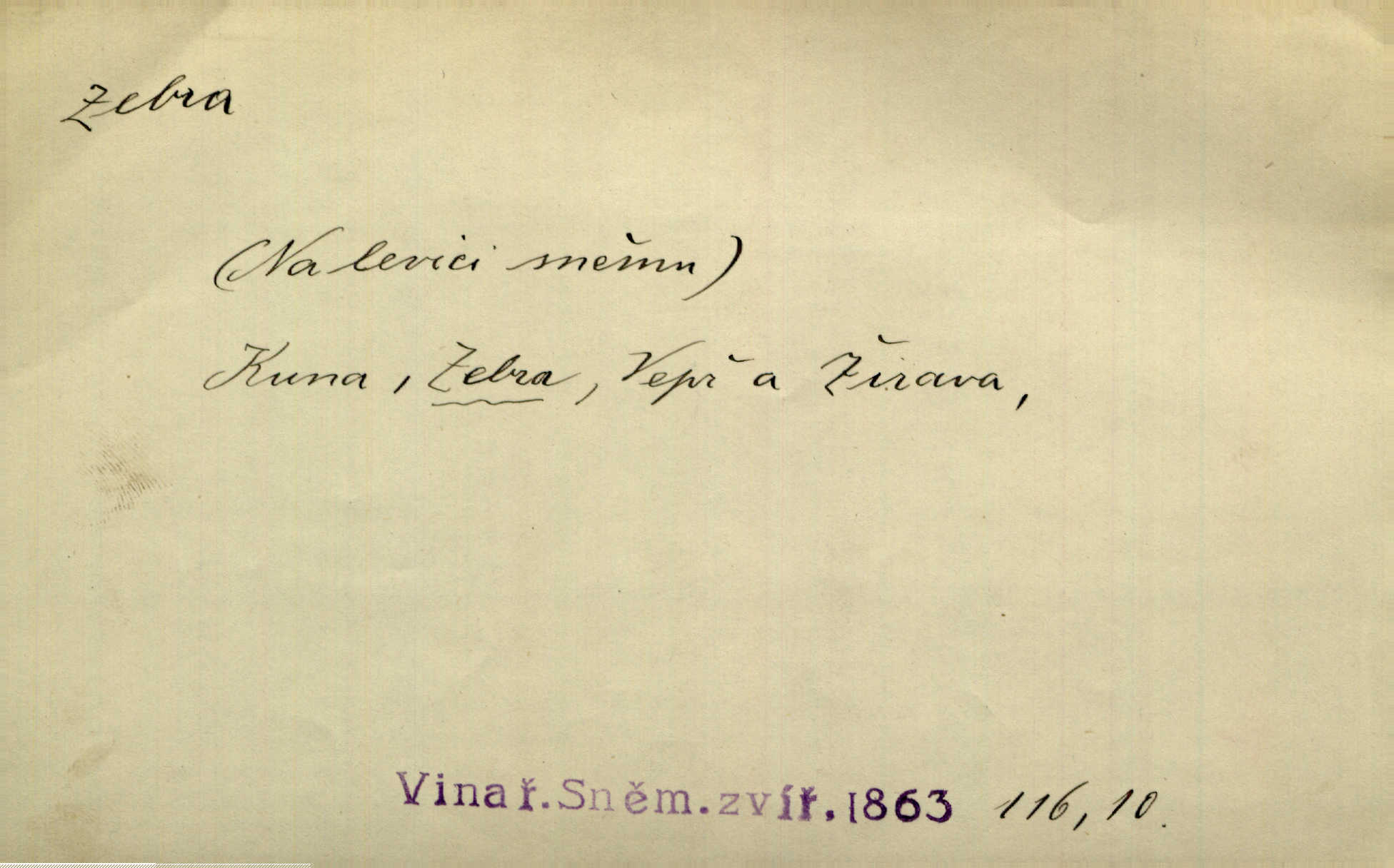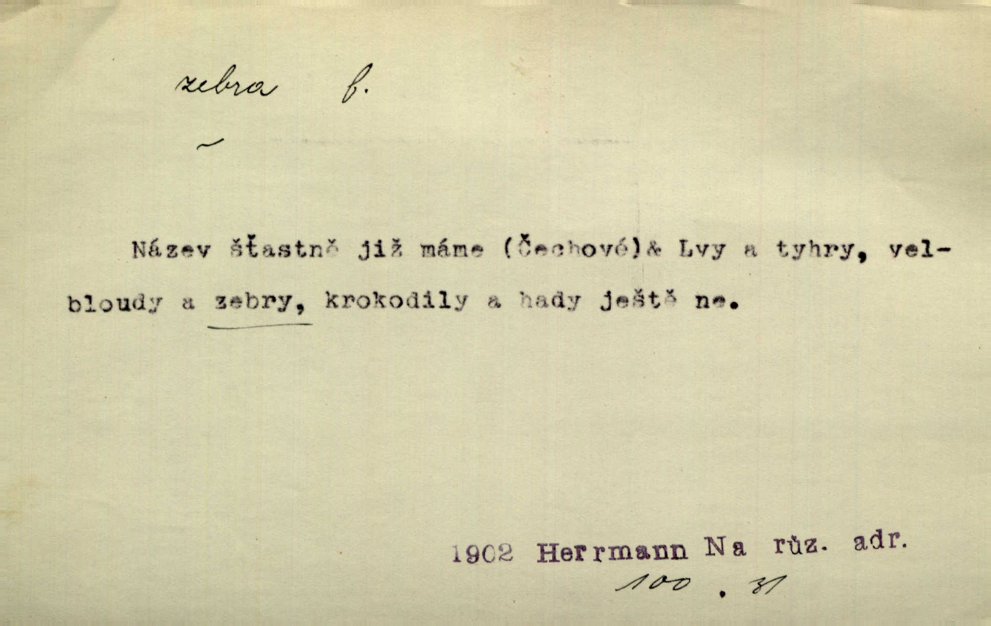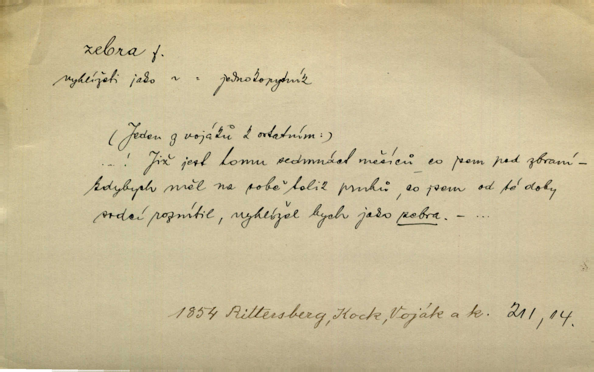 - zebra, -y f. africký kopytnatec černě a žlutě pruhovaný. Žlutě pruhované zebry a velbloudi končili průvod. Zey. Podíval jsem se na její šat, jenž vypadal jako pruhovaná kůže africké zebry. Ner. Zool. druh ssavců z čeledi Equidae, Equus zebra. D Obch. zebrové dřevo.