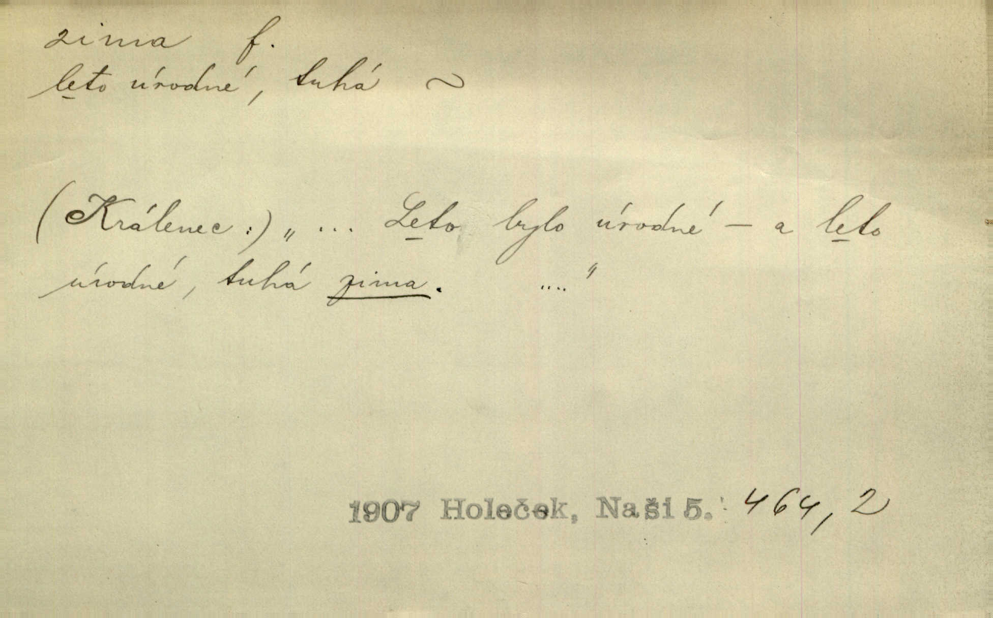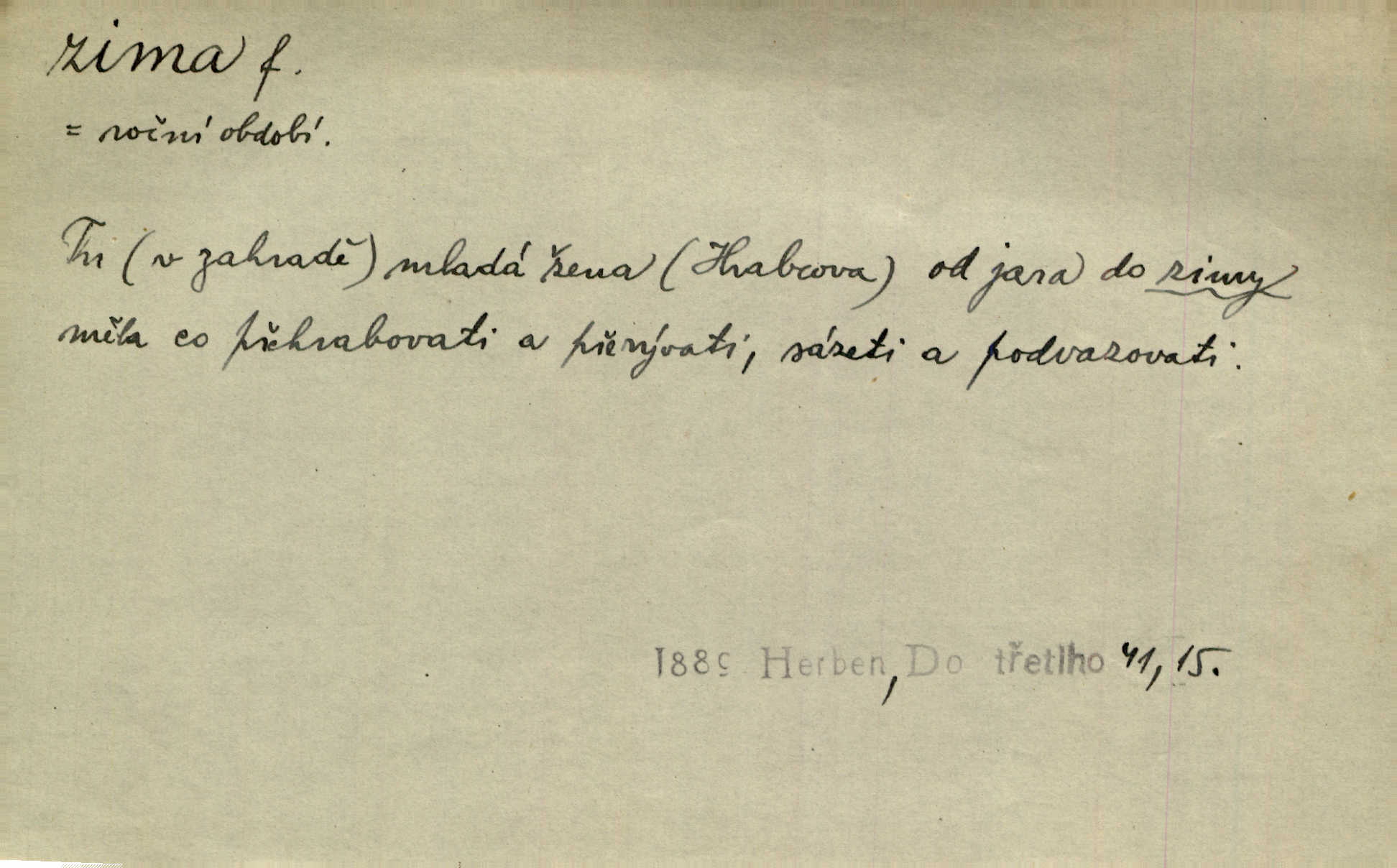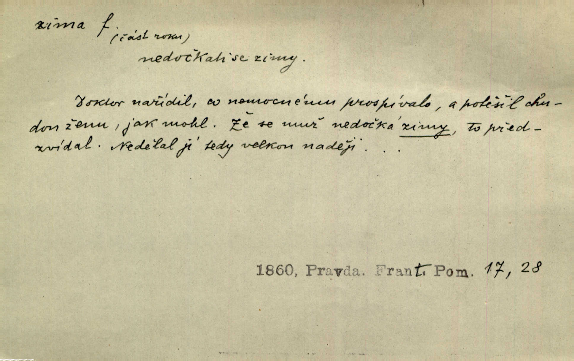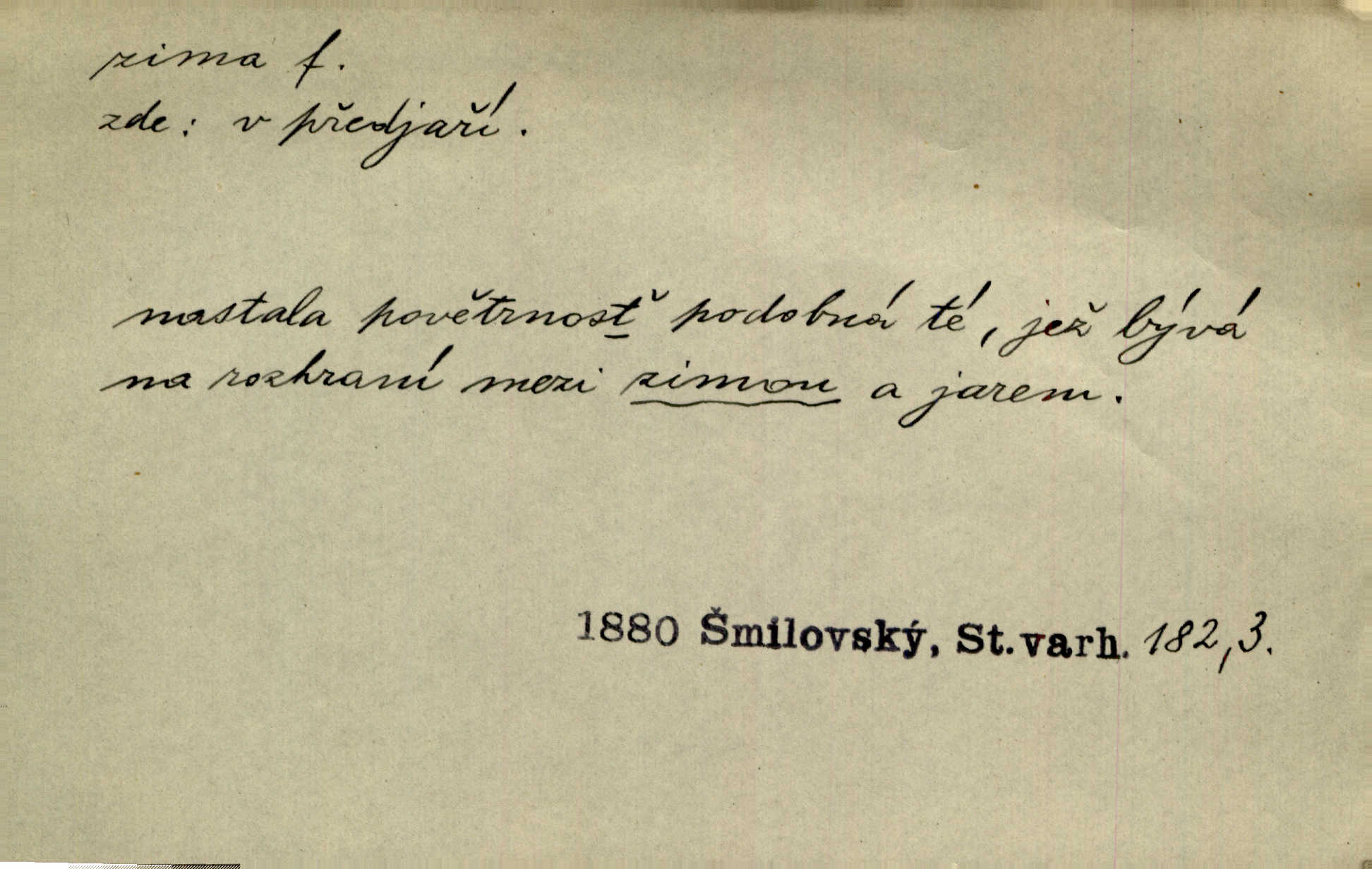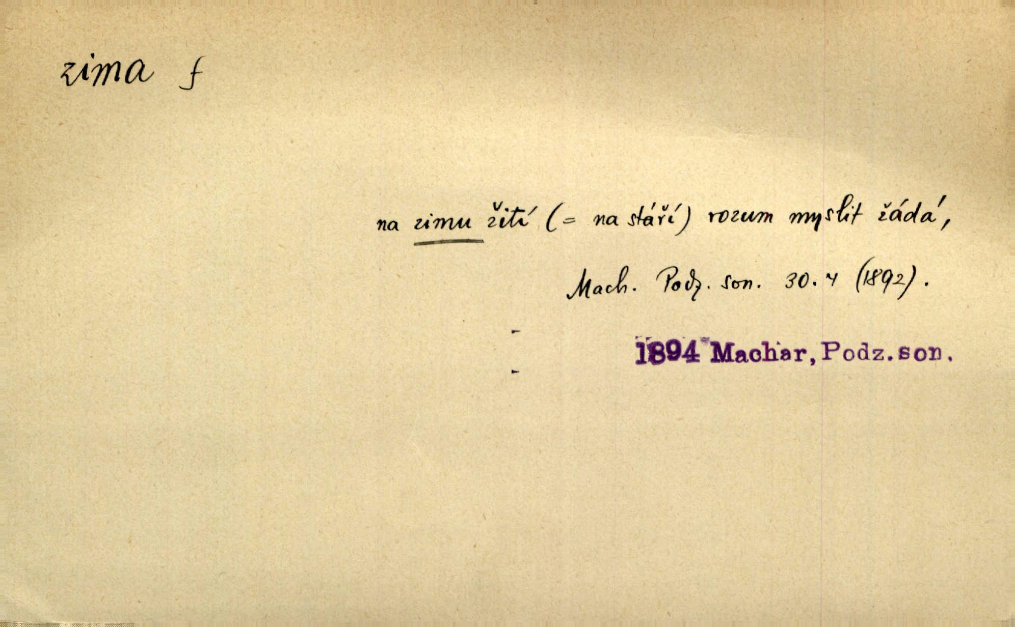 - zima (dial. zejma), -y f. chlad, studeno, chladno. Byla přímo prosincová zima. Mach. Zima venku povolila. Čech. Pracujeme od rána do večera, snášíme horko a zimu. Prav. Křesťanské to nebylo od Tebe, přítele vyhodit do zimy. Ner. Voda zimou křehne v led. V. Šaf. Opička u Skutče zimou pošla. John. Bylo [kuře] celé zmoklé, třáslo se zimou a típalo. Erb. Napřed [byly] veliké zimy a sníh, potom moc vody. Herb. Tomášovi jako by zima za nehty zalézala. Mah. Přen. Chvěla se o každý dnešek proto, že se nějak instinktem bála ještě větší zimy a ještě dutější prázdnoty příštího života životních nesnází. R. Svob. D Zima starší lid. (v lidových představách) zosobnění zimy, smrt, Morana. Bylo před velikonocemi, týden již, co odnesla chasa smrt čili zimu ze vsi. Něm. D zima dial. horečka, zimnice. Tak mně jaksi zima drobí. Kosm. Caromejku rozklepala zima. Rais. Z té lítosti a slabosti zdrobila Borišku zima. Preis. Do mne se dává zima. Just. Zuby mi cvakaly zimou vnitřní. Svět. D část kalendářního roku, roční doba (na severní polokouli) od 21. prosince do 21. března. V létě vstávala babička ve čtyry, v zimě v pět hodin. Něm. Byl po celou zimu s nejsilnějšími soudruhy hluboko v horách. Svět. Minuly vánoce, i zejma minula. Staš. Nastala povětrnosť podobná té, jež bývá na rozhraní mezi zimou a jarem. Šmil. Stará chodila v zimě do lesa na dříví. Erb. Každý podruh si na zimu zabije aspoň dva krmníky. Rais. Odešla od něho — budou tomu na zimu dvě léta. Šim. Ještě nebožtíka ani jedna zima sněhem nepokryla, a já že už zase chystám rozmarín. Pitt. Leto úrodné, tuhá zima. Hol. Šimona Judy — zima je tudy. Pořek. Hustý kožich je zaječí, zima bývá největší! Hol. Prázdná-li stodola v zimě, na jaře je nouze Havl. Potácela se jako moucha po zimě. Baar. Přece tam [na samotě] bylo velice mnoho radostí v zimě v létě stále. Něm. V zimě v letě nosíval na hlavě šedivou beranici. Sab. Když už s člověkem začíná zima rozprávět, přejdou chuti na toulky stárne. Rais. Přen. V modlitbách a zbožném rozjímání trávili tam [starci] zimu života! stáří. Čech. Dnes na konci své zimy netoužím leda po svém Soudci. Mus. A šel [stařec]‚ byl vážný dnes, víc jeho vlas měl zimy šedin. Klášt. D Lid. rok. Pravili mi, že ta válka již čtyřicet zim trvala. Kram.