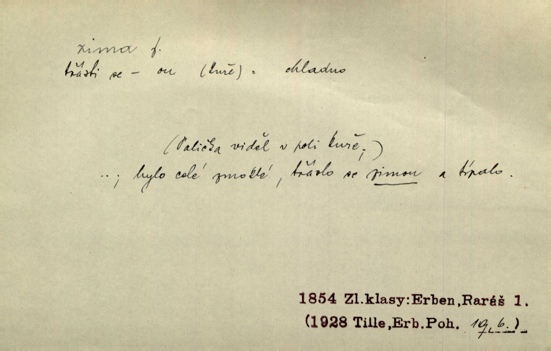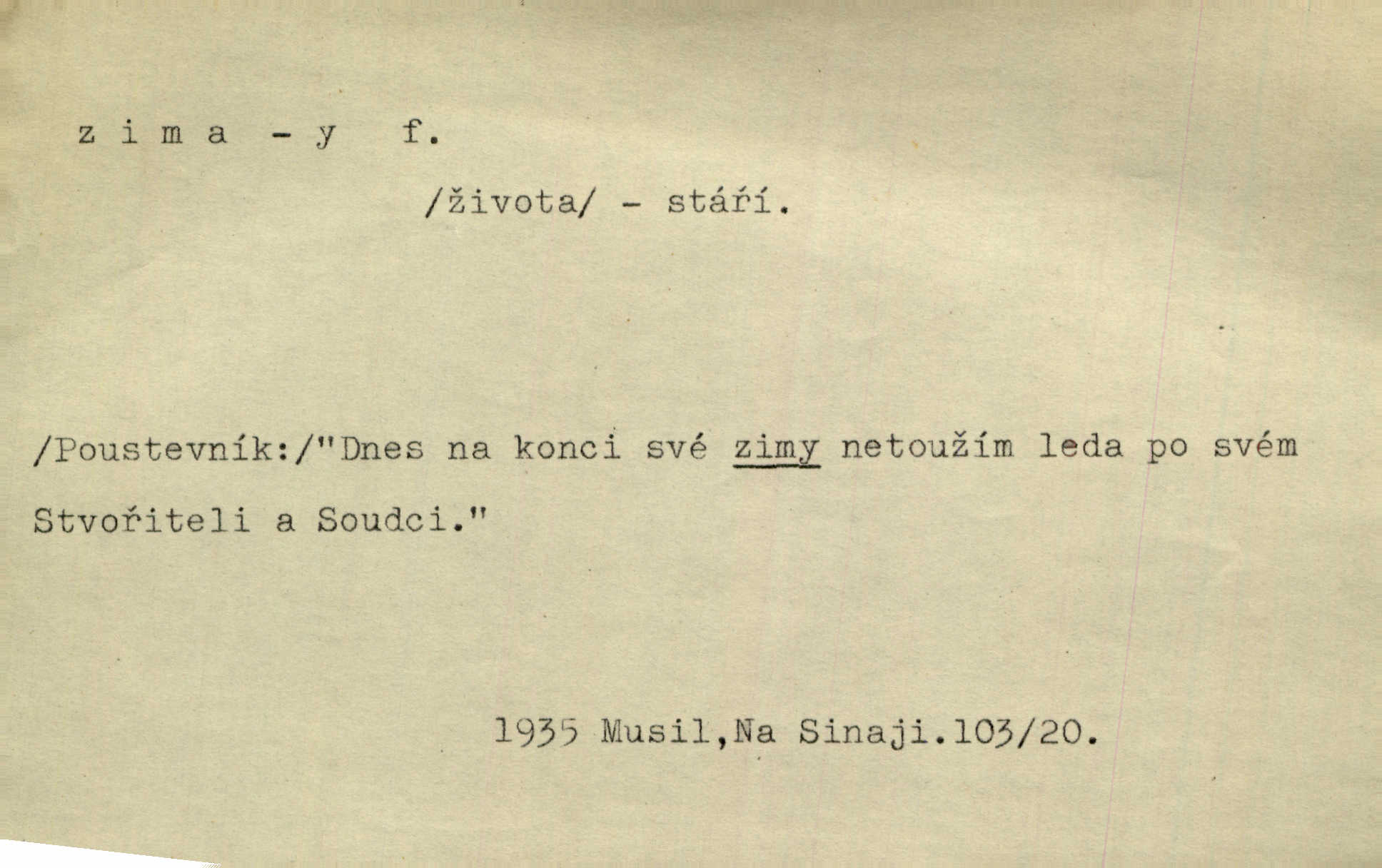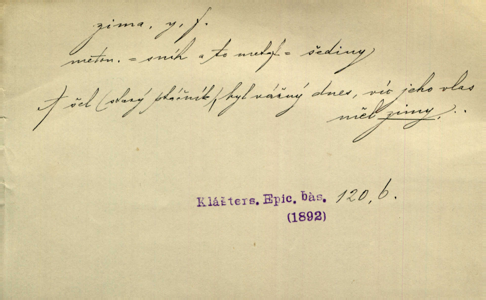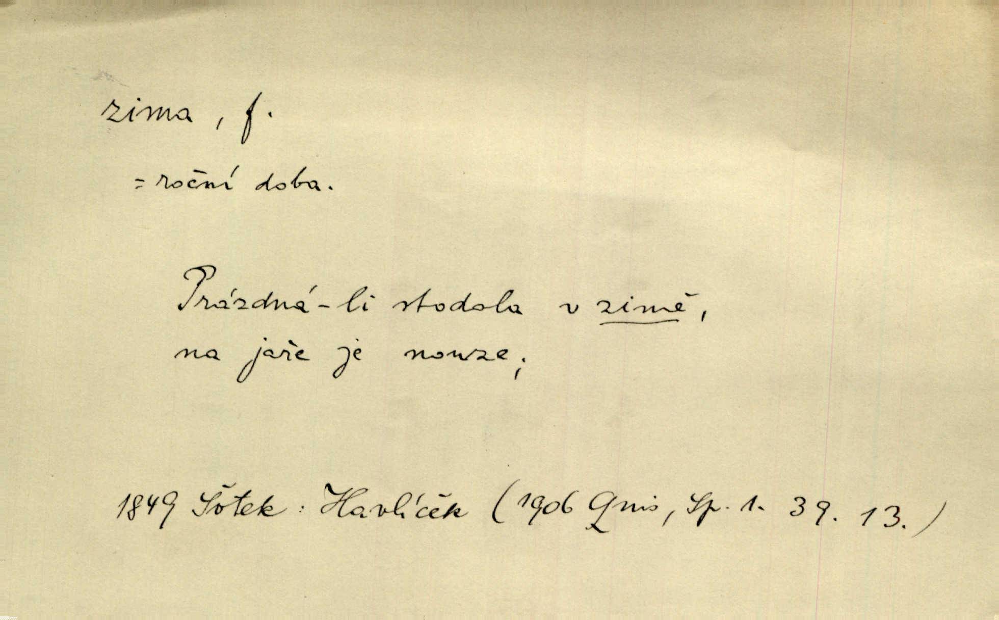 - zima (dial. zejma), -y f. chlad, studeno, chladno. Byla přímo prosincová zima. Mach. Zima venku povolila. Čech. Pracujeme od rána do večera, snášíme horko a zimu. Prav. Křesťanské to nebylo od Tebe, přítele vyhodit do zimy. Ner. Voda zimou křehne v led. V. Šaf. Opička u Skutče zimou pošla. John. Bylo [kuře] celé zmoklé, třáslo se zimou a típalo. Erb. Napřed [byly] veliké zimy a sníh, potom moc vody. Herb. Tomášovi jako by zima za nehty zalézala. Mah. Přen. Chvěla se o každý dnešek proto, že se nějak instinktem bála ještě větší zimy a ještě dutější prázdnoty příštího života životních nesnází. R. Svob. D Zima starší lid. (v lidových představách) zosobnění zimy, smrt, Morana. Bylo před velikonocemi, týden již, co odnesla chasa smrt čili zimu ze vsi. Něm. D zima dial. horečka, zimnice. Tak mně jaksi zima drobí. Kosm. Caromejku rozklepala zima. Rais. Z té lítosti a slabosti zdrobila Borišku zima. Preis. Do mne se dává zima. Just. Zuby mi cvakaly zimou vnitřní. Svět. D část kalendářního roku, roční doba (na severní polokouli) od 21. prosince do 21. března. V létě vstávala babička ve čtyry, v zimě v pět hodin. Něm. Byl po celou zimu s nejsilnějšími soudruhy hluboko v horách. Svět. Minuly vánoce, i zejma minula. Staš. Nastala povětrnosť podobná té, jež bývá na rozhraní mezi zimou a jarem. Šmil. Stará chodila v zimě do lesa na dříví. Erb. Každý podruh si na zimu zabije aspoň dva krmníky. Rais. Odešla od něho — budou tomu na zimu dvě léta. Šim. Ještě nebožtíka ani jedna zima sněhem nepokryla, a já že už zase chystám rozmarín. Pitt. Leto úrodné, tuhá zima. Hol. Šimona Judy — zima je tudy. Pořek. Hustý kožich je zaječí, zima bývá největší! Hol. Prázdná-li stodola v zimě, na jaře je nouze Havl. Potácela se jako moucha po zimě. Baar. Přece tam [na samotě] bylo velice mnoho radostí v zimě v létě stále. Něm. V zimě v letě nosíval na hlavě šedivou beranici. Sab. Když už s člověkem začíná zima rozprávět, přejdou chuti na toulky stárne. Rais. Přen. V modlitbách a zbožném rozjímání trávili tam [starci] zimu života! stáří. Čech. Dnes na konci své zimy netoužím leda po svém Soudci. Mus. A šel [stařec]‚ byl vážný dnes, víc jeho vlas měl zimy šedin. Klášt. D Lid. rok. Pravili mi, že ta válka již čtyřicet zim trvala. Kram.