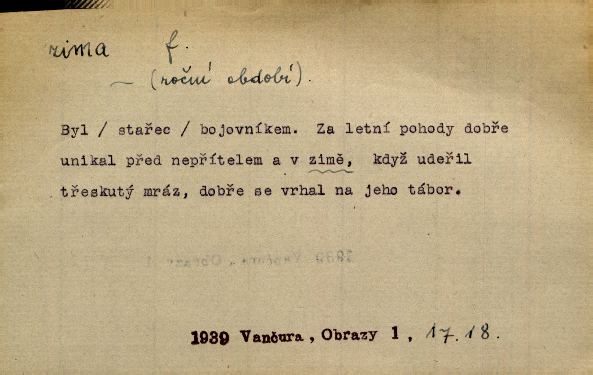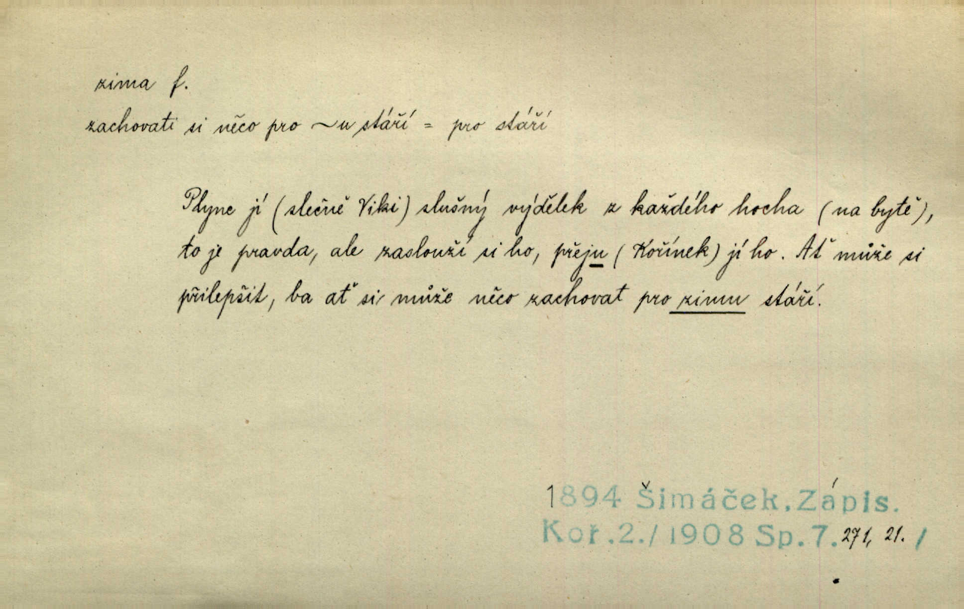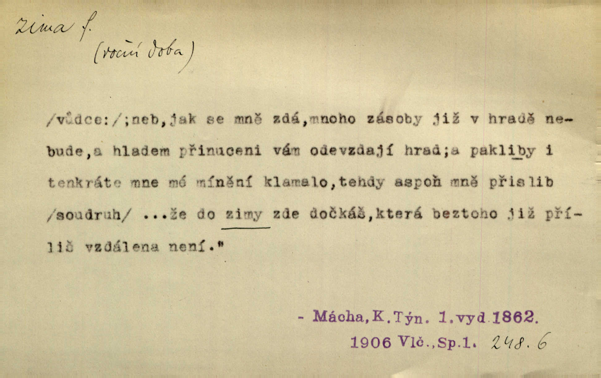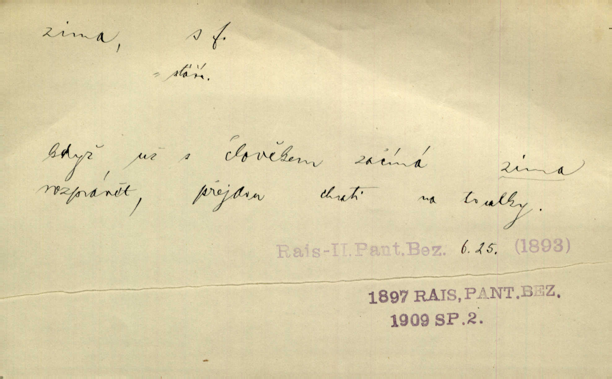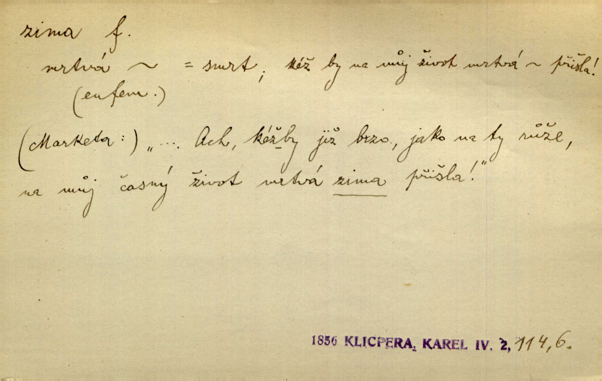 - zima (dial. zejma), -y f. chlad, studeno, chladno. Byla přímo prosincová zima. Mach. Zima venku povolila. Čech. Pracujeme od rána do večera, snášíme horko a zimu. Prav. Křesťanské to nebylo od Tebe, přítele vyhodit do zimy. Ner. Voda zimou křehne v led. V. Šaf. Opička u Skutče zimou pošla. John. Bylo [kuře] celé zmoklé, třáslo se zimou a típalo. Erb. Napřed [byly] veliké zimy a sníh, potom moc vody. Herb. Tomášovi jako by zima za nehty zalézala. Mah. Přen. Chvěla se o každý dnešek proto, že se nějak instinktem bála ještě větší zimy a ještě dutější prázdnoty příštího života životních nesnází. R. Svob. D Zima starší lid. (v lidových představách) zosobnění zimy, smrt, Morana. Bylo před velikonocemi, týden již, co odnesla chasa smrt čili zimu ze vsi. Něm. D zima dial. horečka, zimnice. Tak mně jaksi zima drobí. Kosm. Caromejku rozklepala zima. Rais. Z té lítosti a slabosti zdrobila Borišku zima. Preis. Do mne se dává zima. Just. Zuby mi cvakaly zimou vnitřní. Svět. D část kalendářního roku, roční doba (na severní polokouli) od 21. prosince do 21. března. V létě vstávala babička ve čtyry, v zimě v pět hodin. Něm. Byl po celou zimu s nejsilnějšími soudruhy hluboko v horách. Svět. Minuly vánoce, i zejma minula. Staš. Nastala povětrnosť podobná té, jež bývá na rozhraní mezi zimou a jarem. Šmil. Stará chodila v zimě do lesa na dříví. Erb. Každý podruh si na zimu zabije aspoň dva krmníky. Rais. Odešla od něho — budou tomu na zimu dvě léta. Šim. Ještě nebožtíka ani jedna zima sněhem nepokryla, a já že už zase chystám rozmarín. Pitt. Leto úrodné, tuhá zima. Hol. Šimona Judy — zima je tudy. Pořek. Hustý kožich je zaječí, zima bývá největší! Hol. Prázdná-li stodola v zimě, na jaře je nouze Havl. Potácela se jako moucha po zimě. Baar. Přece tam [na samotě] bylo velice mnoho radostí v zimě v létě stále. Něm. V zimě v letě nosíval na hlavě šedivou beranici. Sab. Když už s člověkem začíná zima rozprávět, přejdou chuti na toulky stárne. Rais. Přen. V modlitbách a zbožném rozjímání trávili tam [starci] zimu života! stáří. Čech. Dnes na konci své zimy netoužím leda po svém Soudci. Mus. A šel [stařec]‚ byl vážný dnes, víc jeho vlas měl zimy šedin. Klášt. D Lid. rok. Pravili mi, že ta válka již čtyřicet zim trvala. Kram.