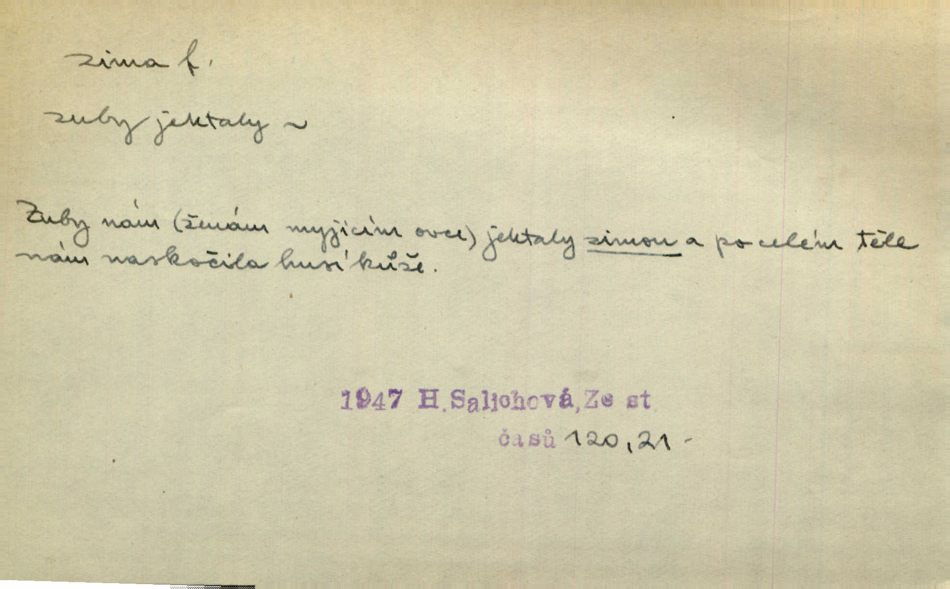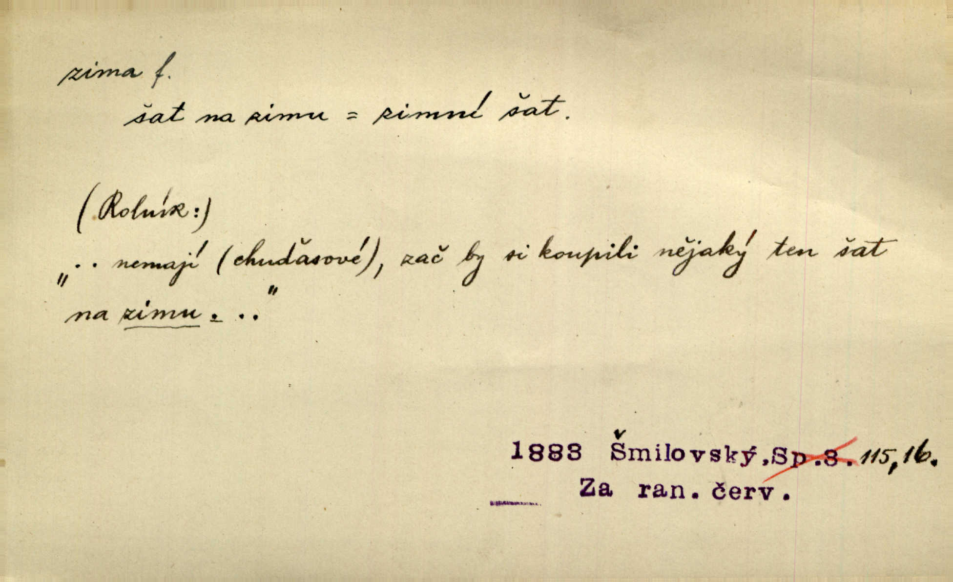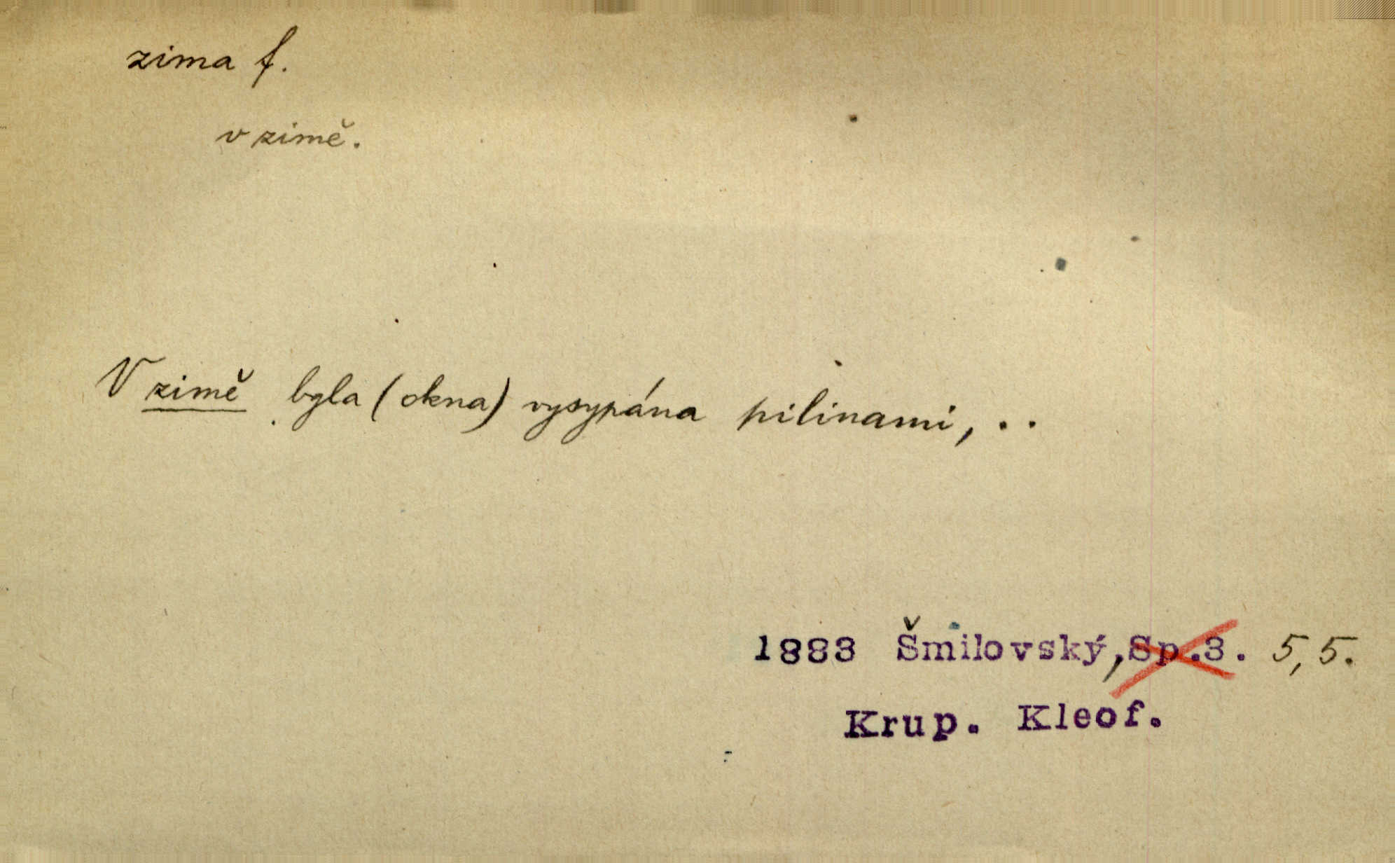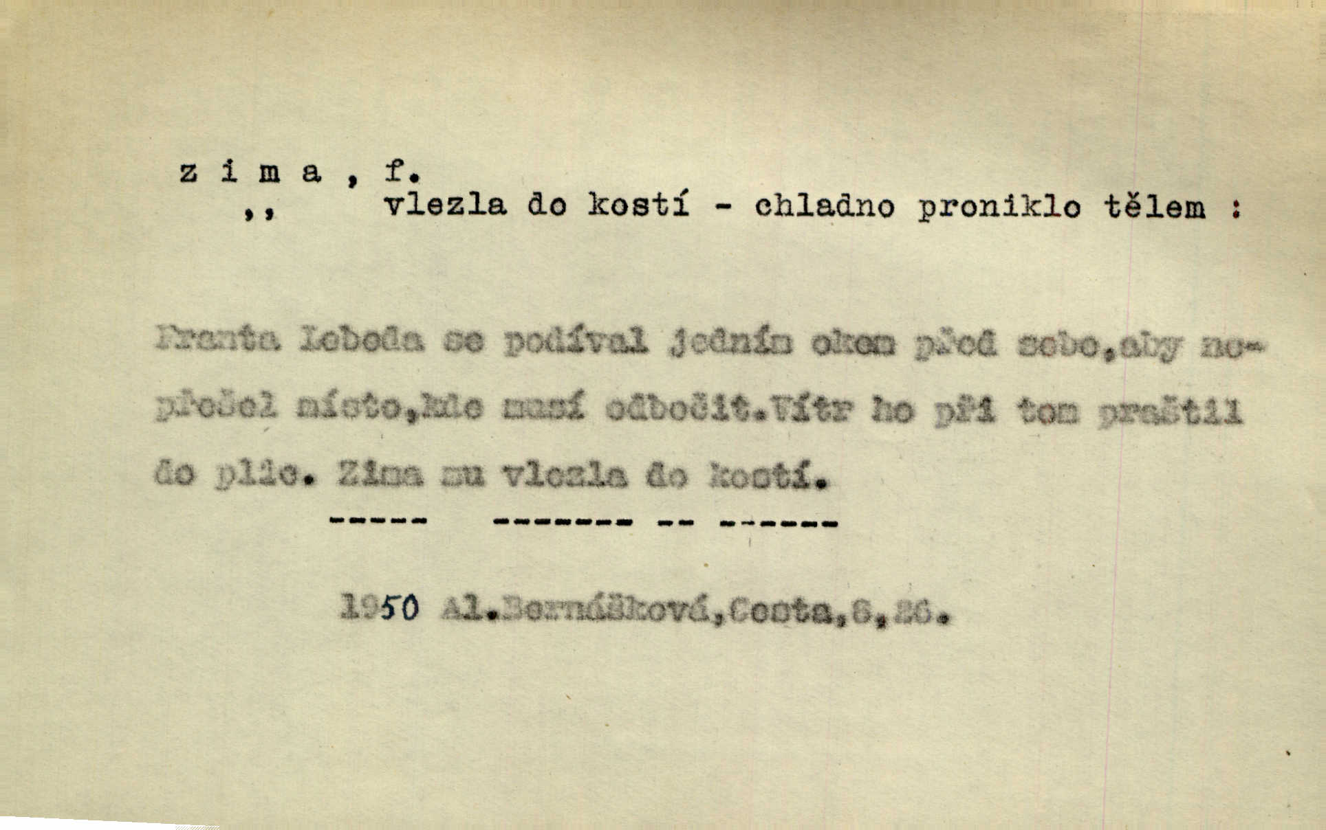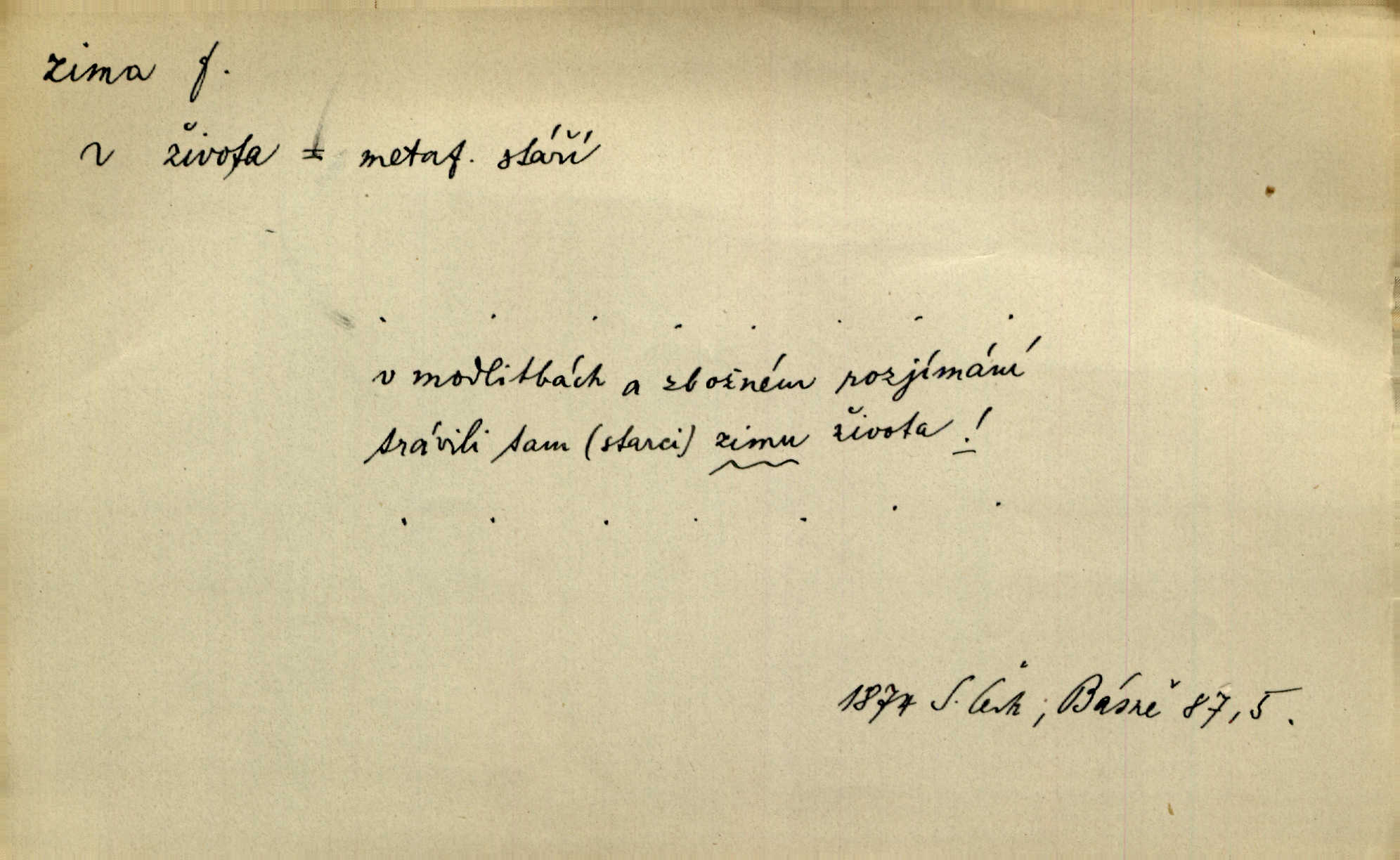 - zima (dial. zejma), -y f. chlad, studeno, chladno. Byla přímo prosincová zima. Mach. Zima venku povolila. Čech. Pracujeme od rána do večera, snášíme horko a zimu. Prav. Křesťanské to nebylo od Tebe, přítele vyhodit do zimy. Ner. Voda zimou křehne v led. V. Šaf. Opička u Skutče zimou pošla. John. Bylo [kuře] celé zmoklé, třáslo se zimou a típalo. Erb. Napřed [byly] veliké zimy a sníh, potom moc vody. Herb. Tomášovi jako by zima za nehty zalézala. Mah. Přen. Chvěla se o každý dnešek proto, že se nějak instinktem bála ještě větší zimy a ještě dutější prázdnoty příštího života životních nesnází. R. Svob. D Zima starší lid. (v lidových představách) zosobnění zimy, smrt, Morana. Bylo před velikonocemi, týden již, co odnesla chasa smrt čili zimu ze vsi. Něm. D zima dial. horečka, zimnice. Tak mně jaksi zima drobí. Kosm. Caromejku rozklepala zima. Rais. Z té lítosti a slabosti zdrobila Borišku zima. Preis. Do mne se dává zima. Just. Zuby mi cvakaly zimou vnitřní. Svět. D část kalendářního roku, roční doba (na severní polokouli) od 21. prosince do 21. března. V létě vstávala babička ve čtyry, v zimě v pět hodin. Něm. Byl po celou zimu s nejsilnějšími soudruhy hluboko v horách. Svět. Minuly vánoce, i zejma minula. Staš. Nastala povětrnosť podobná té, jež bývá na rozhraní mezi zimou a jarem. Šmil. Stará chodila v zimě do lesa na dříví. Erb. Každý podruh si na zimu zabije aspoň dva krmníky. Rais. Odešla od něho — budou tomu na zimu dvě léta. Šim. Ještě nebožtíka ani jedna zima sněhem nepokryla, a já že už zase chystám rozmarín. Pitt. Leto úrodné, tuhá zima. Hol. Šimona Judy — zima je tudy. Pořek. Hustý kožich je zaječí, zima bývá největší! Hol. Prázdná-li stodola v zimě, na jaře je nouze Havl. Potácela se jako moucha po zimě. Baar. Přece tam [na samotě] bylo velice mnoho radostí v zimě v létě stále. Něm. V zimě v letě nosíval na hlavě šedivou beranici. Sab. Když už s člověkem začíná zima rozprávět, přejdou chuti na toulky stárne. Rais. Přen. V modlitbách a zbožném rozjímání trávili tam [starci] zimu života! stáří. Čech. Dnes na konci své zimy netoužím leda po svém Soudci. Mus. A šel [stařec]‚ byl vážný dnes, víc jeho vlas měl zimy šedin. Klášt. D Lid. rok. Pravili mi, že ta válka již čtyřicet zim trvala. Kram.