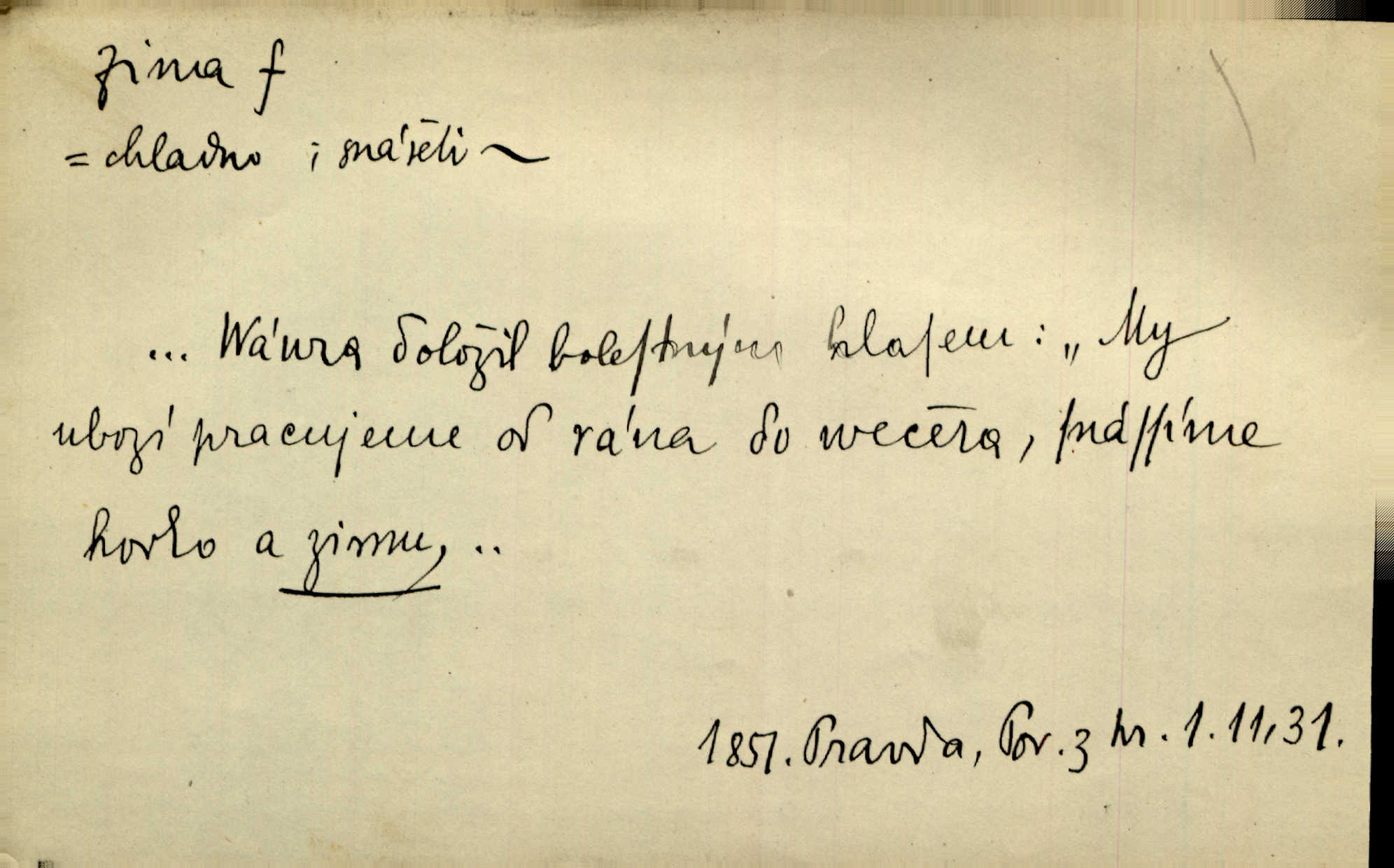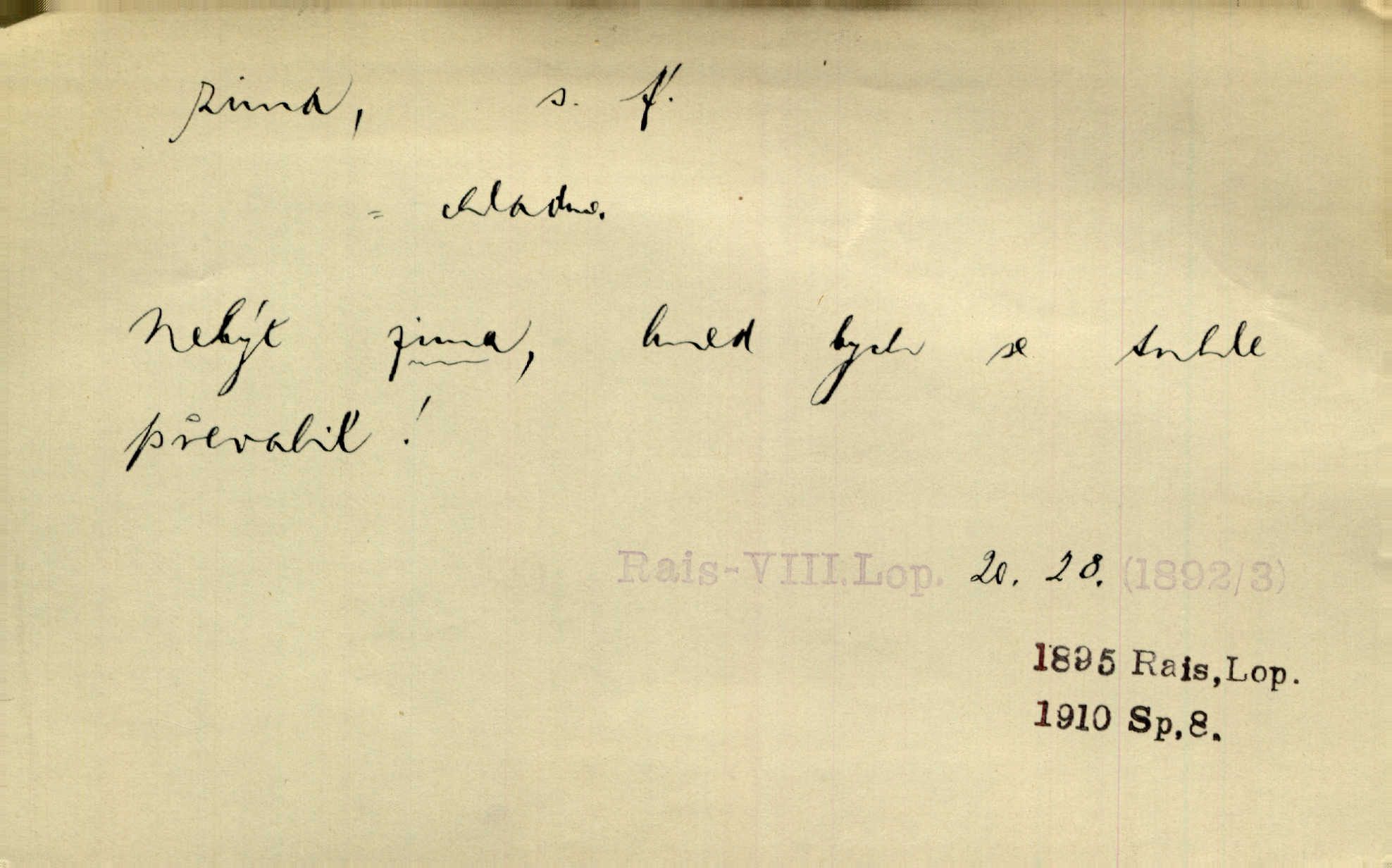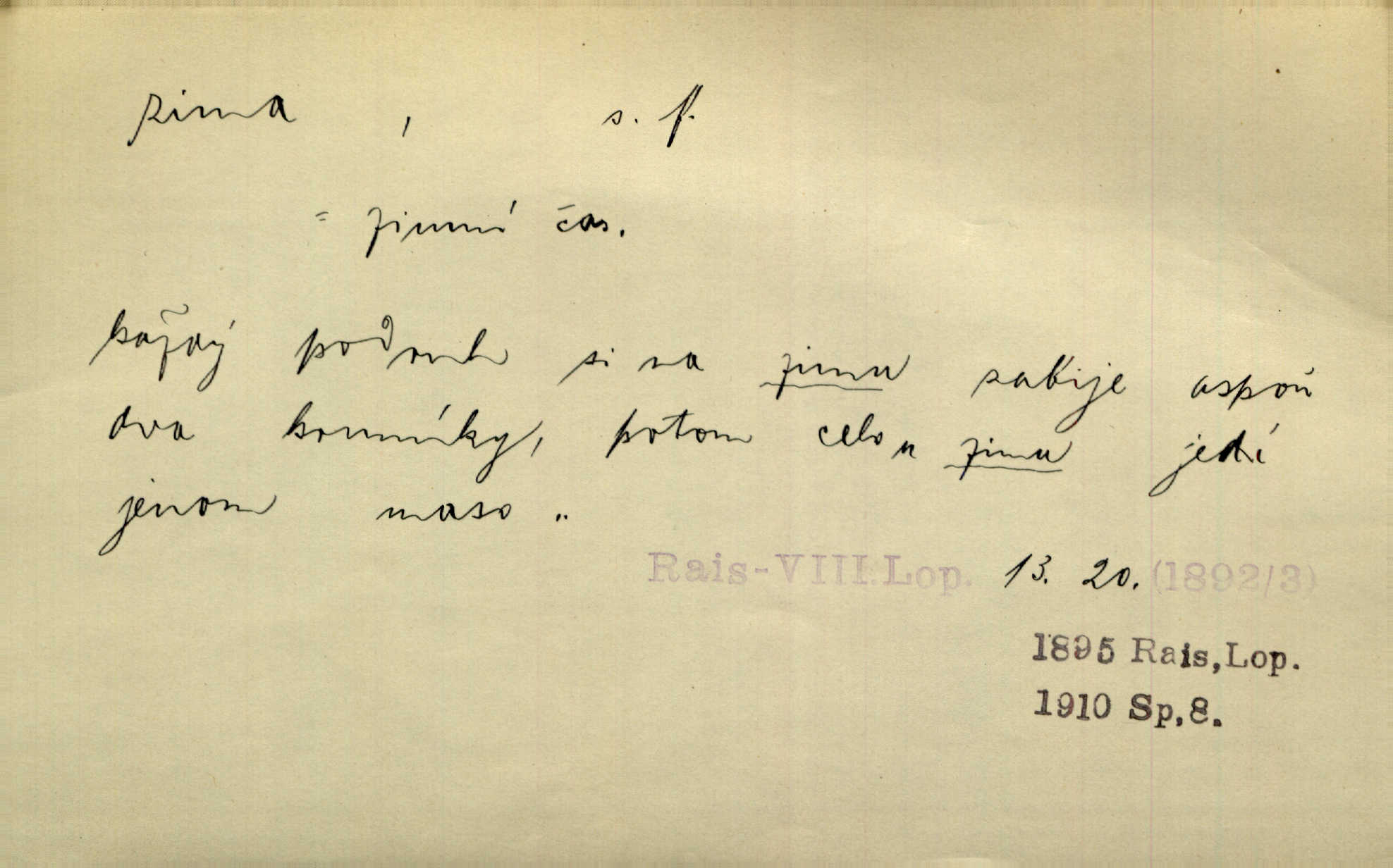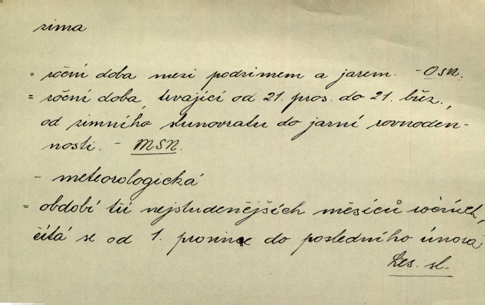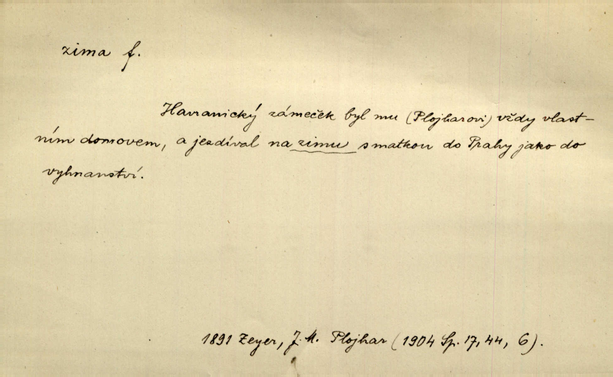 - zima (dial. zejma), -y f. chlad, studeno, chladno. Byla přímo prosincová zima. Mach. Zima venku povolila. Čech. Pracujeme od rána do večera, snášíme horko a zimu. Prav. Křesťanské to nebylo od Tebe, přítele vyhodit do zimy. Ner. Voda zimou křehne v led. V. Šaf. Opička u Skutče zimou pošla. John. Bylo [kuře] celé zmoklé, třáslo se zimou a típalo. Erb. Napřed [byly] veliké zimy a sníh, potom moc vody. Herb. Tomášovi jako by zima za nehty zalézala. Mah. Přen. Chvěla se o každý dnešek proto, že se nějak instinktem bála ještě větší zimy a ještě dutější prázdnoty příštího života životních nesnází. R. Svob. D Zima starší lid. (v lidových představách) zosobnění zimy, smrt, Morana. Bylo před velikonocemi, týden již, co odnesla chasa smrt čili zimu ze vsi. Něm. D zima dial. horečka, zimnice. Tak mně jaksi zima drobí. Kosm. Caromejku rozklepala zima. Rais. Z té lítosti a slabosti zdrobila Borišku zima. Preis. Do mne se dává zima. Just. Zuby mi cvakaly zimou vnitřní. Svět. D část kalendářního roku, roční doba (na severní polokouli) od 21. prosince do 21. března. V létě vstávala babička ve čtyry, v zimě v pět hodin. Něm. Byl po celou zimu s nejsilnějšími soudruhy hluboko v horách. Svět. Minuly vánoce, i zejma minula. Staš. Nastala povětrnosť podobná té, jež bývá na rozhraní mezi zimou a jarem. Šmil. Stará chodila v zimě do lesa na dříví. Erb. Každý podruh si na zimu zabije aspoň dva krmníky. Rais. Odešla od něho — budou tomu na zimu dvě léta. Šim. Ještě nebožtíka ani jedna zima sněhem nepokryla, a já že už zase chystám rozmarín. Pitt. Leto úrodné, tuhá zima. Hol. Šimona Judy — zima je tudy. Pořek. Hustý kožich je zaječí, zima bývá největší! Hol. Prázdná-li stodola v zimě, na jaře je nouze Havl. Potácela se jako moucha po zimě. Baar. Přece tam [na samotě] bylo velice mnoho radostí v zimě v létě stále. Něm. V zimě v letě nosíval na hlavě šedivou beranici. Sab. Když už s člověkem začíná zima rozprávět, přejdou chuti na toulky stárne. Rais. Přen. V modlitbách a zbožném rozjímání trávili tam [starci] zimu života! stáří. Čech. Dnes na konci své zimy netoužím leda po svém Soudci. Mus. A šel [stařec]‚ byl vážný dnes, víc jeho vlas měl zimy šedin. Klášt. D Lid. rok. Pravili mi, že ta válka již čtyřicet zim trvala. Kram.