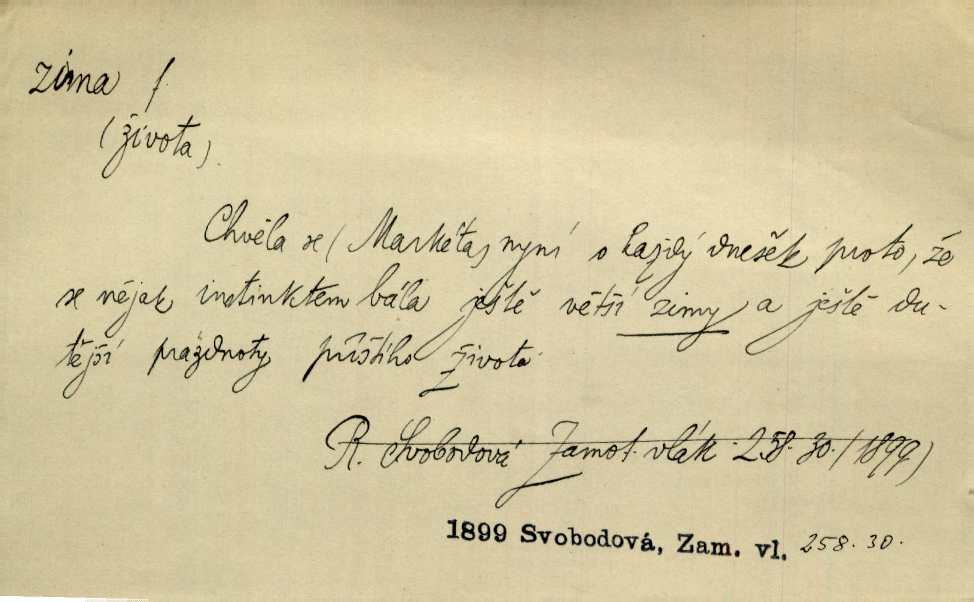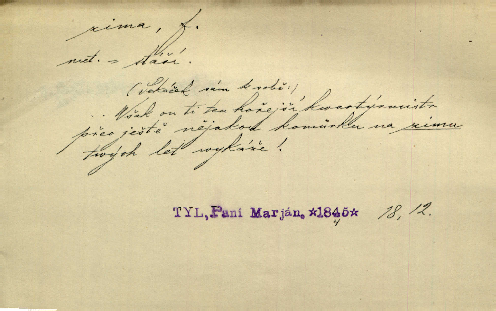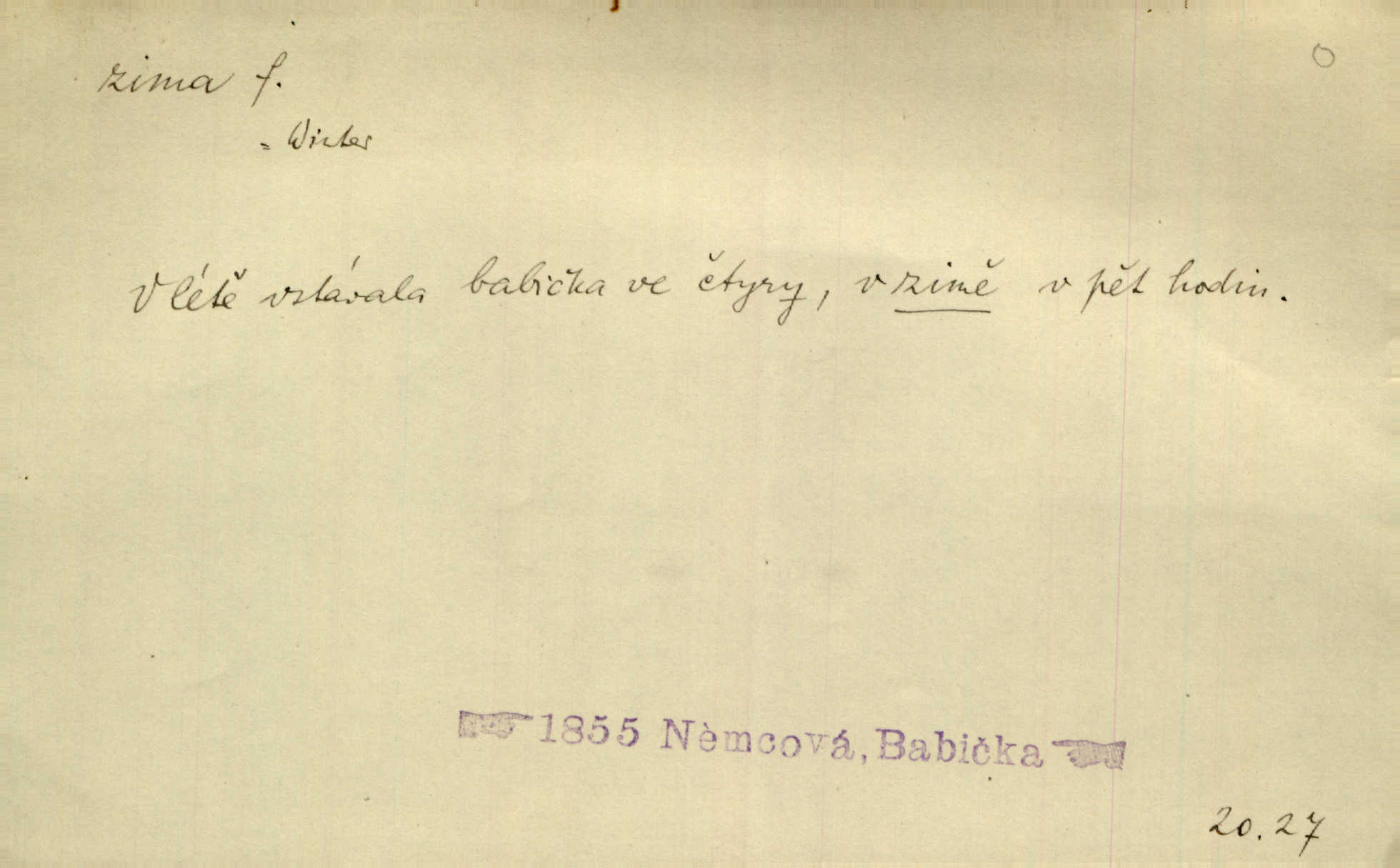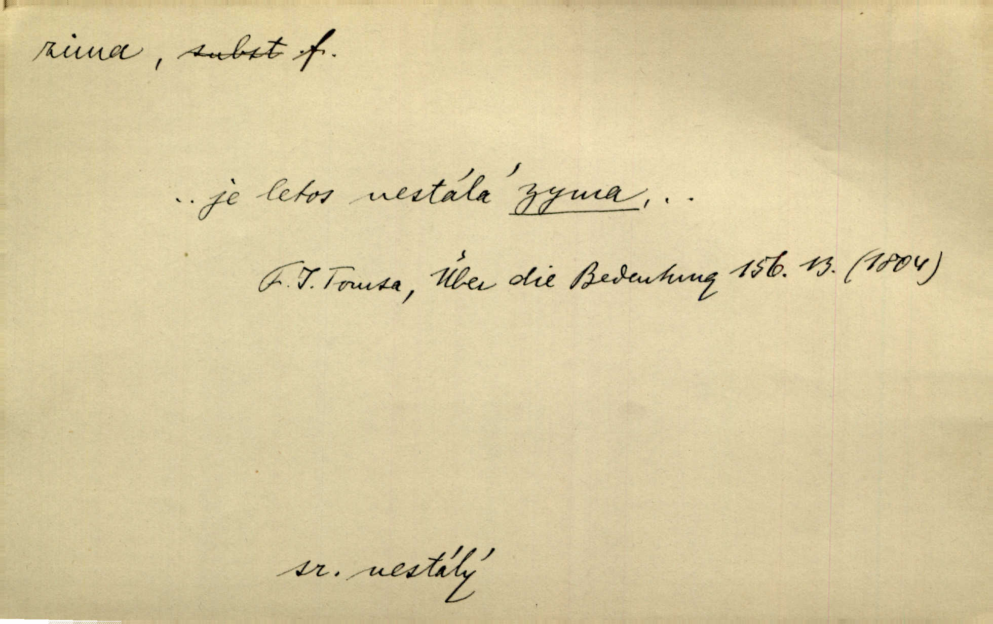 - zima (dial. zejma), -y f. chlad, studeno, chladno. Byla přímo prosincová zima. Mach. Zima venku povolila. Čech. Pracujeme od rána do večera, snášíme horko a zimu. Prav. Křesťanské to nebylo od Tebe, přítele vyhodit do zimy. Ner. Voda zimou křehne v led. V. Šaf. Opička u Skutče zimou pošla. John. Bylo [kuře] celé zmoklé, třáslo se zimou a típalo. Erb. Napřed [byly] veliké zimy a sníh, potom moc vody. Herb. Tomášovi jako by zima za nehty zalézala. Mah. Přen. Chvěla se o každý dnešek proto, že se nějak instinktem bála ještě větší zimy a ještě dutější prázdnoty příštího života životních nesnází. R. Svob. D Zima starší lid. (v lidových představách) zosobnění zimy, smrt, Morana. Bylo před velikonocemi, týden již, co odnesla chasa smrt čili zimu ze vsi. Něm. D zima dial. horečka, zimnice. Tak mně jaksi zima drobí. Kosm. Caromejku rozklepala zima. Rais. Z té lítosti a slabosti zdrobila Borišku zima. Preis. Do mne se dává zima. Just. Zuby mi cvakaly zimou vnitřní. Svět. D část kalendářního roku, roční doba (na severní polokouli) od 21. prosince do 21. března. V létě vstávala babička ve čtyry, v zimě v pět hodin. Něm. Byl po celou zimu s nejsilnějšími soudruhy hluboko v horách. Svět. Minuly vánoce, i zejma minula. Staš. Nastala povětrnosť podobná té, jež bývá na rozhraní mezi zimou a jarem. Šmil. Stará chodila v zimě do lesa na dříví. Erb. Každý podruh si na zimu zabije aspoň dva krmníky. Rais. Odešla od něho — budou tomu na zimu dvě léta. Šim. Ještě nebožtíka ani jedna zima sněhem nepokryla, a já že už zase chystám rozmarín. Pitt. Leto úrodné, tuhá zima. Hol. Šimona Judy — zima je tudy. Pořek. Hustý kožich je zaječí, zima bývá největší! Hol. Prázdná-li stodola v zimě, na jaře je nouze Havl. Potácela se jako moucha po zimě. Baar. Přece tam [na samotě] bylo velice mnoho radostí v zimě v létě stále. Něm. V zimě v letě nosíval na hlavě šedivou beranici. Sab. Když už s člověkem začíná zima rozprávět, přejdou chuti na toulky stárne. Rais. Přen. V modlitbách a zbožném rozjímání trávili tam [starci] zimu života! stáří. Čech. Dnes na konci své zimy netoužím leda po svém Soudci. Mus. A šel [stařec]‚ byl vážný dnes, víc jeho vlas měl zimy šedin. Klášt. D Lid. rok. Pravili mi, že ta válka již čtyřicet zim trvala. Kram.