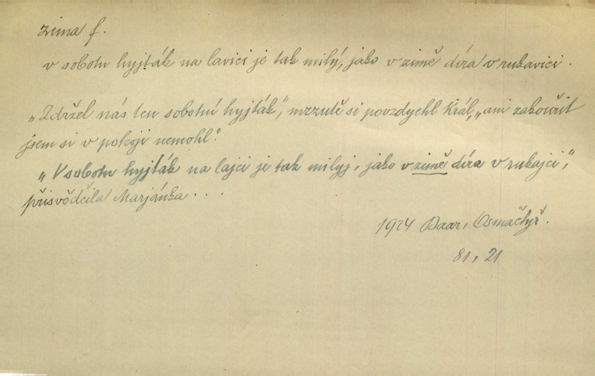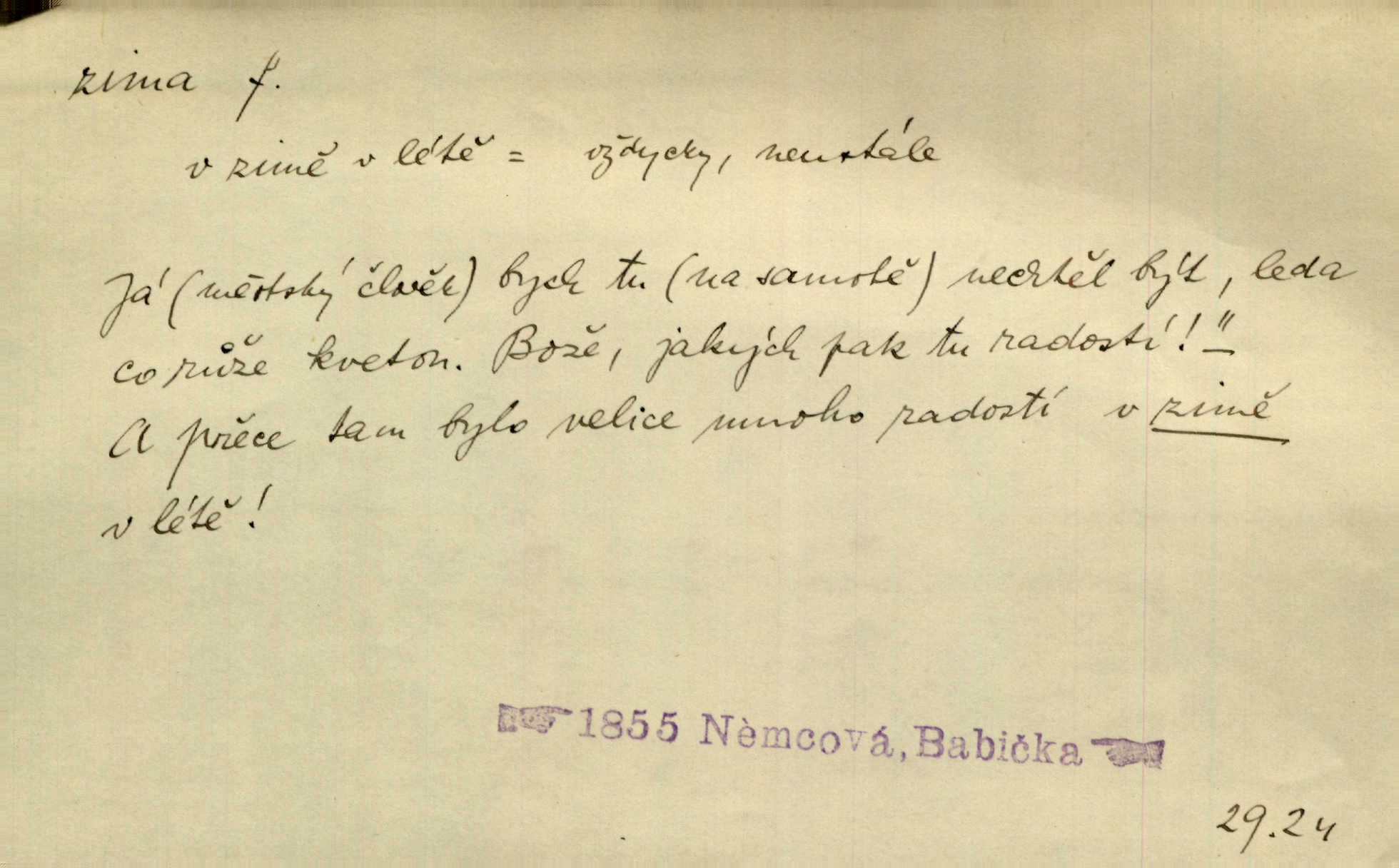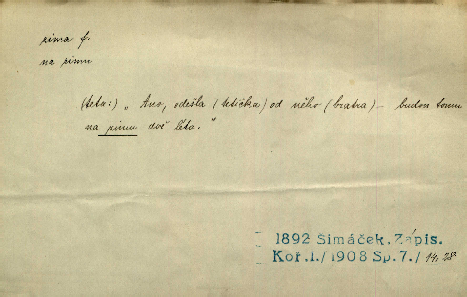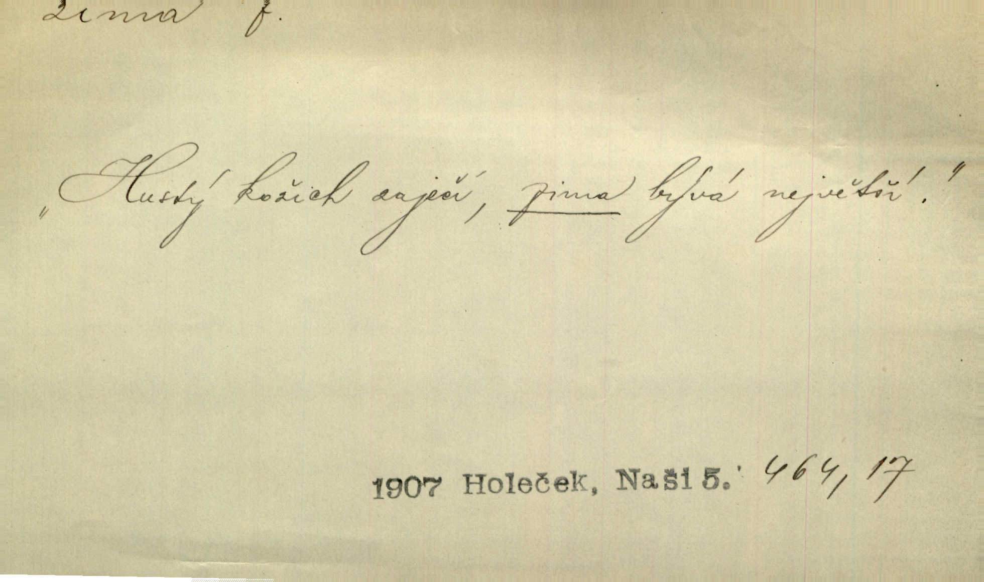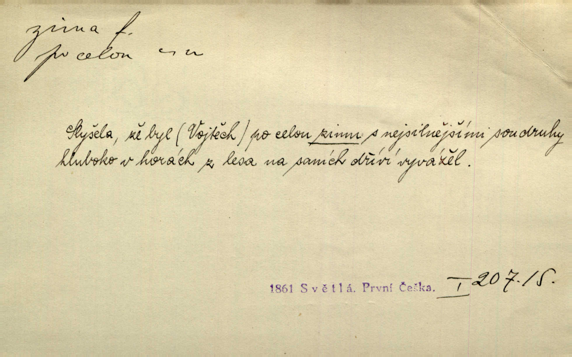 - zima (dial. zejma), -y f. chlad, studeno, chladno. Byla přímo prosincová zima. Mach. Zima venku povolila. Čech. Pracujeme od rána do večera, snášíme horko a zimu. Prav. Křesťanské to nebylo od Tebe, přítele vyhodit do zimy. Ner. Voda zimou křehne v led. V. Šaf. Opička u Skutče zimou pošla. John. Bylo [kuře] celé zmoklé, třáslo se zimou a típalo. Erb. Napřed [byly] veliké zimy a sníh, potom moc vody. Herb. Tomášovi jako by zima za nehty zalézala. Mah. Přen. Chvěla se o každý dnešek proto, že se nějak instinktem bála ještě větší zimy a ještě dutější prázdnoty příštího života životních nesnází. R. Svob. D Zima starší lid. (v lidových představách) zosobnění zimy, smrt, Morana. Bylo před velikonocemi, týden již, co odnesla chasa smrt čili zimu ze vsi. Něm. D zima dial. horečka, zimnice. Tak mně jaksi zima drobí. Kosm. Caromejku rozklepala zima. Rais. Z té lítosti a slabosti zdrobila Borišku zima. Preis. Do mne se dává zima. Just. Zuby mi cvakaly zimou vnitřní. Svět. D část kalendářního roku, roční doba (na severní polokouli) od 21. prosince do 21. března. V létě vstávala babička ve čtyry, v zimě v pět hodin. Něm. Byl po celou zimu s nejsilnějšími soudruhy hluboko v horách. Svět. Minuly vánoce, i zejma minula. Staš. Nastala povětrnosť podobná té, jež bývá na rozhraní mezi zimou a jarem. Šmil. Stará chodila v zimě do lesa na dříví. Erb. Každý podruh si na zimu zabije aspoň dva krmníky. Rais. Odešla od něho — budou tomu na zimu dvě léta. Šim. Ještě nebožtíka ani jedna zima sněhem nepokryla, a já že už zase chystám rozmarín. Pitt. Leto úrodné, tuhá zima. Hol. Šimona Judy — zima je tudy. Pořek. Hustý kožich je zaječí, zima bývá největší! Hol. Prázdná-li stodola v zimě, na jaře je nouze Havl. Potácela se jako moucha po zimě. Baar. Přece tam [na samotě] bylo velice mnoho radostí v zimě v létě stále. Něm. V zimě v letě nosíval na hlavě šedivou beranici. Sab. Když už s člověkem začíná zima rozprávět, přejdou chuti na toulky stárne. Rais. Přen. V modlitbách a zbožném rozjímání trávili tam [starci] zimu života! stáří. Čech. Dnes na konci své zimy netoužím leda po svém Soudci. Mus. A šel [stařec]‚ byl vážný dnes, víc jeho vlas měl zimy šedin. Klášt. D Lid. rok. Pravili mi, že ta válka již čtyřicet zim trvala. Kram.