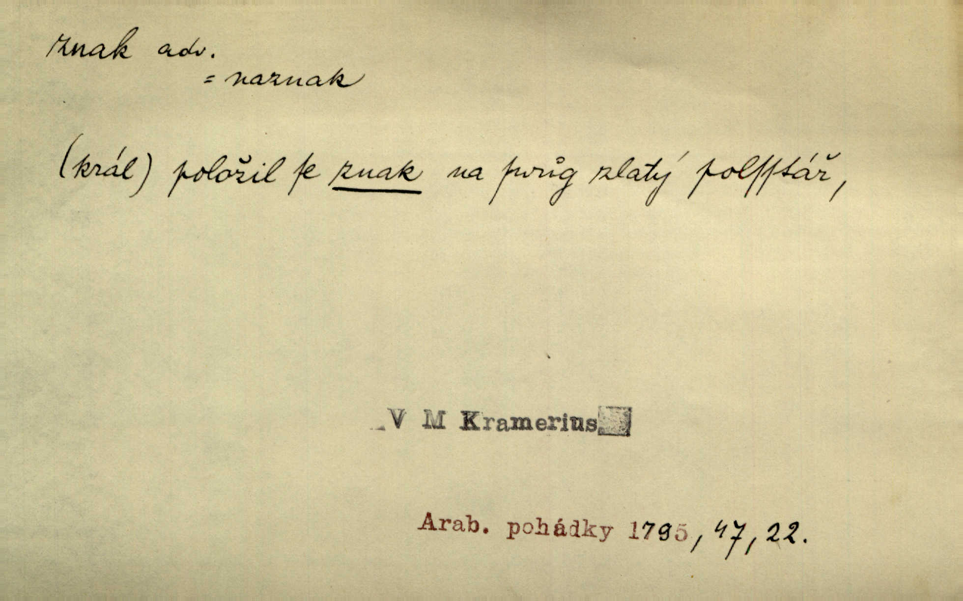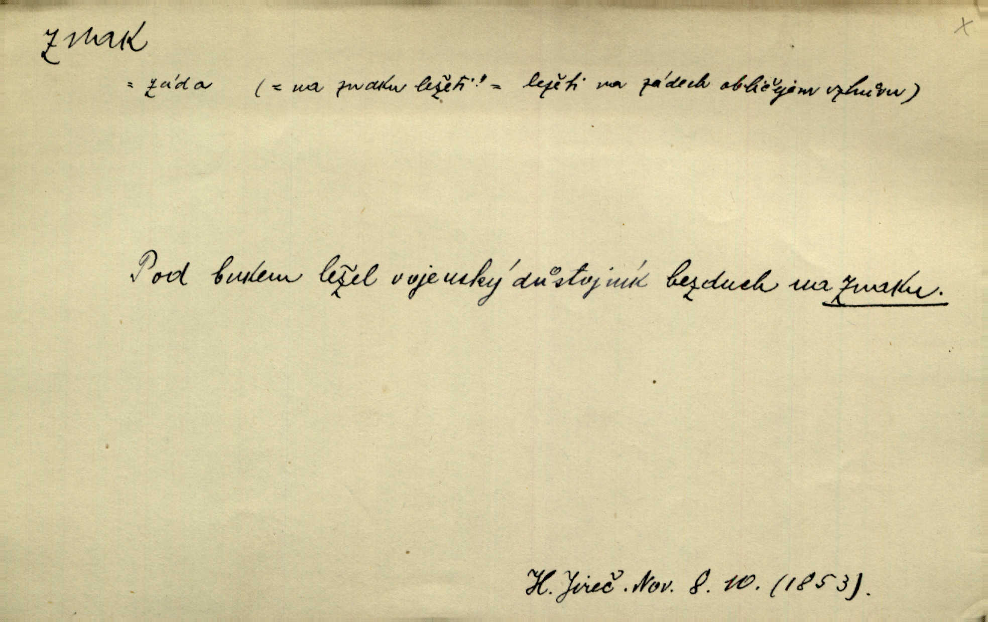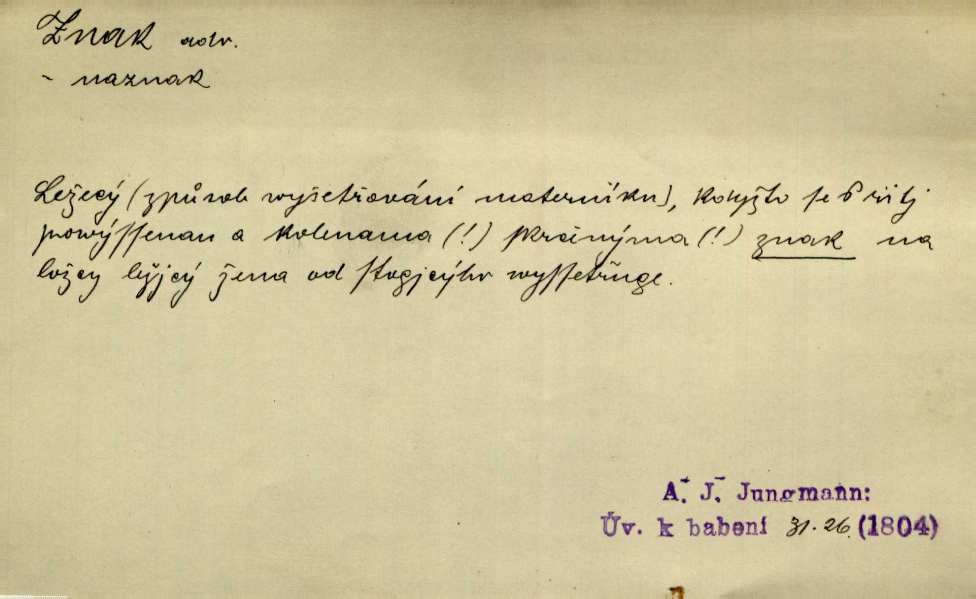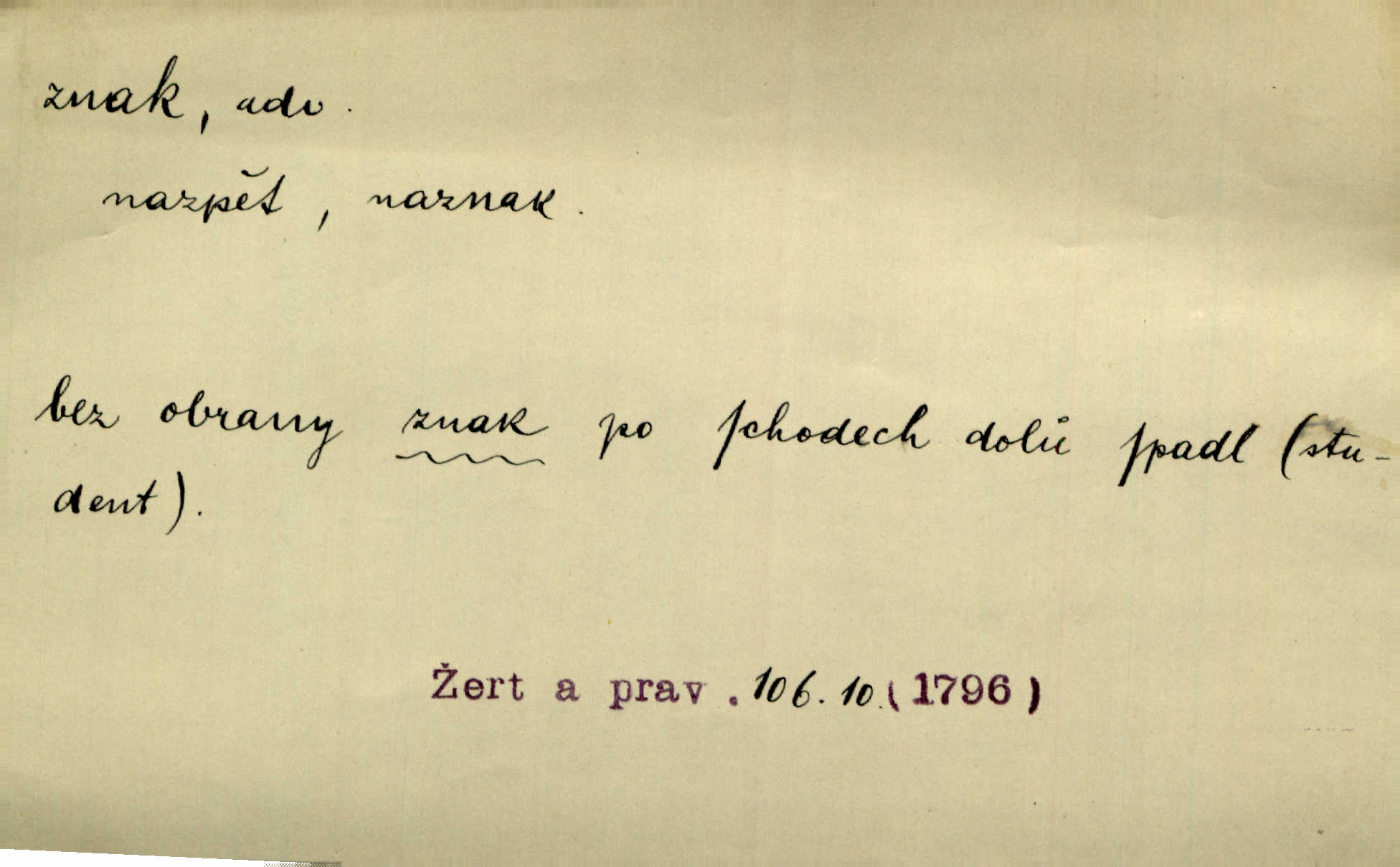 - †znak adv. naznak. Hrnčíř zaviklav se v sedle spadl s koně znak. Win.