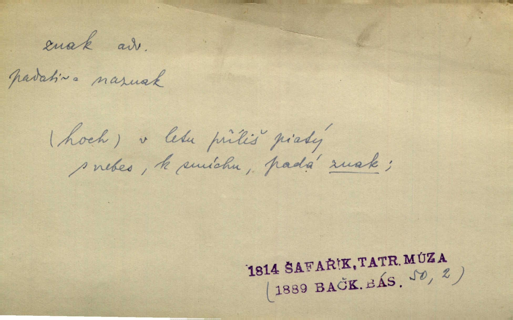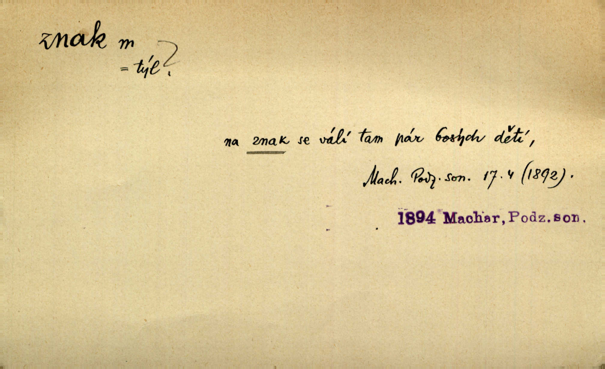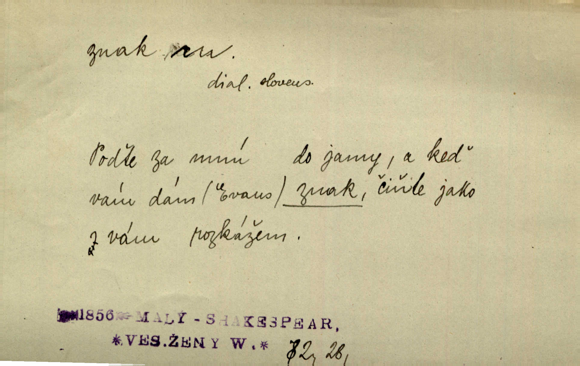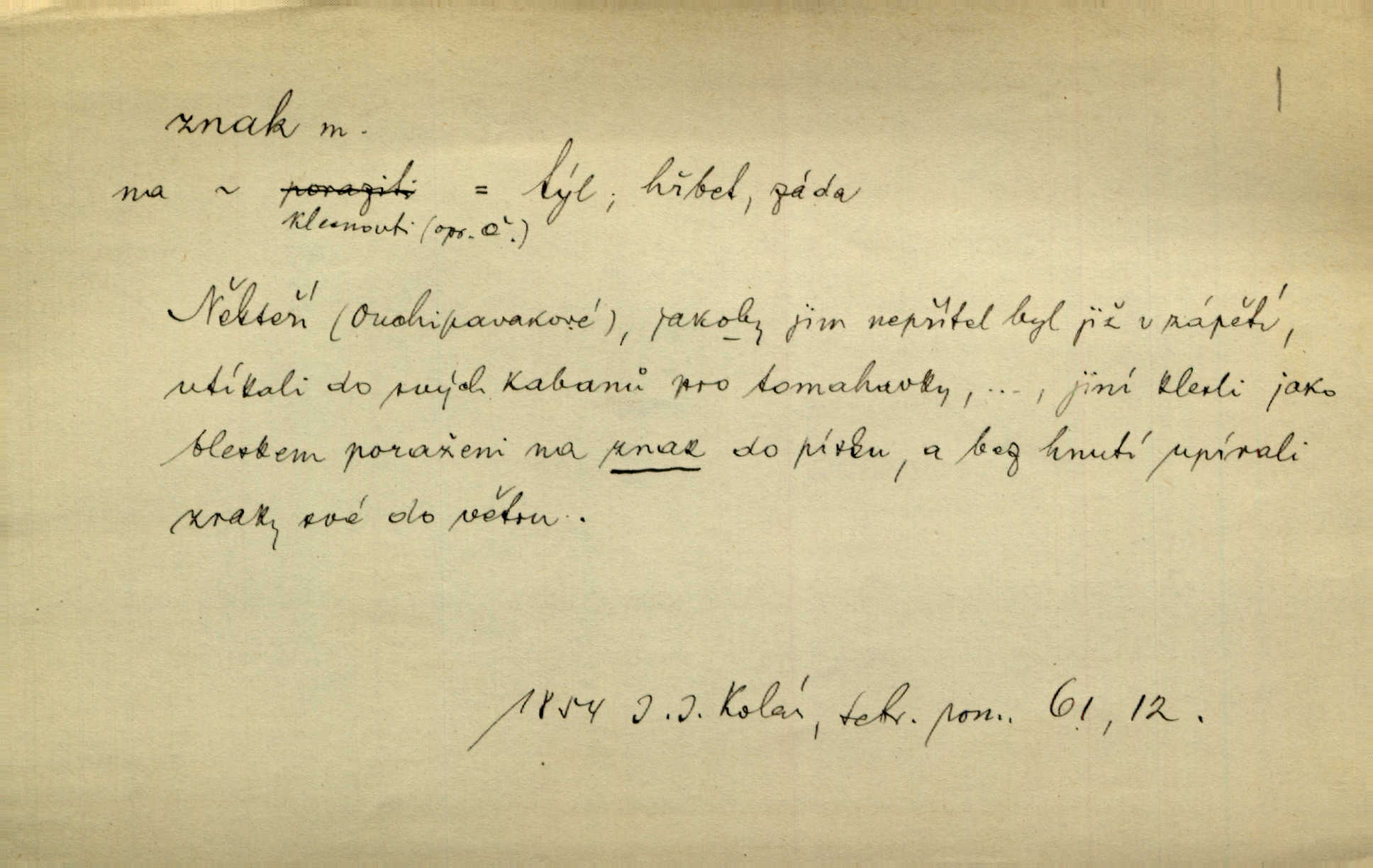 - †znak adv. naznak. Hrnčíř zaviklav se v sedle spadl s koně znak. Win.