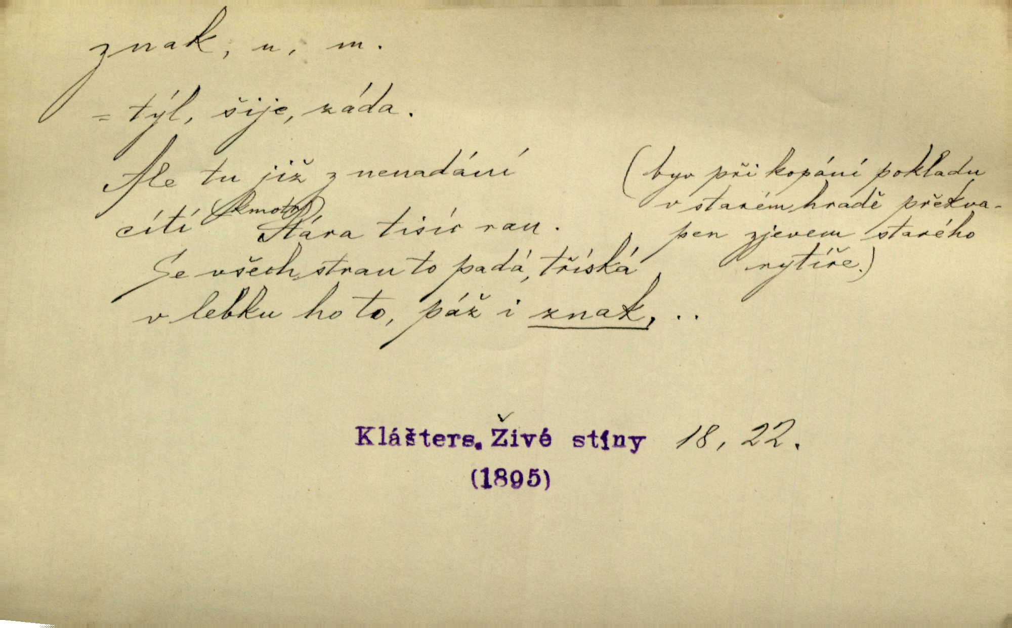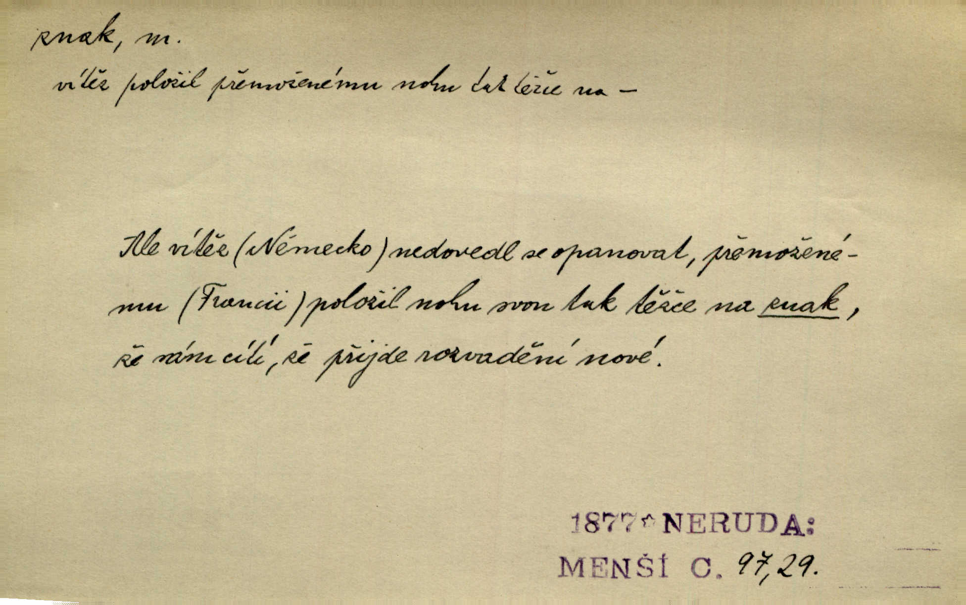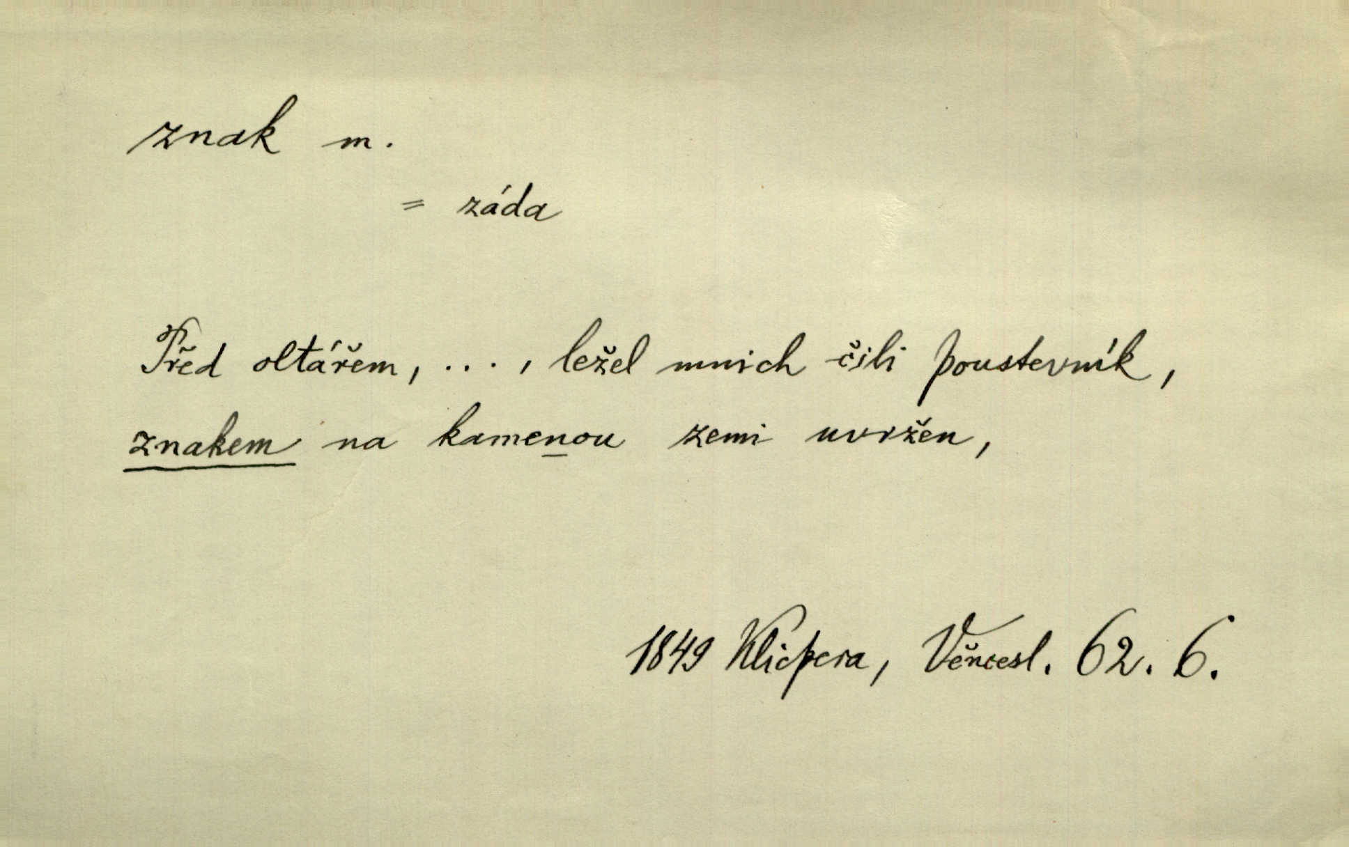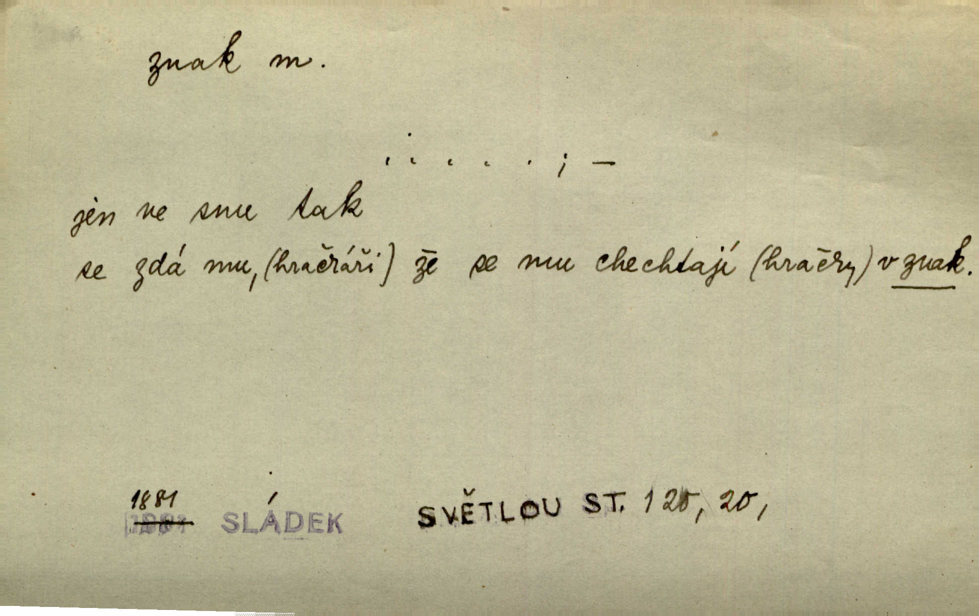 - †znak adv. naznak. Hrnčíř zaviklav se v sedle spadl s koně znak. Win.