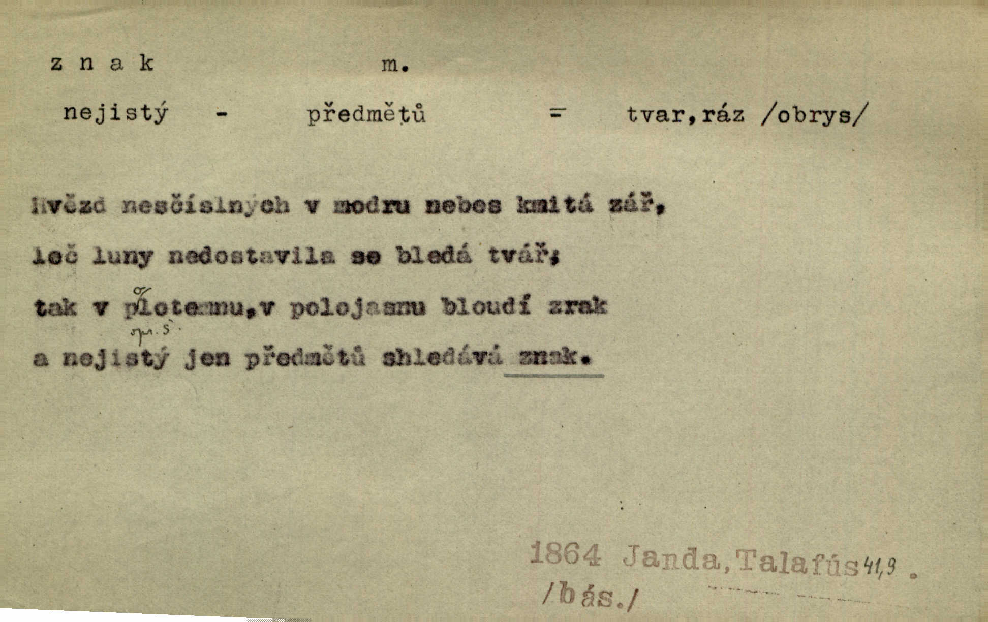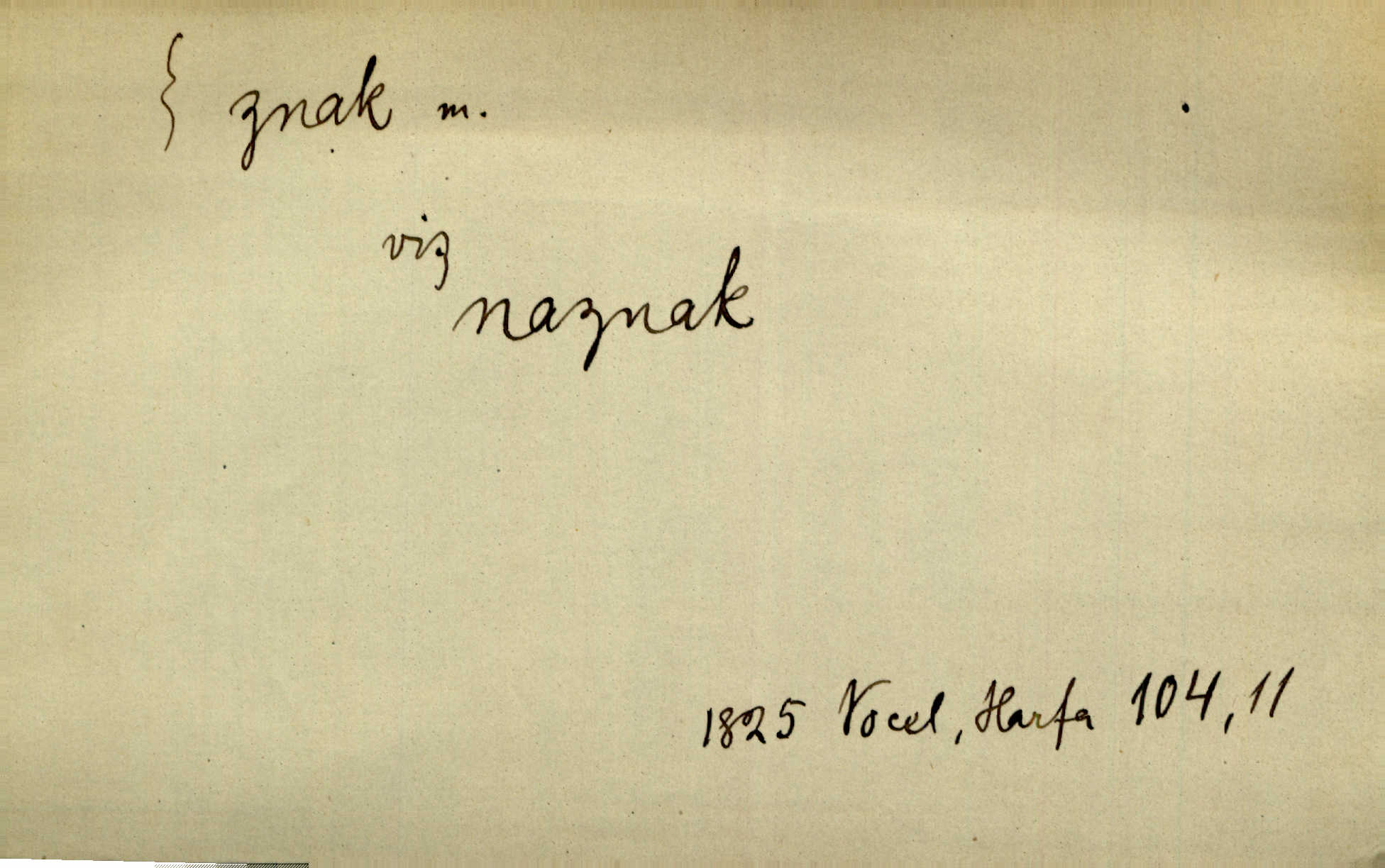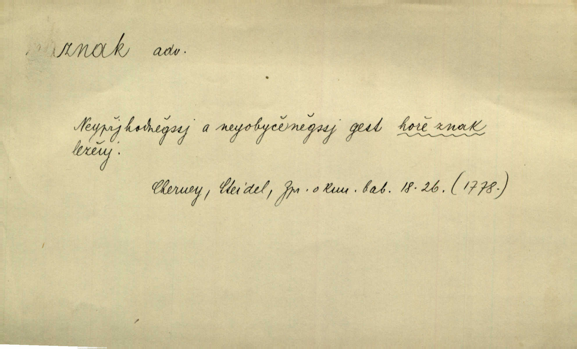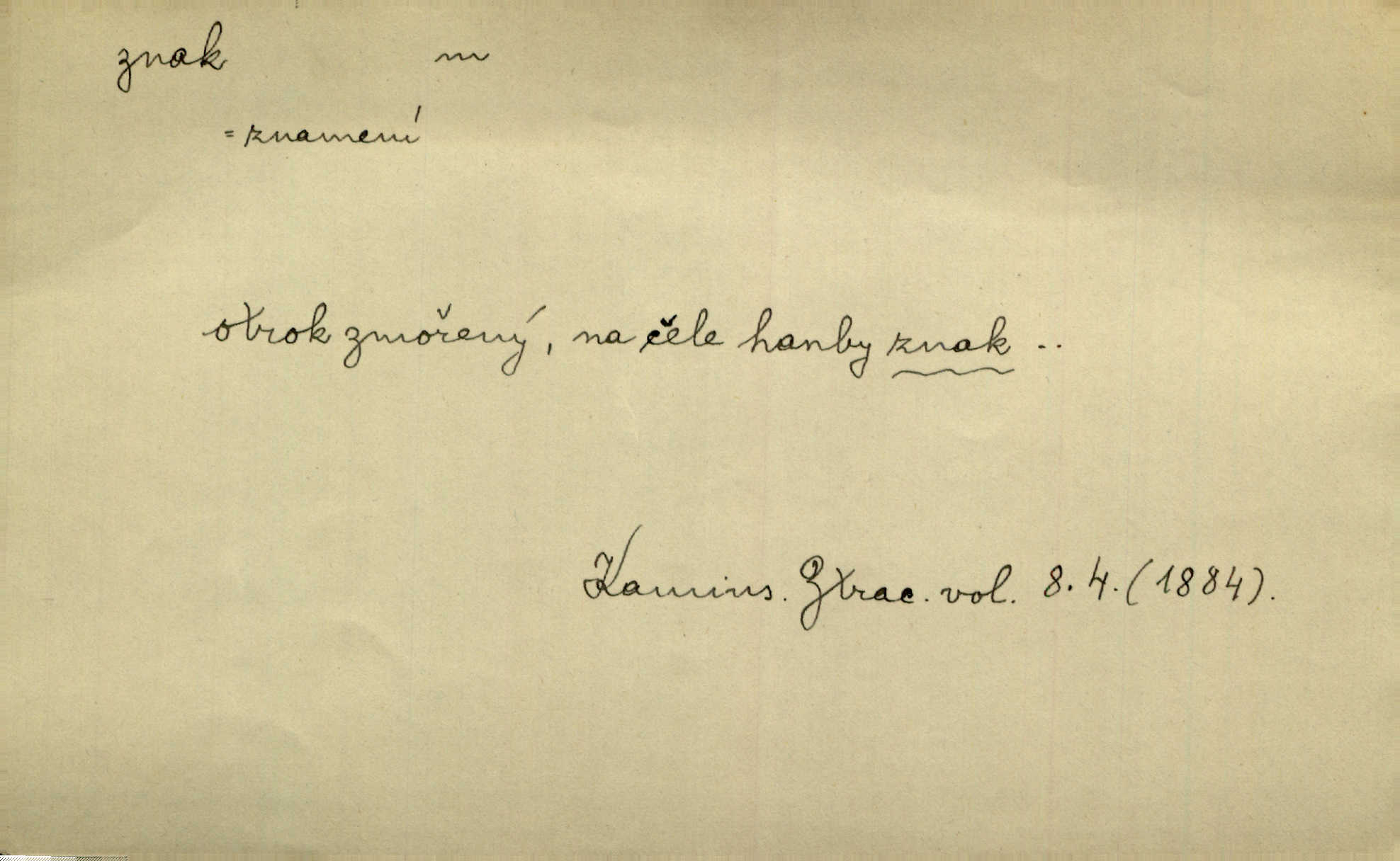 - znak, -u m. 1. význačná, rozlišující vlastnost, charakteristický rys, známka. Jeho chování, jeho výraz, jeho tón, vše neslo znak rozrušení. Dyk. Objevovaly se znaky, které ukazovaly somnambulní ráz jeho poesie. Hrb. Historičnost jest znakem osvícenější doby. Durd. [Byron byl] proti křivdě břitký bitec, za svatý znak osvobození a práva nadšenec, fanatik, dobyvatel, mučedlník. Krás. Tato činnost obviněného vyčerpává zákonné skutkové znaky velezrady. Ml. fronta. K pubertě [u kretena] nedochází, v důsledku čehož se nerozví její druhotné pohlavní znaky. Mělka. Zast. Po královně ani znaku nezůstalo, mimo krásné šaty ani stopy. Něm. Biol. znaky, dědičné, dominantní, recesivní a j. Log. určující prvek při stanovení pojmu. Účet. znak účtu symbolické označení zařazení účtu v nějakém souboru, na př. označení účtu písmenem nebo číslicemi v účtovací osnově. Číslicový znak účtu. D viditelná značka, předmět sloužící k označení něčeho n. k dorozumívání; viditelné znamení nějaké hodnosti, příslušnosti k nějakému celku, odznak. Na stehnách mívají [koně] vždycky vypálený znak F. J. Havl. Pod vypínajícím se sklepením jeskyně, na kamenu popsaném tajemnými znaky, usedla jakoby v snění. Frič. Hlavním zobrazovacím prostředkem japonské řeči zůstávají ještě dnes znaky čínské. Výb. Vlastnoručně byla křížek sňala a jí [dceři] ho s napomenutím doručila, aby svatý tento znak na své místo pověsila. Svět. Už v sedmihvězdném projíždí se [cherub noci] voze, na skráni korunu, co vlády znak. Heyd. Bič nosil v ruce jen pro strach a ze zvyku, také že to byl znak jeho zaměstnání. Něm. Na náramenících důstojníků jsou kromě hodností také rozlišovací znaky distinkce. Ml. fronta. Hrdě nesli žáci státních učilišť v průvodu znak pracovních záloh. Ml. fronta. Prodám německého ovčáka, černožluté znaky. Nár. p. Mezi dvěma, na téže řádce volně spojenými znaky [těsnopisnými] čte se zpravidla samohláska „e“ — Slabý-Mat. Zool. znaky světlá, ohraničená místa srsti ssavců (psů, koní a pod.), důležitá při podávání popisu ssavců. Žel. návěstní znak určitý způsob návěstí. Typ. znak grafický záznam pro hlásku, slabiku, slovo atd.; obraz tiskového prvku na odlitku neb matrici. Voj. znaky poznávací, signální, smluvené, volací, váhové znaky střel a j. D Ling. jazyk jako systém znaků (v strukturalismu). D šlechtický, státní a j. erb. Ctibor za svůj hrdinský kus stal se rytířem a do znaku dostal kus loukotě s třemi špicemi. Něm. Znakem jejich [Leopardů] byl červený lev v bílém poli. Vrch. Levou rukou držel [rytíř] štít se Staroměstským znakem. Erb. Státní znak a vlajky upravuje zákon. Ústava.