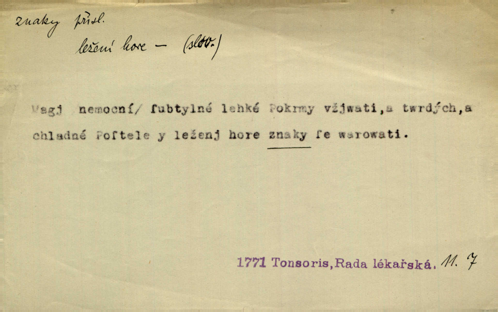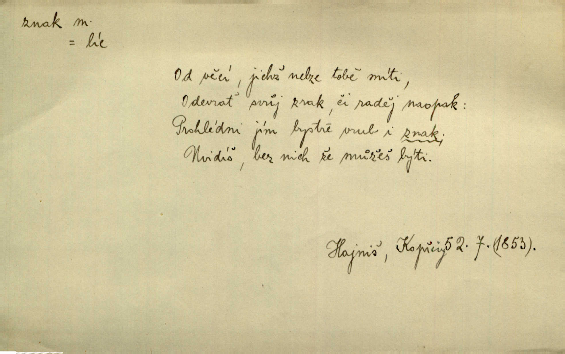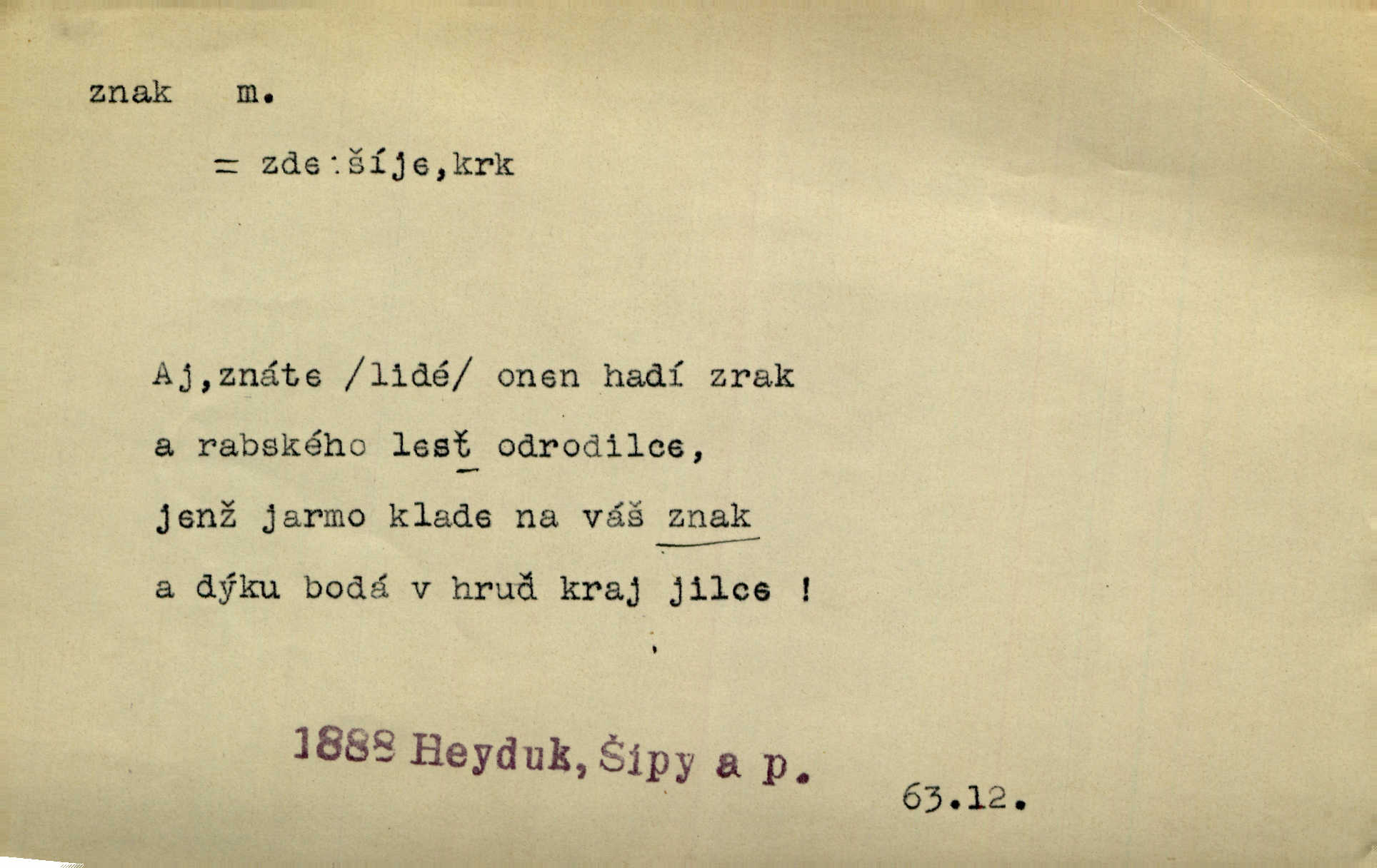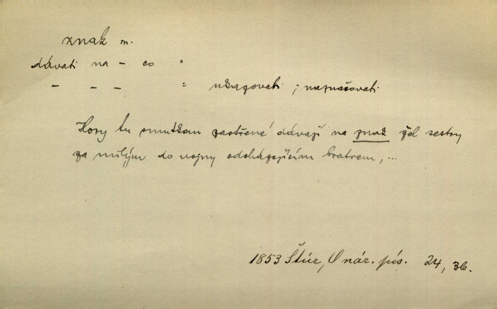 - znak, -u m. 1. význačná, rozlišující vlastnost, charakteristický rys, známka. Jeho chování, jeho výraz, jeho tón, vše neslo znak rozrušení. Dyk. Objevovaly se znaky, které ukazovaly somnambulní ráz jeho poesie. Hrb. Historičnost jest znakem osvícenější doby. Durd. [Byron byl] proti křivdě břitký bitec, za svatý znak osvobození a práva nadšenec, fanatik, dobyvatel, mučedlník. Krás. Tato činnost obviněného vyčerpává zákonné skutkové znaky velezrady. Ml. fronta. K pubertě [u kretena] nedochází, v důsledku čehož se nerozví její druhotné pohlavní znaky. Mělka. Zast. Po královně ani znaku nezůstalo, mimo krásné šaty ani stopy. Něm. Biol. znaky, dědičné, dominantní, recesivní a j. Log. určující prvek při stanovení pojmu. Účet. znak účtu symbolické označení zařazení účtu v nějakém souboru, na př. označení účtu písmenem nebo číslicemi v účtovací osnově. Číslicový znak účtu. D viditelná značka, předmět sloužící k označení něčeho n. k dorozumívání; viditelné znamení nějaké hodnosti, příslušnosti k nějakému celku, odznak. Na stehnách mívají [koně] vždycky vypálený znak F. J. Havl. Pod vypínajícím se sklepením jeskyně, na kamenu popsaném tajemnými znaky, usedla jakoby v snění. Frič. Hlavním zobrazovacím prostředkem japonské řeči zůstávají ještě dnes znaky čínské. Výb. Vlastnoručně byla křížek sňala a jí [dceři] ho s napomenutím doručila, aby svatý tento znak na své místo pověsila. Svět. Už v sedmihvězdném projíždí se [cherub noci] voze, na skráni korunu, co vlády znak. Heyd. Bič nosil v ruce jen pro strach a ze zvyku, také že to byl znak jeho zaměstnání. Něm. Na náramenících důstojníků jsou kromě hodností také rozlišovací znaky distinkce. Ml. fronta. Hrdě nesli žáci státních učilišť v průvodu znak pracovních záloh. Ml. fronta. Prodám německého ovčáka, černožluté znaky. Nár. p. Mezi dvěma, na téže řádce volně spojenými znaky [těsnopisnými] čte se zpravidla samohláska „e“ — Slabý-Mat. Zool. znaky světlá, ohraničená místa srsti ssavců (psů, koní a pod.), důležitá při podávání popisu ssavců. Žel. návěstní znak určitý způsob návěstí. Typ. znak grafický záznam pro hlásku, slabiku, slovo atd.; obraz tiskového prvku na odlitku neb matrici. Voj. znaky poznávací, signální, smluvené, volací, váhové znaky střel a j. D Ling. jazyk jako systém znaků (v strukturalismu). D šlechtický, státní a j. erb. Ctibor za svůj hrdinský kus stal se rytířem a do znaku dostal kus loukotě s třemi špicemi. Něm. Znakem jejich [Leopardů] byl červený lev v bílém poli. Vrch. Levou rukou držel [rytíř] štít se Staroměstským znakem. Erb. Státní znak a vlajky upravuje zákon. Ústava.