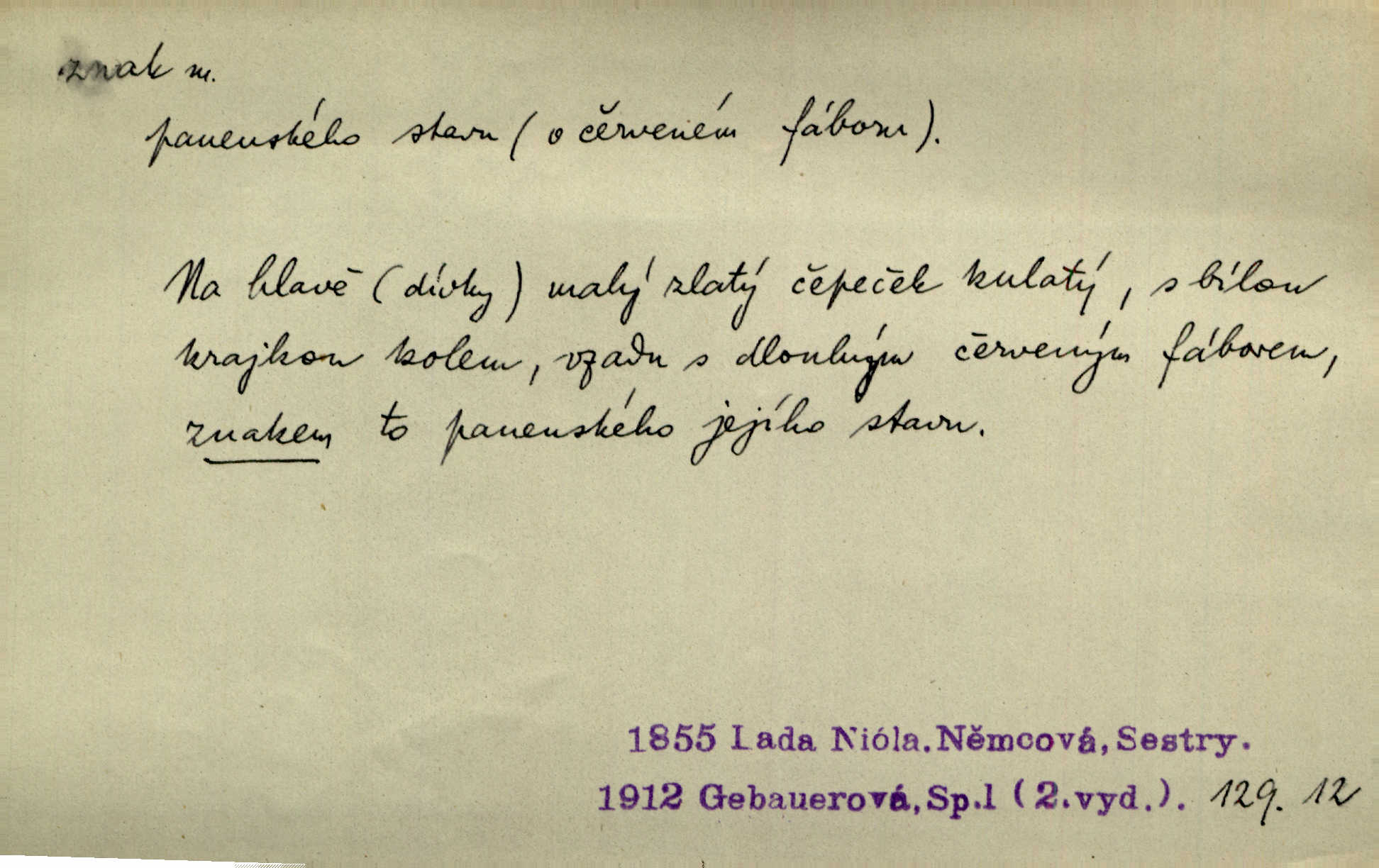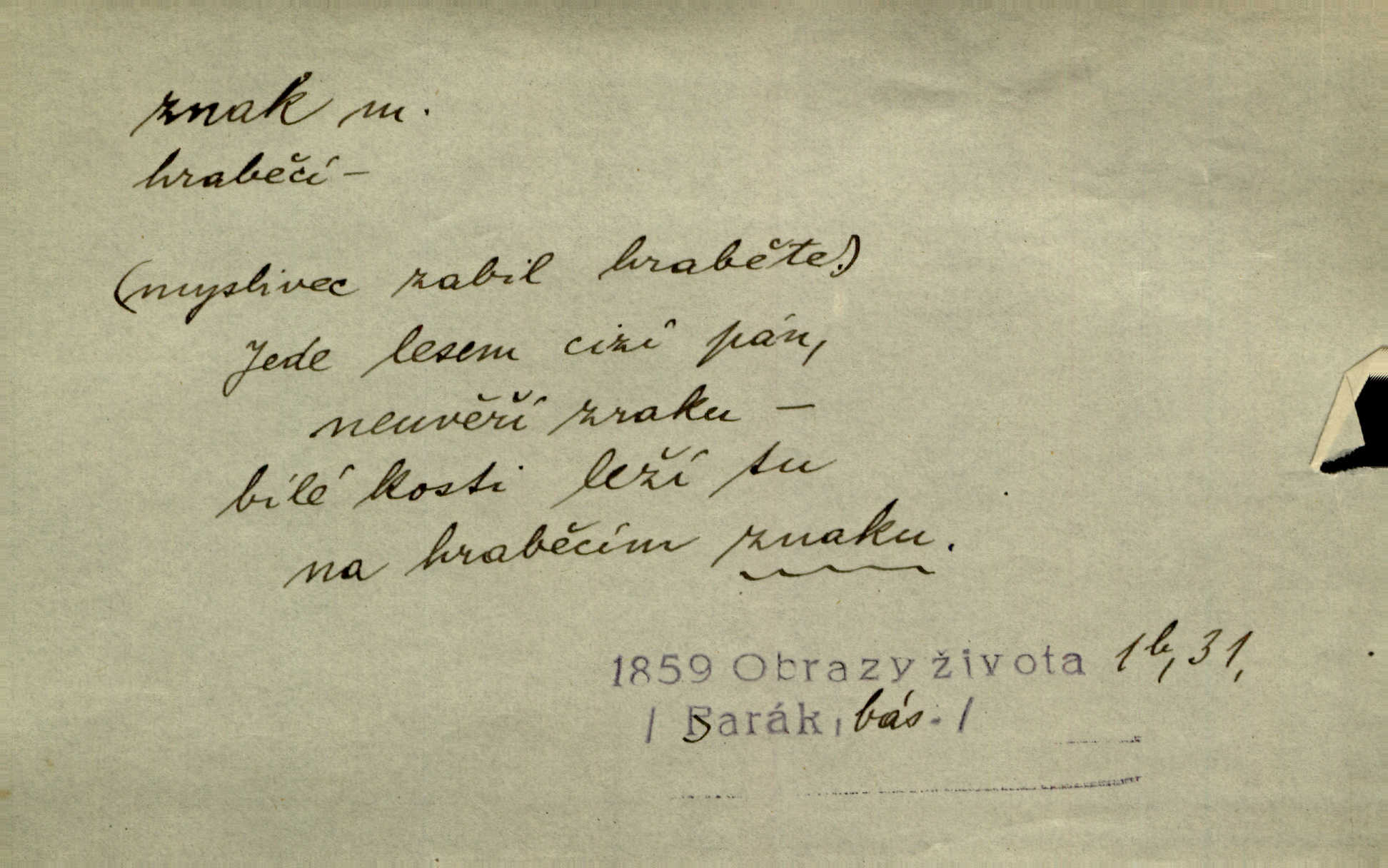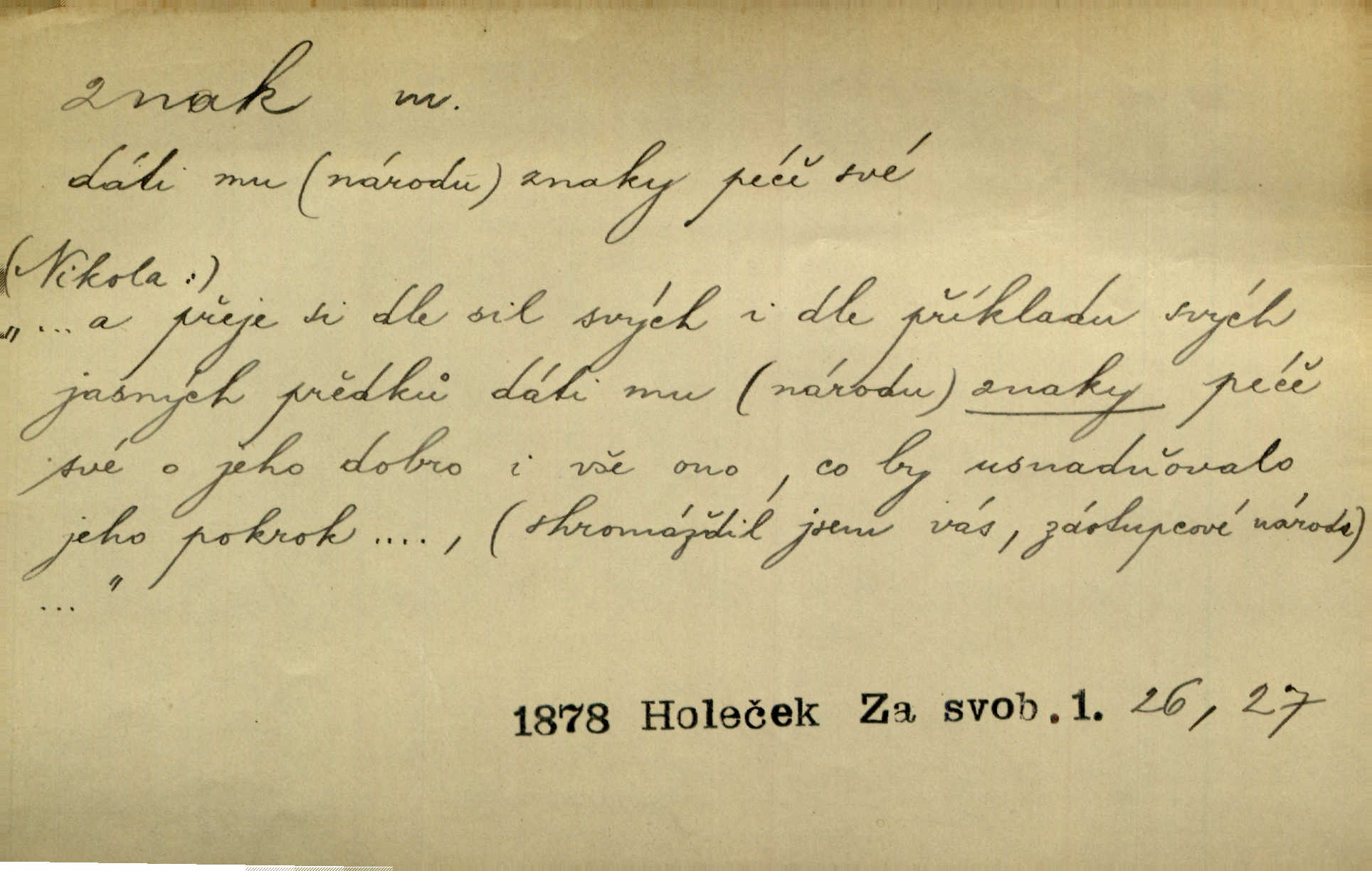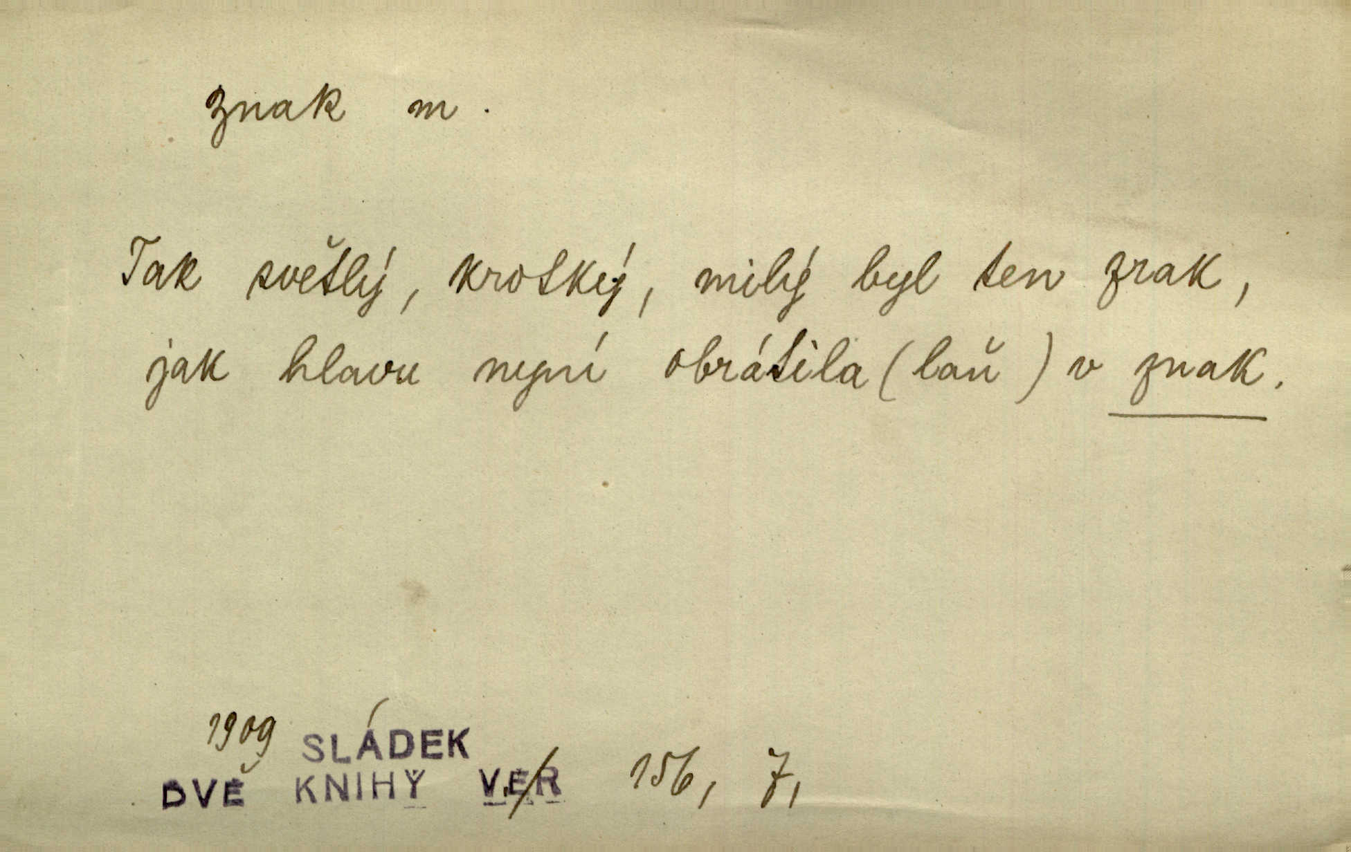 - znak, -u m. 1. význačná, rozlišující vlastnost, charakteristický rys, známka. Jeho chování, jeho výraz, jeho tón, vše neslo znak rozrušení. Dyk. Objevovaly se znaky, které ukazovaly somnambulní ráz jeho poesie. Hrb. Historičnost jest znakem osvícenější doby. Durd. [Byron byl] proti křivdě břitký bitec, za svatý znak osvobození a práva nadšenec, fanatik, dobyvatel, mučedlník. Krás. Tato činnost obviněného vyčerpává zákonné skutkové znaky velezrady. Ml. fronta. K pubertě [u kretena] nedochází, v důsledku čehož se nerozví její druhotné pohlavní znaky. Mělka. Zast. Po královně ani znaku nezůstalo, mimo krásné šaty ani stopy. Něm. Biol. znaky, dědičné, dominantní, recesivní a j. Log. určující prvek při stanovení pojmu. Účet. znak účtu symbolické označení zařazení účtu v nějakém souboru, na př. označení účtu písmenem nebo číslicemi v účtovací osnově. Číslicový znak účtu. D viditelná značka, předmět sloužící k označení něčeho n. k dorozumívání; viditelné znamení nějaké hodnosti, příslušnosti k nějakému celku, odznak. Na stehnách mívají [koně] vždycky vypálený znak F. J. Havl. Pod vypínajícím se sklepením jeskyně, na kamenu popsaném tajemnými znaky, usedla jakoby v snění. Frič. Hlavním zobrazovacím prostředkem japonské řeči zůstávají ještě dnes znaky čínské. Výb. Vlastnoručně byla křížek sňala a jí [dceři] ho s napomenutím doručila, aby svatý tento znak na své místo pověsila. Svět. Už v sedmihvězdném projíždí se [cherub noci] voze, na skráni korunu, co vlády znak. Heyd. Bič nosil v ruce jen pro strach a ze zvyku, také že to byl znak jeho zaměstnání. Něm. Na náramenících důstojníků jsou kromě hodností také rozlišovací znaky distinkce. Ml. fronta. Hrdě nesli žáci státních učilišť v průvodu znak pracovních záloh. Ml. fronta. Prodám německého ovčáka, černožluté znaky. Nár. p. Mezi dvěma, na téže řádce volně spojenými znaky [těsnopisnými] čte se zpravidla samohláska „e“ — Slabý-Mat. Zool. znaky světlá, ohraničená místa srsti ssavců (psů, koní a pod.), důležitá při podávání popisu ssavců. Žel. návěstní znak určitý způsob návěstí. Typ. znak grafický záznam pro hlásku, slabiku, slovo atd.; obraz tiskového prvku na odlitku neb matrici. Voj. znaky poznávací, signální, smluvené, volací, váhové znaky střel a j. D Ling. jazyk jako systém znaků (v strukturalismu). D šlechtický, státní a j. erb. Ctibor za svůj hrdinský kus stal se rytířem a do znaku dostal kus loukotě s třemi špicemi. Něm. Znakem jejich [Leopardů] byl červený lev v bílém poli. Vrch. Levou rukou držel [rytíř] štít se Staroměstským znakem. Erb. Státní znak a vlajky upravuje zákon. Ústava.