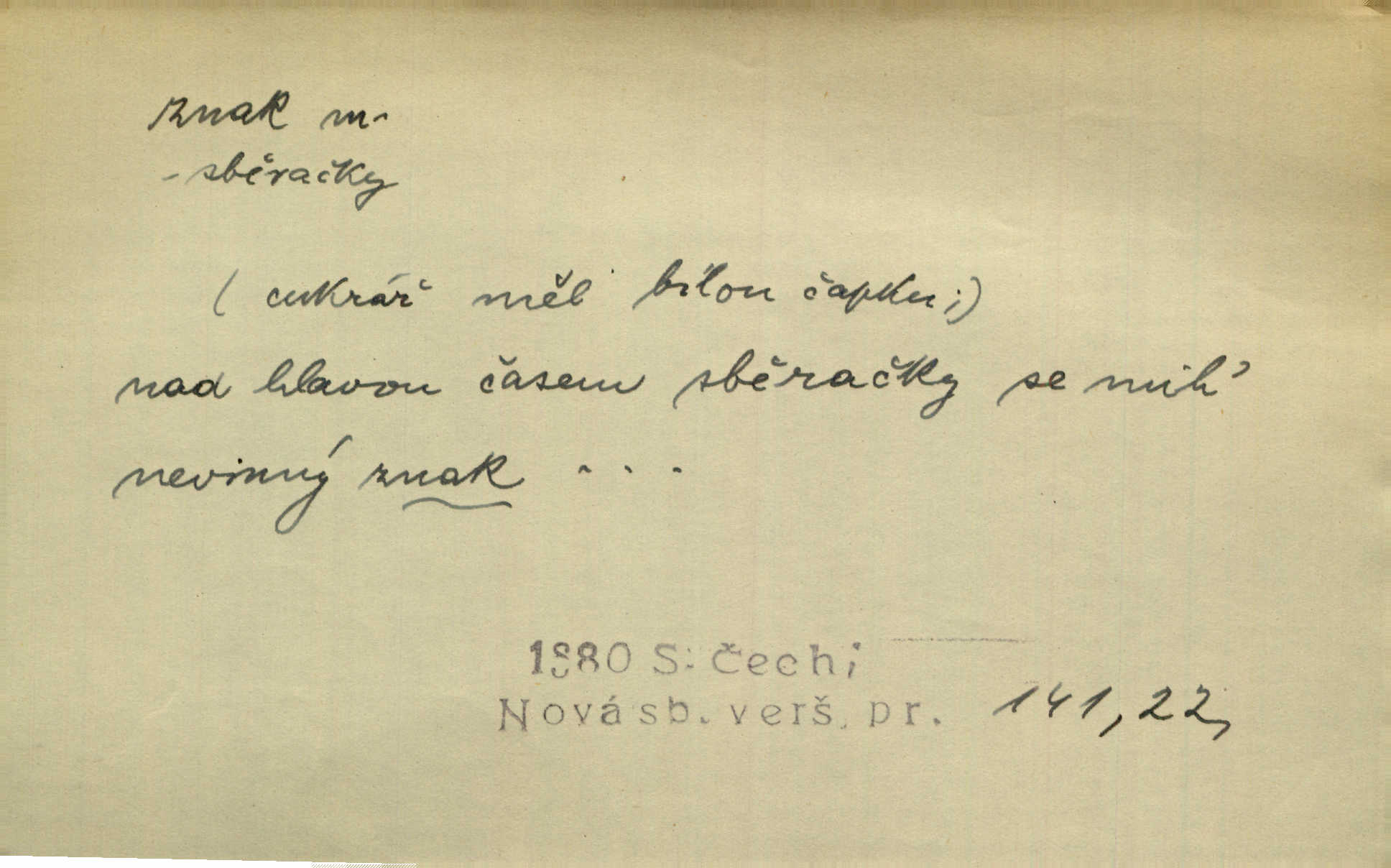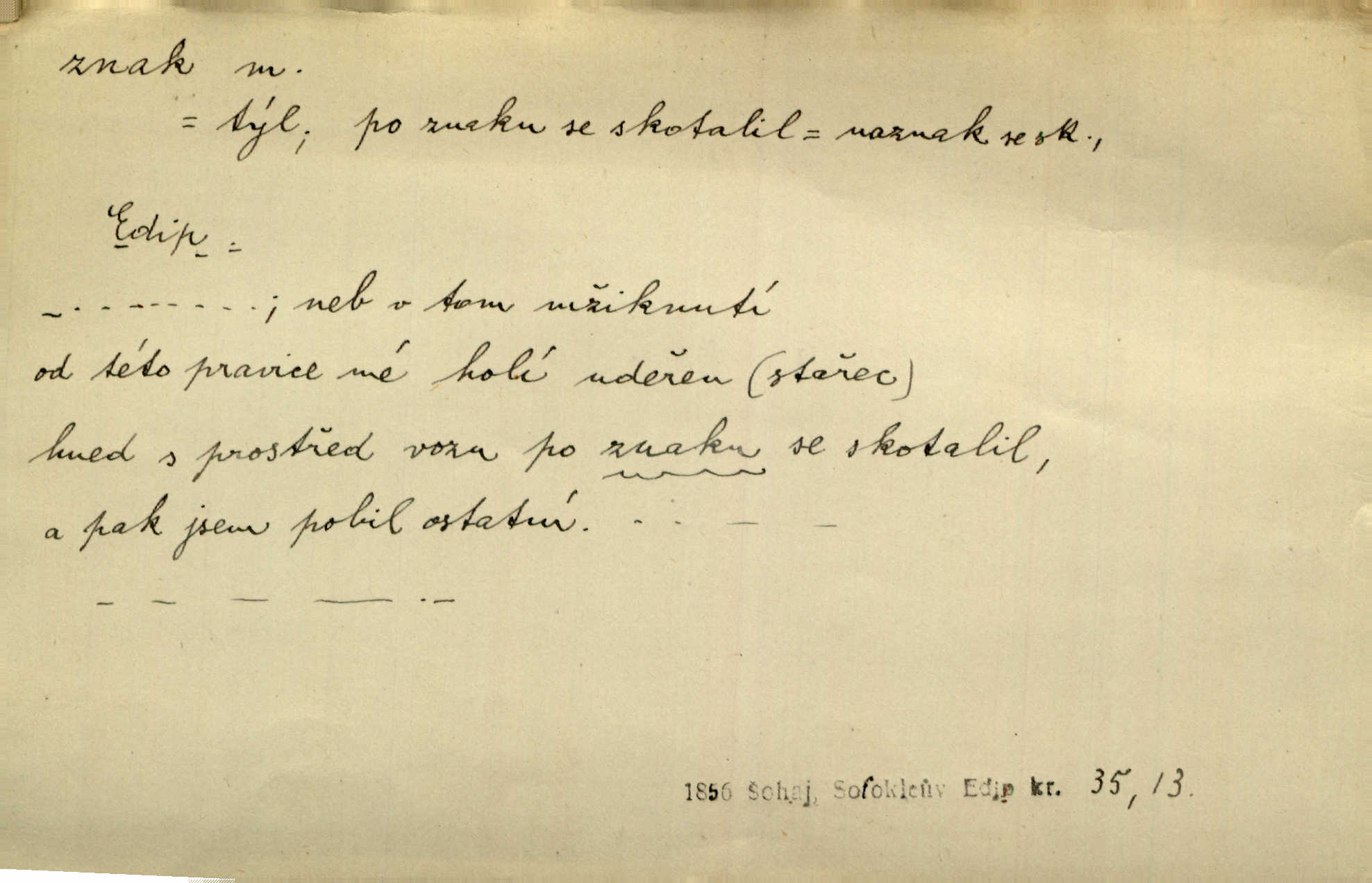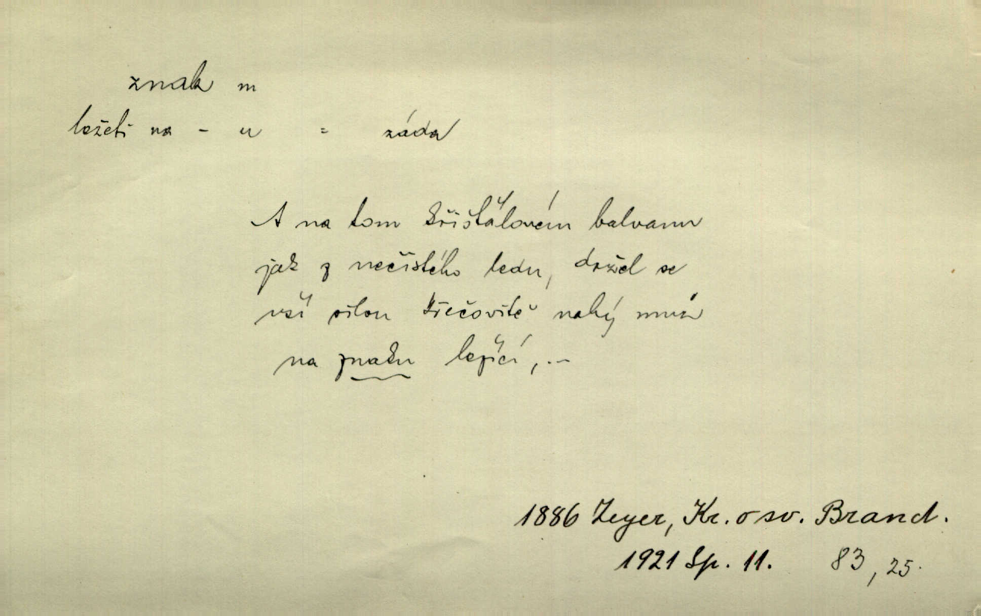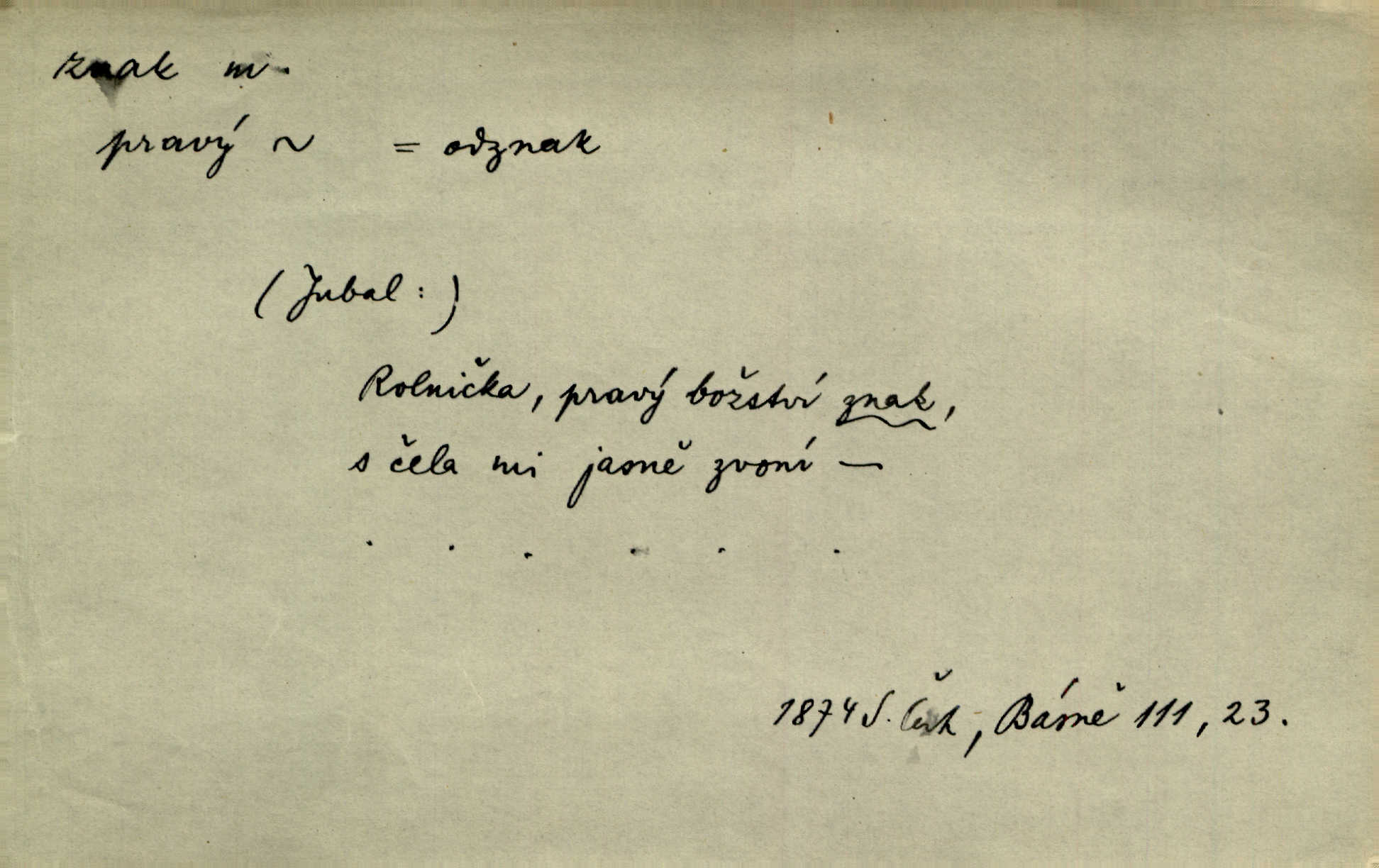 - znak, -u m. 1. význačná, rozlišující vlastnost, charakteristický rys, známka. Jeho chování, jeho výraz, jeho tón, vše neslo znak rozrušení. Dyk. Objevovaly se znaky, které ukazovaly somnambulní ráz jeho poesie. Hrb. Historičnost jest znakem osvícenější doby. Durd. [Byron byl] proti křivdě břitký bitec, za svatý znak osvobození a práva nadšenec, fanatik, dobyvatel, mučedlník. Krás. Tato činnost obviněného vyčerpává zákonné skutkové znaky velezrady. Ml. fronta. K pubertě [u kretena] nedochází, v důsledku čehož se nerozví její druhotné pohlavní znaky. Mělka. Zast. Po královně ani znaku nezůstalo, mimo krásné šaty ani stopy. Něm. Biol. znaky, dědičné, dominantní, recesivní a j. Log. určující prvek při stanovení pojmu. Účet. znak účtu symbolické označení zařazení účtu v nějakém souboru, na př. označení účtu písmenem nebo číslicemi v účtovací osnově. Číslicový znak účtu. D viditelná značka, předmět sloužící k označení něčeho n. k dorozumívání; viditelné znamení nějaké hodnosti, příslušnosti k nějakému celku, odznak. Na stehnách mívají [koně] vždycky vypálený znak F. J. Havl. Pod vypínajícím se sklepením jeskyně, na kamenu popsaném tajemnými znaky, usedla jakoby v snění. Frič. Hlavním zobrazovacím prostředkem japonské řeči zůstávají ještě dnes znaky čínské. Výb. Vlastnoručně byla křížek sňala a jí [dceři] ho s napomenutím doručila, aby svatý tento znak na své místo pověsila. Svět. Už v sedmihvězdném projíždí se [cherub noci] voze, na skráni korunu, co vlády znak. Heyd. Bič nosil v ruce jen pro strach a ze zvyku, také že to byl znak jeho zaměstnání. Něm. Na náramenících důstojníků jsou kromě hodností také rozlišovací znaky distinkce. Ml. fronta. Hrdě nesli žáci státních učilišť v průvodu znak pracovních záloh. Ml. fronta. Prodám německého ovčáka, černožluté znaky. Nár. p. Mezi dvěma, na téže řádce volně spojenými znaky [těsnopisnými] čte se zpravidla samohláska „e“ — Slabý-Mat. Zool. znaky světlá, ohraničená místa srsti ssavců (psů, koní a pod.), důležitá při podávání popisu ssavců. Žel. návěstní znak určitý způsob návěstí. Typ. znak grafický záznam pro hlásku, slabiku, slovo atd.; obraz tiskového prvku na odlitku neb matrici. Voj. znaky poznávací, signální, smluvené, volací, váhové znaky střel a j. D Ling. jazyk jako systém znaků (v strukturalismu). D šlechtický, státní a j. erb. Ctibor za svůj hrdinský kus stal se rytířem a do znaku dostal kus loukotě s třemi špicemi. Něm. Znakem jejich [Leopardů] byl červený lev v bílém poli. Vrch. Levou rukou držel [rytíř] štít se Staroměstským znakem. Erb. Státní znak a vlajky upravuje zákon. Ústava.
