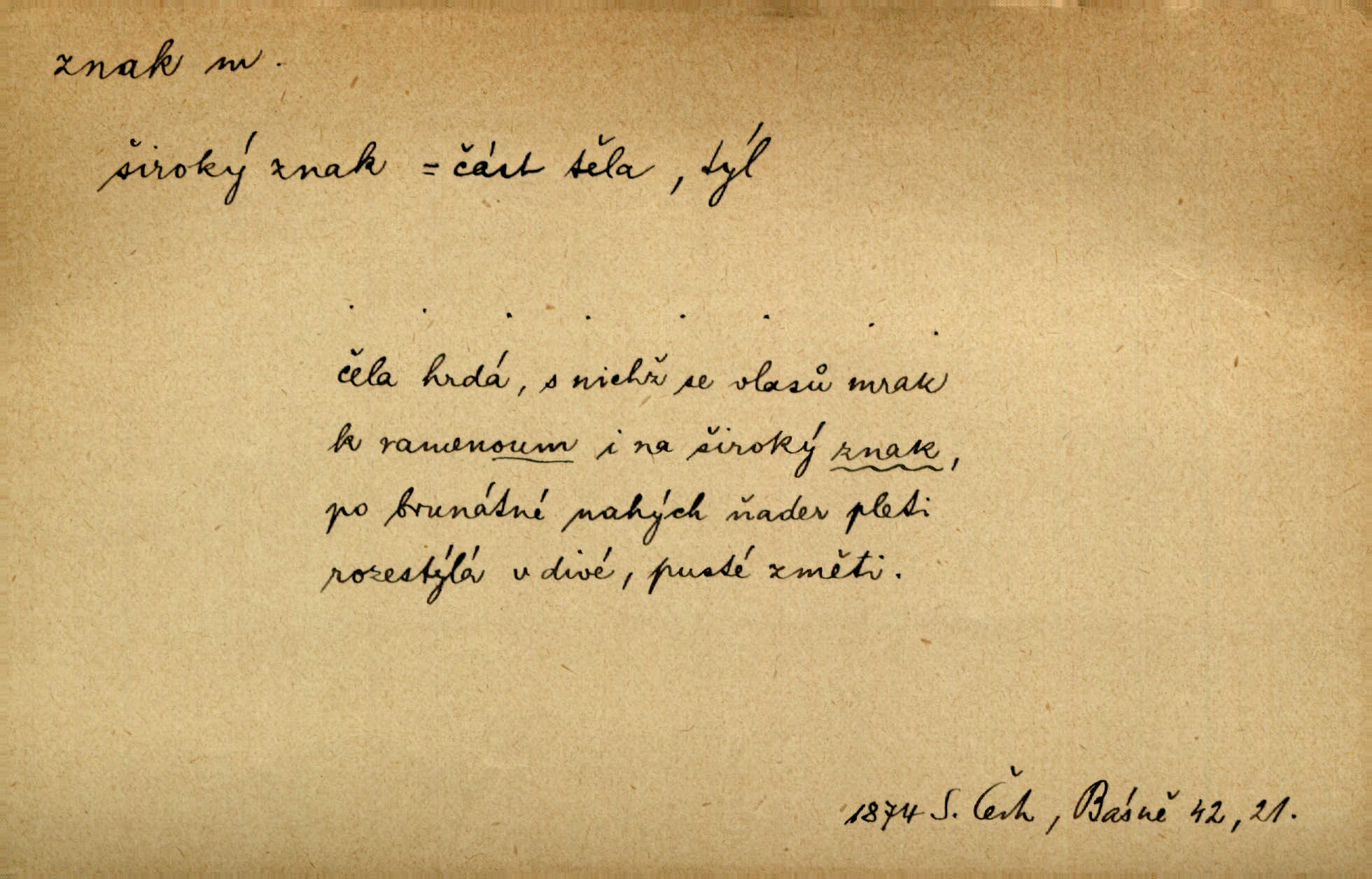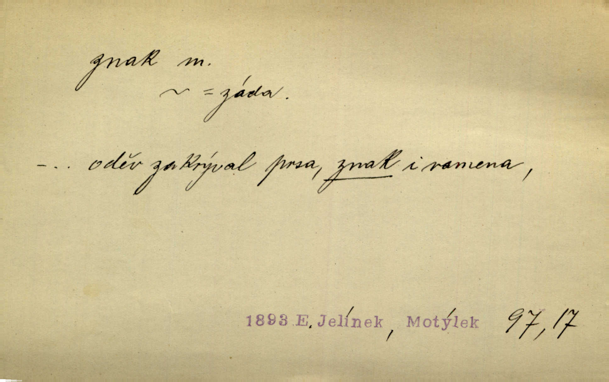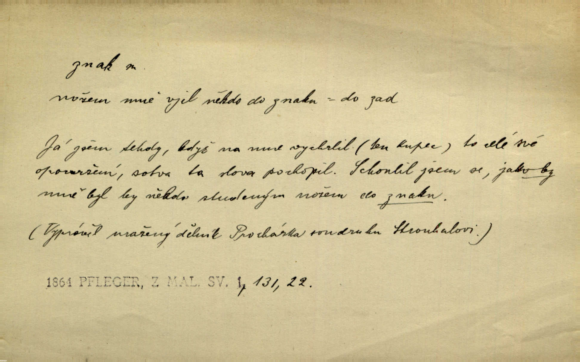 - znak, -u m. 2. horní část zad za krkem, týl, šíje; záda. Svalnatá ruka chytla mne za znak, a než jsem se vzpamatovati mohl — letěl jsem se schodů. E. Jel. Padá mu [rosa Bartoňovi] se stébel a klasů do týla a odtud na znak. Hol. Mrtvý v rakvi leží na znaku. Ner. Baruška nemohla schvalovati jich [služek] rozpustilý život za znakem paní před paní zatajovaný. Něm. Ve znaku to chrupe, když vrcholku [Alp] dohlídnouti žádáš. Vin. V domácím prostředí plaval 50 m znak za 33,5 vt. Več. Čes. sl. Sport. znak plavecký styl, plování naznak.
