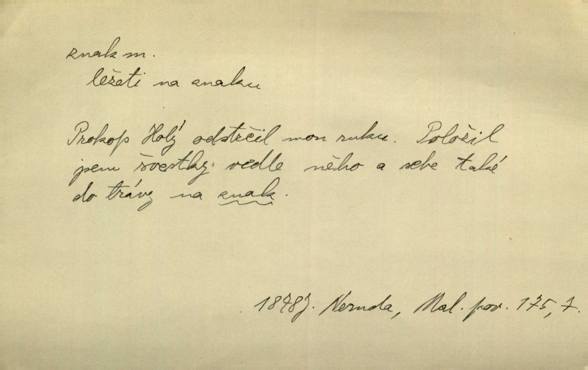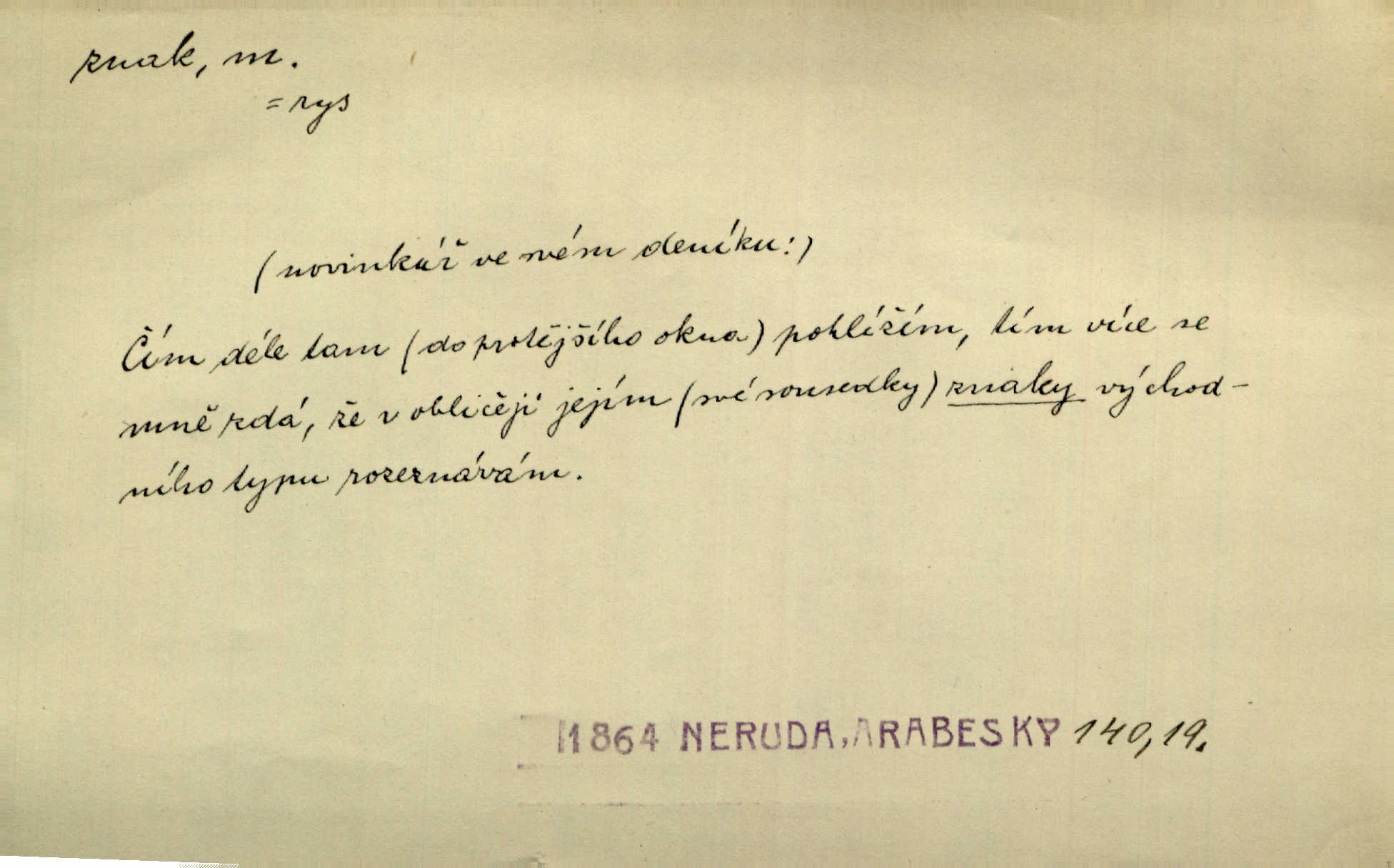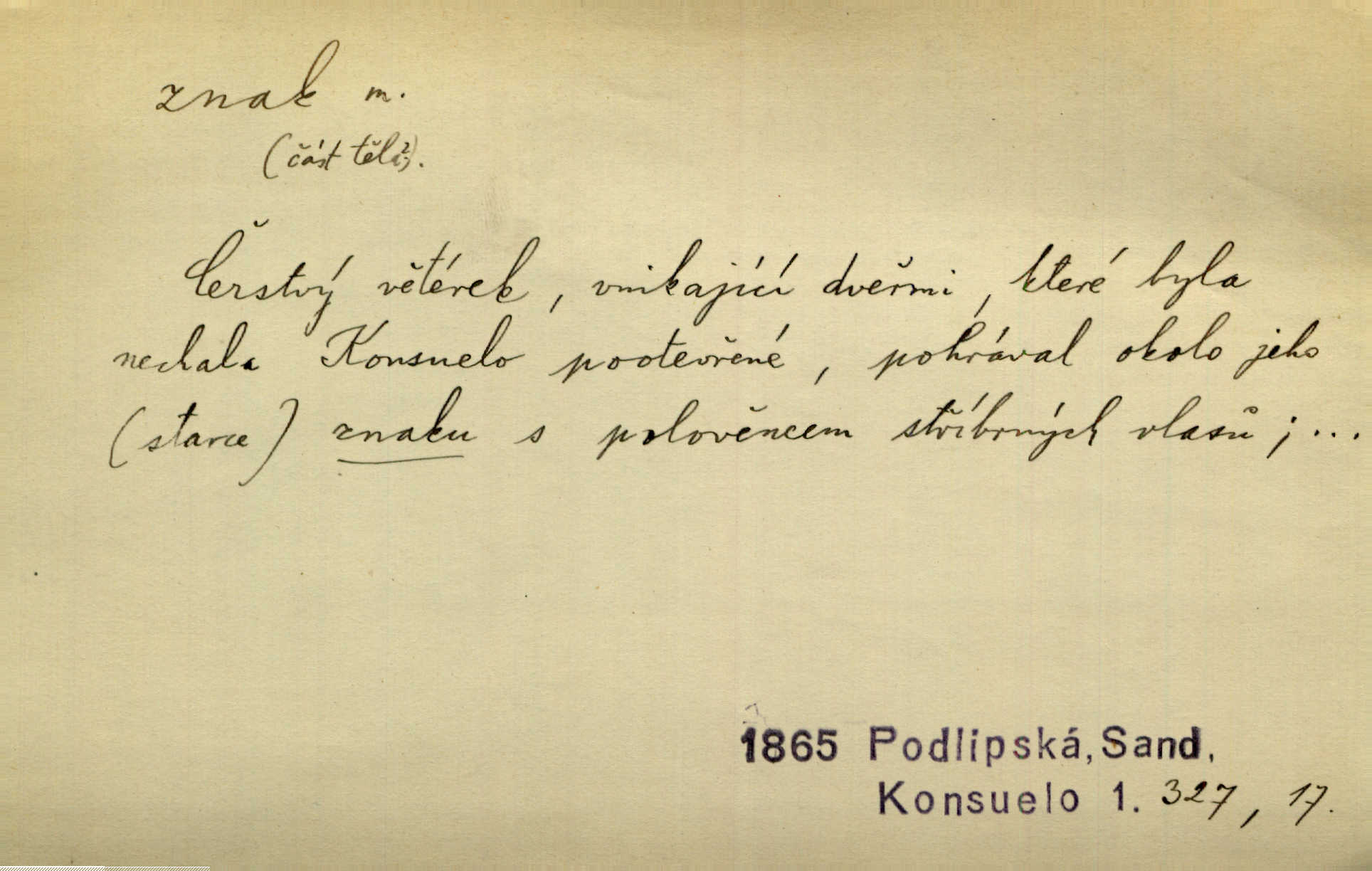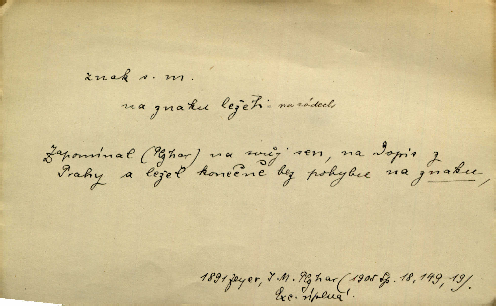 - znak, -u m. 2. horní část zad za krkem, týl, šíje; záda. Svalnatá ruka chytla mne za znak, a než jsem se vzpamatovati mohl — letěl jsem se schodů. E. Jel. Padá mu [rosa Bartoňovi] se stébel a klasů do týla a odtud na znak. Hol. Mrtvý v rakvi leží na znaku. Ner. Baruška nemohla schvalovati jich [služek] rozpustilý život za znakem paní před paní zatajovaný. Něm. Ve znaku to chrupe, když vrcholku [Alp] dohlídnouti žádáš. Vin. V domácím prostředí plaval 50 m znak za 33,5 vt. Več. Čes. sl. Sport. znak plavecký styl, plování naznak.