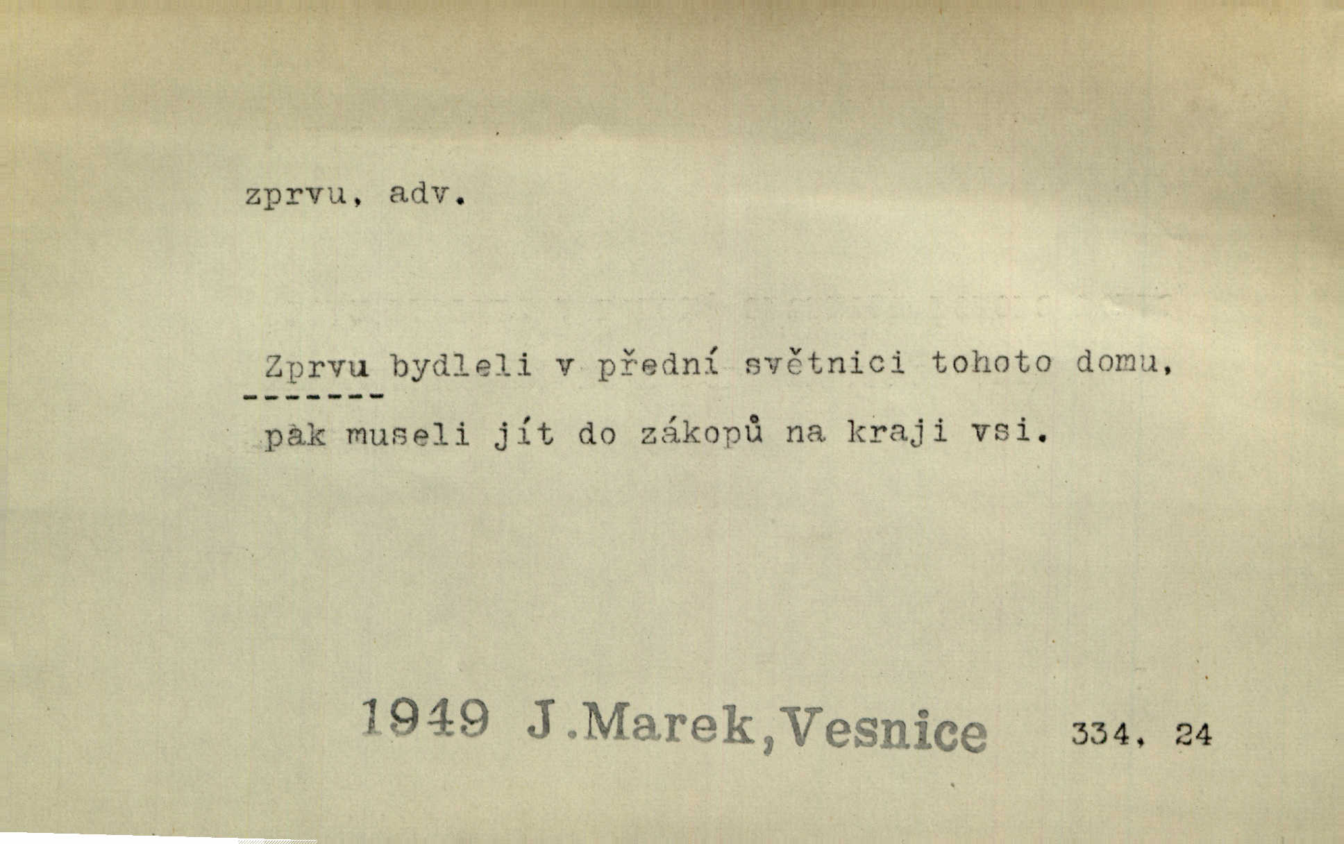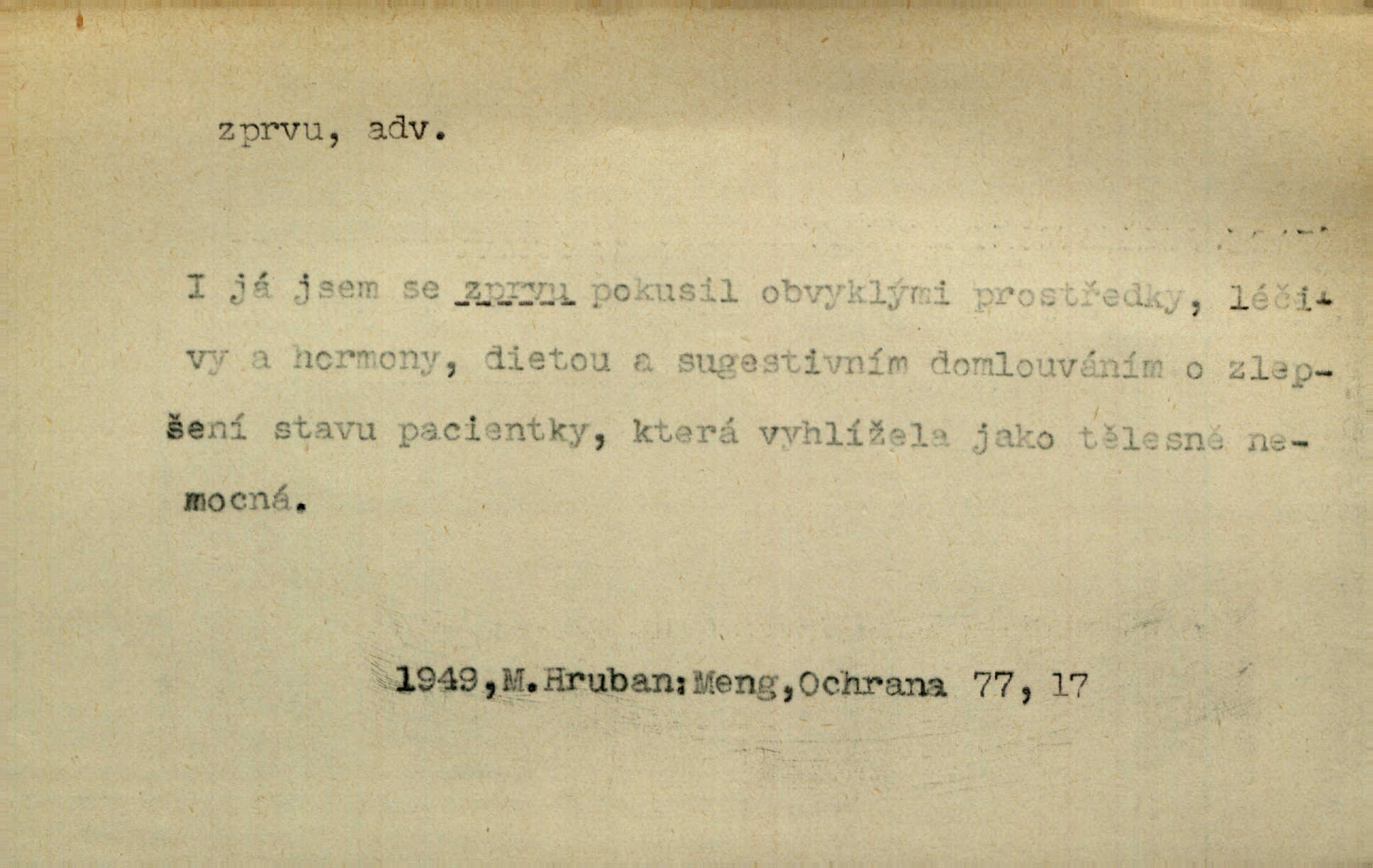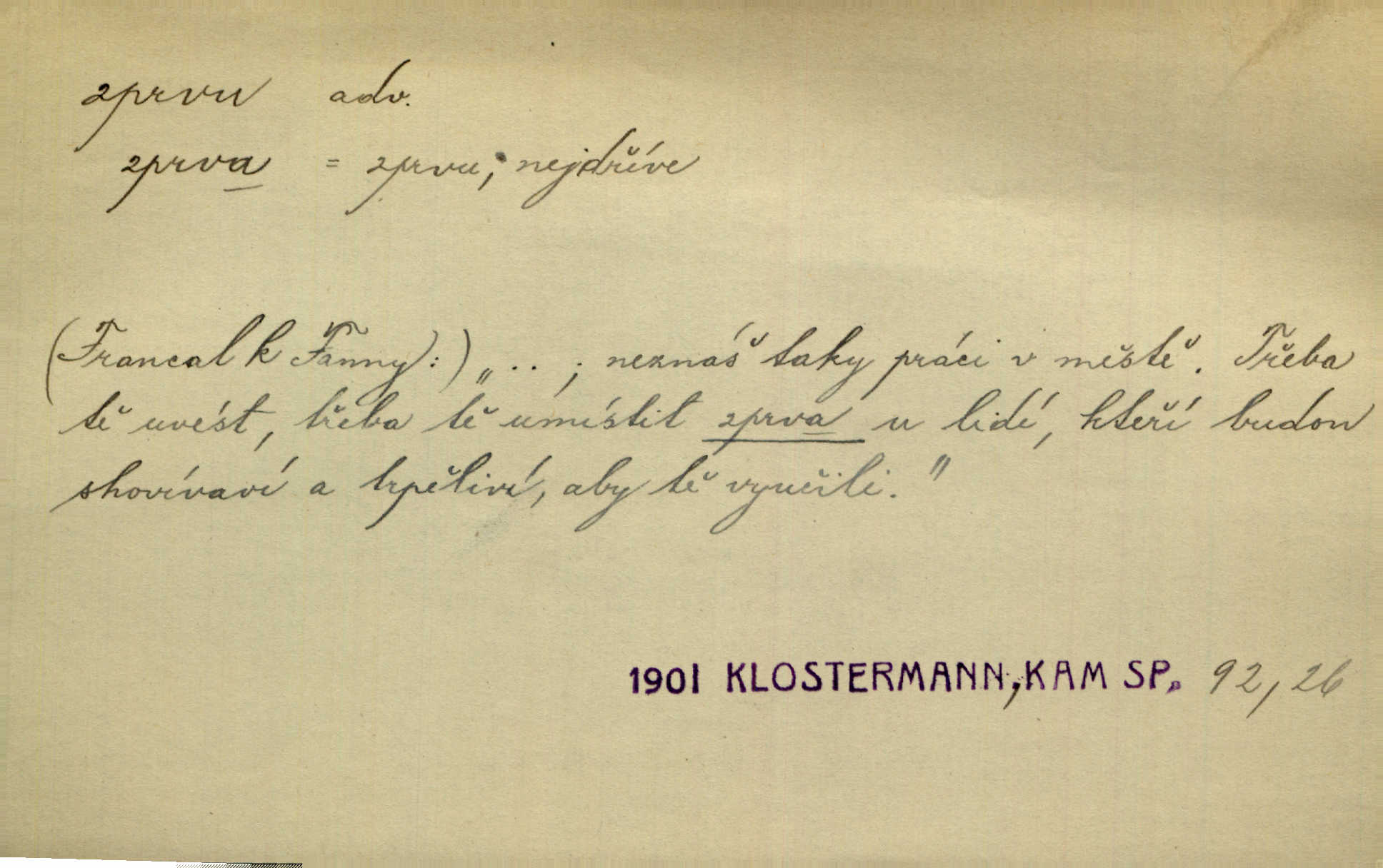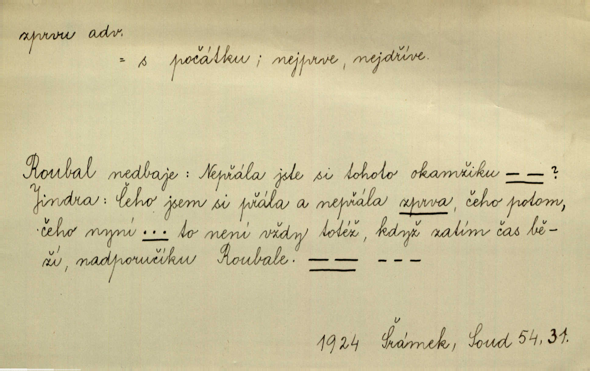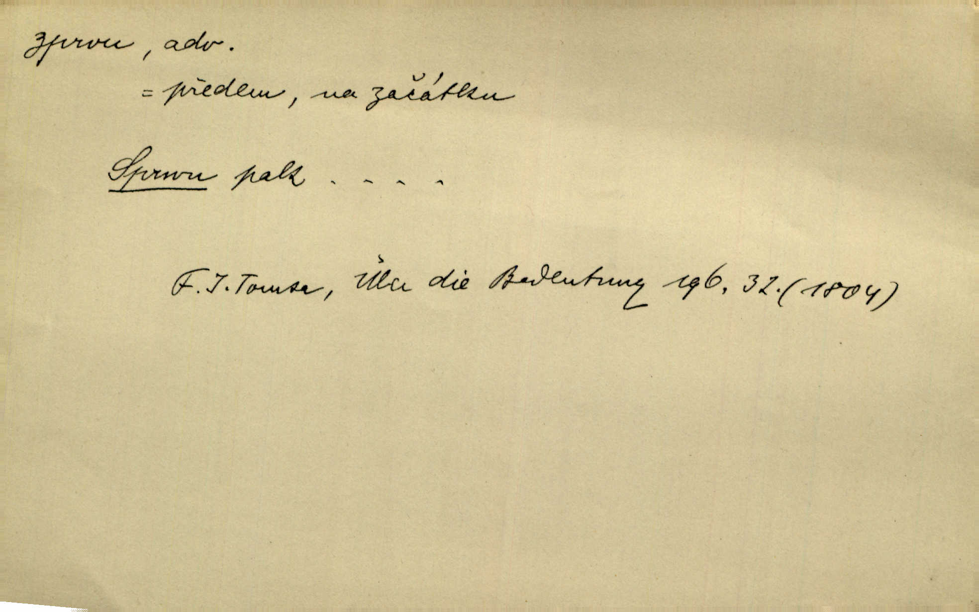- zprvu (zř. zprva, zprv) adv. z počátku, nejprve, nejdříve. Avšak přec se srdcem tak těžkým od sebe jí nepropouštěli, jak zprvu si myslili. Svět. Jej zprvu nejvíce hnětlo, že poslední vůle šlechtického jeho přítele dosud neprovedena. Jir. Ubožák odpovídal zprvu trochu zaraženě. Vanč. Trpaslík soudil hned zprva, že není nikoho na zemi. Havl. Zprv po domě stesk mě jímal tuze. Klášt. [Panímáma] odtrhla se od těch vzpomínek zprvu na chvíli, pak už na dobro. V. Mrš. Hoši zprva byli překvapeni, ale pak i oni ukázali zuby. Šrám. Zprvu s bolestí a později s trpkou resignací studoval. Čech.