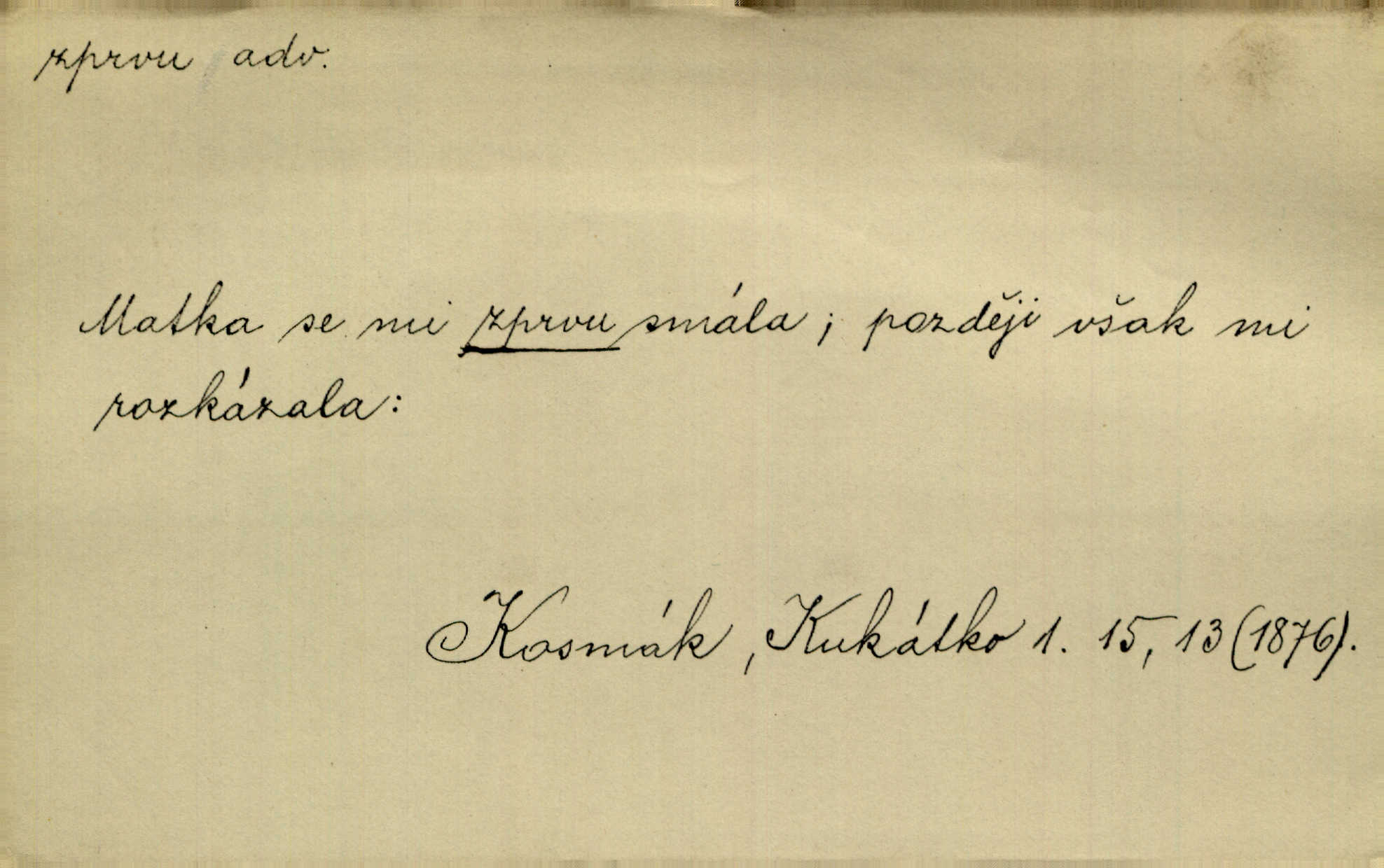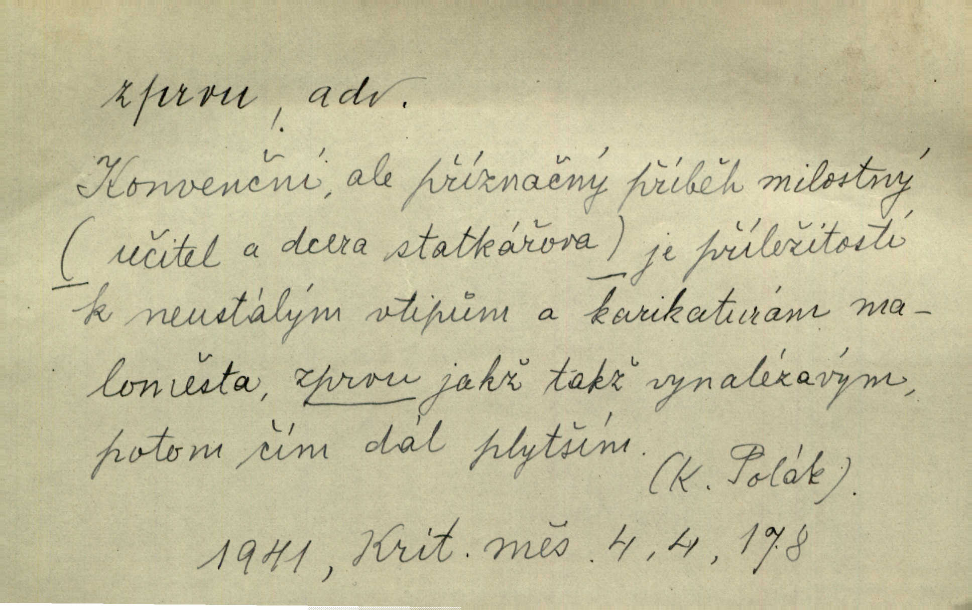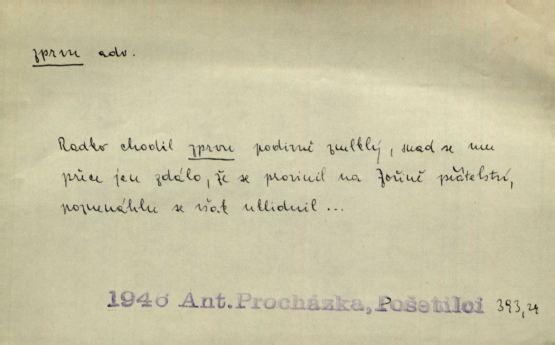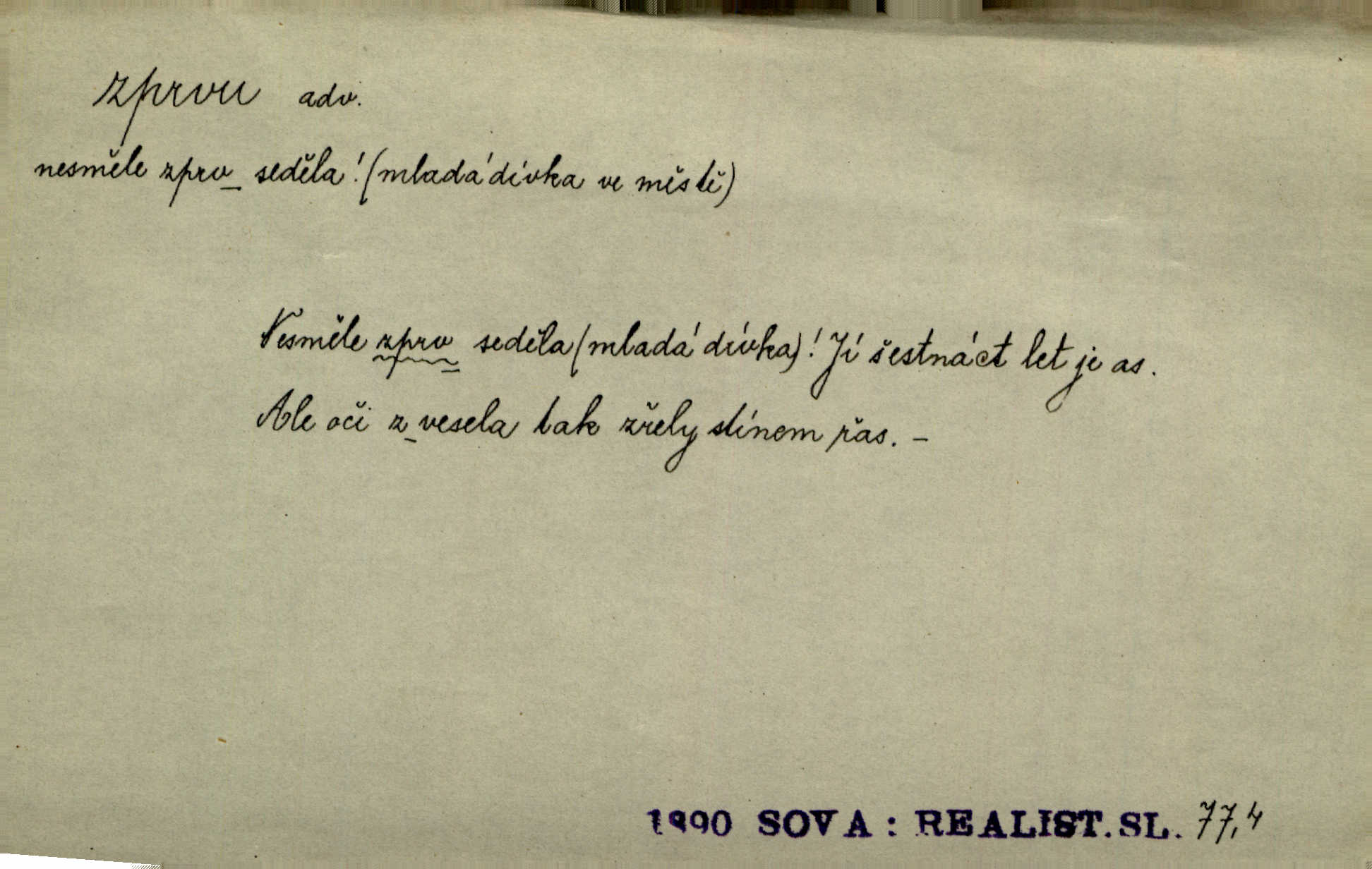 - zprvu (zř. zprva, zprv) adv. z počátku, nejprve, nejdříve. Avšak přec se srdcem tak těžkým od sebe jí nepropouštěli, jak zprvu si myslili. Svět. Jej zprvu nejvíce hnětlo, že poslední vůle šlechtického jeho přítele dosud neprovedena. Jir. Ubožák odpovídal zprvu trochu zaraženě. Vanč. Trpaslík soudil hned zprva, že není nikoho na zemi. Havl. Zprv po domě stesk mě jímal tuze. Klášt. [Panímáma] odtrhla se od těch vzpomínek zprvu na chvíli, pak už na dobro. V. Mrš. Hoši zprva byli překvapeni, ale pak i oni ukázali zuby. Šrám. Zprvu s bolestí a později s trpkou resignací studoval. Čech.