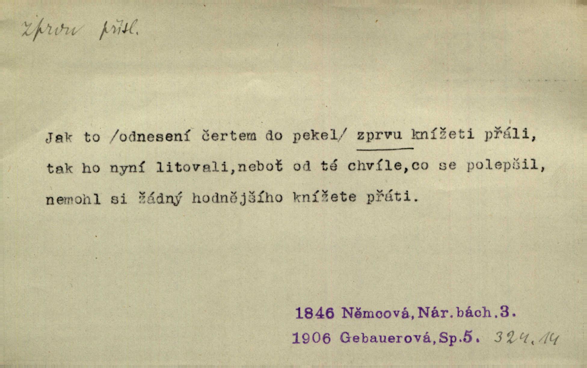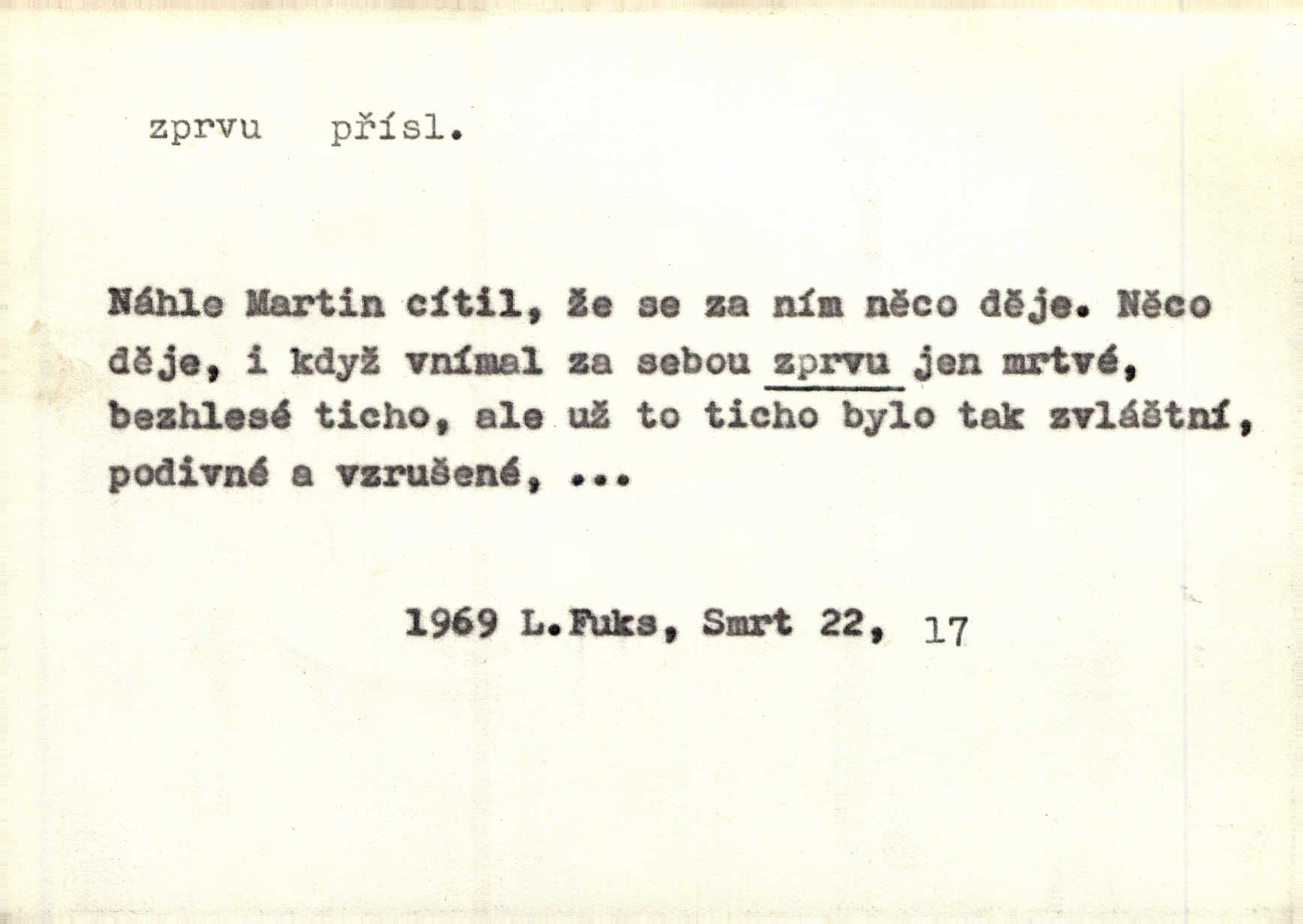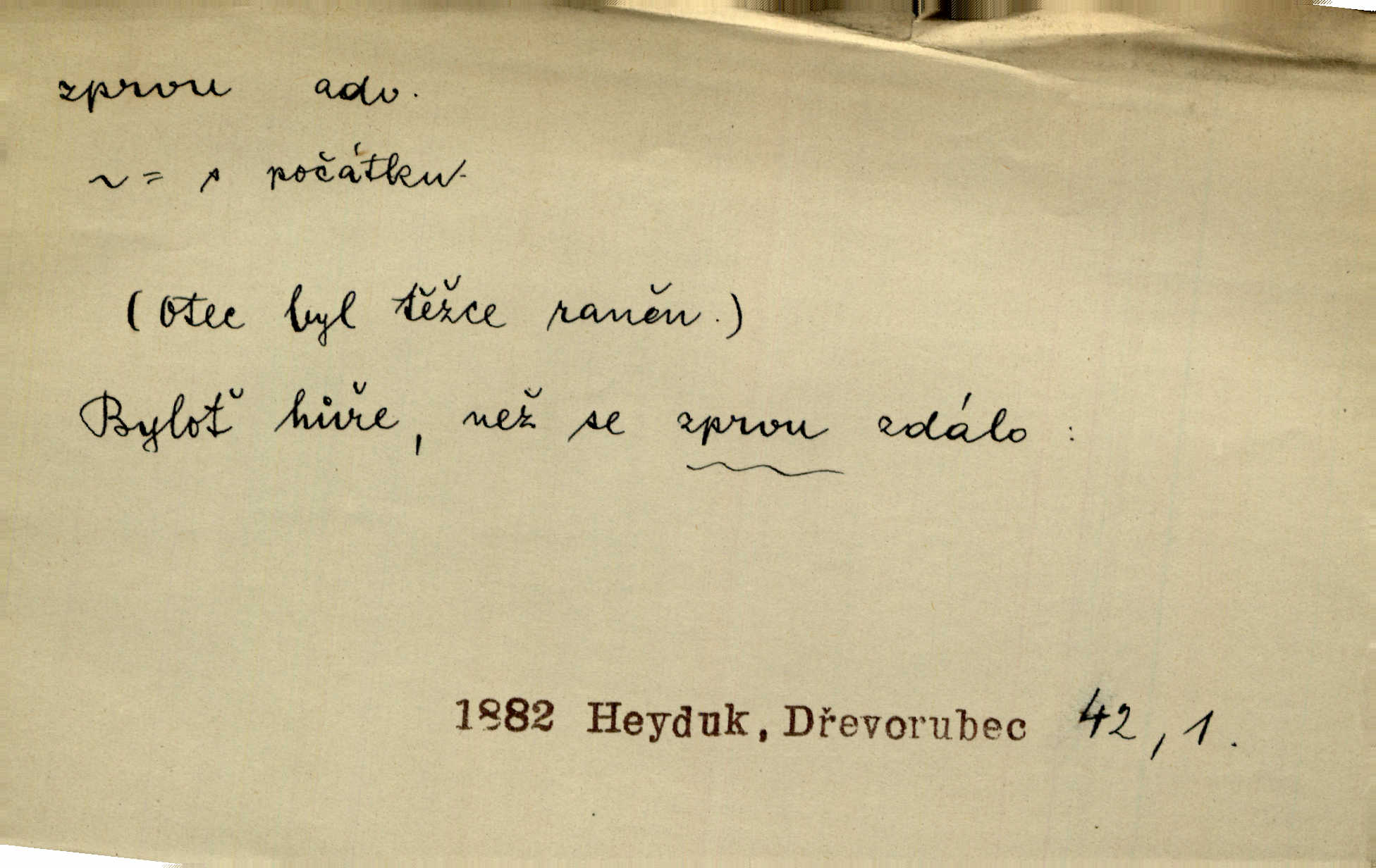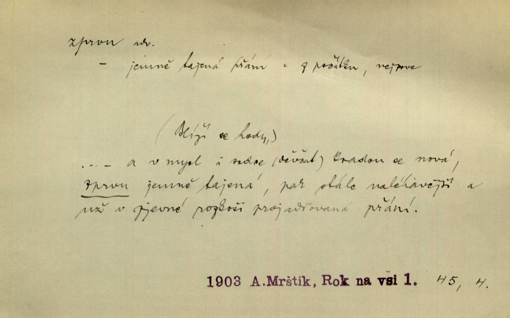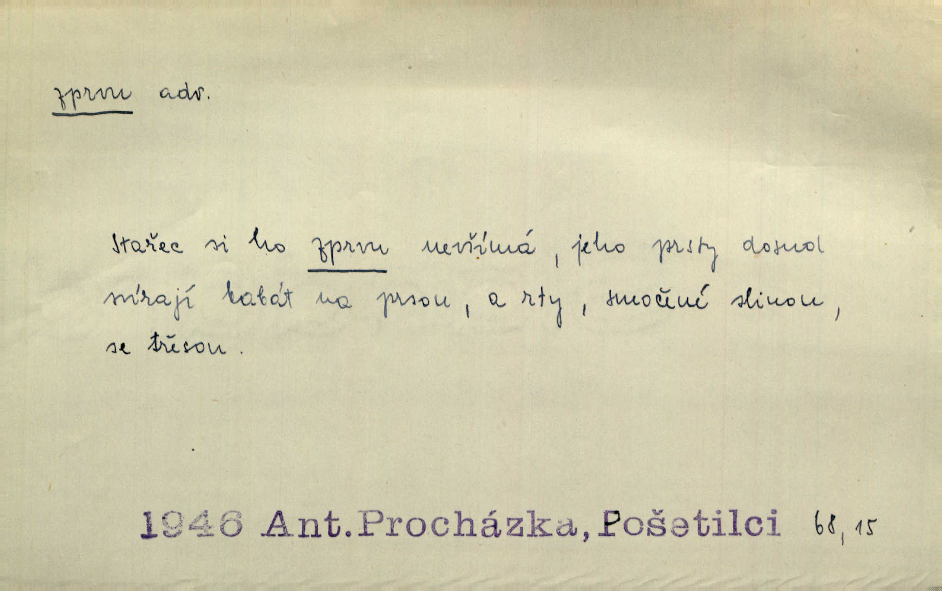 - zprvu (zř. zprva, zprv) adv. z počátku, nejprve, nejdříve. Avšak přec se srdcem tak těžkým od sebe jí nepropouštěli, jak zprvu si myslili. Svět. Jej zprvu nejvíce hnětlo, že poslední vůle šlechtického jeho přítele dosud neprovedena. Jir. Ubožák odpovídal zprvu trochu zaraženě. Vanč. Trpaslík soudil hned zprva, že není nikoho na zemi. Havl. Zprv po domě stesk mě jímal tuze. Klášt. [Panímáma] odtrhla se od těch vzpomínek zprvu na chvíli, pak už na dobro. V. Mrš. Hoši zprva byli překvapeni, ale pak i oni ukázali zuby. Šrám. Zprvu s bolestí a později s trpkou resignací studoval. Čech.