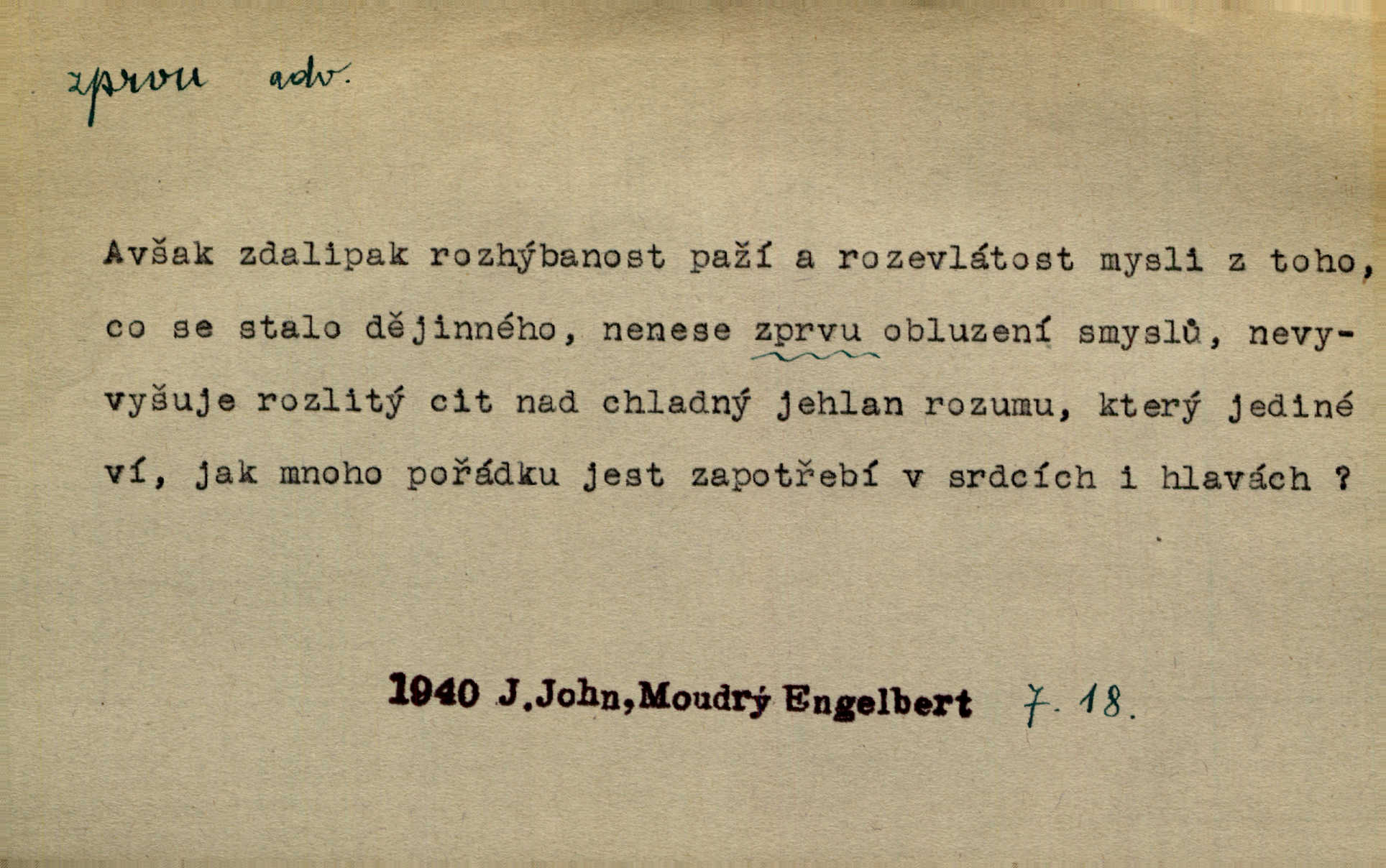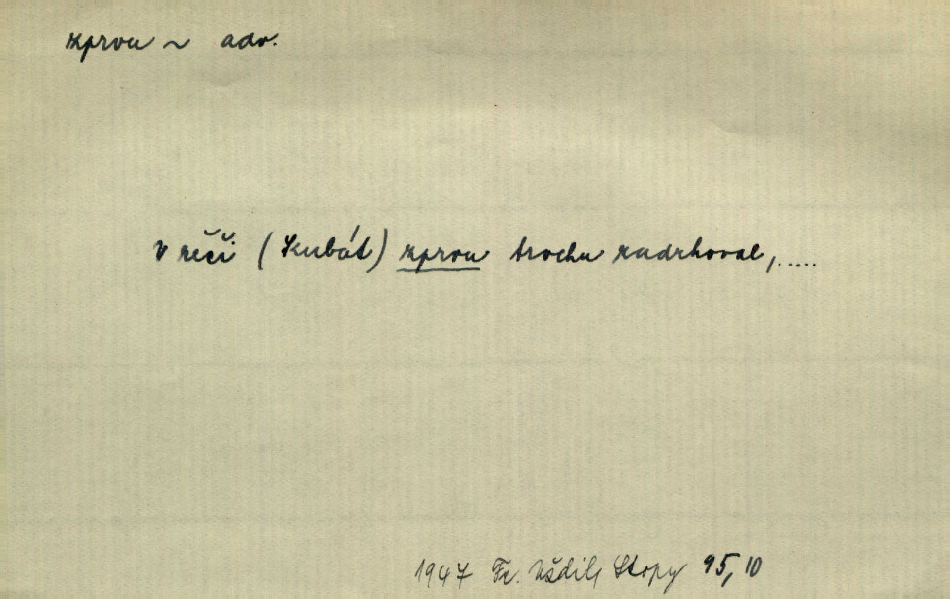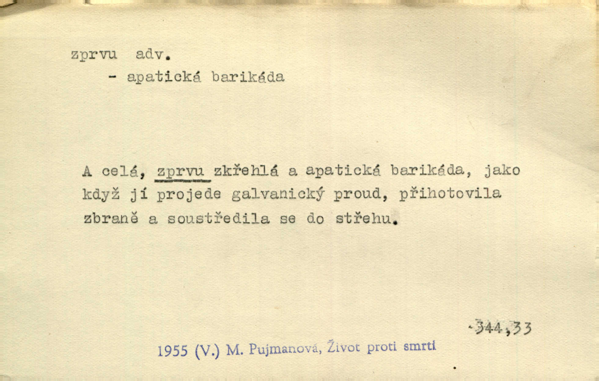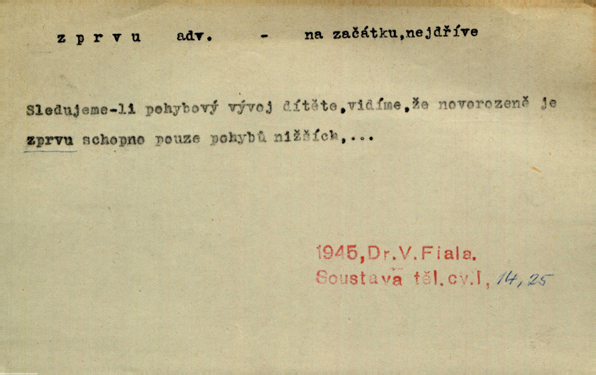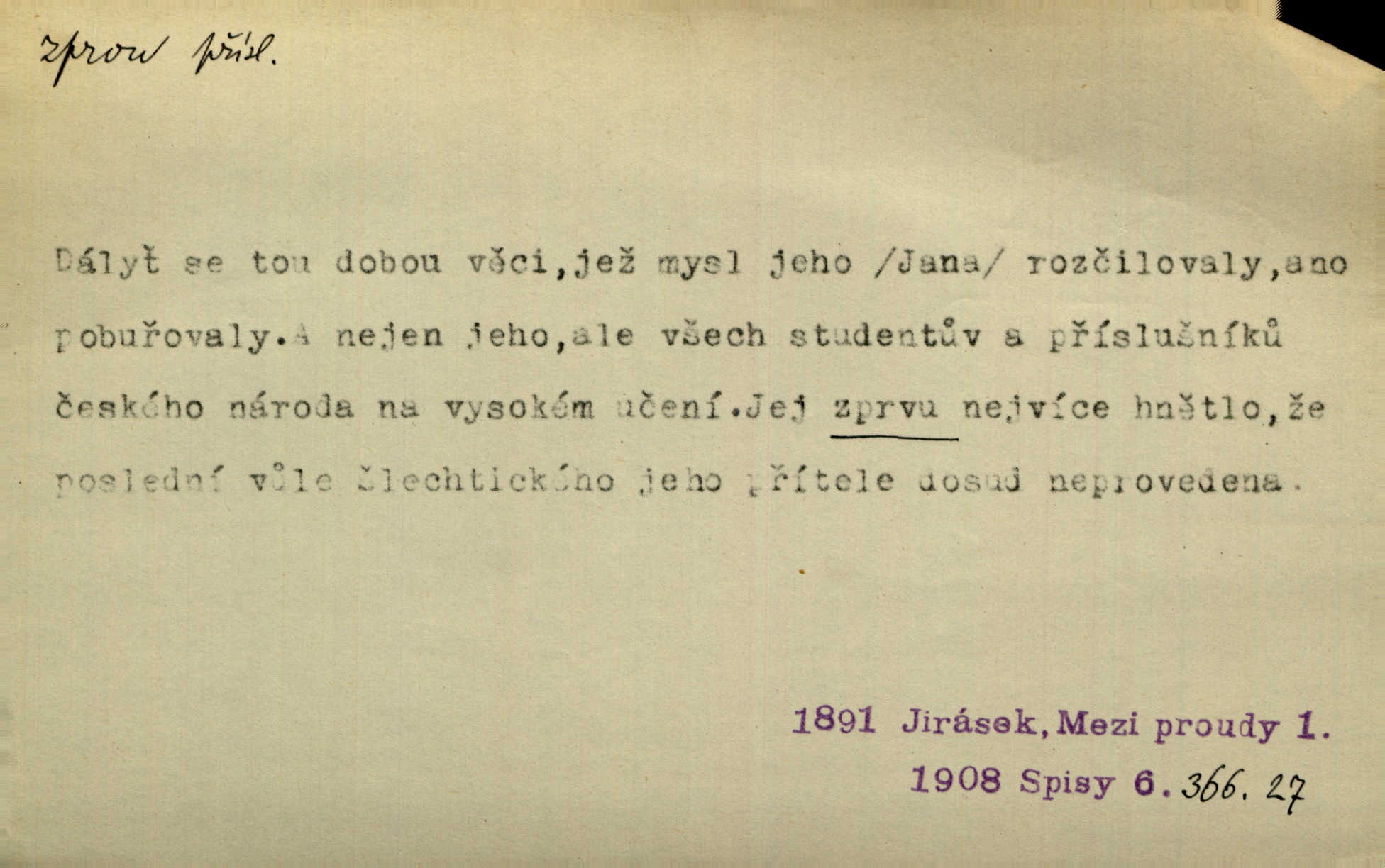 - zprvu (zř. zprva, zprv) adv. z počátku, nejprve, nejdříve. Avšak přec se srdcem tak těžkým od sebe jí nepropouštěli, jak zprvu si myslili. Svět. Jej zprvu nejvíce hnětlo, že poslední vůle šlechtického jeho přítele dosud neprovedena. Jir. Ubožák odpovídal zprvu trochu zaraženě. Vanč. Trpaslík soudil hned zprva, že není nikoho na zemi. Havl. Zprv po domě stesk mě jímal tuze. Klášt. [Panímáma] odtrhla se od těch vzpomínek zprvu na chvíli, pak už na dobro. V. Mrš. Hoši zprva byli překvapeni, ale pak i oni ukázali zuby. Šrám. Zprvu s bolestí a později s trpkou resignací studoval. Čech.