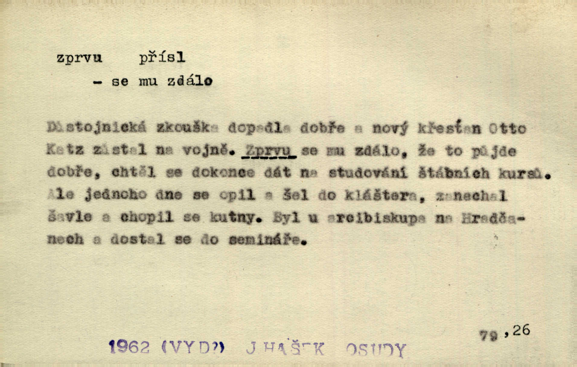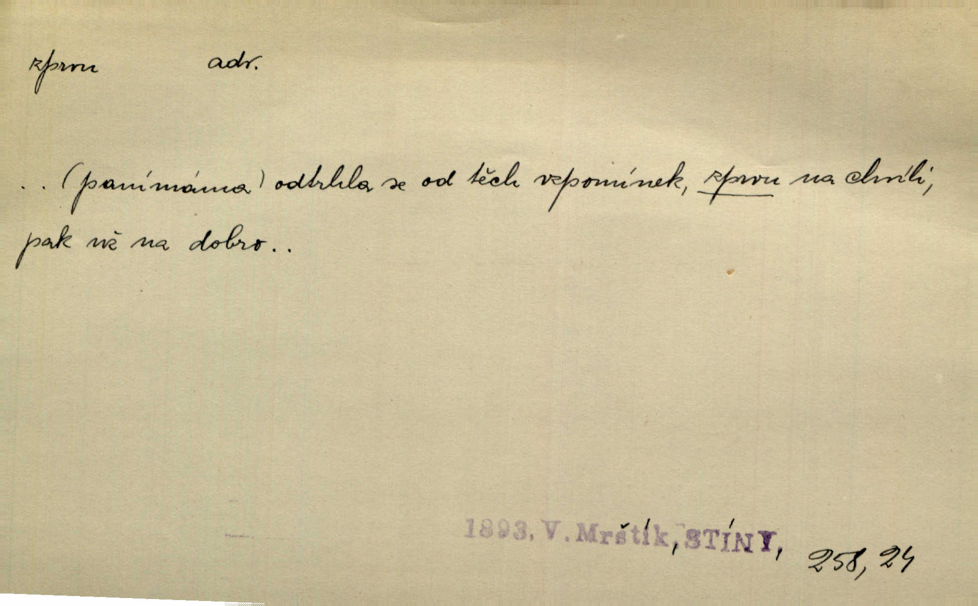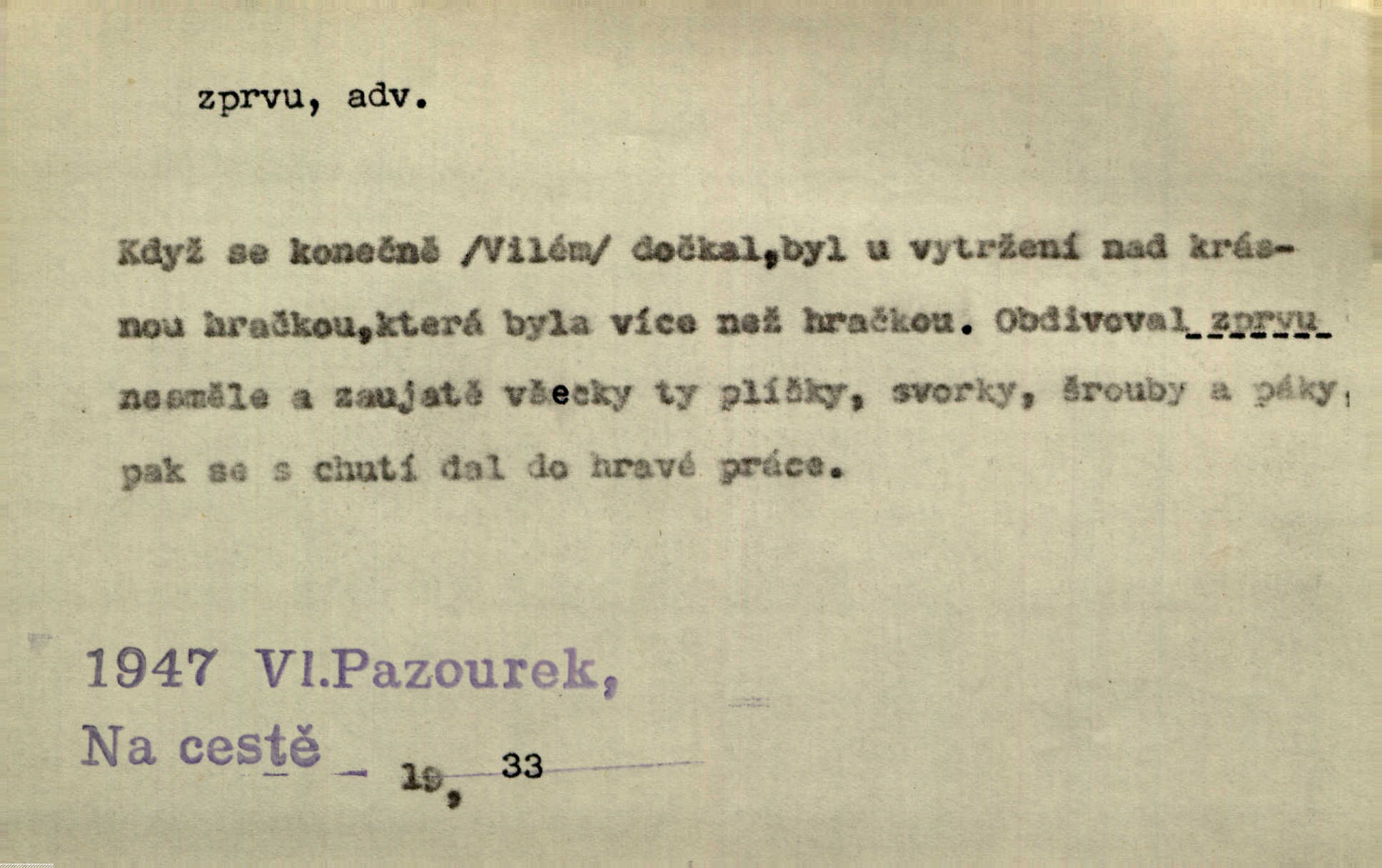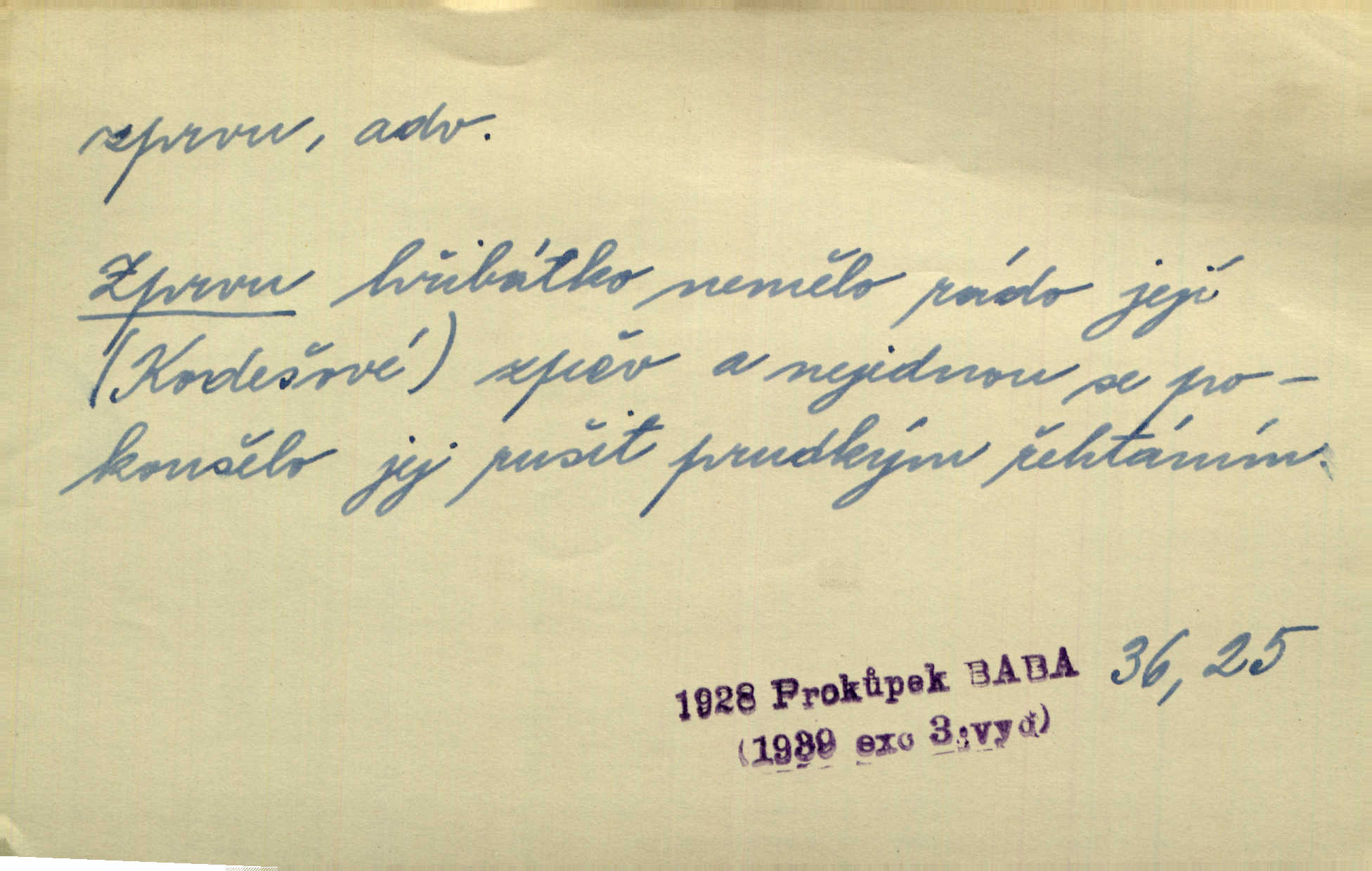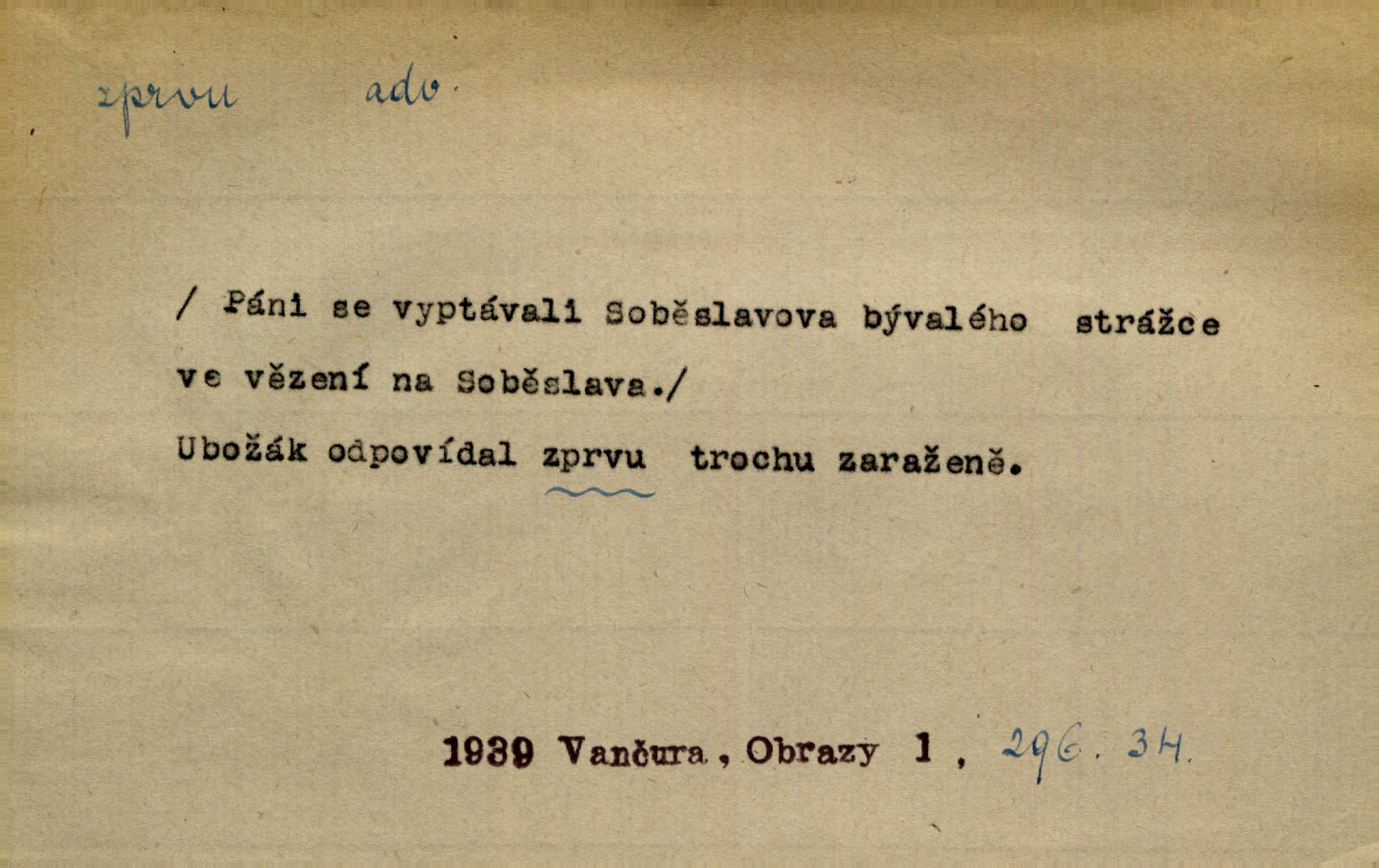 - zprvu (zř. zprva, zprv) adv. z počátku, nejprve, nejdříve. Avšak přec se srdcem tak těžkým od sebe jí nepropouštěli, jak zprvu si myslili. Svět. Jej zprvu nejvíce hnětlo, že poslední vůle šlechtického jeho přítele dosud neprovedena. Jir. Ubožák odpovídal zprvu trochu zaraženě. Vanč. Trpaslík soudil hned zprva, že není nikoho na zemi. Havl. Zprv po domě stesk mě jímal tuze. Klášt. [Panímáma] odtrhla se od těch vzpomínek zprvu na chvíli, pak už na dobro. V. Mrš. Hoši zprva byli překvapeni, ale pak i oni ukázali zuby. Šrám. Zprvu s bolestí a později s trpkou resignací studoval. Čech.