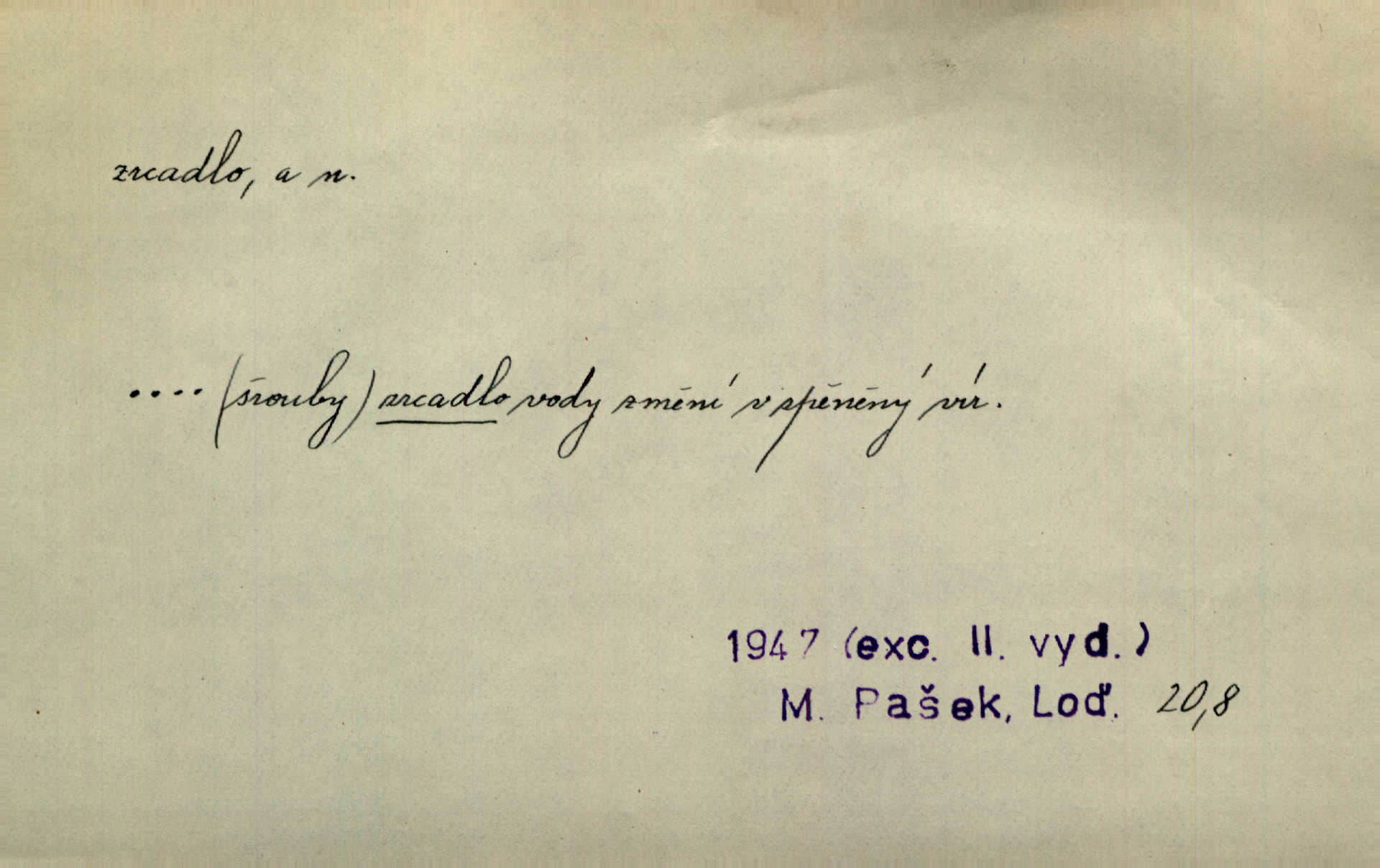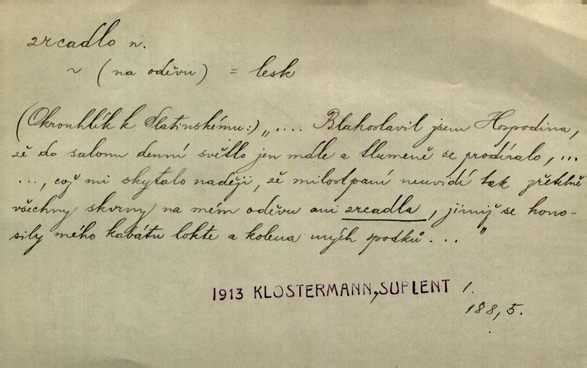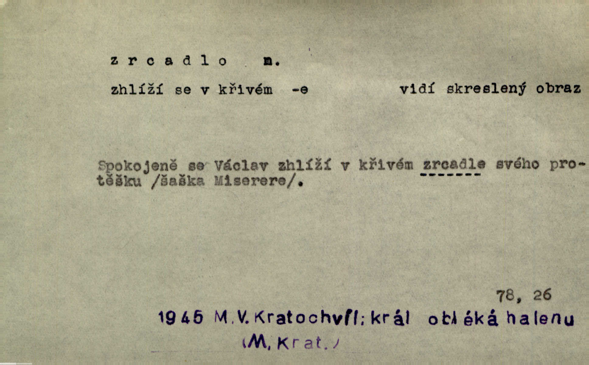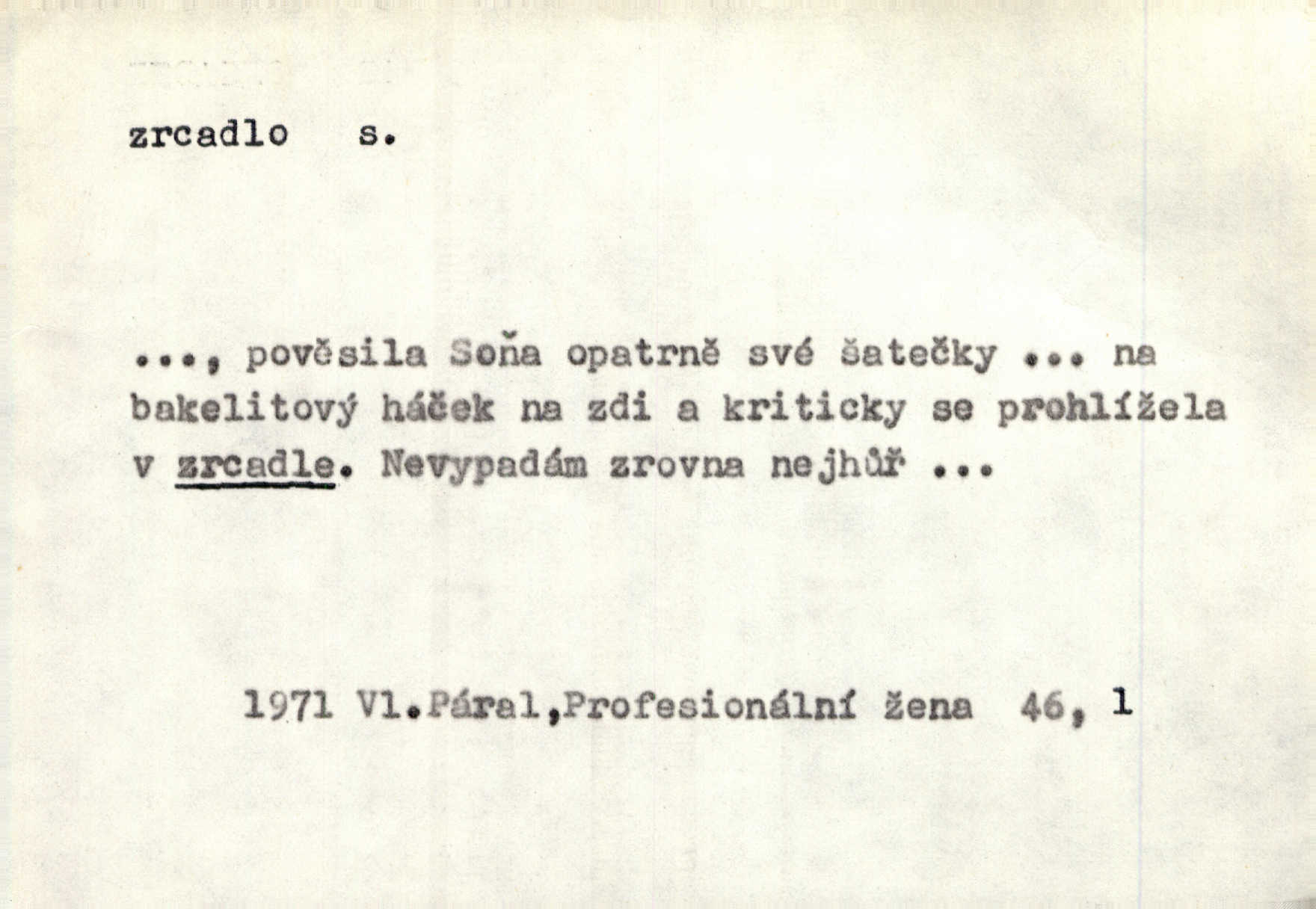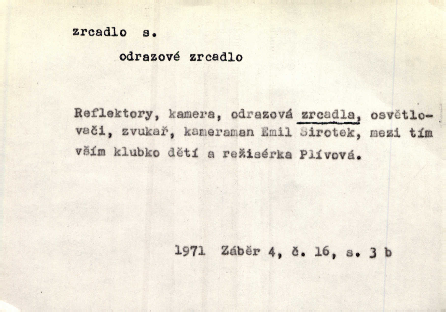 - zrcadlo, -a n. skleněná deska, uzpůsobená nanesením lesklé kovové vrstvy na spodní plochu k vytváření plošného obrazu předmětu, před ní postaveného, odražením paprsků. Poskočila s jedné nohy na druhou a vyplázla na sebe do zrcadla jazyk. K. J. Ben. I přiložili matce zrcadlo k ústům, zdali se zarosí a zdali matka žije. Herb. Zrcadla planou a sklenice řinčí [v kavárně]. K. Čap. Moravský průmysl skla a zrcadel. Úř. l. Mlýn stojí až dole v rovině, která jako zrcadlo leží až k Ronovu a Rožďalovicům rovná. Mach. Vše stopeno ve lůno vod, jak v zrcadle se zhlíží. Mácha. Krátká srsť [hřebice] byla uhlazena a zrcadlem se leskla. Hol. Byly [boty] jako zrcadlo leskly se. Jir. A chystá se to [mráz], západ je jako zrcadlo vyjasněný, čistý. Rais. Pěstounka a s chovanka se do sebe hleděly jako do zrcadla měly se rády. Svět. Klotilda viděla na babičce jako v zrcadle, že paráda a marnost člověka nesytí a neživí jasně, zřetelně. Prav. Vláda pronásledující a utlačující opposiční noviny sama rozbíjí neklamné zrcadlo, ve kterém by viděti mohla pravé vady své. Havl. Žádné zrcadlo bez prášku není každý má nějakou chybu. Čech. Tys mi při přelíčení podržel zrcadlo, že jsem sebe v něm viděl tak, jaký jsem pověděl pravdu. Šmil. Expr. lid. Neuvidí skvrny na mém oděvu ani zrcadla, jimiž se honosily mého kabátu lokte a kolena mých spodků odřená, lesklá místa látky. Klost. Přen. Zrcadlo vzpomínek mu vypadlo z dlaní a rozbilo se nebyl schopen vzpomínati. K. J. Ben. Tech. hladká pravidelná plocha, která odráží světlo. Rovinné, sférické, parabolické, duté, vypuklé a j. zrcadlo. Výr. benátské zrcadlo. Chem. arsenové, antimonové, stříbrné a j. zrcadlo. Geol. lesklé, uhlazené smykové plochy, zvl. v uhelných vrstvách, vzniklé třením a obrusem mezi porušenými vrstvami. Zrcadla uhlí. Bot., les. dřeňový paprsek dřeva v podobě světlého, často lesklého pruhu, pruh zrcadlový, zrcadélko (na př. u dubu, buku a j.). Dopr. přední část perutě kormidla u nákladních člunů labských, vyplňující prázdný trojúhelníkový kout mezi zádí lodi a pněm kormidla. Stav. vodorovné pole, obyč. obdélníkové, ve vrcholu zrcadlové klenby. Lék. zrcadlo konečníkové, poševní, rozvírací, lžicové a j. Mysl. světlá, zprav. bílá část zakončení trupu zvěře pod ocasem. Bílá skvrna v ohbí křídel zvěře tetřevovité. Zelená lesklá péra na klobouku z křídel divokých kachen. Hosp. zrcadlo mléčné část kůže na zadní hrázové straně vemene s chlupy rostlými nahoru. Les. zrcadlo housenek shluk právě vylíhlých housenek lesních škůdců, které ještě několik dnů zůstávají pohromadě na místě, kde byla nakladena vajíčka. Typ. přesný rozvrh umístění obrázků a textu pro knižní dílo n. stránky časopisu. D lesklá plocha (zvl. vodní hladina), v níž vzniká obraz předmětů odrazem paprsků jako v zrcadle. [Měsíc] nakouknul do zrcadla tiché hladiny rybníčka na návsi. Mrš. V noci štědrovečerní zahlédlo [děvče] v temném zrcadle studně mezi třaslavými odrazy hvězd i tvář svého osudu. Řezáč. Neustálá kmitavost [hodonkového setrvačníku] připomíná koupání třasořitky, mnohokrát viděné v rozčeřeném zrcadle potoka. K. Konr. V borů věnci zrcadlo se skvostné odkrývá jak v rámci vábivém. Krás. Země tuhne zcela prosaicky a voda se pokryla průhledně jasným zrcadlem ledem. Ner. Přen. Potůčky slzí rozčeří [láska], zrcadlo duše ti skalí. Heyd. D Kniž. přesný popis, věrný výraz, svědectví něčeho. Umění, to zrcadlo života a přírody v půvabný rámec filosofie zasazené, šíří se. Šmil. Vtip deníkové formy je v tom, že hrdina románu je zároveň zrcadlem, v němž se celá Amerika odráží. Čteme. Mně byla příroda jen zrcadlem mého smutku. Vrch. Psaní jeho [Husova] mohou nad jiné sloužiti za zrcadlo jeho smýšlení a charakteru. Pal. To krásné, modré, veliké oko bylo čistým, věrným zrcadlem její duše. Pfleg. Plné, kulaté tváře byly zrcadlem jeho dobromyslnosti. Tyl. Každé jeho další vysvědčení bylo novým zrcadlem vzorného, dokonalého studenta. Herrm. Tato vláda byla věrným zrcadlem finanční oligarchie, která republiku ovládala. Škol. D Kniž. prostředek n. nástroj poznání, vnímání n. uvědomování. Tu ve zrcadle snů svých vídám sebe [básník], jak pustou plání běžím v divém spěchu. Vrch. Zřím ten den a chvíli onu paměti své ve zrcadle. Vrch. Cítila, že byla krásná, viděla to v zrcadle jeho úsměvu. Podl. Starý mozek jeho přijímal všecky jeho [obrazu bitvy] barvy ne zrcadlem nynějším, ale zrcadlem dávno minulým. Svob. Tak poslední my [hymny] na té zeměkouli ty dávné, děsné, hrůzyplné boje zříme jak v přítomnosti ve zrcadle vědy. Vrch. D Poněk. zast. seznam, soupis k připamatování něčeho (zvl. v názvech knih). Beru-li na sebe úkol, abych podal zrcadlo chyb, jimiž se vyznačuje naše společnost, jsem si už napřed vědom [svého osudu]. Hol. Na okně Hájkova Kronika v tmavé, staré vazbě kožené, na ní v novější „Zrcadlo svaté“. Jir. Prohlížím se v zpovědním zrcadle a vidím netvora. Pujmanová. Plot, dělící Zapletalovic od „staršího bratra“, byl učiněným zpovědním zrcadlem nábožné Barušce, neboť všechny téměř hříchy své sebrala s plotu, který se druhdy pod břitkými hádkami div neprohýbal. Čap. Ch. Naše města dostávala záhy právní pomůcky z ciziny a přicházely i pomůcky práva zemského, zvláště švábské i saské zrcadlo. Vojt. Tištěni jsou [nápisové] v Paprockého Zrcadlu markrabství Moravského velmi nedbale. Pal. D Poněk. zast. vzor, příklad. Byl [Zeyer] jedním z těch, kdo patří v dávnou dobu, leč zrcadlo v ní přítomnosti křísí. Vrch. Zk