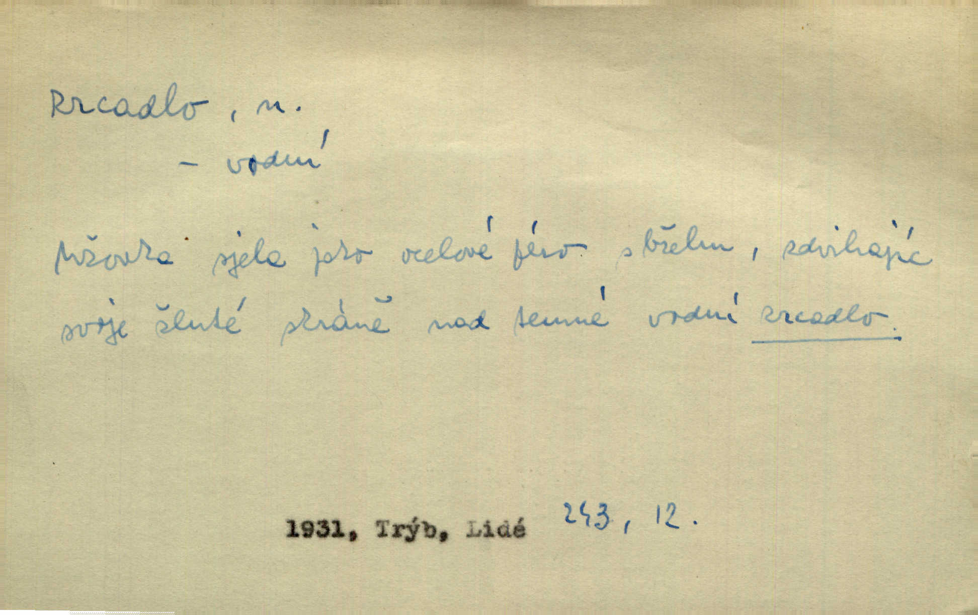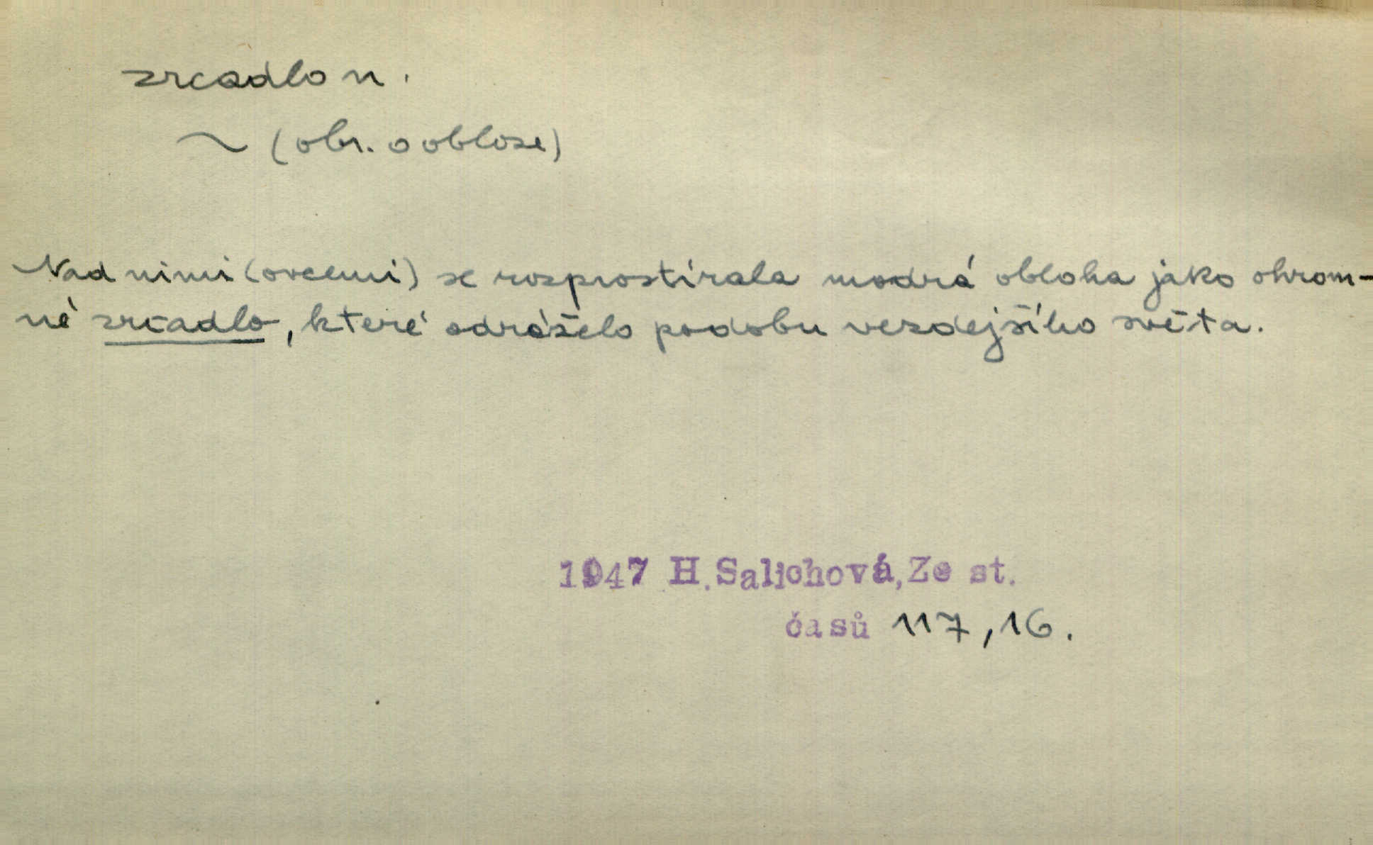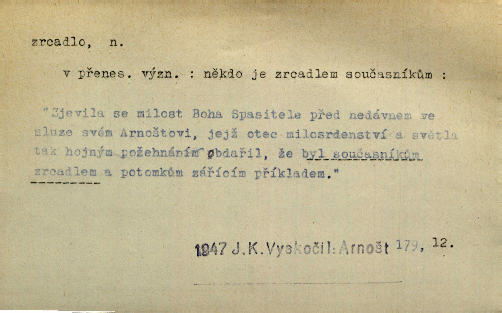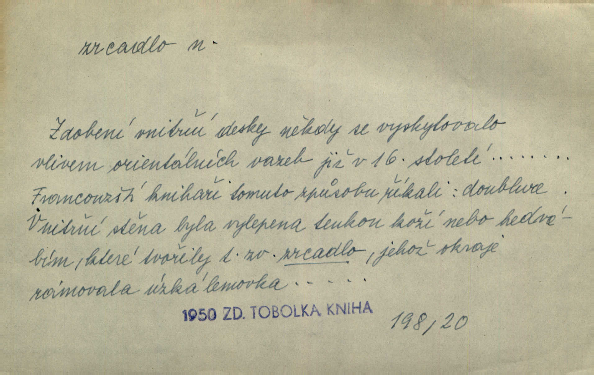 - zrcadlo, -a n. skleněná deska, uzpůsobená nanesením lesklé kovové vrstvy na spodní plochu k vytváření plošného obrazu předmětu, před ní postaveného, odražením paprsků. Poskočila s jedné nohy na druhou a vyplázla na sebe do zrcadla jazyk. K. J. Ben. I přiložili matce zrcadlo k ústům, zdali se zarosí a zdali matka žije. Herb. Zrcadla planou a sklenice řinčí [v kavárně]. K. Čap. Moravský průmysl skla a zrcadel. Úř. l. Mlýn stojí až dole v rovině, která jako zrcadlo leží až k Ronovu a Rožďalovicům rovná. Mach. Vše stopeno ve lůno vod, jak v zrcadle se zhlíží. Mácha. Krátká srsť [hřebice] byla uhlazena a zrcadlem se leskla. Hol. Byly [boty] jako zrcadlo leskly se. Jir. A chystá se to [mráz], západ je jako zrcadlo vyjasněný, čistý. Rais. Pěstounka a s chovanka se do sebe hleděly jako do zrcadla měly se rády. Svět. Klotilda viděla na babičce jako v zrcadle, že paráda a marnost člověka nesytí a neživí jasně, zřetelně. Prav. Vláda pronásledující a utlačující opposiční noviny sama rozbíjí neklamné zrcadlo, ve kterém by viděti mohla pravé vady své. Havl. Žádné zrcadlo bez prášku není každý má nějakou chybu. Čech. Tys mi při přelíčení podržel zrcadlo, že jsem sebe v něm viděl tak, jaký jsem pověděl pravdu. Šmil. Expr. lid. Neuvidí skvrny na mém oděvu ani zrcadla, jimiž se honosily mého kabátu lokte a kolena mých spodků odřená, lesklá místa látky. Klost. Přen. Zrcadlo vzpomínek mu vypadlo z dlaní a rozbilo se nebyl schopen vzpomínati. K. J. Ben. Tech. hladká pravidelná plocha, která odráží světlo. Rovinné, sférické, parabolické, duté, vypuklé a j. zrcadlo. Výr. benátské zrcadlo. Chem. arsenové, antimonové, stříbrné a j. zrcadlo. Geol. lesklé, uhlazené smykové plochy, zvl. v uhelných vrstvách, vzniklé třením a obrusem mezi porušenými vrstvami. Zrcadla uhlí. Bot., les. dřeňový paprsek dřeva v podobě světlého, často lesklého pruhu, pruh zrcadlový, zrcadélko (na př. u dubu, buku a j.). Dopr. přední část perutě kormidla u nákladních člunů labských, vyplňující prázdný trojúhelníkový kout mezi zádí lodi a pněm kormidla. Stav. vodorovné pole, obyč. obdélníkové, ve vrcholu zrcadlové klenby. Lék. zrcadlo konečníkové, poševní, rozvírací, lžicové a j. Mysl. světlá, zprav. bílá část zakončení trupu zvěře pod ocasem. Bílá skvrna v ohbí křídel zvěře tetřevovité. Zelená lesklá péra na klobouku z křídel divokých kachen. Hosp. zrcadlo mléčné část kůže na zadní hrázové straně vemene s chlupy rostlými nahoru. Les. zrcadlo housenek shluk právě vylíhlých housenek lesních škůdců, které ještě několik dnů zůstávají pohromadě na místě, kde byla nakladena vajíčka. Typ. přesný rozvrh umístění obrázků a textu pro knižní dílo n. stránky časopisu. D lesklá plocha (zvl. vodní hladina), v níž vzniká obraz předmětů odrazem paprsků jako v zrcadle. [Měsíc] nakouknul do zrcadla tiché hladiny rybníčka na návsi. Mrš. V noci štědrovečerní zahlédlo [děvče] v temném zrcadle studně mezi třaslavými odrazy hvězd i tvář svého osudu. Řezáč. Neustálá kmitavost [hodonkového setrvačníku] připomíná koupání třasořitky, mnohokrát viděné v rozčeřeném zrcadle potoka. K. Konr. V borů věnci zrcadlo se skvostné odkrývá jak v rámci vábivém. Krás. Země tuhne zcela prosaicky a voda se pokryla průhledně jasným zrcadlem ledem. Ner. Přen. Potůčky slzí rozčeří [láska], zrcadlo duše ti skalí. Heyd. D Kniž. přesný popis, věrný výraz, svědectví něčeho. Umění, to zrcadlo života a přírody v půvabný rámec filosofie zasazené, šíří se. Šmil. Vtip deníkové formy je v tom, že hrdina románu je zároveň zrcadlem, v němž se celá Amerika odráží. Čteme. Mně byla příroda jen zrcadlem mého smutku. Vrch. Psaní jeho [Husova] mohou nad jiné sloužiti za zrcadlo jeho smýšlení a charakteru. Pal. To krásné, modré, veliké oko bylo čistým, věrným zrcadlem její duše. Pfleg. Plné, kulaté tváře byly zrcadlem jeho dobromyslnosti. Tyl. Každé jeho další vysvědčení bylo novým zrcadlem vzorného, dokonalého studenta. Herrm. Tato vláda byla věrným zrcadlem finanční oligarchie, která republiku ovládala. Škol. D Kniž. prostředek n. nástroj poznání, vnímání n. uvědomování. Tu ve zrcadle snů svých vídám sebe [básník], jak pustou plání běžím v divém spěchu. Vrch. Zřím ten den a chvíli onu paměti své ve zrcadle. Vrch. Cítila, že byla krásná, viděla to v zrcadle jeho úsměvu. Podl. Starý mozek jeho přijímal všecky jeho [obrazu bitvy] barvy ne zrcadlem nynějším, ale zrcadlem dávno minulým. Svob. Tak poslední my [hymny] na té zeměkouli ty dávné, děsné, hrůzyplné boje zříme jak v přítomnosti ve zrcadle vědy. Vrch. D Poněk. zast. seznam, soupis k připamatování něčeho (zvl. v názvech knih). Beru-li na sebe úkol, abych podal zrcadlo chyb, jimiž se vyznačuje naše společnost, jsem si už napřed vědom [svého osudu]. Hol. Na okně Hájkova Kronika v tmavé, staré vazbě kožené, na ní v novější „Zrcadlo svaté“. Jir. Prohlížím se v zpovědním zrcadle a vidím netvora. Pujmanová. Plot, dělící Zapletalovic od „staršího bratra“, byl učiněným zpovědním zrcadlem nábožné Barušce, neboť všechny téměř hříchy své sebrala s plotu, který se druhdy pod břitkými hádkami div neprohýbal. Čap. Ch. Naše města dostávala záhy právní pomůcky z ciziny a přicházely i pomůcky práva zemského, zvláště švábské i saské zrcadlo. Vojt. Tištěni jsou [nápisové] v Paprockého Zrcadlu markrabství Moravského velmi nedbale. Pal. D Poněk. zast. vzor, příklad. Byl [Zeyer] jedním z těch, kdo patří v dávnou dobu, leč zrcadlo v ní přítomnosti křísí. Vrch. Zk