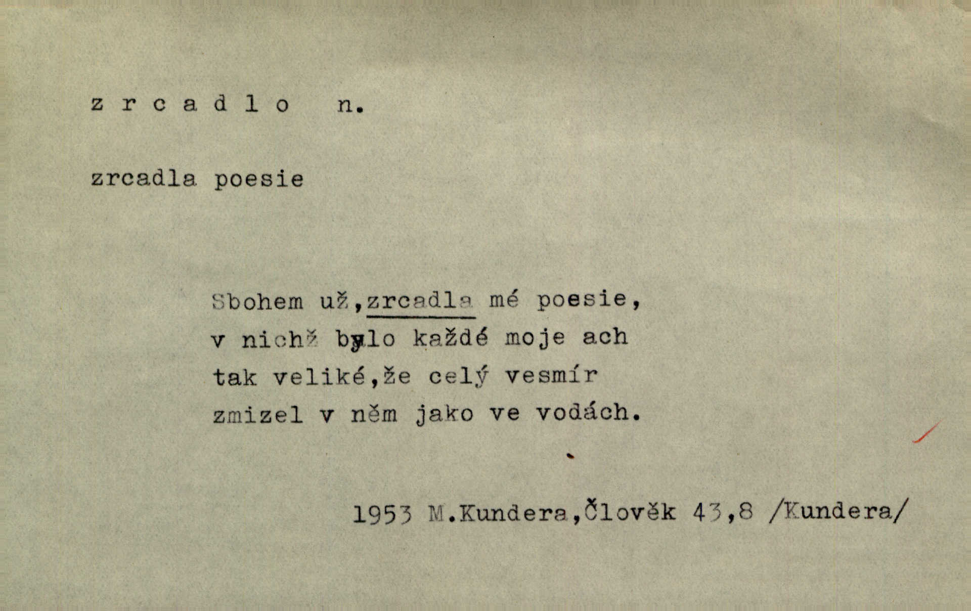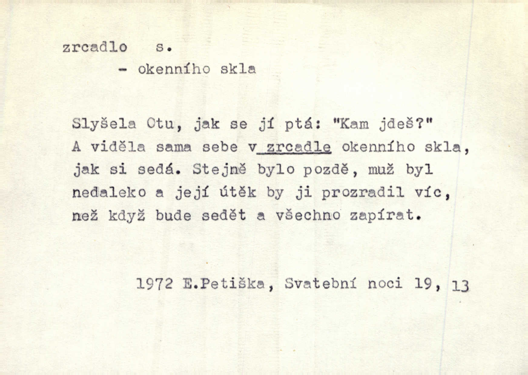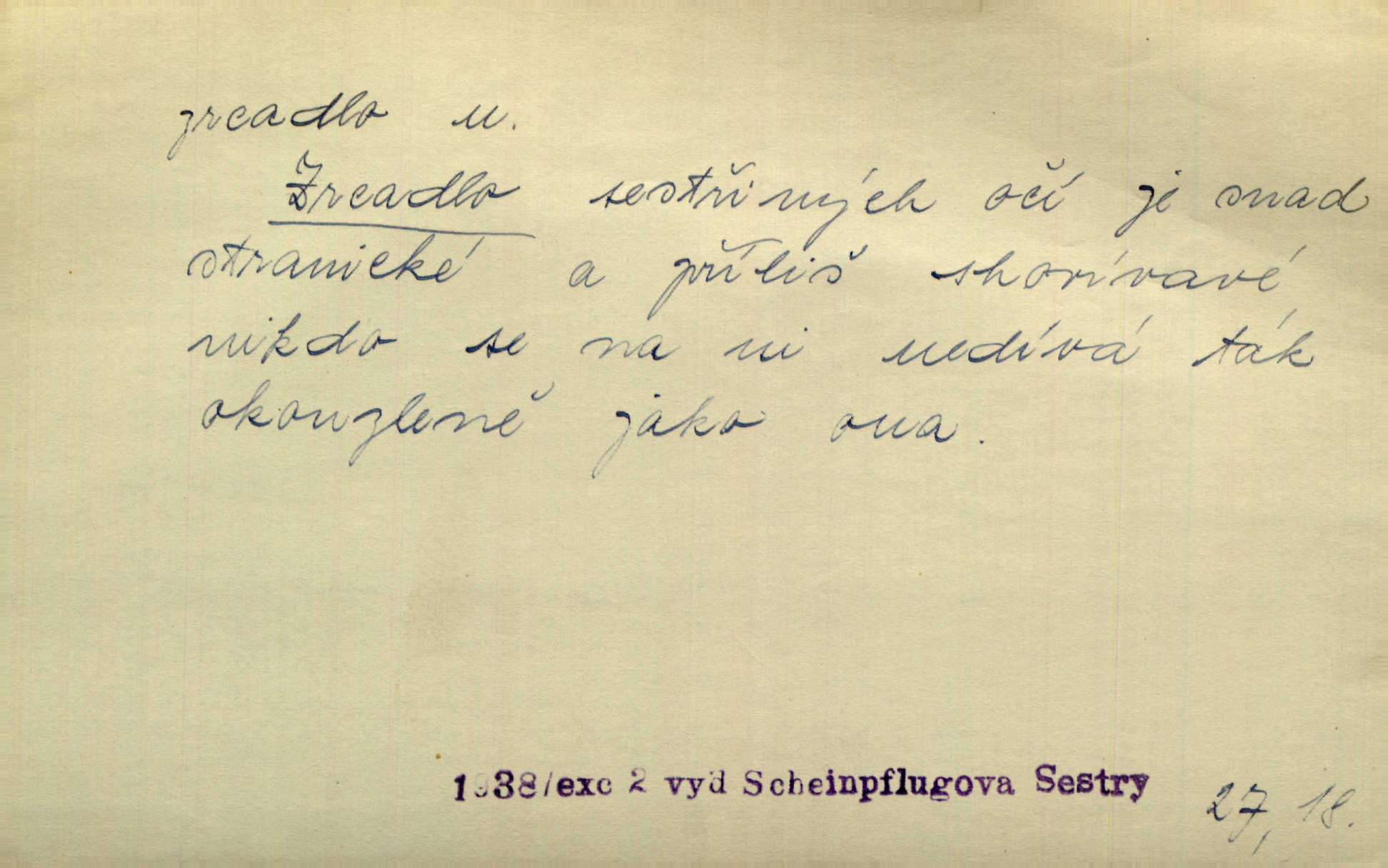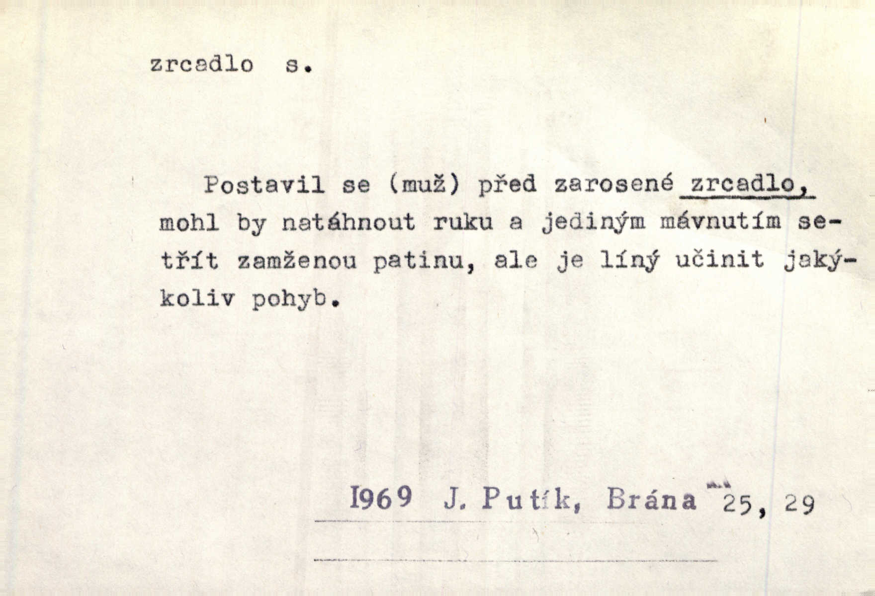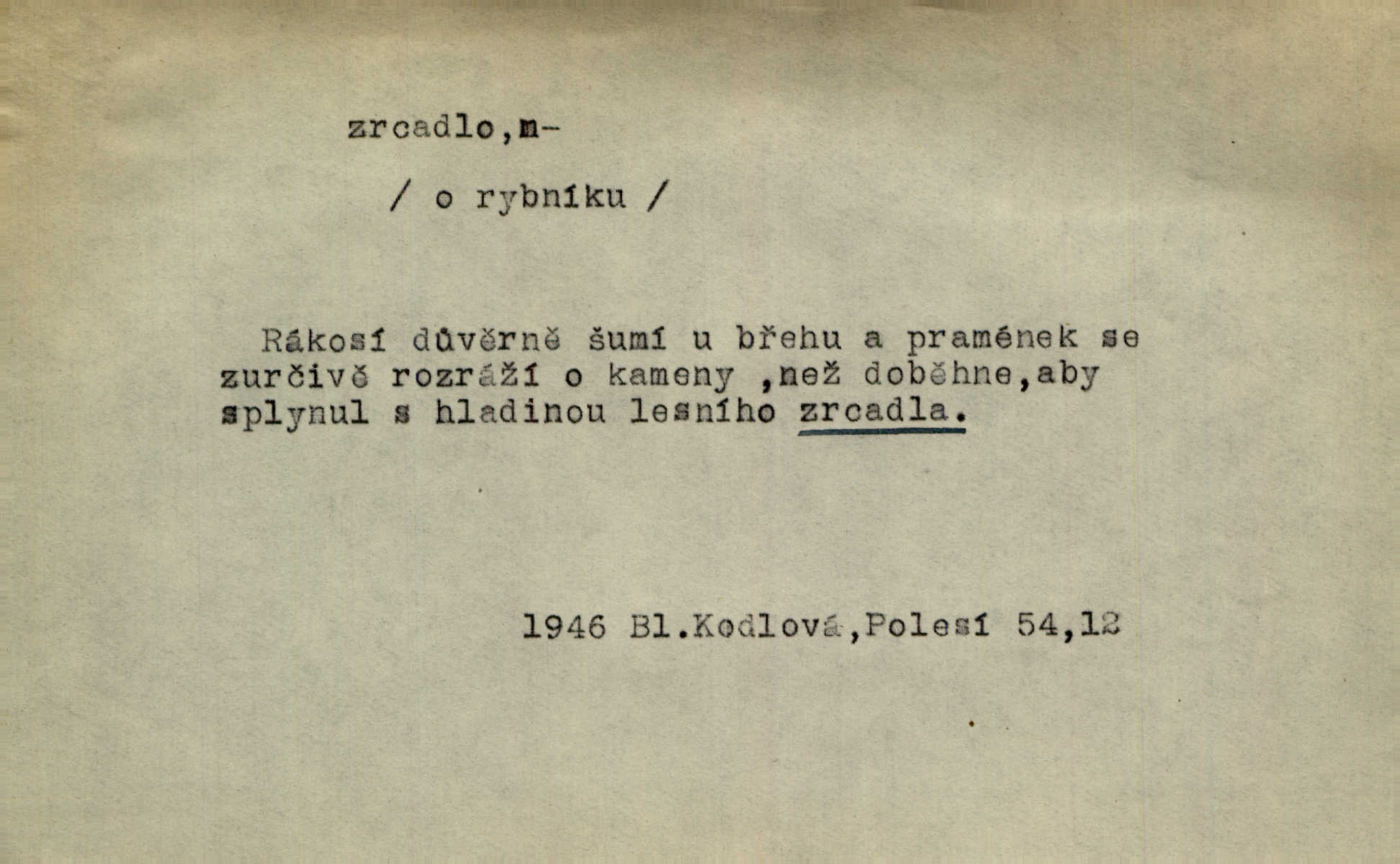 - zrcadlo, -a n. skleněná deska, uzpůsobená nanesením lesklé kovové vrstvy na spodní plochu k vytváření plošného obrazu předmětu, před ní postaveného, odražením paprsků. Poskočila s jedné nohy na druhou a vyplázla na sebe do zrcadla jazyk. K. J. Ben. I přiložili matce zrcadlo k ústům, zdali se zarosí a zdali matka žije. Herb. Zrcadla planou a sklenice řinčí [v kavárně]. K. Čap. Moravský průmysl skla a zrcadel. Úř. l. Mlýn stojí až dole v rovině, která jako zrcadlo leží až k Ronovu a Rožďalovicům rovná. Mach. Vše stopeno ve lůno vod, jak v zrcadle se zhlíží. Mácha. Krátká srsť [hřebice] byla uhlazena a zrcadlem se leskla. Hol. Byly [boty] jako zrcadlo leskly se. Jir. A chystá se to [mráz], západ je jako zrcadlo vyjasněný, čistý. Rais. Pěstounka a s chovanka se do sebe hleděly jako do zrcadla měly se rády. Svět. Klotilda viděla na babičce jako v zrcadle, že paráda a marnost člověka nesytí a neživí jasně, zřetelně. Prav. Vláda pronásledující a utlačující opposiční noviny sama rozbíjí neklamné zrcadlo, ve kterém by viděti mohla pravé vady své. Havl. Žádné zrcadlo bez prášku není každý má nějakou chybu. Čech. Tys mi při přelíčení podržel zrcadlo, že jsem sebe v něm viděl tak, jaký jsem pověděl pravdu. Šmil. Expr. lid. Neuvidí skvrny na mém oděvu ani zrcadla, jimiž se honosily mého kabátu lokte a kolena mých spodků odřená, lesklá místa látky. Klost. Přen. Zrcadlo vzpomínek mu vypadlo z dlaní a rozbilo se nebyl schopen vzpomínati. K. J. Ben. Tech. hladká pravidelná plocha, která odráží světlo. Rovinné, sférické, parabolické, duté, vypuklé a j. zrcadlo. Výr. benátské zrcadlo. Chem. arsenové, antimonové, stříbrné a j. zrcadlo. Geol. lesklé, uhlazené smykové plochy, zvl. v uhelných vrstvách, vzniklé třením a obrusem mezi porušenými vrstvami. Zrcadla uhlí. Bot., les. dřeňový paprsek dřeva v podobě světlého, často lesklého pruhu, pruh zrcadlový, zrcadélko (na př. u dubu, buku a j.). Dopr. přední část perutě kormidla u nákladních člunů labských, vyplňující prázdný trojúhelníkový kout mezi zádí lodi a pněm kormidla. Stav. vodorovné pole, obyč. obdélníkové, ve vrcholu zrcadlové klenby. Lék. zrcadlo konečníkové, poševní, rozvírací, lžicové a j. Mysl. světlá, zprav. bílá část zakončení trupu zvěře pod ocasem. Bílá skvrna v ohbí křídel zvěře tetřevovité. Zelená lesklá péra na klobouku z křídel divokých kachen. Hosp. zrcadlo mléčné část kůže na zadní hrázové straně vemene s chlupy rostlými nahoru. Les. zrcadlo housenek shluk právě vylíhlých housenek lesních škůdců, které ještě několik dnů zůstávají pohromadě na místě, kde byla nakladena vajíčka. Typ. přesný rozvrh umístění obrázků a textu pro knižní dílo n. stránky časopisu. D lesklá plocha (zvl. vodní hladina), v níž vzniká obraz předmětů odrazem paprsků jako v zrcadle. [Měsíc] nakouknul do zrcadla tiché hladiny rybníčka na návsi. Mrš. V noci štědrovečerní zahlédlo [děvče] v temném zrcadle studně mezi třaslavými odrazy hvězd i tvář svého osudu. Řezáč. Neustálá kmitavost [hodonkového setrvačníku] připomíná koupání třasořitky, mnohokrát viděné v rozčeřeném zrcadle potoka. K. Konr. V borů věnci zrcadlo se skvostné odkrývá jak v rámci vábivém. Krás. Země tuhne zcela prosaicky a voda se pokryla průhledně jasným zrcadlem ledem. Ner. Přen. Potůčky slzí rozčeří [láska], zrcadlo duše ti skalí. Heyd. D Kniž. přesný popis, věrný výraz, svědectví něčeho. Umění, to zrcadlo života a přírody v půvabný rámec filosofie zasazené, šíří se. Šmil. Vtip deníkové formy je v tom, že hrdina románu je zároveň zrcadlem, v němž se celá Amerika odráží. Čteme. Mně byla příroda jen zrcadlem mého smutku. Vrch. Psaní jeho [Husova] mohou nad jiné sloužiti za zrcadlo jeho smýšlení a charakteru. Pal. To krásné, modré, veliké oko bylo čistým, věrným zrcadlem její duše. Pfleg. Plné, kulaté tváře byly zrcadlem jeho dobromyslnosti. Tyl. Každé jeho další vysvědčení bylo novým zrcadlem vzorného, dokonalého studenta. Herrm. Tato vláda byla věrným zrcadlem finanční oligarchie, která republiku ovládala. Škol. D Kniž. prostředek n. nástroj poznání, vnímání n. uvědomování. Tu ve zrcadle snů svých vídám sebe [básník], jak pustou plání běžím v divém spěchu. Vrch. Zřím ten den a chvíli onu paměti své ve zrcadle. Vrch. Cítila, že byla krásná, viděla to v zrcadle jeho úsměvu. Podl. Starý mozek jeho přijímal všecky jeho [obrazu bitvy] barvy ne zrcadlem nynějším, ale zrcadlem dávno minulým. Svob. Tak poslední my [hymny] na té zeměkouli ty dávné, děsné, hrůzyplné boje zříme jak v přítomnosti ve zrcadle vědy. Vrch. D Poněk. zast. seznam, soupis k připamatování něčeho (zvl. v názvech knih). Beru-li na sebe úkol, abych podal zrcadlo chyb, jimiž se vyznačuje naše společnost, jsem si už napřed vědom [svého osudu]. Hol. Na okně Hájkova Kronika v tmavé, staré vazbě kožené, na ní v novější „Zrcadlo svaté“. Jir. Prohlížím se v zpovědním zrcadle a vidím netvora. Pujmanová. Plot, dělící Zapletalovic od „staršího bratra“, byl učiněným zpovědním zrcadlem nábožné Barušce, neboť všechny téměř hříchy své sebrala s plotu, který se druhdy pod břitkými hádkami div neprohýbal. Čap. Ch. Naše města dostávala záhy právní pomůcky z ciziny a přicházely i pomůcky práva zemského, zvláště švábské i saské zrcadlo. Vojt. Tištěni jsou [nápisové] v Paprockého Zrcadlu markrabství Moravského velmi nedbale. Pal. D Poněk. zast. vzor, příklad. Byl [Zeyer] jedním z těch, kdo patří v dávnou dobu, leč zrcadlo v ní přítomnosti křísí. Vrch. Zk
