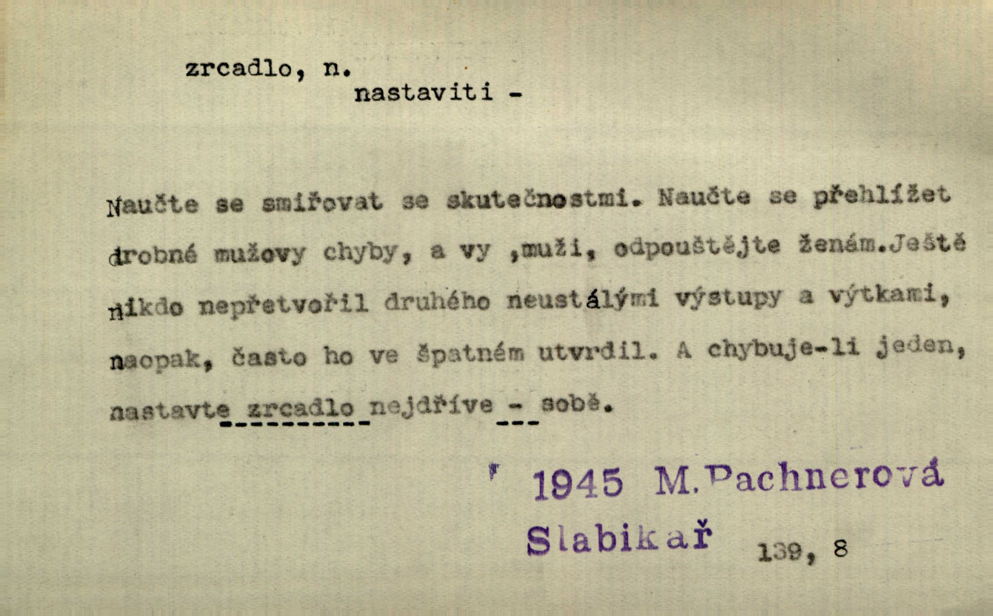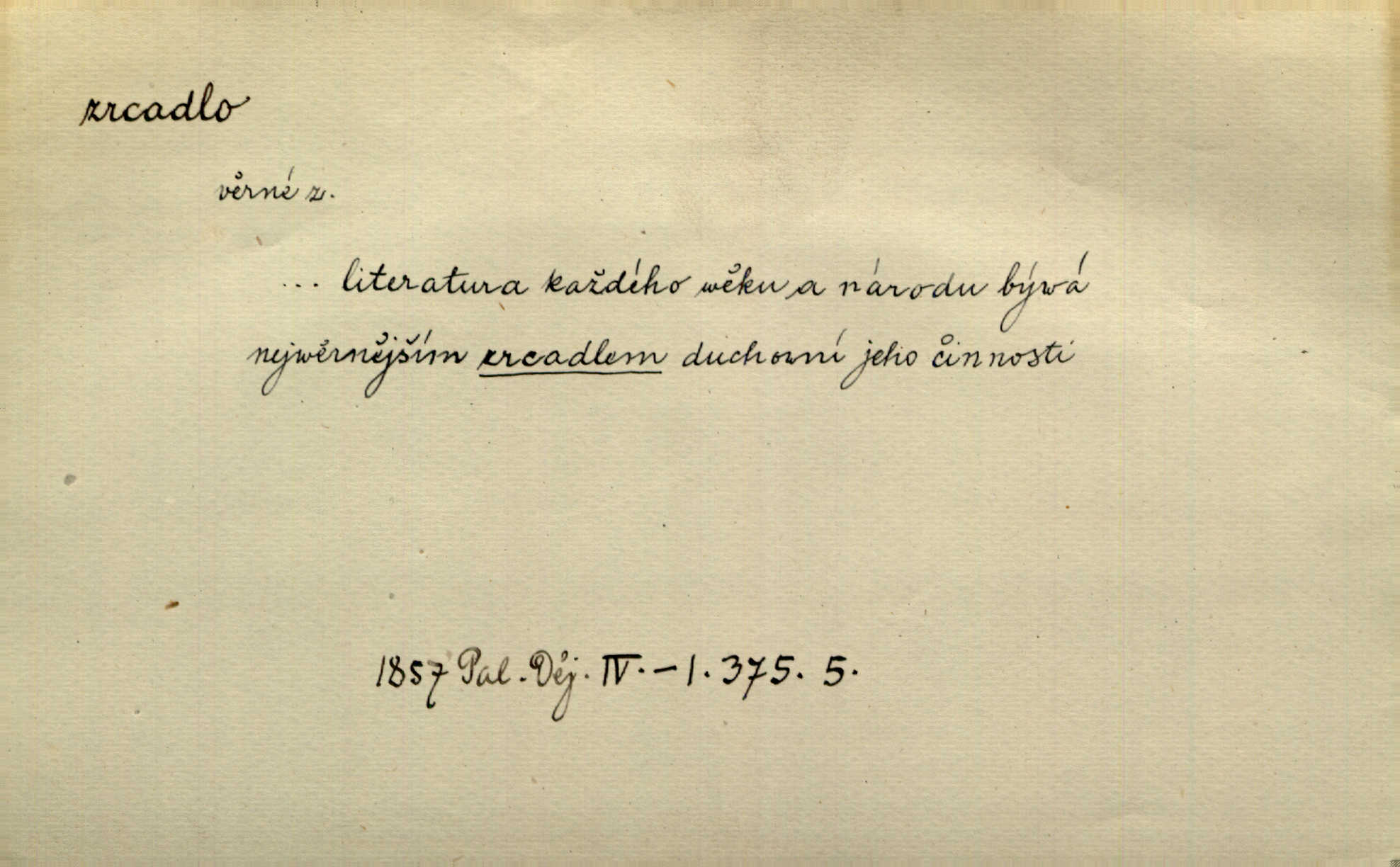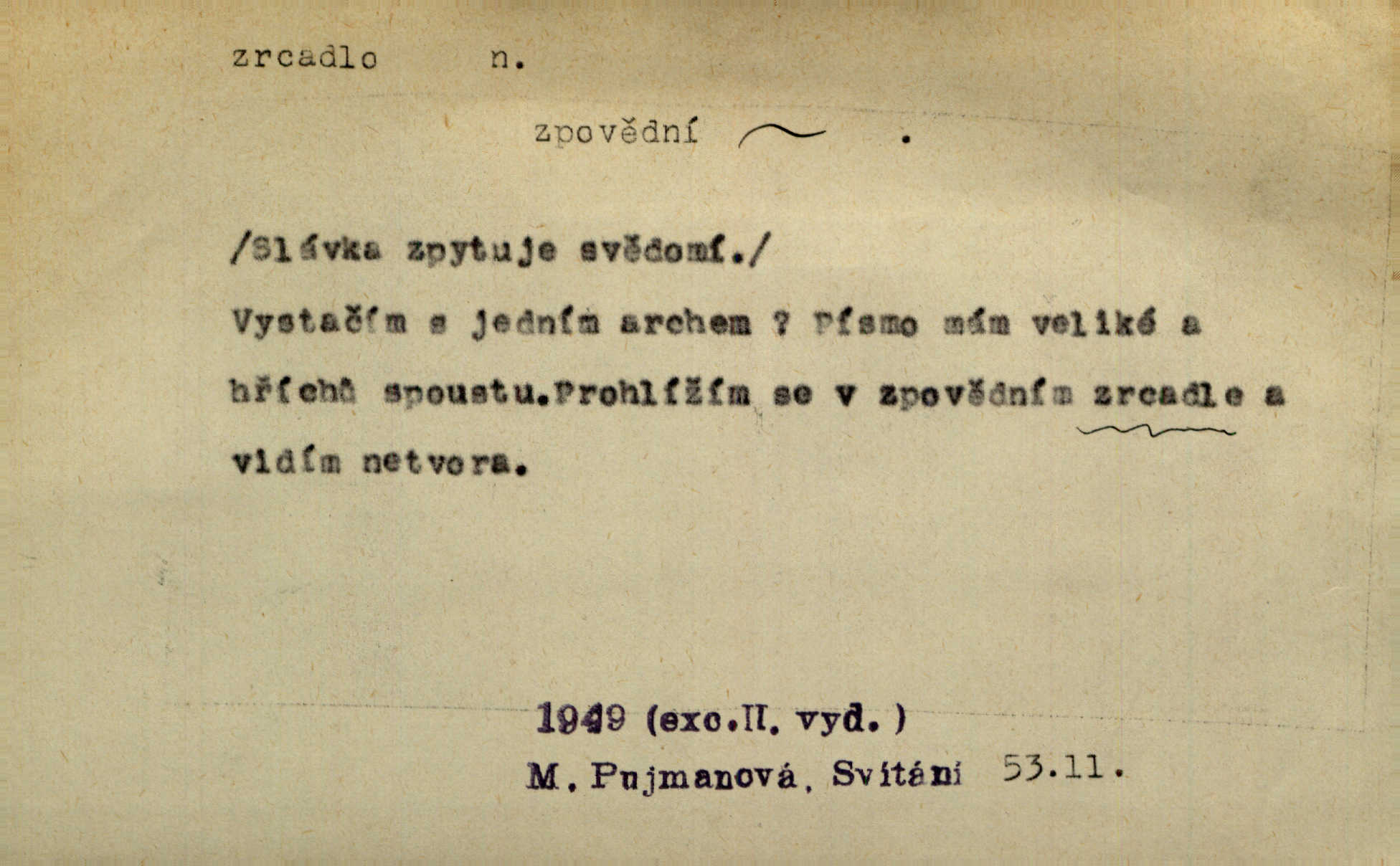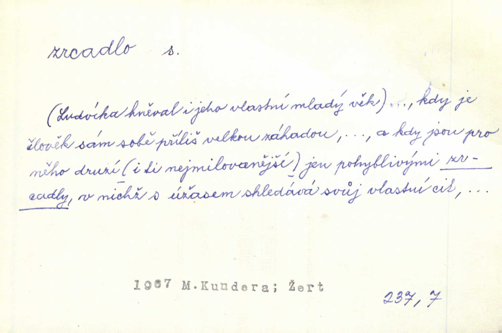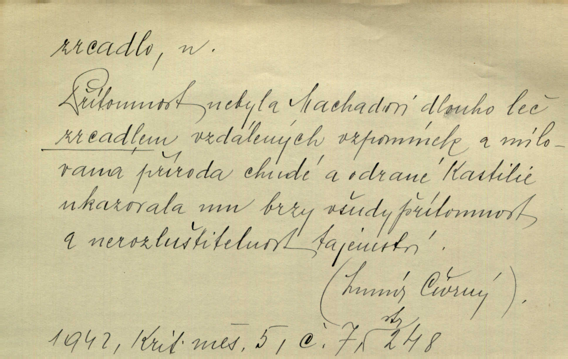 - zrcadlo, -a n. skleněná deska, uzpůsobená nanesením lesklé kovové vrstvy na spodní plochu k vytváření plošného obrazu předmětu, před ní postaveného, odražením paprsků. Poskočila s jedné nohy na druhou a vyplázla na sebe do zrcadla jazyk. K. J. Ben. I přiložili matce zrcadlo k ústům, zdali se zarosí a zdali matka žije. Herb. Zrcadla planou a sklenice řinčí [v kavárně]. K. Čap. Moravský průmysl skla a zrcadel. Úř. l. Mlýn stojí až dole v rovině, která jako zrcadlo leží až k Ronovu a Rožďalovicům rovná. Mach. Vše stopeno ve lůno vod, jak v zrcadle se zhlíží. Mácha. Krátká srsť [hřebice] byla uhlazena a zrcadlem se leskla. Hol. Byly [boty] jako zrcadlo leskly se. Jir. A chystá se to [mráz], západ je jako zrcadlo vyjasněný, čistý. Rais. Pěstounka a s chovanka se do sebe hleděly jako do zrcadla měly se rády. Svět. Klotilda viděla na babičce jako v zrcadle, že paráda a marnost člověka nesytí a neživí jasně, zřetelně. Prav. Vláda pronásledující a utlačující opposiční noviny sama rozbíjí neklamné zrcadlo, ve kterém by viděti mohla pravé vady své. Havl. Žádné zrcadlo bez prášku není každý má nějakou chybu. Čech. Tys mi při přelíčení podržel zrcadlo, že jsem sebe v něm viděl tak, jaký jsem pověděl pravdu. Šmil. Expr. lid. Neuvidí skvrny na mém oděvu ani zrcadla, jimiž se honosily mého kabátu lokte a kolena mých spodků odřená, lesklá místa látky. Klost. Přen. Zrcadlo vzpomínek mu vypadlo z dlaní a rozbilo se nebyl schopen vzpomínati. K. J. Ben. Tech. hladká pravidelná plocha, která odráží světlo. Rovinné, sférické, parabolické, duté, vypuklé a j. zrcadlo. Výr. benátské zrcadlo. Chem. arsenové, antimonové, stříbrné a j. zrcadlo. Geol. lesklé, uhlazené smykové plochy, zvl. v uhelných vrstvách, vzniklé třením a obrusem mezi porušenými vrstvami. Zrcadla uhlí. Bot., les. dřeňový paprsek dřeva v podobě světlého, často lesklého pruhu, pruh zrcadlový, zrcadélko (na př. u dubu, buku a j.). Dopr. přední část perutě kormidla u nákladních člunů labských, vyplňující prázdný trojúhelníkový kout mezi zádí lodi a pněm kormidla. Stav. vodorovné pole, obyč. obdélníkové, ve vrcholu zrcadlové klenby. Lék. zrcadlo konečníkové, poševní, rozvírací, lžicové a j. Mysl. světlá, zprav. bílá část zakončení trupu zvěře pod ocasem. Bílá skvrna v ohbí křídel zvěře tetřevovité. Zelená lesklá péra na klobouku z křídel divokých kachen. Hosp. zrcadlo mléčné část kůže na zadní hrázové straně vemene s chlupy rostlými nahoru. Les. zrcadlo housenek shluk právě vylíhlých housenek lesních škůdců, které ještě několik dnů zůstávají pohromadě na místě, kde byla nakladena vajíčka. Typ. přesný rozvrh umístění obrázků a textu pro knižní dílo n. stránky časopisu. D lesklá plocha (zvl. vodní hladina), v níž vzniká obraz předmětů odrazem paprsků jako v zrcadle. [Měsíc] nakouknul do zrcadla tiché hladiny rybníčka na návsi. Mrš. V noci štědrovečerní zahlédlo [děvče] v temném zrcadle studně mezi třaslavými odrazy hvězd i tvář svého osudu. Řezáč. Neustálá kmitavost [hodonkového setrvačníku] připomíná koupání třasořitky, mnohokrát viděné v rozčeřeném zrcadle potoka. K. Konr. V borů věnci zrcadlo se skvostné odkrývá jak v rámci vábivém. Krás. Země tuhne zcela prosaicky a voda se pokryla průhledně jasným zrcadlem ledem. Ner. Přen. Potůčky slzí rozčeří [láska], zrcadlo duše ti skalí. Heyd. D Kniž. přesný popis, věrný výraz, svědectví něčeho. Umění, to zrcadlo života a přírody v půvabný rámec filosofie zasazené, šíří se. Šmil. Vtip deníkové formy je v tom, že hrdina románu je zároveň zrcadlem, v němž se celá Amerika odráží. Čteme. Mně byla příroda jen zrcadlem mého smutku. Vrch. Psaní jeho [Husova] mohou nad jiné sloužiti za zrcadlo jeho smýšlení a charakteru. Pal. To krásné, modré, veliké oko bylo čistým, věrným zrcadlem její duše. Pfleg. Plné, kulaté tváře byly zrcadlem jeho dobromyslnosti. Tyl. Každé jeho další vysvědčení bylo novým zrcadlem vzorného, dokonalého studenta. Herrm. Tato vláda byla věrným zrcadlem finanční oligarchie, která republiku ovládala. Škol. D Kniž. prostředek n. nástroj poznání, vnímání n. uvědomování. Tu ve zrcadle snů svých vídám sebe [básník], jak pustou plání běžím v divém spěchu. Vrch. Zřím ten den a chvíli onu paměti své ve zrcadle. Vrch. Cítila, že byla krásná, viděla to v zrcadle jeho úsměvu. Podl. Starý mozek jeho přijímal všecky jeho [obrazu bitvy] barvy ne zrcadlem nynějším, ale zrcadlem dávno minulým. Svob. Tak poslední my [hymny] na té zeměkouli ty dávné, děsné, hrůzyplné boje zříme jak v přítomnosti ve zrcadle vědy. Vrch. D Poněk. zast. seznam, soupis k připamatování něčeho (zvl. v názvech knih). Beru-li na sebe úkol, abych podal zrcadlo chyb, jimiž se vyznačuje naše společnost, jsem si už napřed vědom [svého osudu]. Hol. Na okně Hájkova Kronika v tmavé, staré vazbě kožené, na ní v novější „Zrcadlo svaté“. Jir. Prohlížím se v zpovědním zrcadle a vidím netvora. Pujmanová. Plot, dělící Zapletalovic od „staršího bratra“, byl učiněným zpovědním zrcadlem nábožné Barušce, neboť všechny téměř hříchy své sebrala s plotu, který se druhdy pod břitkými hádkami div neprohýbal. Čap. Ch. Naše města dostávala záhy právní pomůcky z ciziny a přicházely i pomůcky práva zemského, zvláště švábské i saské zrcadlo. Vojt. Tištěni jsou [nápisové] v Paprockého Zrcadlu markrabství Moravského velmi nedbale. Pal. D Poněk. zast. vzor, příklad. Byl [Zeyer] jedním z těch, kdo patří v dávnou dobu, leč zrcadlo v ní přítomnosti křísí. Vrch. Zk